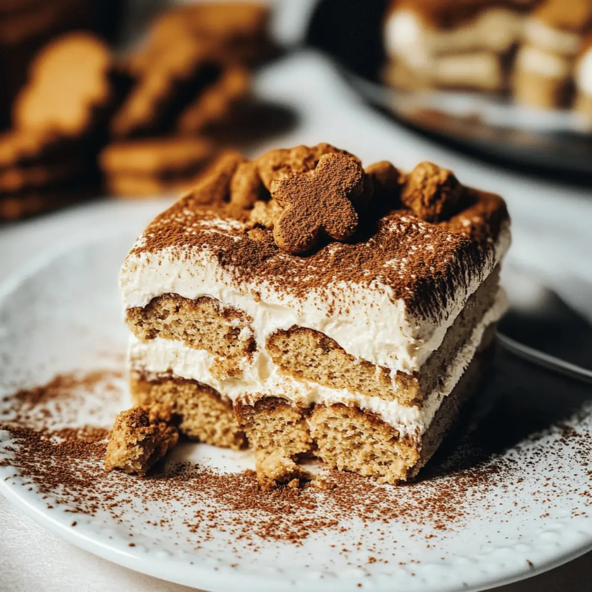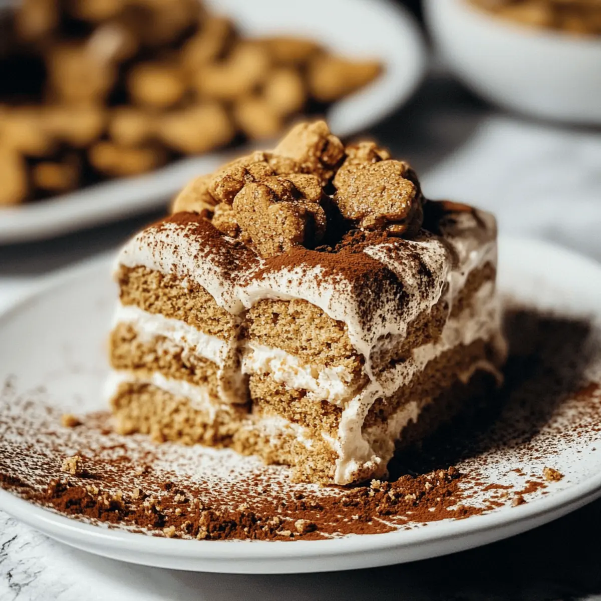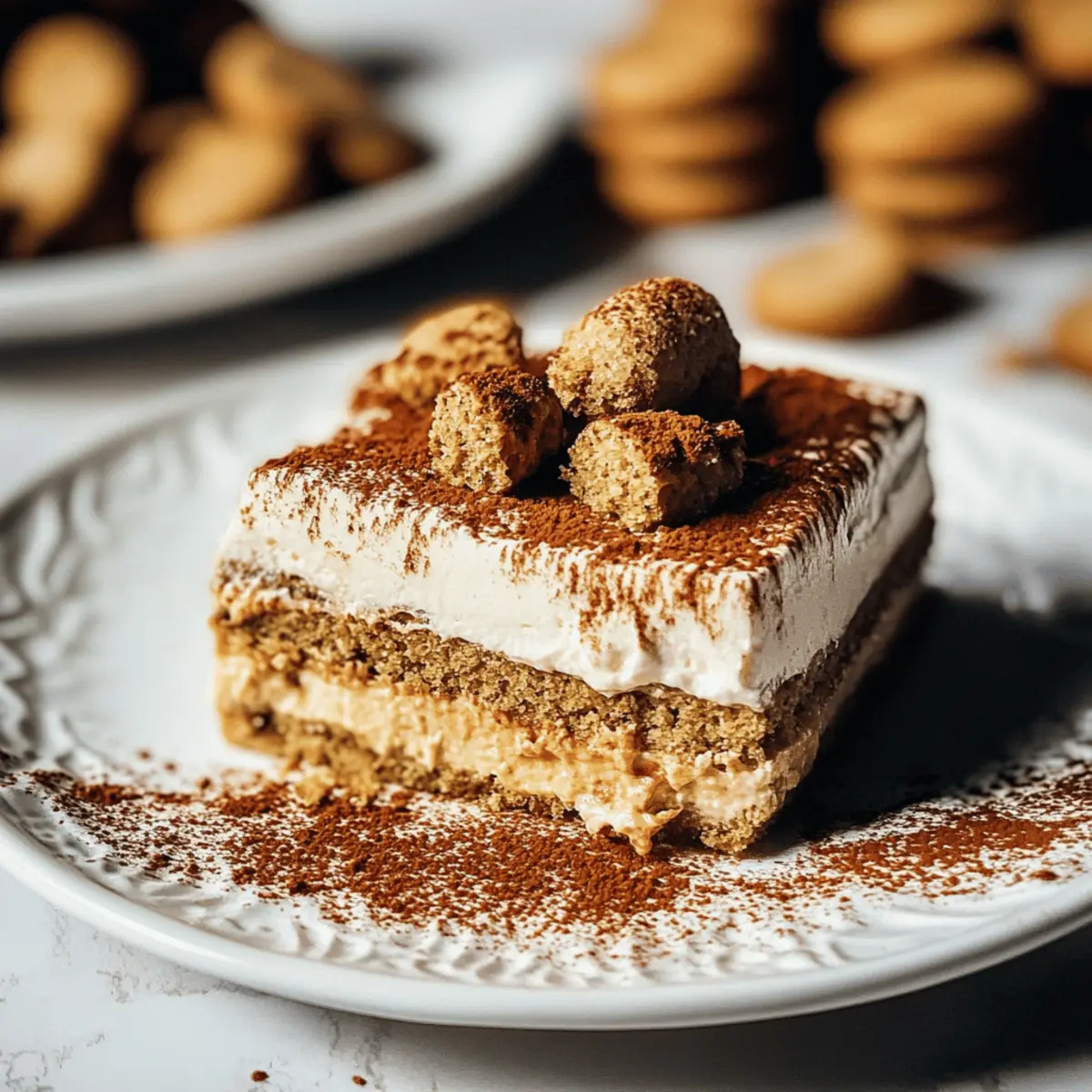 As I was savoring the rich aroma of spiced gingerbread wafting through my kitchen, I felt the excitement of the holiday season creeping in. That’s when I knew I had to try my hand at a delightful twist on the traditional tiramisu: the No-Bake Gingerbread Tiramisu. This festive creation layers creamy gingerbread mascarpone with coffee-soaked ladyfingers and crunchy gingerbread cookies—yes, you read that right! Not only is this recipe perfect for anyone looking to impress guests without the fuss of baking, but it’s also a gluten-free option that captures the essence of the season. So, are you ready to indulge in a scrumptious dessert that’s bound to whisk you away to holiday cheer? Let’s dive in and make this unforgettable treat! Why is Gingerbread Tiramisu So Irresistible? Festive flavors come together in this stunning dessert, blending the warmth of gingerbread with the creaminess of tiramisu. No-bake preparation means you can whip it up with minimal fuss, leaving more time to enjoy the holidays. Crowd-pleasing and delightful, this recipe is sure to impress at any holiday gathering. Customizable for dietary needs, you can easily swap in gluten-free ladyfingers without sacrificing any taste. Treat yourself and your loved ones to this elegant yet cozy dessert that captures the spirit of the season! Check out more festive ideas with our guide on holiday desserts. Gingerbread Tiramisu Ingredients For the Filling • Mascarpone Cheese – Provides a creamy texture and rich flavor; ensure it’s at room temperature for easy mixing. • Egg Yolks – Contribute richness and act as an emulsifier in the gingerbread tiramisu filling. • Molasses – Adds sweetness and deep, warm flavors reminiscent of gingerbread; for a lighter option, substitute with brown sugar. • Ground Ginger – Enhances the overall gingerbread flavor, elevating each bite. • Ground Cinnamon – Provides additional warmth and spice, complementing the ginger perfectly. • Vanilla Extract – Adds complexity to the filling, enriching the overall taste. • Heavy Cream – Creates a light and airy texture when whipped, ideal for layering. For the Soak • Ladyfingers – Serve as the base of the dessert, soaked in flavored coffee; gluten-free ladyfingers can be used as a substitution. • Gingerbread Coffee – Used for soaking the ladyfingers to infuse them with flavor; plain coffee works as a substitute if needed. For the Layering • Gingerbread Cookies – Used for layering; opt for thin and crisp varieties, like Pepperidge Farm gingerbread cookies, to avoid sogginess. With these Gingerbread Tiramisu ingredients, you’re set to create a stunning dessert that captures the essence of the holiday season! Step‑by‑Step Instructions for Gingerbread Tiramisu Step 1: Mix Egg Yolks and Molasses In a large mixing bowl, whisk together 3 egg yolks and ½ cup of molasses until the mixture is smooth and creamy, about 2 minutes. This will form a rich base for your Gingerbread Tiramisu filling. Make sure to use an electric mixer for best results, ensuring no lumps remain. Step 2: Incorporate Mascarpone and Spices Add 1 cup of room temperature mascarpone cheese, 1 teaspoon of vanilla extract, 1 teaspoon of ground ginger, and ½ teaspoon of ground cinnamon to the egg yolk mixture. Using the electric mixer, blend on low speed until all ingredients are well combined, achieving a thick and luscious consistency, roughly 2-3 minutes. Step 3: Whip the Heavy Cream In a separate bowl, pour in 1 cup of heavy cream and whip it using a hand mixer or whisk until medium peaks form. This should take about 3-5 minutes at medium-high speed. The whipped cream will add lightness to the filling, so check for soft peaks that hold their shape but aren’t overly stiff. Step 4: Fold in Whipped Cream Gently fold the whipped cream into the mascarpone mixture using a spatula. Be careful not to deflate the whipped cream; the texture should remain airy and fluffy. This process takes about 1-2 minutes and will create the deliciously creamy filling for your Gingerbread Tiramisu. Step 5: Prepare the Gingerbread Coffee Brew a strong cup of gingerbread coffee or plain coffee, then let it cool for a few minutes. You’ll need it for soaking the ladyfingers. The warmth releases the coffee’s rich flavors, making sure the ladyfingers absorb the right amount of moisture without getting overly soggy. Step 6: Dip the Ladyfingers Briefly dip 24 ladyfingers into the gingerbread coffee, ensuring only the surface is soaked—do this for about 1-2 seconds per side. Layering soggy ladyfingers can ruin your Gingerbread Tiramisu, so a swift dip is essential to maintain their structure. Step 7: Layer the Dessert In a rectangular serving dish, layer half of the soaked ladyfingers on the bottom. Spread half of the mascarpone mixture over the ladyfingers, creating a smooth layer. Repeat the process, adding another layer of dipped ladyfingers followed by the remaining mascarpone filling, ensuring even distribution. Step 8: Add Gingerbread Cookie Topping Crumble about 4-5 thin gingerbread cookies and sprinkle them generously over the top layer of mascarpone. This crispy topping will add both flavor and texture to your Gingerbread Tiramisu, creating an inviting appearance for your festive dessert. Step 9: Chill and Set Cover the assembled Gingerbread Tiramisu with plastic wrap and refrigerate overnight, or for at least 6 hours. This chilling period allows the flavors to meld beautifully and the dessert to set, ensuring every slice is cohesive and enjoyable. How to Store and Freeze Gingerbread Tiramisu Fridge: Store your Gingerbread Tiramisu covered in the refrigerator for up to 4 days. This allows the flavors to deepen, making it even more delicious. Freezer: If needed, you can freeze Gingerbread Tiramisu for up to 1 month. Wrap it tightly in plastic wrap and then in aluminum foil to prevent freezer burn. Thawing: To enjoy frozen Tiramisu, transfer it to the fridge to thaw 