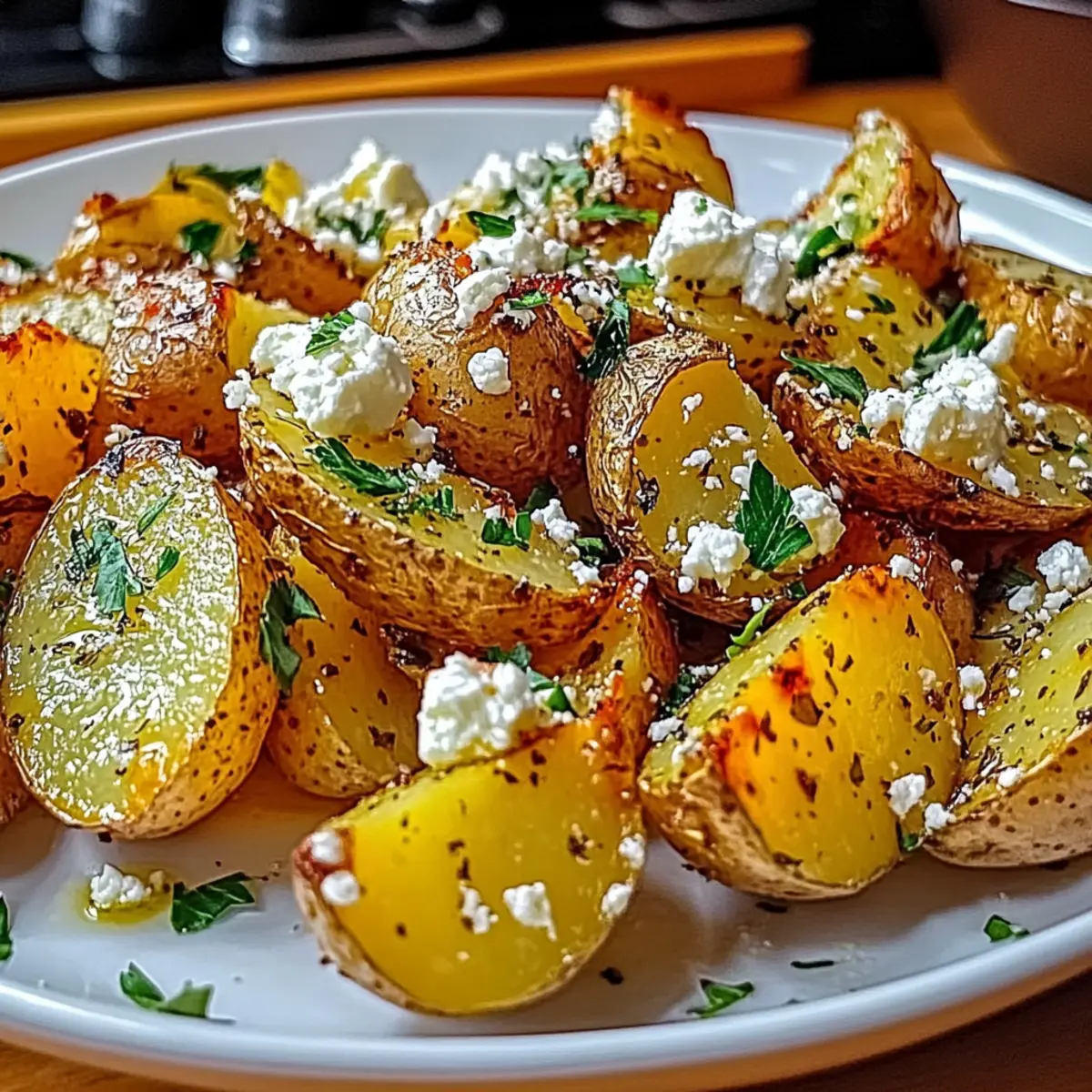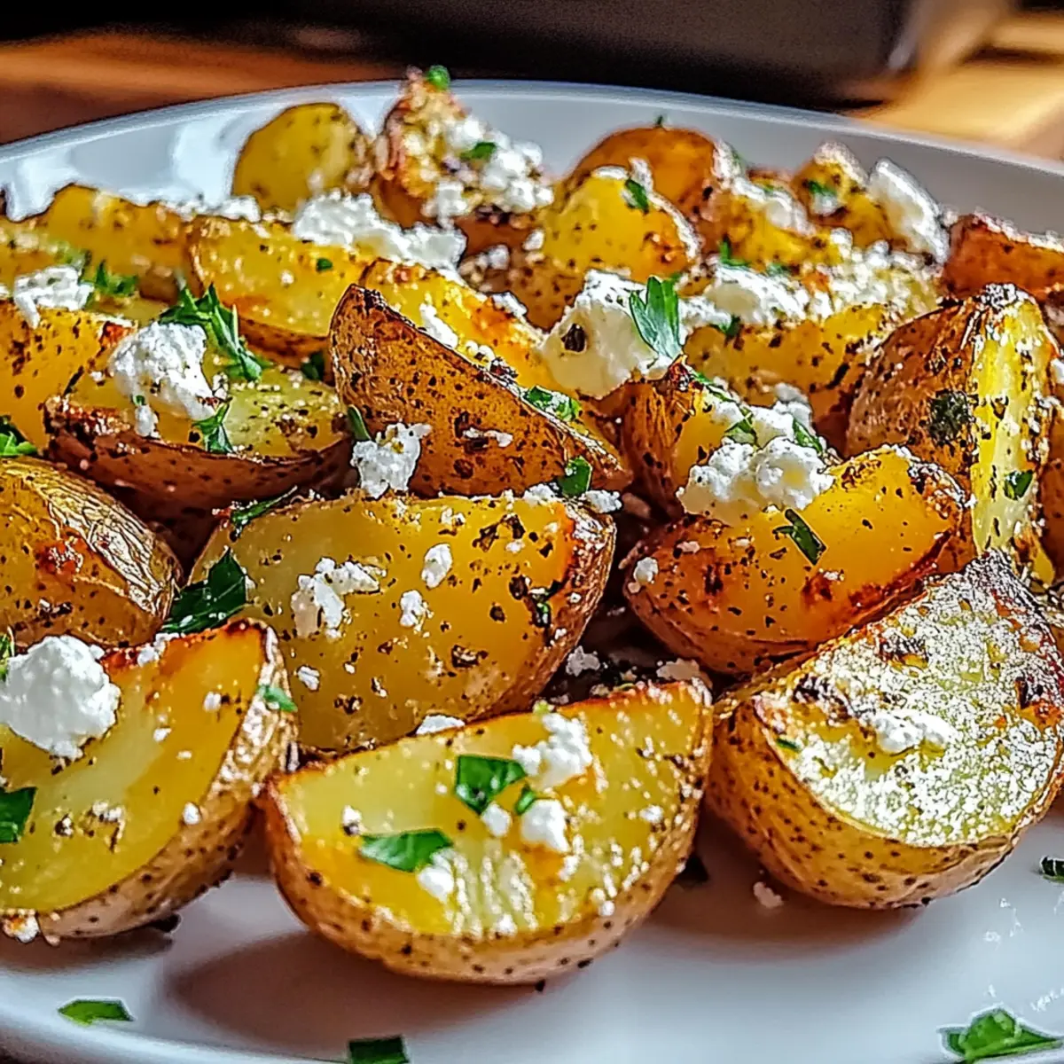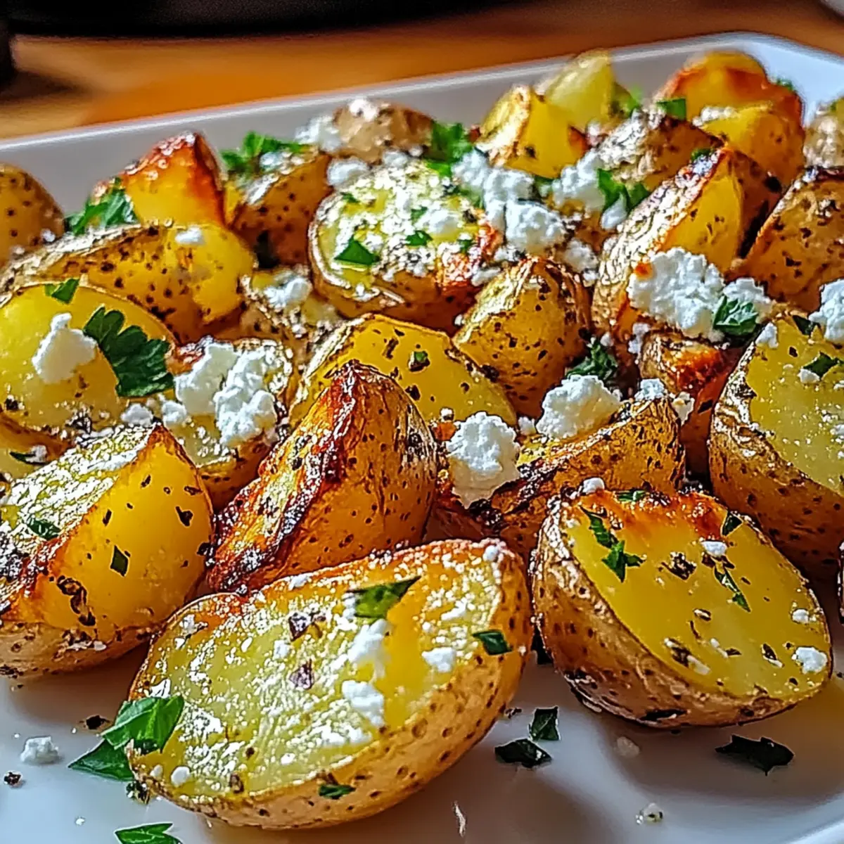 Facebook Twitter Pinterest LinkedInWhen it’s time to elevate our side dishes, Greek Feta Roast Potatoes never fail to capture imaginations—and appetites! The first time I stumbled upon this recipe, I was captivated by the tantalizing combination of crispy edges and fluffy centers, all infused with zesty lemon and creamy feta. What I love most about these potatoes is how effortlessly they can be transformed; they easily accommodate a vegan diet with just a simple swap. Plus, they’re not just a side—these savory gems can shine on their own as a delightful snack or paired with grilled meats. Ready to take your taste buds on a Mediterranean adventure? Let’s dive into this recipe that promises to impress around any dinner table! What’s So Special About Greek Feta Roast Potatoes? Irresistible Flavor: The delightful combination of zesty lemon and creamy feta creates a unique taste that elevates any meal. Versatile Dish: Perfect as a side for grilled meats or as a satisfying snack, these potatoes adapt beautifully to any occasion. Easy to Prepare: With minimal ingredients and straightforward instructions, even beginner cooks can achieve a delicious dish. Vegan-Friendly Options: Easily replace traditional feta with a vegan alternative for a delicious dairy-free result, appealing to all dietary preferences. Crowd-Pleasing Appeal: Whether at a family dinner or festive gathering, everyone will be raving about these potatoes! You can also pair them with a fresh salad or your favorite protein to create a complete Mediterranean experience. Give them a try alongside our Roasted Chicken Potatoes or add a twist with the Spinach Feta Quesadillas for a fabulous meal! Greek Feta Roast Potatoes Ingredients For the Potatoes • Yukon Gold Potatoes – A perfect choice for roasting due to their creamy texture and buttery flavor. • Olive Oil – High-quality extra virgin olive oil provides richness and helps achieve that wonderful crispiness. • Salt – Adjust to taste to enhance the overall flavor of the dish. • Black Pepper – Freshly ground adds depth and subtle heat; always opt for the fresh grind if possible. For the Flavor • Fresh Lemon Juice – Adds a bright, zesty note that beautifully cuts through the richness of the feta. • Garlic (3 cloves, minced) – Infuses robust flavor; feel free to adjust the amount based on your garlic preference. • Dried Oregano (1 teaspoon) – Provides authentic Mediterranean flavor; can be swapped with Italian seasoning if necessary. For the Topping • Crumbled Feta Cheese (1 cup) – Delivers a creamy, salty depth; for a vegan variation, use vegan feta cheese. • Chopped Fresh Parsley (1/4 cup) – Adds a pop of color and freshness as a delightful garnish. Step‑by‑Step Instructions for Greek Feta Roast Potatoes Step 1: Preheat Your Oven Begin by preheating your oven to 400°F (200°C). This temperature is crucial for achieving that crispy exterior on your Greek Feta Roast Potatoes. Set a timer for about 10 minutes to allow the oven to reach the desired heat before you start preparing the other ingredients. Step 2: Prepare the Marinade In a mixing bowl, whisk together ¼ cup of olive oil, the juice of one fresh lemon, 3 minced garlic cloves, 1 teaspoon of dried oregano, and a generous pinch of salt and pepper. The aromas of the garlic and lemon will fill your kitchen, creating a delightful base for coating the potatoes. Step 3: Cut and Coat the Potatoes Wash your Yukon Gold potatoes thoroughly and slice them into wedges or chunks, as preferred. Place the cut potatoes into the bowl with the marinade, tossing them gently until each piece is evenly coated. This step adds flavor and helps create that sought-after texture when baking. Step 4: Arrange on Baking Sheet Spread the marinated potato wedges in a single layer on a large baking sheet lined with parchment paper. Ensure they are not overcrowded to prevent steam from forming—this way, they’ll roast to perfection, becoming beautifully golden and crispy during baking. Step 5: Roast the Potatoes Slide the baking sheet into your preheated oven and roast the potatoes for about 45 minutes. Halfway through the cooking time, carefully toss the potatoes with a spatula to ensure they cook evenly and achieve a golden-brown color on all sides. Step 6: Add Crumbled Feta Once the potatoes are golden and tender, remove the baking sheet from the oven and promptly sprinkle 1 cup of crumbled feta cheese over the hot potatoes. The warmth will soften the feta slightly, making it a perfect complement to the crispy potatoes. Step 7: Garnish and Serve Finish your Greek Feta Roast Potatoes by sprinkling ¼ cup of chopped fresh parsley on top for a burst of color and freshness. Serve them warm as a delightful side dish or a satisfying snack. Their tantalizing aroma will surely invite everyone to gather around the table! Expert Tips for Greek Feta Roast Potatoes Choose Quality Potatoes: Opt for Yukon Gold for their creamy texture. Avoid starchy varieties, as they won’t yield the best results. Avoid Overcrowding: Spread potatoes in a single layer on the baking sheet to prevent steaming and ensure that crispy exteriors are achieved. Check Crispiness: If they aren’t crispy enough after 45 minutes, increase the roasting time in 5-minute intervals, tossing them for even cooking. Perfect Marinade: Allow the potatoes to sit in the marinade for at least 15 minutes before roasting to enhance the flavor absorption. Garnish Wisely: Add the crumbled feta cheese right after roasting, allowing it to melt slightly for the best savory depth in flavor. Store Leftovers Properly: Keep any leftovers in an airtight container for up to three days and reheat in the oven to maintain the crispiness of your Greek Feta Roast Potatoes. What to Serve with Greek Feta Roast Potatoes? Indulging in Greek Feta Roast Potatoes opens up a world of flavorful pairings to create a complete, satisfying meal. Grilled Chicken Skewers: Juicy and slightl