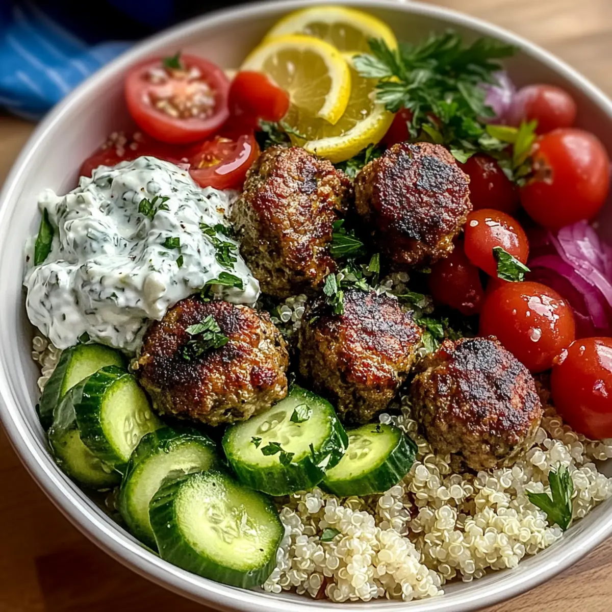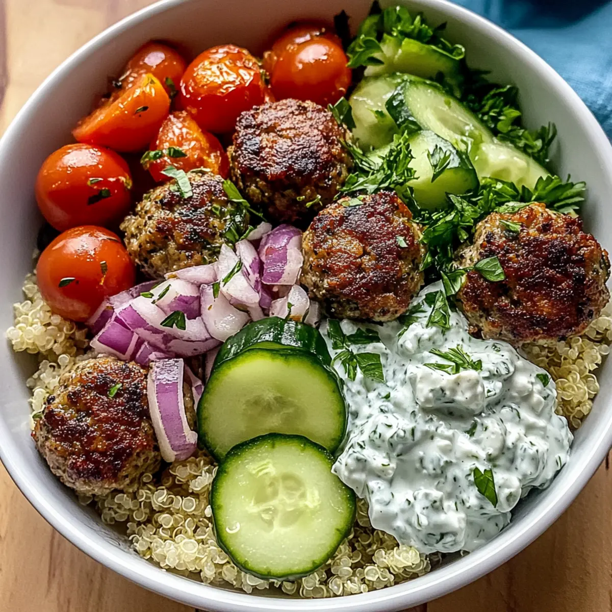 • Layer with Care: Assemble the bowl with attention to layering. Start with quinoa or rice, then add fresh veggies, followed by meatballs and finish with tzatziki and feta for the best flavor balance.