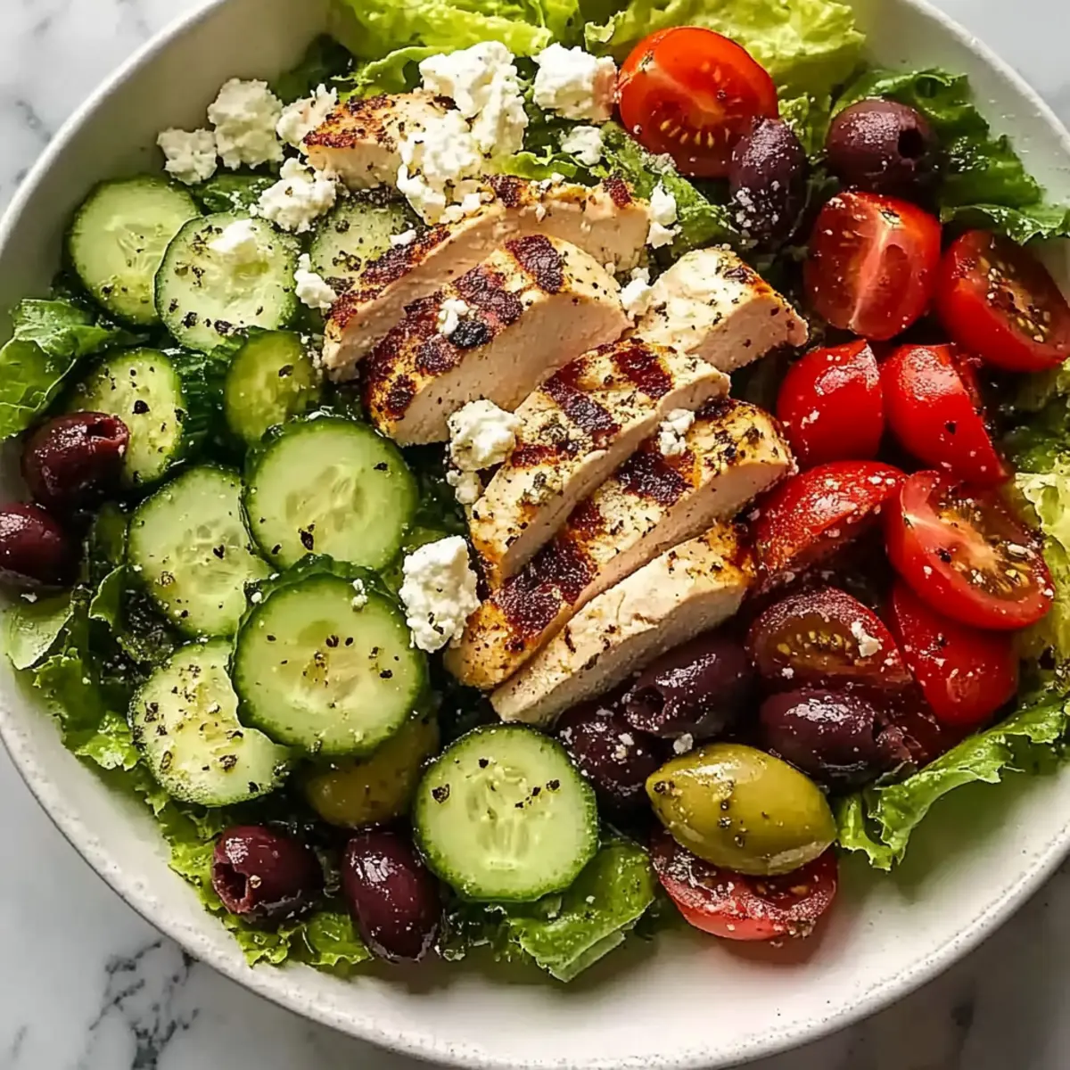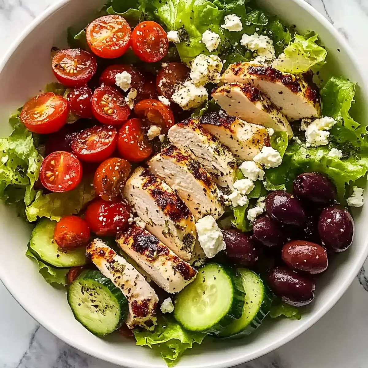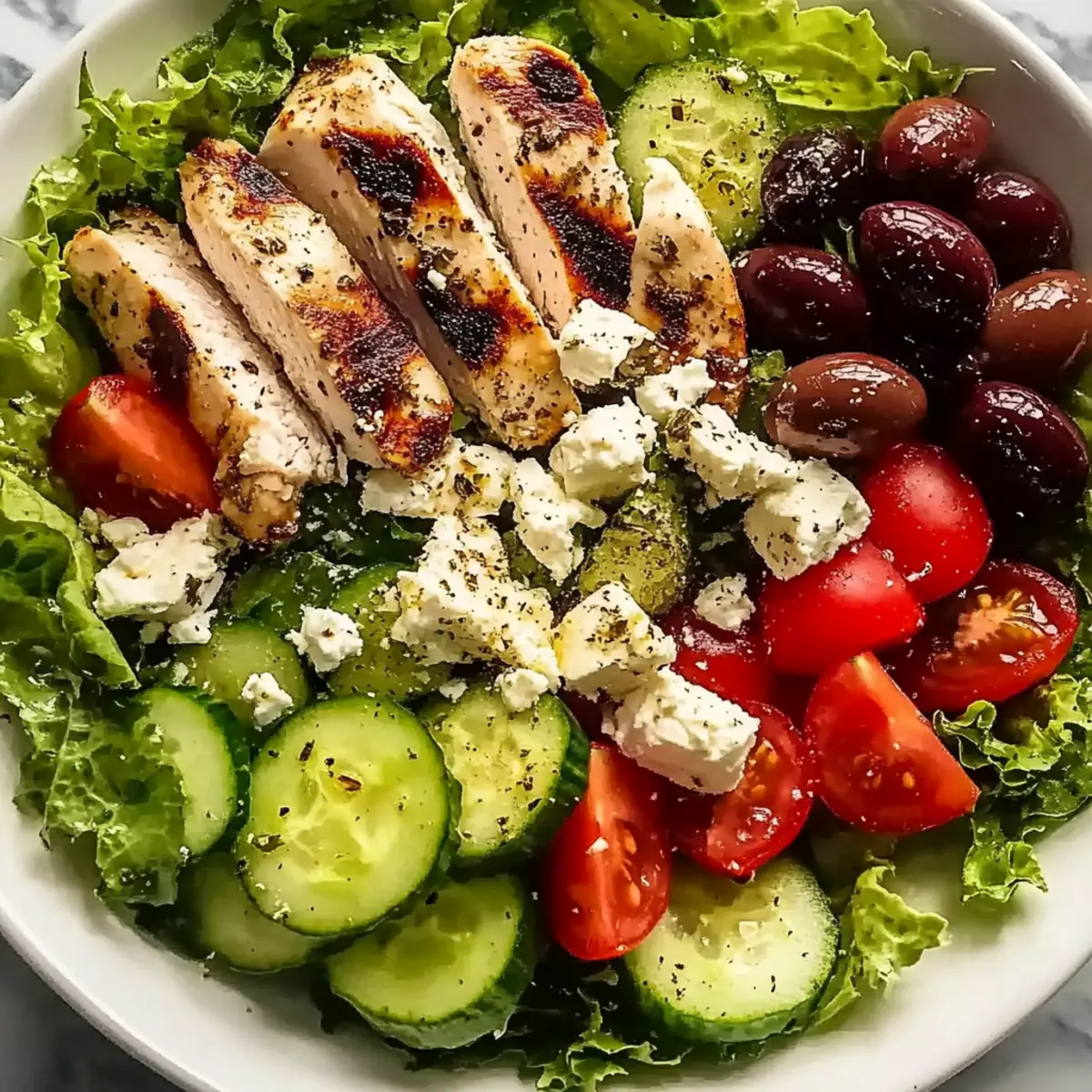 Facebook Twitter Pinterest LinkedInStepping into a sun-soaked garden, the vibrant colors of fresh produce beckon me closer. This Easy Greek Salad with Chicken captures that exact essence of summer, bringing a taste of the Mediterranean right to your kitchen. With crisp cucumbers, succulent tomatoes, tangy feta, and briny olives, each bite is a celebration of flavor and freshness. It’s the ideal light meal that feels both satisfying and refreshing, making it perfect for busy weeknights or leisurely weekend gatherings. Plus, you can easily adapt it for a gluten-free or vegetarian audience by swapping out the chicken. Are you ready to dive into this delightful dish and elevate your salad game? Why try Greek Salad with Chicken? Flavorful Fusion: This salad marries Mediterranean ingredients into a perfect bowl of freshness, making every bite a true delight. Versatile Customization: Easily adjust the recipe to fit dietary preferences—swap chicken for grilled shrimp or mixed greens for a vegetarian delight. Quick & Simple: With straightforward steps and minimal prep time, you can whip this up for any occasion, from weeknight dinners to weekend parties. Healthy & Satisfying: Packed with nutrient-rich veggies and lean protein, this dish fills you up without weighing you down, making it an ideal light meal. Crowd-Pleasing Appeal: Whether you’re feeding a family or hosting friends, this Greek Salad with Chicken is bound to impress and satisfy everyone at the table. Greek Salad with Chicken Ingredients For the Salad • Lettuce – Provides a delightful crunch and fresh taste; Roman or Iceberg works well—just choose heads without brown spots. • Cucumbers – Adds a refreshing crunch; feel free to peel them or leave the skin on based on your preference. • Tomatoes – Their juicy texture enhances the salad’s vibrancy; opt for ripe varieties like Roma or cherry for the best flavor. • Feta Cheese – Offers a creamy, salty kick; use blocks and crumble just before serving for optimal texture. • Olives – Their briny flavor enhances the dish; Kalamata or green olives are traditional choices that really bring it together. • Chicken Breast – Serves as a great source of protein; grill or pan-sear until golden brown, allowing it to rest before slicing for perfect results. • Red Onion – Provides sharpness and crunch; soaking it in water for a bit will mellow its intensity if desired. For the Dressing • Oregano-Lemon Dressing – A delightful mix of olive oil, red wine vinegar, minced garlic, dried oregano, sugar, and salt/pepper; this dressing elevates the Greek Salad with Chicken with its zesty flavor. Step‑by‑Step Instructions for Greek Salad with Chicken Step 1: Prepare Lettuce Begin by washing the lettuce thoroughly to remove any dirt or debris, then dry it completely to avoid a watery salad. Tear the cleaned Romaine or Iceberg leaves into bite-sized pieces, allowing their vibrant greens to shine in your Easy Greek Salad with Chicken. Place the prepared lettuce in a large salad bowl. Step 2: Chop Vegetables Slice the cucumbers into thin rounds and dice the tomatoes into bite-sized pieces, keeping an eye on their ripeness for optimal flavor. Pit and chop the olives into smaller bits, creating a colorful medley of fresh vegetables. Once chopped, add all these ingredients to the bowl with the lettuce for a fresh burst of Mediterranean flavors. Step 3: Cook Chicken Season the chicken breasts with salt, pepper, and a sprinkle of oregano to enhance the flavors. Heat a pan over medium-high heat and cook the chicken for about 6-7 minutes on each side or until golden brown and cooked through. Rest the chicken for 10 minutes after cooking to maintain its juices before slicing it into strips to add atop your Greek Salad with Chicken. Step 4: Assemble Salad In the large bowl filled with lettuce and veggies, layer in the sliced chicken, crumbled feta cheese, and any remaining olives. The combination of textures and flavors will come together beautifully, visually enticing with its vibrant colors. Toss gently to mix without bruising the ingredients, keeping everything fresh and crisp. Step 5: Make Dressing To create a zesty dressing, combine olive oil, red wine vinegar, minced garlic, sugar, dried oregano, and a pinch of salt and pepper in a jar. Secure the lid and shake vigorously for about 30 seconds until the mixture is emulsified. Taste and adjust the seasoning if needed, allowing the flavors to meld beautifully before drizzling over your Greek Salad with Chicken. Step 6: Serve Just before serving, pour the freshly made dressing over the assembled salad and gently toss to coat all ingredients evenly. This final touch enhances the vibrant flavors while ensuring freshness. Serve the salad immediately to enjoy the crispness of the vegetables and the warm, savory chicken that completes this delightful Mediterranean dish. What to Serve with Easy Greek Salad with Chicken? Experience the perfect blend of flavors and textures as you create a delightful meal around this crowd-pleasing salad masterpiece. Warm Pita Bread: Soft, warm pita serves as a delightful scoop for the salad, enhancing the Mediterranean vibe while adding a lovely chewy texture. Tzatziki Sauce: This cool, creamy yogurt dip complements the salad’s bright ingredients, offering a refreshing contrast that enhances each bite. Roasted Vegetables: Seasoned and roasted seasonal veggies add depth and sweetness, creating a hearty side that balances the salad’s freshness beautifully. Crusty Baguette: A crunchy baguette is perfect for wiping up leftovers from the plate, making each meal feel cozy and indulgent. Olive Oil Drizzle: A simple drizzle of high-quality olive oil intensifies the Mediterranean flavors, inviting a rich, velvety note to the fresh salad. White Wine Spritzer: Light and bubbly, a spritzer with fresh lemon or lime brightens the meal, refreshing your palate between bites of savory delights. Lemon Sorbet: For dess