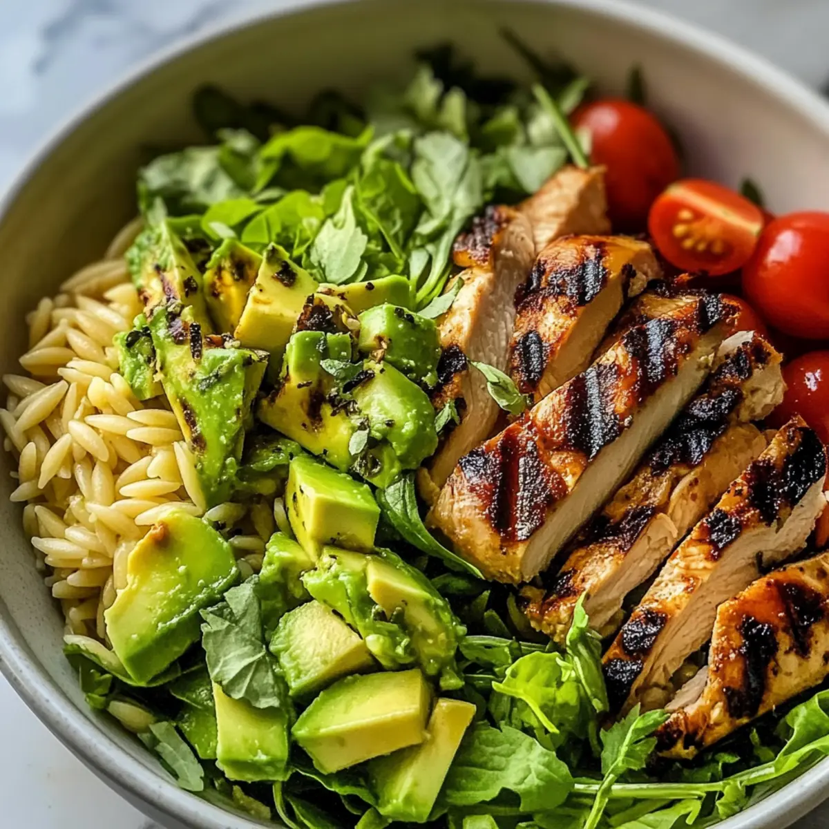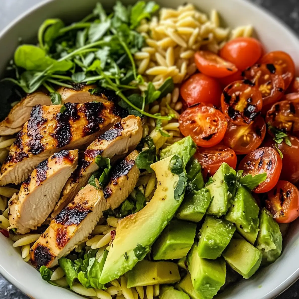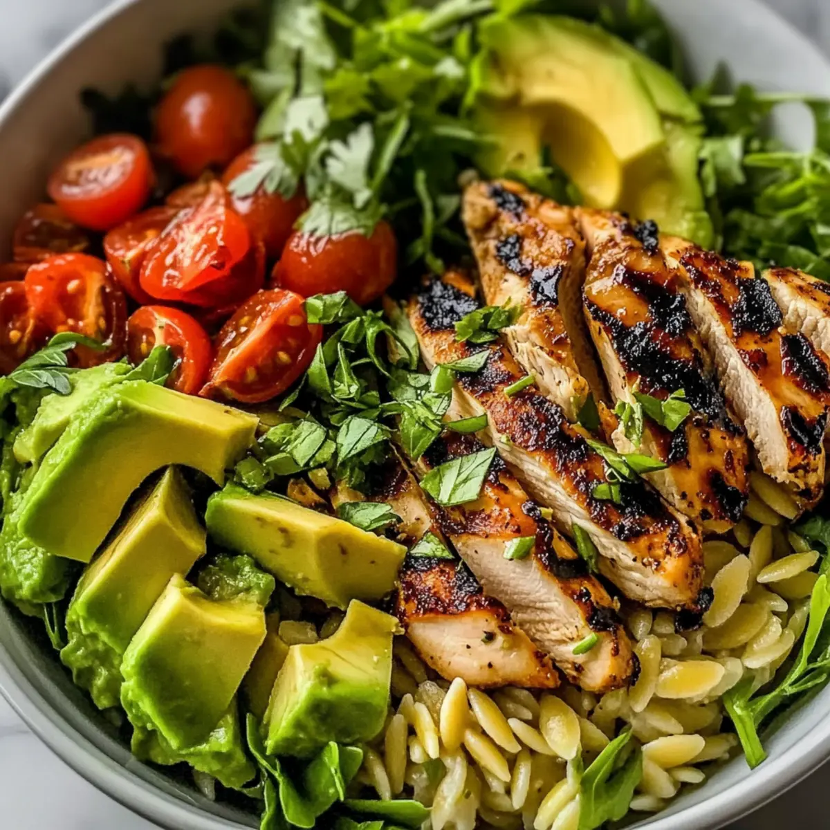 As I tossed together the ingredients for my Grilled Chicken Orzo Salad, the colors alone made me smile. This dish not only sings with vibrant greens, juicy tomatoes, and bright citrus notes but also brings the satisfying crunch of fresh veggies and the heartiness of orzo pasta—all drizzled with a zesty vinaigrette. Perfect for those warm summer evenings, this salad is healthy, customizable, and a breeze to whip up on busy weekdays or for laid-back gatherings. Whether you’re meal prepping for the week or impressing friends at a weekend barbecue, this recipe ticks every box. Have you ever tried a salad that feels like a Mediterranean getaway on your plate? Let’s dive into making this deliciously refreshing dish together! Why Is This Salad a Must-Try? Simplicity: The Grilled Chicken Orzo Salad comes together in just a few steps, making it perfect for busy weeknights. Flavor Explosion: Each bite bursts with the freshness of herbs, the creaminess of avocado, and the zesty kick of the dressing, ensuring every meal feels like a special occasion. Customizable: Easily swap ingredients to suit your taste—try adding roasted chickpeas or grilled shrimp for a twist! Meal Prep Friendly: This salad is perfect for making ahead; just store the components separately and toss when you’re ready to eat. Crowd-Pleasing: Whether at a family BBQ or a potluck, it’s sure to impress and satisfy everyone, as seen in other favorites like Grilled Chicken Broccoli and Chicken Skewer Salad. Grilled Chicken Orzo Salad Ingredients For the Salad • Orzo – the base of the salad that adds delightful texture; substitute with quinoa for a gluten-free option. • Chicken Breasts – lean protein that makes the dish hearty; rotisserie chicken works well if you’re short on time. • Avocado – brings creaminess and healthy fats to every bite; swap for a soft-boiled egg for a different twist. • Feta Cheese – introduces a tangy flavor that complements the salad; goat cheese or mozzarella balls can be tasty substitutes. • Cherry Tomatoes – add a pop of color and sweetness; feel free to use any seasonal tomatoes available. • Red Onion – offers a bit of sharpness; green onions can be a milder alternative. • Fresh Herbs (e.g., parsley, basil) – enhance the freshness and flavor; don’t hesitate to use any favorite herbs you love! For the Dressing • Olive Oil – the foundation of the vinaigrette that adds richness; extra virgin olive oil gives a great flavor. • Vinegar – red wine or apple cider vinegar creates tanginess; consider balsamic for a sweeter note. • Lemon Juice – brightens the flavors and balances the dressing; fresh juice is recommended for best results. • Dijon Mustard and Honey – brings depth and sweetness to the dressing; tailor the quantities to your taste. • Garlic – boosts the dressing’s aroma; omit if you prefer a milder flavor. Crafting the perfect Grilled Chicken Orzo Salad requires these fresh ingredients to ensure that each bite is vibrant and delicious! Step‑by‑Step Instructions for Grilled Chicken Orzo Salad Step 1: Cook the Orzo Begin by bringing a large pot of salted water to a rolling boil. Once boiling, add the orzo pasta and cook according to the package directions, which typically takes about 8-10 minutes. When the orzo is al dente, drain it in a colander, then rinse it briefly under cold water to stop the cooking process. Set the cooled orzo aside to prepare for the salad. Step 2: Grill the Chicken While the orzo is cooking, preheat your grill or grill pan over medium-high heat. Lightly coat the chicken breasts with olive oil, and season generously with salt and pepper. Grill the chicken for about 5-6 minutes per side, until the internal temperature reaches 165°F and the juices run clear. Once done, let the chicken rest for a few minutes before slicing it into thin strips for the salad. Step 3: Make the Dressing In a medium bowl, whisk together ¼ cup of olive oil, 2 tablespoons of your choice of vinegar, the juice of one lemon, 1 tablespoon of Dijon mustard, and 1 tablespoon of honey. Mince 1 clove of garlic and add it to the mixture, along with a pinch of salt and pepper. Continue whisking until the dressing is well combined and emulsified, creating a zesty flavor for your Grilled Chicken Orzo Salad. Step 4: Assemble the Salad In a large mixing bowl, combine the cooked orzo, sliced grilled chicken, diced avocado, halved cherry tomatoes, thinly sliced red onion, crumbled feta cheese, and fresh herbs of your choice. Pour the prepared dressing over these ingredients and gently toss to coat everything evenly. Make sure each ingredient is well-distributed, creating a colorful and flavorful mix. Step 5: Serve or Chill You can serve the Grilled Chicken Orzo Salad immediately for a fresh and vibrant meal, or let it chill in the fridge for 20-30 minutes to allow the flavors to meld beautifully. This dish is not only delicious but also perfect for meal prep, serving well during busy weeknights or casual gatherings with friends and family. What to Serve with Grilled Chicken Orzo Salad Pairing this vibrant salad with the right sides adds depth to your meal, elevating it to a festive occasion. Crusty Garlic Bread: The warm, buttery goodness of garlic bread is a delightful contrast to the lightness of the salad and perfect for soaking up any extra dressing. Grilled Vegetables: Smoky, tender veggies like zucchini and bell peppers enhance the Mediterranean theme and provide a wonderful texture that complements the salad’s freshness. Lemon Herb Quinoa: Quinoa seasoned with lemon and fresh herbs mirrors the flavors of the orzo salad while adding a nutty bite, creating a fit-for-summer feast. Chilled White Wine: A glass of crisp Sauvignon Blanc harmonizes perfectly with the zesty vinaigrette and grilled chicken, adding a touch of elegance to your dining experience. Mixed Green Salad: Fresh greens tossed in a light vinaigrette not only add a refreshing crunch b