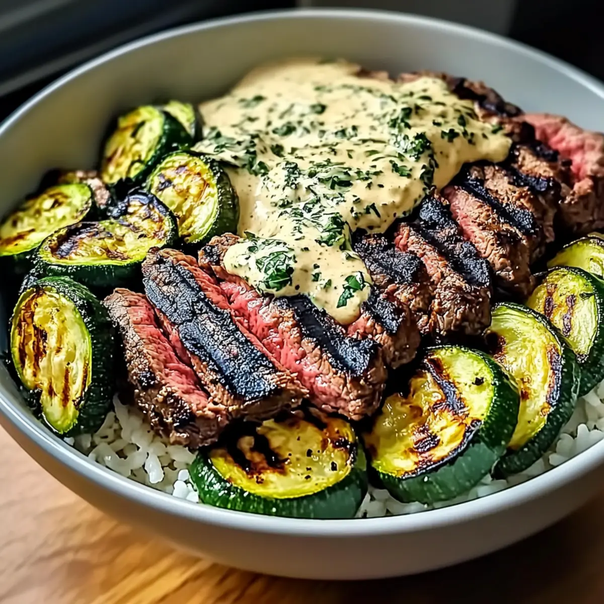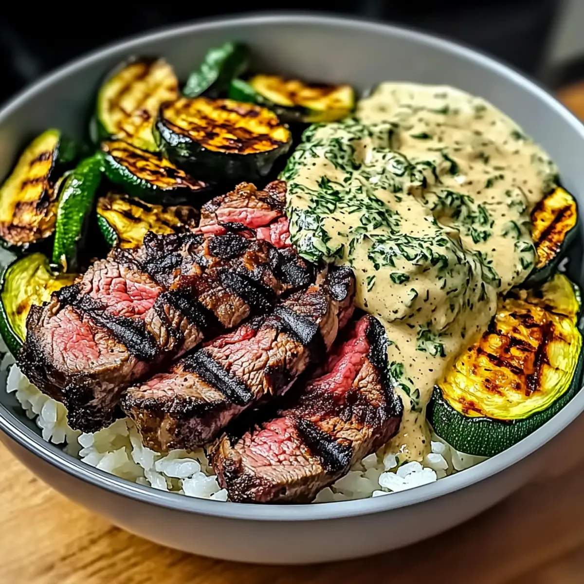 Facebook Twitter Pinterest LinkedInAs I stood at the grill, the sun dipping low in the sky, a mouthwatering aroma enveloped me, whispering promises of a delightful meal. Today, I’m excited to share my Grilled Steak Bowl with Creamy Herb Sauce & Grilled Zucchini Bliss—a dish that transforms ordinary ingredients into an extraordinary culinary experience. This recipe shines with the flexibility to swap in proteins like chicken or tofu, ensuring everyone at the table is satisfied. And the best part? You can whip it up in under 30 minutes, making it a fantastic choice for a busy weeknight. Perfect for meal prepping, you can savor unique variations all week long and never get bored. Intrigued? Let’s dive into this flavorful journey together! Why Choose This Grilled Steak Bowl? Quick and Delicious: This Grilled Steak Bowl is a weeknight hero, taking less than 30 minutes from grill to table. Customization Galore: Whether you crave steak, chicken, or tofu, this dish caters to your protein preferences seamlessly. Creamy Herb Sauce: The rich, creamy herb sauce elevates each bite, adding layers of flavor that will have your family asking for seconds. Ideal for Meal Prep: Perfect for those busy weeks, prep your ingredients ahead of time and mix and match flavors as you please. For more meal prep ideas, check out my Grilled Chicken Broccoli recipe. Fresh and Nutritious: Packed with grilled zucchini and your choice of base, enjoy a hearty, balanced meal that supports a healthy lifestyle. Crowd-Pleaser: With its vibrant colors and mouthwatering flavors, this bowl is bound to impress anyone at your table, whether it’s a family dinner or a casual gathering. Grilled Steak Bowl Ingredients For the Steak Flank, Ribeye, or New York Strip Steak – Offers tenderness and rich flavor; substitute with sirloin for a budget-friendly option. Olive Oil – Essential for grilling and enhances flavor; use extra virgin for a gourmet touch. For the Zucchini Zucchini – Adds smokiness and texture; feel free to replace with bell peppers or asparagus for a twist. For the Creamy Herb Sauce Sour Cream or Greek Yogurt – Forms the creamy base; replace with plant-based yogurt for a dairy-free alternative. Fresh Herbs (Chives or Parsley) – Enhances flavor profile; customize with different herbs as desired. Dijon Mustard – Contributes delightful tang; optional but highly recommended for depth. Garlic Powder – Provides savory depth; fresh minced garlic can be used for a bolder flavor. Onion Powder – Adds additional flavor; swap for diced shallots for a fresh, mild bite. For the Base Cooked Rice or Mashed Potatoes – Serves as a hearty foundation; try jasmine rice or cauliflower mash for low-carb options. Step‑by‑Step Instructions for Grilled Steak Bowl with Sauce & Grilled Zucchini Bliss Step 1: Prep the Steak Begin by patting your steak dry with paper towels, ensuring it absorbs seasonings well. Generously season both sides with salt, pepper, garlic powder, and onion powder. Allow the seasoned steak to rest at room temperature for 15-20 minutes; this will enhance its tenderness and flavor when cooked. Step 2: Make the Sauce In a mixing bowl, whisk together sour cream or Greek yogurt, Dijon mustard, chopped herbs, garlic powder, salt, and pepper until smooth and creamy. Once thoroughly combined, cover the bowl and refrigerate the sauce for at least 10 minutes. This allows the flavors to meld beautifully, enhancing the richness of the Grilled Steak Bowl with Sauce & Grilled Zucchini. Step 3: Grill the Zucchini Slice the zucchini into thick rounds, ensuring they cook evenly on the grill. Toss the slices in a bowl with olive oil, salt, and pepper for flavor. Preheat your grill or grill pan over medium heat, then add the zucchini slices and grill them for 2-3 minutes on each side until they are tender and have nice grill marks. Step 4: Cook the Steak In the same preheated grill pan (adding a splash of olive oil if necessary), place the seasoned steak. Sear it for about 3-4 minutes per side for medium-rare, aiming for an internal temperature of 130°F. Once cooked to your liking, transfer the steak to a plate and let it rest for 5-10 minutes to lock in the juices. Step 5: Assemble the Bowl As you prepare to serve, choose your base: cooked rice or mashed potatoes. Layer a generous portion in a bowl, followed by the smoky grilled zucchini and sliced steak. Finally, drizzle the creamy herb sauce over the top, giving your Grilled Steak Bowl with Sauce & Grilled Zucchini Bliss a delicious finish that’s as visually appealing as it is flavorful. Make Ahead Options These Grilled Steak Bowls with Creamy Herb Sauce & Grilled Zucchini are a fantastic option for busy home cooks looking to save time during the week! You can prepare the steak marinade and the creamy herb sauce up to 24 hours in advance; just store them separately in the refrigerator. The grilled zucchini can also be prepped ahead and refrigerated for up to 3 days. When you’re ready to serve, simply grill the steak (which should take about 8 minutes) and reheat the zucchini gently. This way, every bite will be just as delicious as when you first made it, allowing you to enjoy gourmet flavors with minimal effort and maximum convenience! What to Serve with Grilled Steak Bowl with Creamy Herb Sauce & Grilled Zucchini Creating a delightful meal from the Grilled Steak Bowl with Creamy Herb Sauce & Grilled Zucchini is easier when you have the perfect accompaniments to enhance the experience. Creamy Mashed Potatoes: Their buttery richness complements the hearty steak and sauce, making every bite comforting and satisfying. Garlicky Green Beans: Crisp-tender green beans sautéed with garlic add a fresh crunch that brightens up the bowl’s flavors. Herbed Quinoa: Nutty and protein-packed, quinoa introduces a textural contrast while absorbing the creamy herb sauce brilliantly. Roasted Sweet Potatoes: These sweet, caramelized bites offer a delightful balance to the sa