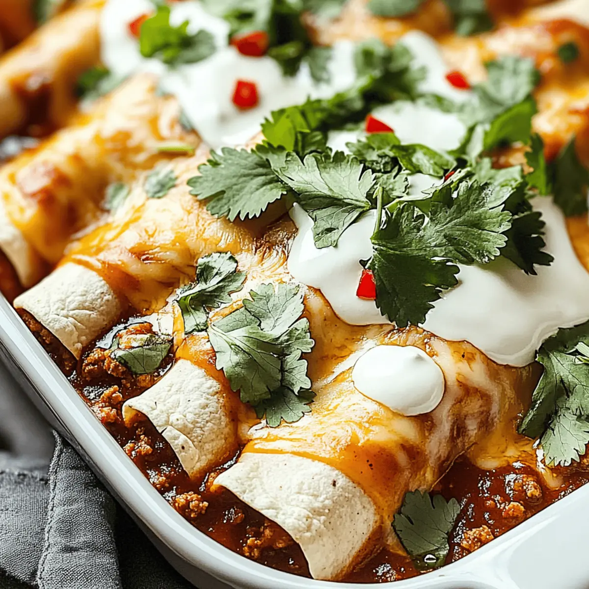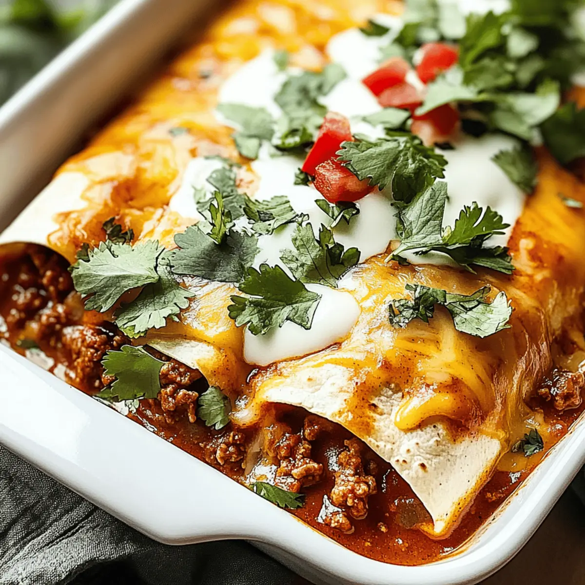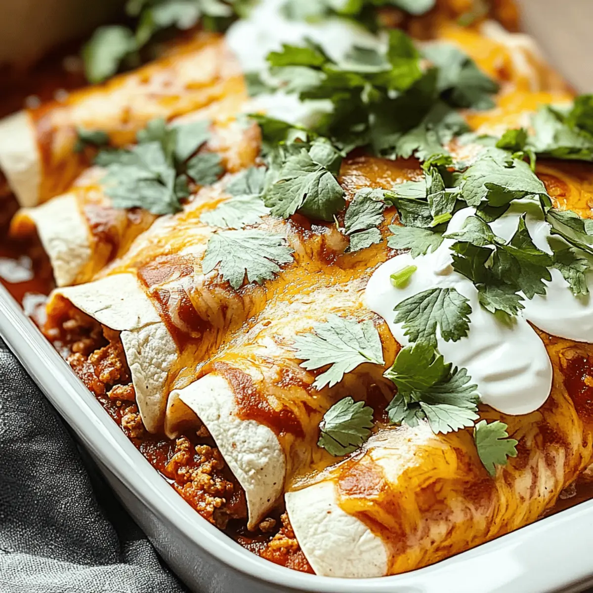 As the oven hums and the tantalizing scent of cumin and garlic fills the air, I can’t help but feel a sense of comfort wash over me. Ground Beef Enchiladas are more than just a meal; they are a warm embrace on a chilly evening, perfect for cozy family gatherings or a casual weeknight dinner. With their customizable nature, these enchiladas are a crowd-pleaser that invites creativity—swap in ground turkey, or even go vegetarian with lentils! Not only are they easy to prepare, but they also deliver that delightful sensation of satisfaction, making every bite utterly fulfilling. Ready to dive into a dish that brings smiles around the table? Let’s get started! Why Are Ground Beef Enchiladas So Irresistible? Comforting, each bite offers a warm hug on a plate, perfect for cozy evenings or gatherings. Versatile, you can effortlessly substitute proteins or toppings to suit your taste preferences, making it ideal for anyone. Quick and Easy, this dish comes together in no time, ensuring you spend less time in the kitchen and more time with loved ones. Flavor-packed, with layers of seasoned beef, gooey cheese, and zesty sauce, your taste buds will dance with joy! Serve them alongside a fresh salad or rice for a complete meal that satisfies everyone’s cravings. Ground Beef Enchiladas Ingredients Experience the joy of crafting the perfect Ground Beef Enchiladas with these easy-to-follow components. For the Filling Ground Beef – A hearty main protein source; feel free to substitute with ground turkey, chicken, or lentils for a vegetarian option. Onions – Adds depth and sweetness; use yellow or white onions for the best flavor. Garlic – Enhances taste and aroma; fresh garlic is strongly recommended over powdered varieties. Cumin – Provides a warm, earthy flavor; adjust based on your taste preferences. Chili Powder – For added heat and complexity; increase the amount for a spicier kick. For Assembling Tortillas – These hold your delicious filling together; consider using corn tortillas for a unique taste and texture, and lightly fry them before filling to prevent moisture absorption. Enchilada Sauce – Gives moisture and flavor; opt for zesty homemade or store-bought sauces. Shredded Cheese – Adds creaminess and deliciousness; choose cheddar, Monterey Jack, or a cheese blend for the perfect topping. Step‑by‑Step Instructions for Ground Beef Enchiladas Step 1: Preheat the Oven Begin by preheating your oven to 375°F (190°C). This step is crucial as it ensures your Ground Beef Enchiladas bake evenly and achieve that beautifully bubbly finish. While the oven heats up, gather your ingredients, including tortillas and enchilada sauce, to streamline your cooking process. Step 2: Cook the Beef and Onions In a large skillet over medium heat, add the ground beef and diced onions. Brown the beef for about 5-7 minutes, stirring occasionally, until the meat is fully cooked and the onions have turned translucent. This sizzling mixture will fill your kitchen with a savory aroma, hinting at the delicious enchiladas to come. Step 3: Add Spices and Garlic Once the beef and onions are cooked, stir in the minced garlic, cumin, and chili powder, cooking for an additional minute. Keep stirring until the garlic becomes fragrant, which usually takes about 30 seconds. This step will enhance the flavor profile of your Ground Beef Enchiladas and create a tantalizing base for your filling. Step 4: Assemble the Enchiladas Now it’s time to assemble! Take a tortilla and spoon a generous amount of the beef mixture onto the center. Roll the tortilla tightly, ensuring the seam is on the bottom to keep it from unrolling. Place each rolled enchilada seam-side down in a greased 9×13 inch baking dish, creating a cozy arrangement that will soon be drenched in sauce. Step 5: Pour the Sauce and Cheese After all enchiladas are nestled in the baking dish, pour the enchilada sauce evenly over the top. Make sure every rolled tortilla is generously covered for maximum flavor. Then, sprinkle shredded cheese liberally over the sauce, allowing your Ground Beef Enchiladas to become gooey and delicious as they bake. Step 6: Bake to Perfection Pop the baking dish into your preheated oven and bake uncovered for 20-25 minutes. Keep a close eye on them; they’re done when the cheese is bubbly and golden brown, creating a tantalizing crust. The aroma wafting from the oven will surely make your mouth water as you await their perfect doneness. How to Store and Freeze Ground Beef Enchiladas Fridge: Store leftovers in an airtight container in the refrigerator for up to 3 days, ensuring they stay fresh and tasty for quick meals. Freezer: Wrap enchiladas tightly in plastic wrap and foil, then place them in a freezer-safe bag for up to 3 months. To reheat, thaw overnight in the fridge before warming in the oven. Reheating: For best results, reheat enchiladas in the oven at 350°F (175°C) until warmed through, about 20 minutes. This retains their cheesy goodness and soft tortilla texture. Make-Ahead: Assemble the Ground Beef Enchiladas up to a day in advance and store them in the fridge before baking. Enjoy a hassle-free dinner ready to pop in the oven! What to Serve with Easy Ground Beef Enchiladas? Create a delightful meal that brings comfort and joy to your table. Mexican Rice: A staple side that pairs perfectly, with its fluffy texture and subtle spices complementing the rich flavors of enchiladas. Fresh Garden Salad: Crisp greens, tomatoes, and avocados add brightness and a refreshing crunch, offering a lovely contrast to the hearty enchiladas. Refried Beans: Creamy and satisfying, they make for a delicious, protein-packed side that nicely balances the meal. Guacamole and Tortilla Chips: Creamy guacamole with crunchy chips makes for a wonderful appetizer while the enchiladas bake, setting the mood for a festive meal. Sour Cream: A dollop of this cool, creamy delight on top of each enchilada elevates the dish, enhancing flavor w