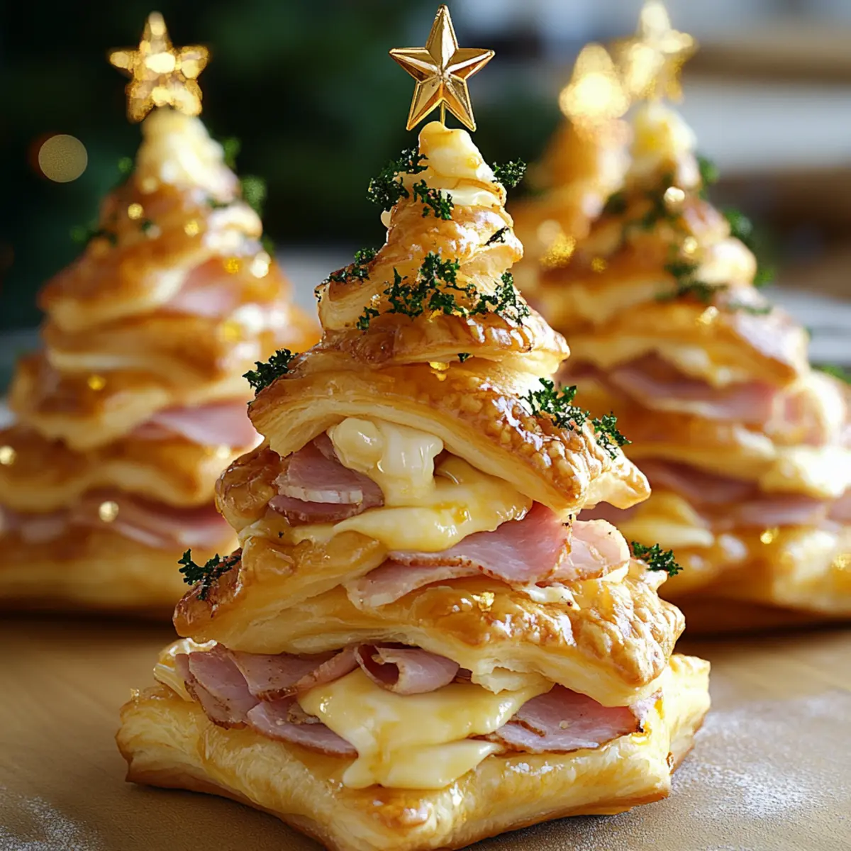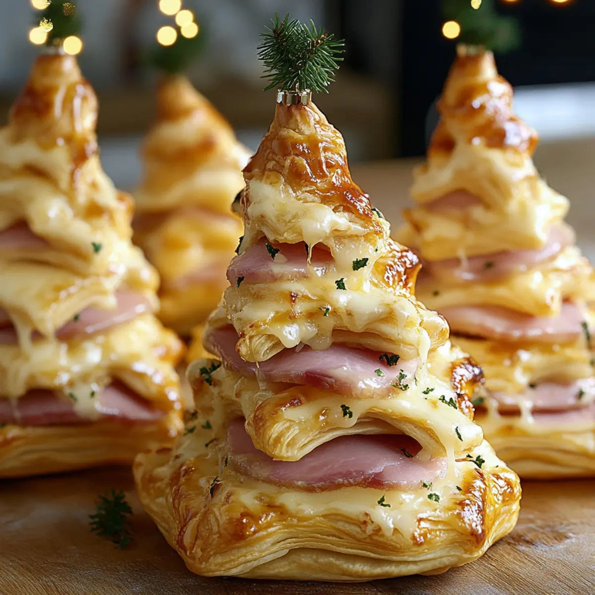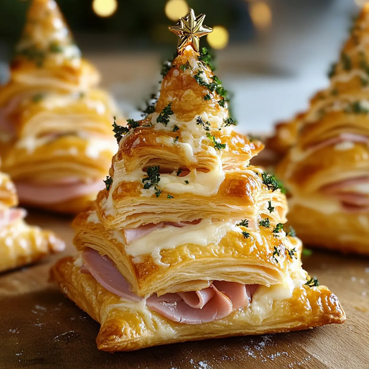 As I pulled the golden, flaky Ham & Cheese Puff Pastry Christmas Trees from the oven, I could practically hear the holiday cheer bustling in my kitchen. These whimsical and festive treats are not just a feast for the eyes; they are quick to whip up and perfect for a crowd, turning any gathering into a special occasion. With layers of melt-in-your-mouth cheese and savory ham tucked inside crisp pastry, each bite is a celebration of flavor and creativity. What’s even better? You can easily swap in vegetarian fillings or add a touch of sweetness with honey mustard or fig jam for a fun twist. Ready to impress your family and friends? Let’s dive into the joy of holiday cooking! Why Make Ham & Cheese Christmas Trees? Delightfully Festive: These adorable trees are a surefire way to bring holiday cheer to your table. Easy to Prepare: With just a few simple steps, you can create an impressive dish that looks like a masterpiece. Versatile Filling Options: Feel free to get creative—try a Potato Cheese Donut filling or even a sweet twist with honey mustard! Crowd-Pleasing Appetizer: Perfect for any gathering, these treats are sure to have guests coming back for more. Perfectly Portable: They make for a tasty finger-food option, ideal for parties or gatherings where mingling is essential. Enjoy the magic of the season with each bite of these delightful Ham & Cheese Puff Pastry Christmas Trees! Ham & Cheese Puff Pastry Christmas Trees Ingredients • Gather your ingredients for a festive feast! For the Pastry Puff Pastry – Perfect for a flaky and delicious structure; make sure it’s fully thawed before use for best results. Cheese – Choose your favorite option like cheddar, gouda, or mozzarella for the ultimate melty goodness. For the Filling Deli Ham – Adds a savory dimension; feel free to swap it for turkey as a lighter alternative. Honey Mustard or Fig Jam (optional) – These add a sweet-savory flavor that elevates the overall taste experience. For the Glaze Melted Butter – Brush over the trees for a rich, golden finish. Minced Garlic – Use fresh for the best aroma, though jarred garlic can drain any last-minute stress. Chopped Fresh Parsley – This herb not only enhances flavor but also brightens the dish visually; if using dried, reduce the amount. For the Garnish Sesame or Poppy Seeds – Add a touch of crunch and a festive look to your beautiful creations. Wooden Skewers – Essential for forming your delightful tree shapes; toothpicks can be used in a pinch. Enjoy creating your delicious Ham & Cheese Puff Pastry Christmas Trees while spreading joy and cheer this holiday season! Step‑by‑Step Instructions for HAM & CHEESE PUFF PASTRY CHRISTMAS TREES Step 1: Preheat & Prepare Begin by preheating your oven to 375°F (190°C). While the oven warms, line a baking sheet with parchment paper to prevent sticking and ensure even cooking. This step is crucial for achieving that golden, flaky texture in your Ham & Cheese Puff Pastry Christmas Trees. Step 2: Assemble Layers Take one sheet of thawed puff pastry and lay it flat on a clean surface. Layer slices of your chosen cheese evenly across the pastry, followed by a generous layer of deli ham. Place the second sheet of puff pastry on top, gently pressing it down to seal the layers while keeping the edges neat for a tidy final presentation. Step 3: Cut & Shape With a sharp knife or pizza cutter, slice the layered pastry into 1-inch wide strips. To form the tree shape, take each strip and fold it back and forth over a wooden skewer, creating a zigzag effect. This folding technique will create the whimsical tree silhouette essential for your festive Ham & Cheese Puff Pastry Christmas Trees. Step 4: Glaze In a small bowl, combine melted butter, minced garlic, and chopped parsley. This aromatic glaze will add flavor and richness to your trees. Using a pastry brush, generously apply the glaze over each puff pastry tree. This step enhances the festive appearance and ensures a beautifully golden finish when baked. Step 5: Bake Now it’s time to bake! Place your assembled and glazed Ham & Cheese Puff Pastry Christmas Trees on the prepared baking sheet. Slide them into the preheated oven and bake for 20-25 minutes, or until they puff up and turn a beautiful golden brown. Keep an eye on them; they should look irresistibly flaky when done. Step 6: Serve Once baked to perfection, remove the trees from the oven and allow them to cool slightly on the baking sheet. Serve warm or at room temperature, perfect for impressing guests at any holiday gathering. Pair with marinara sauce, honey mustard, or garlic aioli for an extra flavor boost! What to Serve with Festive Ham & Cheese Puff Pastry Christmas Trees Elevate your holiday spread with delightful pairings that will enchant your guests and highlight the playful spirit of these charming trees. Garlicky Aioli: A creamy dip that complements the savory flavors while adding a delightful garlic punch, perfect for those who love a bit of zest. Marinara Sauce: This classic Italian dip brings a tangy sweetness that contrasts beautifully with the richness of the cheese and ham, making each bite burst with flavor. Tomato Soup: A warm and comforting bowl of rich tomato soup serves as a cozy companion, perfect for dipping and balancing the crispy texture of the trees. Honey Mustard: Offering a sweet and tangy twist, this sauce enhances the festive flavor of the trees, especially if you’ve included fig jam in your filling. Fresh Salad: A crisp and colorful salad with mixed greens, cranberries, and walnuts can provide a refreshing contrast, making for a well-rounded holiday meal. Sparkling Cider: Celebrate the season with a bubbly, non-alcoholic sparkling cider. The fruity effervescence adds a festive touch that pairs wonderfully with the savory puff pastry. Cheese Platter: Create a melty cheese board with a variety of cheeses, including cheddar and gouda, to echo the flavors of your Ham & Cheese Puff Pastry 