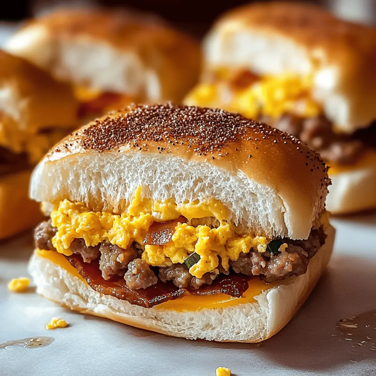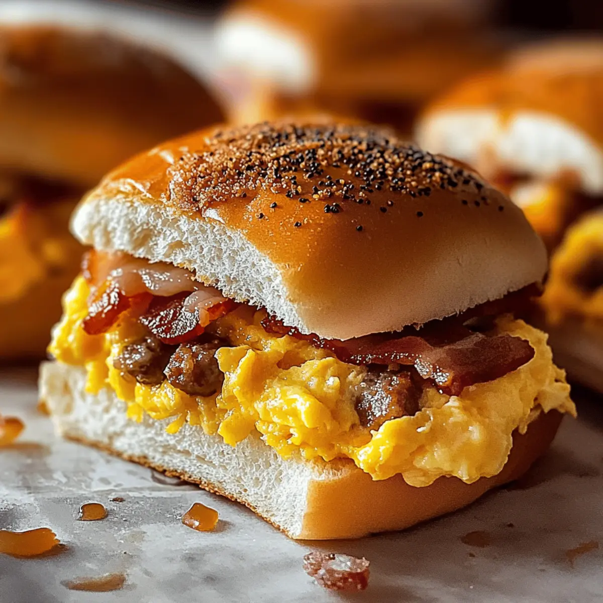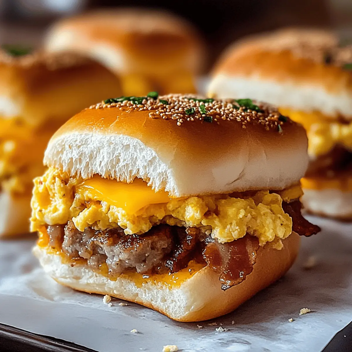 Standing in my kitchen one chilly morning, the whispers of sizzling bacon and creamy scrambled eggs beckoned me to create something special. That’s when I decided to whip up these Tasty Hawaiian Roll Breakfast Sandwiches. Not only are they a delightful way to start your day, but they’re also quick to prepare, making busy mornings feel a whole lot easier. Picture soft, sweet Hawaiian rolls cradling fluffy eggs, savory sausage, crispy bacon, and melted cheese—each bite an irresistible blend of flavors. Plus, there’s a gluten-free option to cater to different dietary preferences so everyone can savor this hearty breakfast. Who wouldn’t want to fill their mornings with such a delicious treat? I can’t wait to share this recipe with you—are you ready to elevate your breakfast game? Why are Hawaiian Roll Sandwiches so special? Quick and Easy: This recipe requires minimal prep time, ensuring a swift start to your busy mornings. Savory Comfort: Each bite bursts with a delightful combination of sausage, eggs, and cheese, offering a warm embrace of flavors. Flexible Ingredients: Feel free to substitute ingredients, like using turkey sausage or veggie crumbles, making it versatile for your family’s preferences. Crowd-Pleaser: These sandwiches are perfect for brunch gatherings or cozy family breakfasts, reeling in compliments from everyone. Try pairing them with a fresh fruit salad or serving alongside Hawaiian Roll Breakfast for an exciting morning spread! Hawaiian Roll Breakfast Sandwiches Ingredients • Let’s dive into what makes these breakfast sandwiches a hit! For the Sandwiches Hawaiian Rolls – Softness and sweetness create a perfect base for your sandwich. Ground Pork Breakfast Sausage – Provides savory flavor; can be replaced with turkey sausage for a lighter option. Large Eggs – Essential for fluffiness in the sandwich filling; egg substitutes can offer a lower cholesterol alternative. Cheese (sliced) – Melts beautifully and adds richness; cheddar or gouda works well for a creamy texture. Crispy Bacon – Adds a delightful crunch and flavor; consider turkey bacon for a lighter dish. Melted Butter – Brushed on top before baking, it adds richness; oil can be used for a dairy-free version. Everything Bagel Seasoning – Offers a delightful crunch and flavor diversity; while optional, it’s highly recommended. For the Sauce Sriracha Mayo – Adds a spicy kick to your sandwiches; adjust the sriracha amount based on your heat preference. Now that you have the ingredients ready, let’s move on to the fun part—making these fantastic Hawaiian Roll Breakfast Sandwiches! Step‑by‑Step Instructions for Hawaiian Roll Breakfast Sandwiches Step 1: Preheat the Oven Begin by preheating your oven to 350°F (175°C). While it’s warming up, line a baking sheet with parchment paper to ensure your Hawaiian Roll Breakfast Sandwiches don’t stick during baking. This initial prep will set the stage for your delicious sandwiches. Step 2: Cook the Sausage In a medium skillet over medium heat, add crumbled ground pork breakfast sausage. Cook for about 5–7 minutes, stirring occasionally, until it’s browned and cooked through. Once done, drain any excess grease to keep your sandwiches from becoming soggy. Set the cooked sausage aside while you prepare the eggs. Step 3: Scramble the Eggs Using the same skillet, crack in the large eggs and scramble them over medium heat, stirring gently. Season with a pinch of salt and pepper, and cook for around 3–5 minutes until fluffy and just set. With the eggs perfectly cooked, move on to layering your Hawaiian Roll Breakfast Sandwiches. Step 4: Assemble the Bottom Layers Carefully cut the Hawaiian rolls horizontally, keeping the tops attached. Place the bottom halves on the lined baking sheet. Begin layering by adding a slice of cheese on each roll, followed by a generous portion of the cooked sausage, the scrambled eggs, and crispy bacon. Top each layer with another slice of cheese for extra melty goodness. Step 5: Top and Season Gently place the top halves of the Hawaiian rolls over the fillings. Brush the tops with melted butter to create a golden, crispy crust. For an added flavor boost, sprinkle everything bagel seasoning generously across the tops of the rolls—this step elevates your Hawaiian Roll Breakfast Sandwiches to a new level of deliciousness. Step 6: Bake the Sandwiches Cover the assembled sandwiches with aluminum foil, and bake in the preheated oven for about 15–20 minutes. The cheese should melt beautifully during this time. Remove the foil and bake uncovered for an additional 5–10 minutes, or until the tops are golden brown and enticing. Step 7: Prepare the Sriracha Mayo While your Hawaiian Roll Breakfast Sandwiches are baking, prepare the sriracha mayo. In a small bowl, whisk together mayonnnaise, sriracha, Worcestershire sauce, and a pinch of salt. Taste and adjust the spiciness to your preference. This zesty dip will pair perfectly with your warm, savory sandwiches. Step 8: Serve and Enjoy Once your sandwiches are golden and mouthwatering, take them out of the oven and let them cool for a minute. Slice them into individual servings, and offer the sriracha mayo on the side for dipping. These Hawaiian Roll Breakfast Sandwiches are perfect for a cozy morning, bringing joy to your breakfast table! Expert Tips for Hawaiian Roll Breakfast Sandwiches Prep Ahead: Assemble the Hawaiian Roll Breakfast Sandwiches the night before and refrigerate. This will save you precious minutes in the morning! Watch the Eggs: Cook the scrambled eggs just until fluffy. Overcooking can make them rubbery and dry, taking away from your sandwich’s creaminess. Perfect Bake: Keep foil on for the first baking phase to allow the cheese to melt beautifully. Remove it for the last 5-10 minutes to achieve a golden, crispy top. Flavor Variations: Experiment with cheese varieties, like pepper jack, for an added kick. The right cheese can elevate th