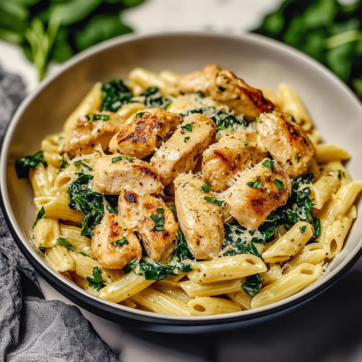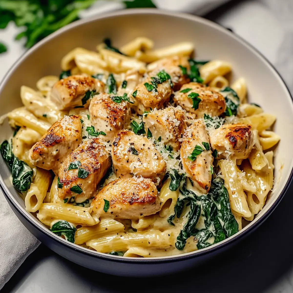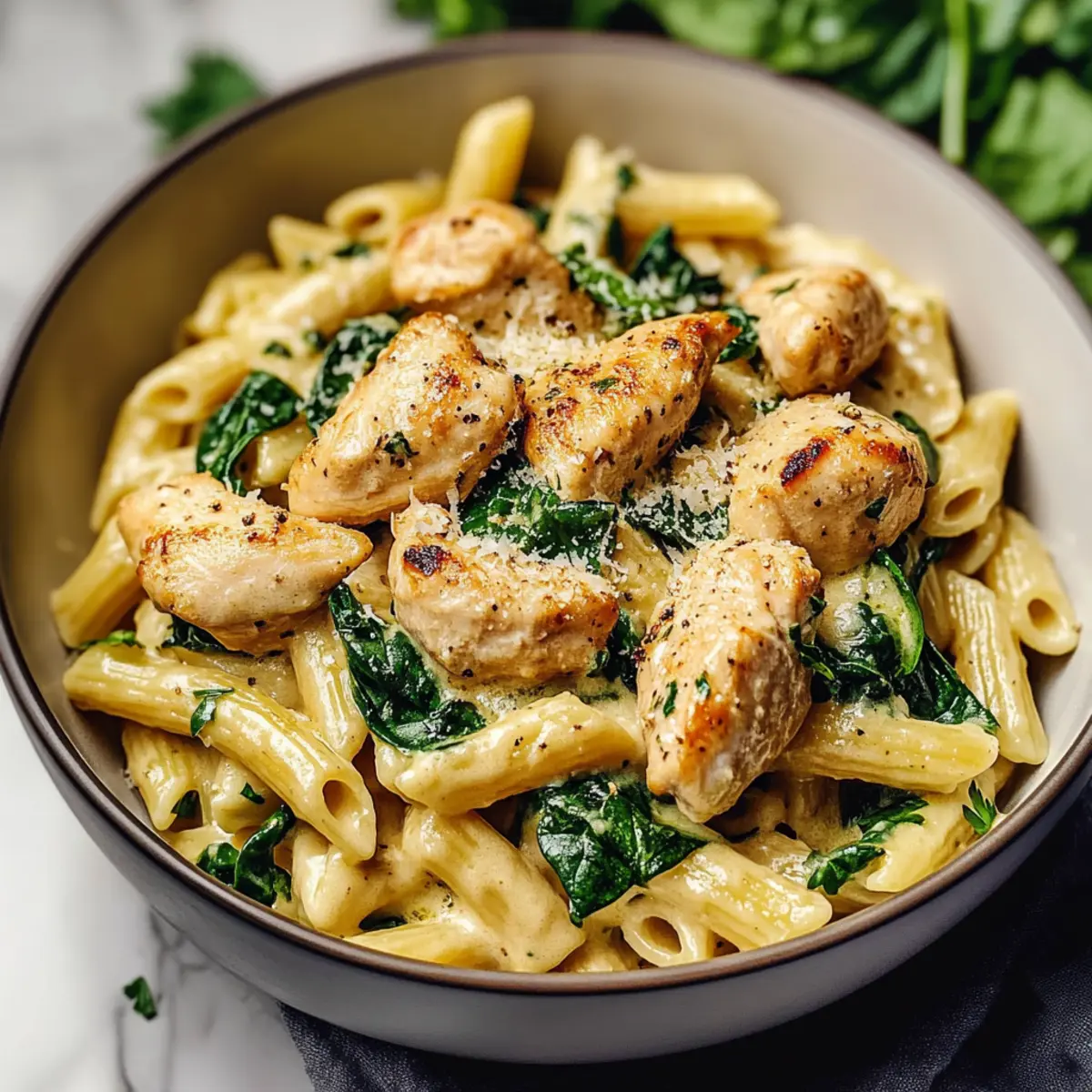 Return the cooked chicken back to the skillet, then toss in the drained pasta. If you’re using spinach, stir in a handful now, allowing it to wilt and mingle with the creamy sauce. Keep tossing for a couple of minutes until everything is well-coated and heated through.