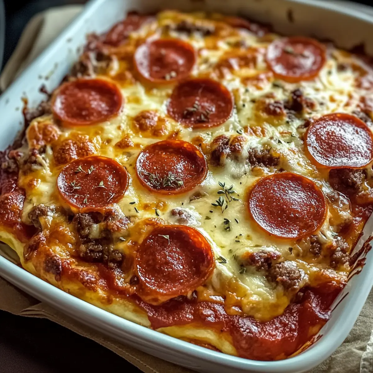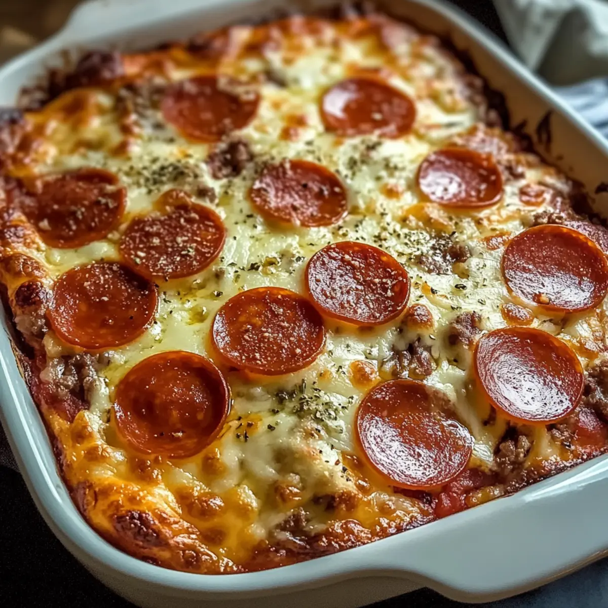 As I pulled a bubbling, golden dish from the oven, the savory aroma of Italian spices enveloped my kitchen, reminding me that comfort food doesn’t have to be a guilty pleasure. The High-Protein Cottage Cheese Pepperoni Bake is my go-to weeknight meal when pizza cravings strike but I want to stick to my health goals. Packed with protein and low in carbs, this dish beautifully merges flavors of cheesy goodness and pepperoni delight—all without the crust! Not only does it come together in just a few simple steps, but it’s also a fantastic option for meal prep, making it perfect for busy lifestyles. Ready to transform your weeknight dinners with this satisfying bake? Let’s dive into the recipe! Why Is This Bake a Game Changer? Packed with Protein: This High-Protein Cottage Cheese Pepperoni Bake is an excellent way to sneak in a hearty dose of protein, keeping you full and satisfied. Low-Carb Delight: Perfect for keto enthusiasts, it delivers mouthwatering flavors without the carbs often found in traditional pizza. Simple to Prepare: Just a few steps to an enticing dish, making it an ideal choice for busy weeknights or meal prep. Versatile Options: Customize it with your favorite veggies or change up the cheese for a new twist every time you bake! You’ll love serving it alongside a fresh green salad or making it a delightful snack with marinara sauce for dipping. Give it a try and experience comfort food that aligns with your health goals! High-Protein Cottage Cheese Pepperoni Bake Ingredients • For this delicious dish, gather these ingredients to ensure a tasty result! For the Base Cottage Cheese – Primary source of protein; adds creaminess. Substitution: Use ricotta for a richer texture. Large Eggs – Binds the ingredients and adds protein. Do not substitute with egg whites for a light texture. Shredded Mozzarella Cheese – Melts beautifully for a gooey texture. Substitution: Cheddar or provolone for different flavors. For the Flavor Mini Turkey Pepperoni Slices – Provides a savory, pizza-like flavor. Substitution: Use regular pepperoni or cooked sausage. Grated Parmesan Cheese – Adds sharp flavor and enhances overall taste. No direct substitution; can omit if unavailable. Italian Seasoning – Offers a blend of herbs for a classic flavor. Substitution: Oregano, basil, and thyme individually can work. Garlic Powder – Adds depth of flavor. Substitution: Fresh minced garlic can be used. Salt and Pepper – Enhances all flavors. Adjust to taste. With these essentials in hand, you’re well on your way to whipping up a nutritious and delicious High-Protein Cottage Cheese Pepperoni Bake! Step‑by‑Step Instructions for High-Protein Cottage Cheese Pepperoni Bake Step 1: Preheat and Prepare Begin by preheating your oven to 375°F (190°C). While the oven heats up, grease a 9×9-inch baking dish with your favorite cooking spray or a little olive oil. This ensures that your High-Protein Cottage Cheese Pepperoni Bake comes out smoothly and doesn’t stick to the dish. Step 2: Whisk Together Base Ingredients In a large mixing bowl, combine the cottage cheese and eggs, whisking them together until the mixture is smooth and creamy. This step is essential as it forms the base of your bake, creating a deliciously fluffy texture once cooked. Take your time to ensure everything is well blended before proceeding. Step 3: Add Cheese and Seasonings Next, fold in the shredded mozzarella cheese, most of the mini turkey pepperoni slices, grated Parmesan cheese, Italian seasoning, garlic powder, and a pinch of salt and pepper. Mix thoroughly until all the ingredients are evenly distributed throughout the mixture, creating a savory blend of flavors for your High-Protein Cottage Cheese Pepperoni Bake. Step 4: Pour and Arrange Toppings Once your mixture is ready, pour it into the greased baking dish, spreading it evenly to ensure uniform baking. To finish, arrange the remaining pepperoni slices on top, creating a visually appealing layer that will crisp up beautifully while baking, enhancing the overall flavor of your dish. Step 5: Bake to Perfection Place your baking dish in the preheated oven and bake for 30-35 minutes. Keep an eye on it; you’ll know it’s done when the center is set and the top has turned a golden, bubbly perfection. This is the moment when the comforting aroma fills your kitchen, signaling that your High-Protein Cottage Cheese Pepperoni Bake is almost ready. Step 6: Cool and Serve Once perfectly baked, remove the dish from the oven and allow it to cool for about 5-10 minutes. This brief cooling period makes slicing much easier. Serve your delicious bake warm, paired with a side of marinara sauce for dipping or drizzling—perfect for satisfying those pizza cravings without the carbs! High-Protein Cottage Cheese Pepperoni Bake Variations Feel free to get creative with this delightful dish and personalize it to your taste! Add Veggies: Mix in chopped spinach, mushrooms, or bell peppers to enrich the bake with color and nutrients. Vegetables not only enhance nutrition but also add interesting texture and flavor. Make it Spicy: For those who love some heat, switch to spicy pepperoni or sprinkle in crushed red pepper flakes. A little kick will elevate your dish and tantalize your taste buds! Change the Cheese: Feel free to swap out mozzarella for cheddar, provolone, or your favorite cheese blend. Each option brings a unique flavor twist to your High-Protein Cottage Cheese Pepperoni Bake. Protein Swaps: Experiment with ground turkey, chicken sausage, or plant-based crumbles for a different protein experience. With these variations, you’ll discover new and exciting flavor profiles. Herb Infusion: Enhance the taste with fresh herbs like basil or parsley instead of dried Italian seasoning. This simple change elevates the dish with bright, fresh aromas and flavors. Creamy Additions: Consider adding a dollop of sour cream or Greek yogurt on top before serving. This creamy additi