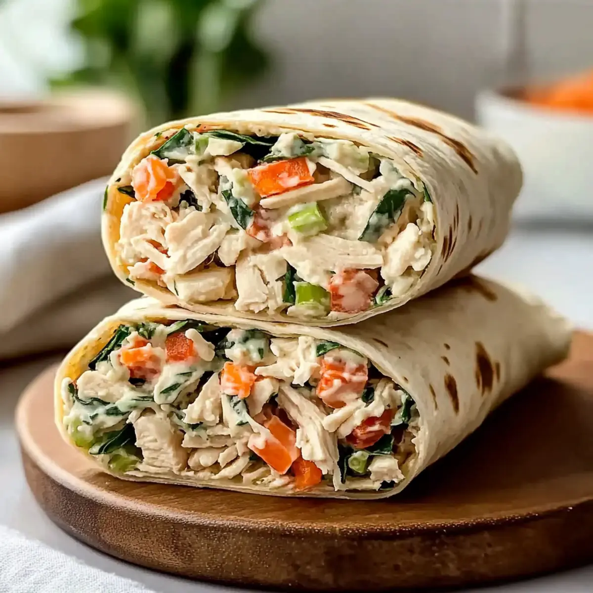 Ensure your chicken is fully cooled before mixing to prevent wilting of the veggies. Refrigerate the assembled wraps for about 30 minutes before serving for optimal flavor melding.
