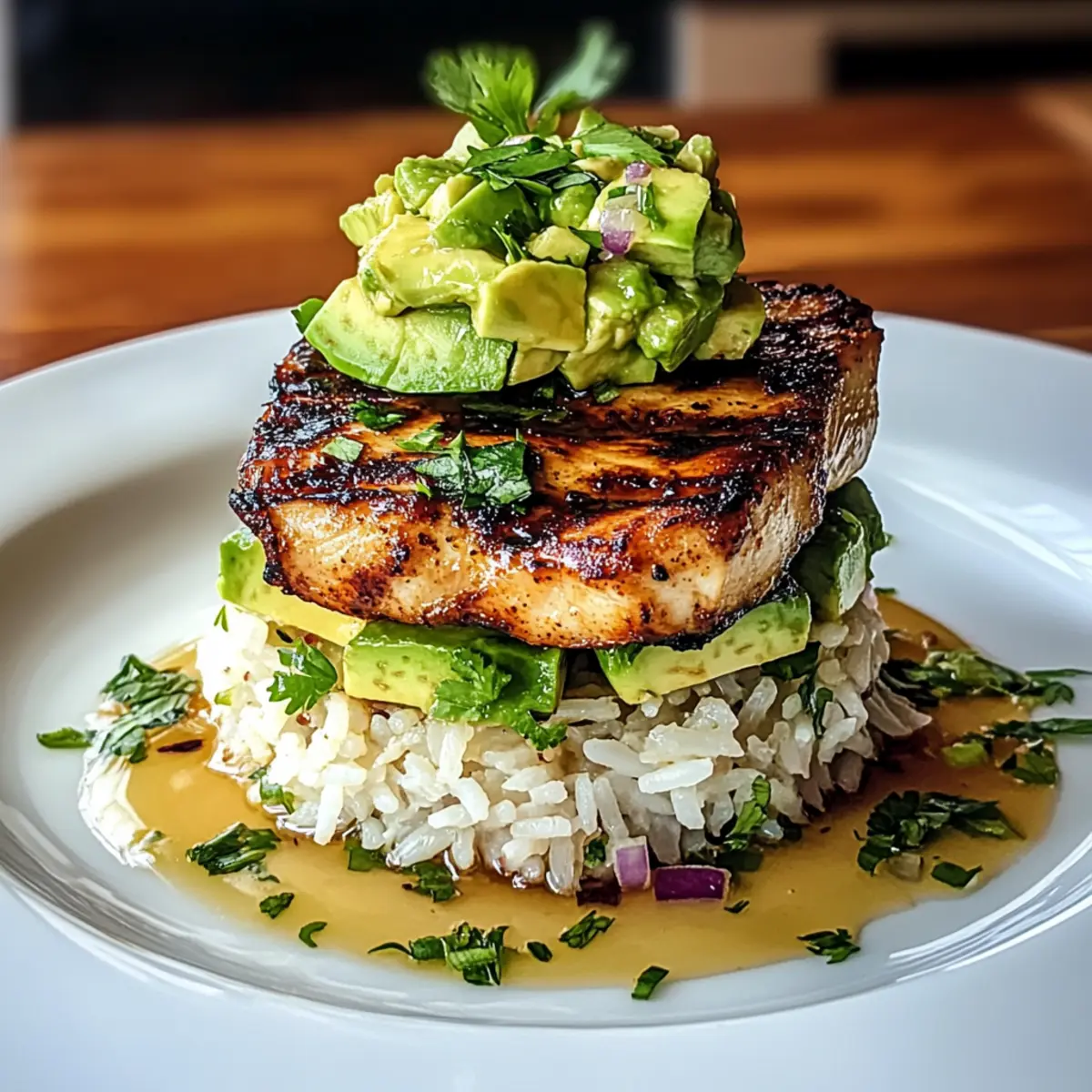 6. Layer jasmine rice on plates, top with sliced grilled chicken, and spoon avocado mixture over the chicken.