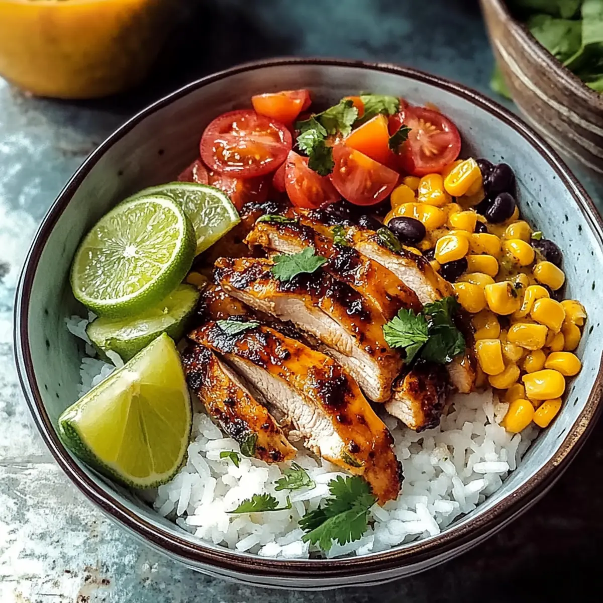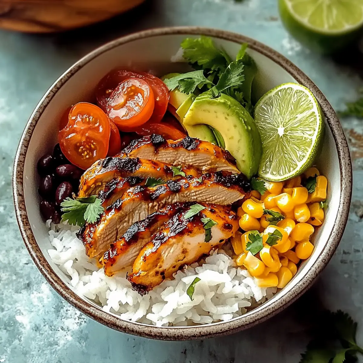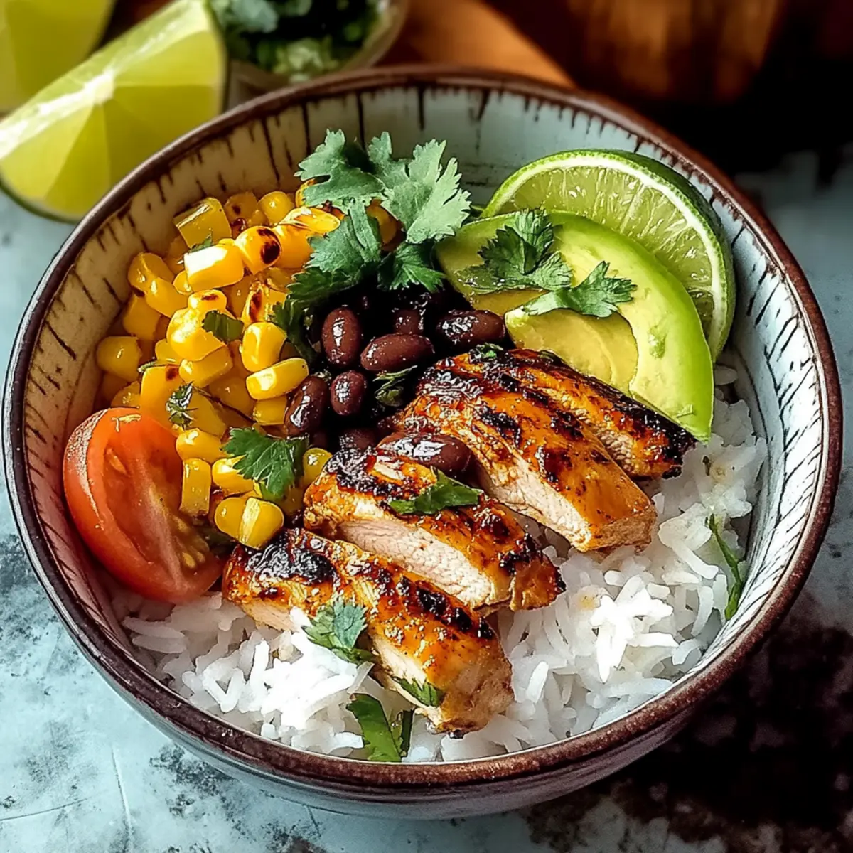 Slice the cooked chicken into strips and place it over a generous serving of the fluffy rice. Top with the heated corn, black beans, and diced avocado for creaminess. Drizzle the remaining marinade over the assembled bowls, and garnish with fresh cilantro. Serve with lime wedges on the side for an extra zesty kick!
