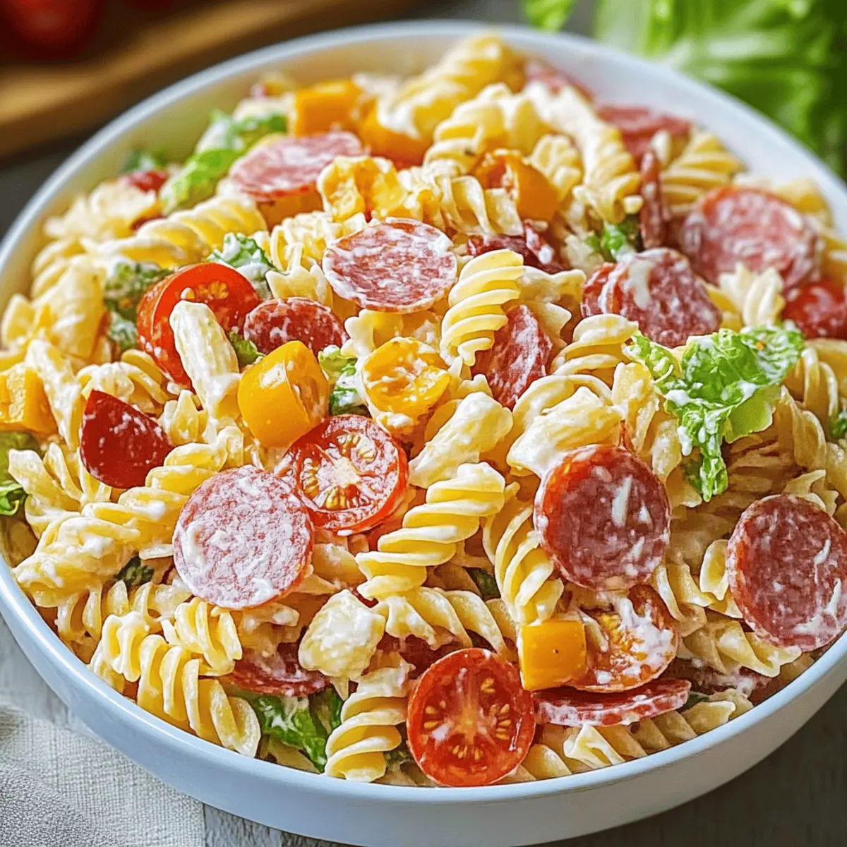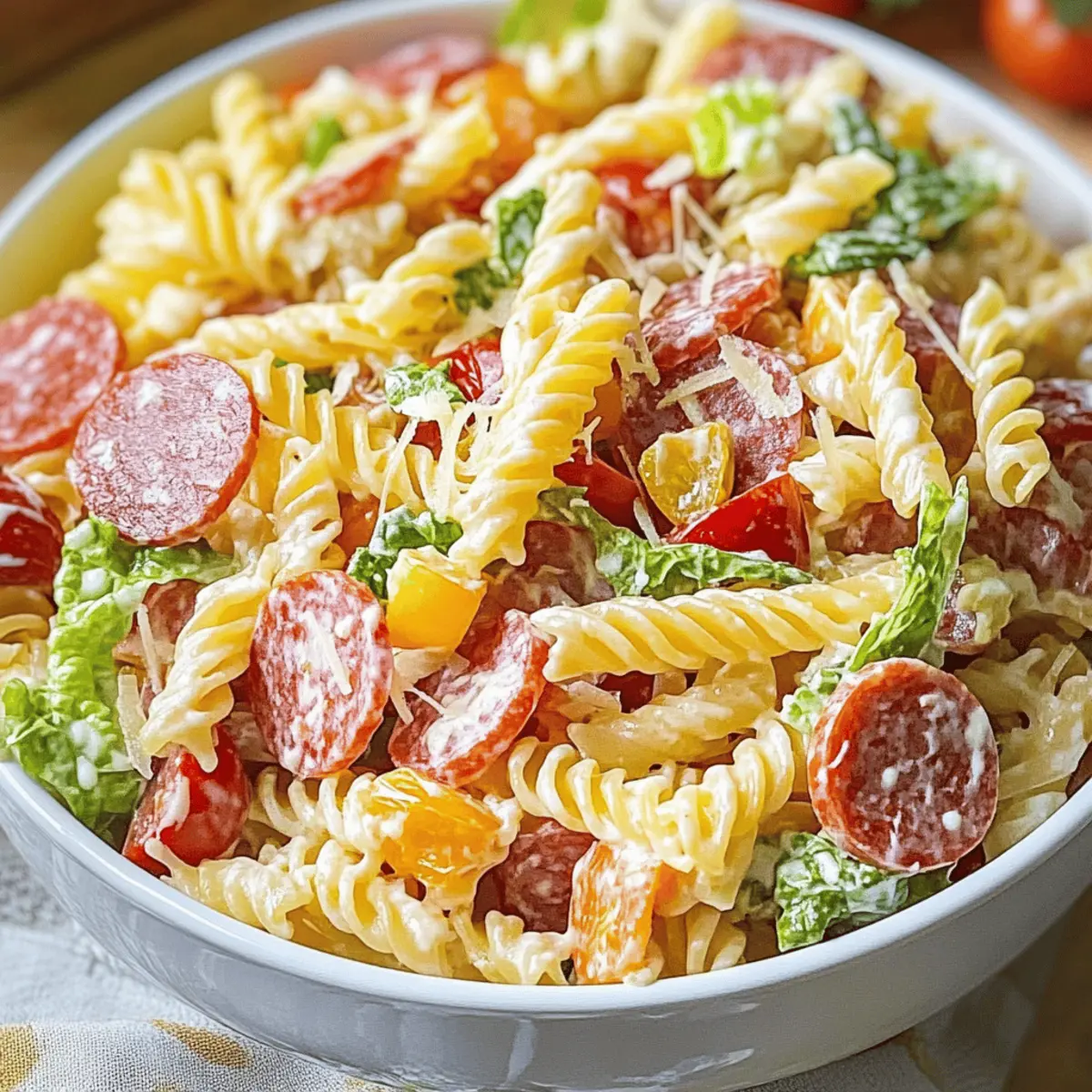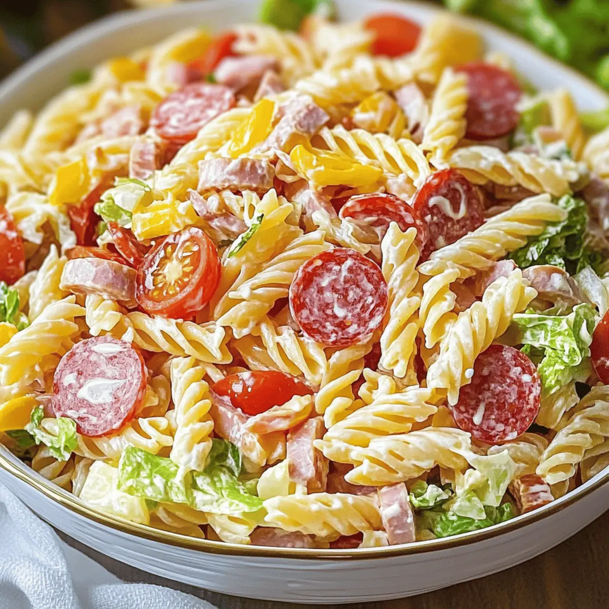 Biting into a fresh Italian Grinder Pasta Salad is like taking a stroll through a bustling Italian market, where vibrant flavors and hearty ingredients abound. This dish is a delightful twist on the classic deli sandwich—transforming savory cured meats, crunchy veggies, and zesty dressing into a refreshing pasta bowl. Not only is the Italian Grinder Pasta Salad a crowd-pleaser perfect for potlucks and summer barbecues, but it also makes meal prep a breeze with its customizable ingredients. You can switch up the meats or veggies to cater to any taste or dietary preference, ensuring everyone at the table finds something to love. Want to learn how to whip up this easy, make-ahead dish that’s bursting with personality? Let’s dig in! Why Is Italian Grinder Pasta Salad a Must-Try? Deliciously Customizable: You can easily adapt this recipe to suit every palate, whether you’re in the mood for spicy salami or prefer a vegetarian option with chickpeas. Perfect for Meal Prep: This salad keeps well in the fridge, making it an excellent choice for busy weeknights or lunches. Just whip it up ahead of time, and you’re ready to go! Flavor Explosion: With layers of savory meats, crisp veggies, and a creamy dressing, each bite is a delightful experience bursting with flavors. Ideal for Gatherings: This crowd-pleaser is sure to impress at any potluck or summer BBQ, rivaling even the best deli sandwiches! Serve it alongside a Pineapple Cucumber Salad for a refreshing meal. Easy to Make: In just a few simple steps, you can create a stunning dish that looks as good as it tastes, ensuring you spend less time in the kitchen and more time enjoying your time with loved ones. Italian Grinder Pasta Salad Ingredients For the Pasta Base • Rotini Pasta – This chewy pasta holds all the flavors beautifully, making it the perfect base for the salad. For the Meats • Pepperoni – Adds a rich, salty flavor; turkey or beef salami can be used for a lighter alternative. • Sliced Salami – Provides a savory depth; substitution with turkey slices creates a leaner option. • Chopped Ham – Gives heartiness to the salad; for a vegetarian version, simply omit. For the Vegetables • Shredded Iceberg Lettuce – Offers crispness and freshness; swap for romaine for a sturdier texture. • Sliced Red Onions – Delivers flavor and crunch; soaking them in cold water mellows their intensity if desired. • Sliced Banana Peppers – Bring a tangy kick; for more heat, consider using jalapeños. • Sliced Black Olives – Elevate the savory profile; green olives can serve as an intriguing substitute. • Chopped Tomatoes – Add juiciness and vibrant color; cherry tomatoes can be used for extra sweetness. For the Cheeses • Shredded Provolone Cheese – Provides creaminess and flavor; feel free to swap it out for mozzarella or feta. • Grated Parmesan Cheese – Adds umami richness; you can skip this for a lower-fat version. For the Dressing • Mayonnaise – Acts as the creamy base of the dressing; Greek yogurt can substitute for a healthier option. • Red Wine Vinegar – Introduces tanginess and depth; apple cider vinegar can work in a pinch. • Olive Oil – Adds richness; lighter oils can be used for a fresher taste. • Italian Seasoning – Gives that aromatic herb flavor; fresh herbs elevate the taste even further. • Salt & Black Pepper – Essential for seasoning; adjust to your liking and boost the flavors in your Italian Grinder Pasta Salad. Step‑by‑Step Instructions for Italian Grinder Pasta Salad Step 1: Cook the Pasta Begin by bringing a large pot of salted water to a boil over high heat. Add the rotini pasta and cook according to package instructions, usually around 8-10 minutes, until al dente. Drain the pasta in a colander and rinse it under cold water for about 1-2 minutes until completely cool. This step is crucial to prevent the pasta from getting mushy in your Italian Grinder Pasta Salad. Step 2: Combine the Ingredients In a spacious mixing bowl, combine the cooled rotini pasta with sliced pepperoni, salami, chopped ham, shredded iceberg lettuce, sliced red onions, banana peppers, black olives, and chopped tomatoes. Toss the ingredients together gently but thoroughly, ensuring every piece is well distributed, creating a vibrant mix of flavors and textures for your Italian Grinder Pasta Salad. Step 3: Prepare the Dressing In a separate bowl, whisk together mayonnaise, red wine vinegar, olive oil, Italian seasoning, salt, and black pepper until smooth and creamy. Aim for a well-blended mixture that brings a tangy richness to your dressing. This flavorful dressing will tie all the components of the Italian Grinder Pasta Salad together, enhancing the overall taste. Step 4: Dress the Salad Pour the creamy dressing over the pasta and meat mixture. Using a large spoon, gently toss the salad until all ingredients are evenly coated with dressing, creating a luscious, cohesive dish. Make sure each rotini piece is enveloped in that deliciousness, ensuring your Italian Grinder Pasta Salad is packed with flavor in every bite. Step 5: Chill and Serve Cover the mixing bowl with plastic wrap or transfer the salad to an airtight container. Chill in the refrigerator for at least 30 minutes to allow the flavors to meld beautifully. Serving the salad cold not only enhances its refreshing qualities but also makes the Italian Grinder Pasta Salad a perfect option for hot summer days or casual gatherings. Make Ahead Options These Italian Grinder Pasta Salad ingredients are perfect for meal prep enthusiasts! You can prepare the pasta, chop the vegetables, and combine the meats up to 24 hours in advance to save time on busy days. For the best flavor and quality, keep the lettuce separate until just before serving; this prevents it from becoming soggy. Store all components in airtight containers in the refrigerator, and simply mix everything together with the dressing before serving. This way, you’ll enjoy vib