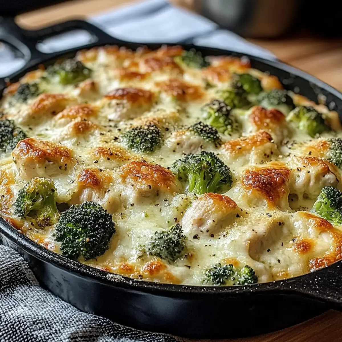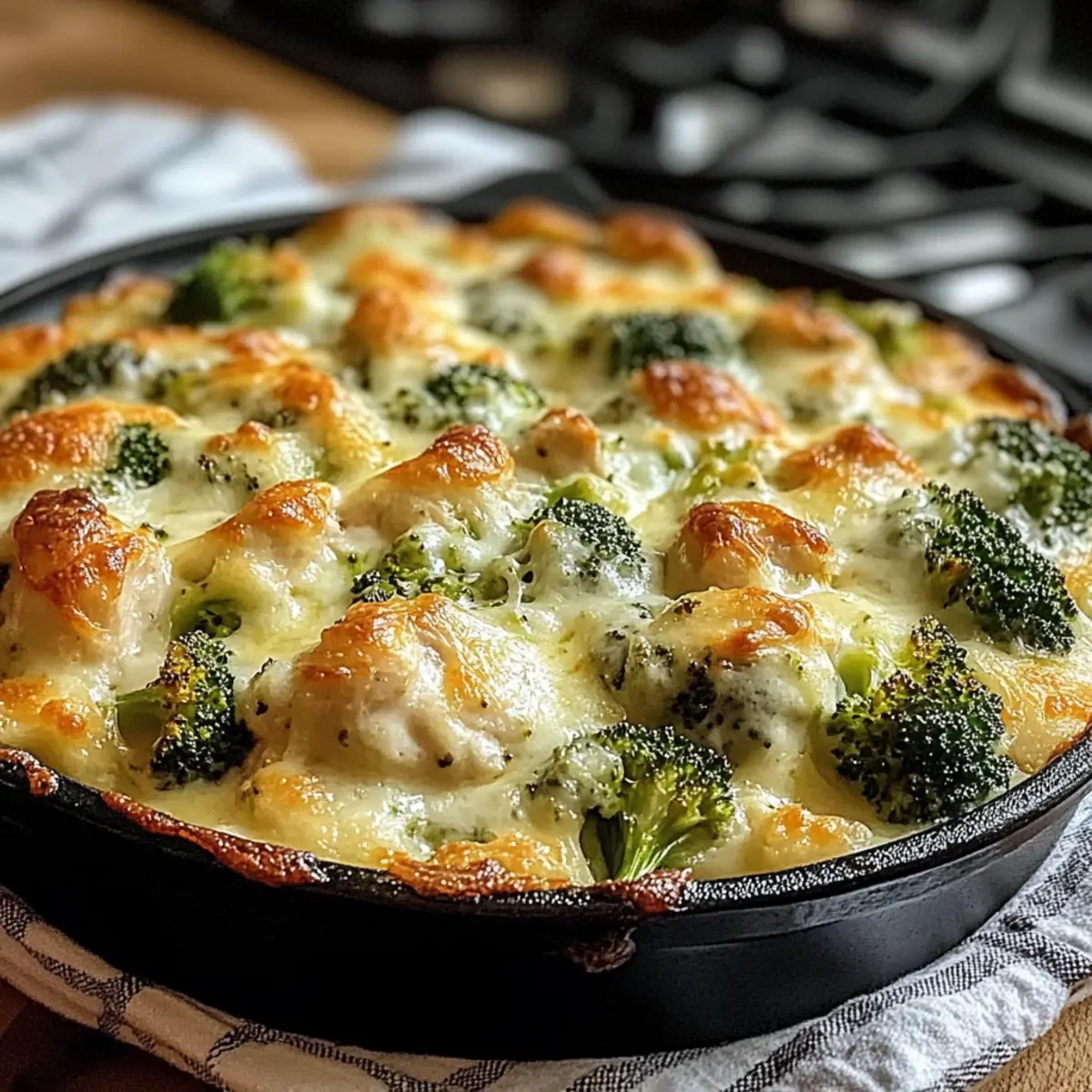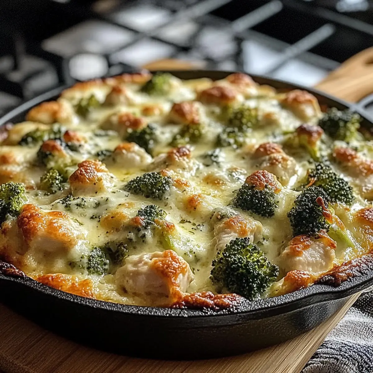 Facebook Twitter Pinterest LinkedInAs I rummaged through my fridge one busy weeknight, the essential ingredients for a cozy dinner began unfolding like a delicious surprise. I stumbled upon tender chicken, vibrant broccoli, and a fistful of cheese just waiting to come together. Thus, the idea for a Keto Chicken Alfredo Broccoli Bake was born—a creamy, comforting dish that doesn’t compromise my low-carb goals. This recipe is perfect for anyone looking for a quick, satisfying meal that impressively pleases even the fussiest of eaters. It’s easy to whip up, and the leftovers are just as delightful! Are you ready to elevate your dinner game and embrace a guilt-free comfort food? Let’s dive into this culinary adventure together! Why Will You Love This Dish? Creamy Delight: The Keto Chicken Alfredo Broccoli Bake combines rich Alfredo sauce with a medley of tender chicken and crisp broccoli, all encased in cheese that melts beautifully. Easy Preparation: Simple to make, it requires minimal prep—whipping this up can be a breeze even on the busiest weeknights. Healthy Twist: This recipe meets your comfort cravings while keeping it low-carb, ideal for anyone transitioning to a healthier lifestyle without sacrificing flavor. Crowd-Pleasing Atmosphere: Perfect for impressing family and friends, it’s a surefire hit at dinner parties or family gatherings, much like my Chicken Bacon Ranch casserole! Versatile Options: Feel free to swap ingredients; whether it’s using turkey or different cheese, this dish adapts seamlessly to your tastes. Satisfying Leftovers: The leftovers are just as good, making it an excellent choice for meal prep for the week ahead—just like my tasty Grilled Chicken Broccoli bowls! Keto Chicken Alfredo Broccoli Bake Ingredients For the Chicken and Broccoli • 2 cups cooked chicken – Provides protein and texture. Substitution: Rotisserie chicken for quicker prep. • 2 cups broccoli florets – Adds crunch and nutrients. Substitution: Cauliflower florets for a similar low-carb option. For the Creamy Sauce • 1 cup heavy cream – Creates the creamy base. Note: Ensure full-fat for best results. • 1 cup shredded mozzarella cheese – Contributes meltiness and flavor. Substitution: Use a dairy-free alternative for a lactose-free option. • ½ cup grated Parmesan cheese – Offers a sharp and nutty flavor. Note: Freshly grated is preferred for best quality. • 1 teaspoon garlic powder – Adds depth of flavor. Note: Fresh minced garlic can be used as a substitute. • 1 teaspoon onion powder – Enhances overall taste. Note: Shallots can be sautéed for a more robust flavor. • 1 teaspoon Italian seasoning – Brings herby notes to the dish. Substitution: Use fresh herbs for a fresher taste. • Salt and pepper to taste – Essential for seasoning. Note: Adjust according to preference. For Assembly & Garnish • 2 tablespoons olive oil – Used for greasing the baking dish. Note: Can substitute with cooking spray or butter. • Fresh parsley (for garnish, optional) – Adds a pop of color and freshness. Substitution: Chives or basil for variety. Step‑by‑Step Instructions for Keto Chicken Alfredo Broccoli Bake Step 1: Preheat the Oven Begin by preheating your oven to 375°F (190°C). This ensures that your Keto Chicken Alfredo Broccoli Bake will cook evenly and develop that golden, bubbling top we all crave. While the oven heats, you can prepare the rest of the ingredients, making your cooking process smooth and efficient. Step 2: Prepare the Broccoli If using fresh broccoli florets, blanch them in boiling water for 2-3 minutes until vibrant green and slightly tender. Drain thoroughly to remove excess water. For frozen broccoli, simply thaw and drain. This step ensures your broccoli remains crisp in the creamy bake, perfectly complementing the tender chicken. Step 3: Combine Ingredients In a large bowl, combine your cooked chicken, broccoli, heavy cream, shredded mozzarella, grated Parmesan, garlic powder, onion powder, Italian seasoning, salt, and pepper. Mix gently until everything is thoroughly coated in the creamy sauce. This mixture is the heart of the Keto Chicken Alfredo Broccoli Bake, so take your time to ensure everything is well blended. Step 4: Grease Your Baking Dish Lightly grease your baking dish or cast-iron skillet with olive oil, ensuring even coverage. This prevents sticking and helps achieve that lovely golden crust on your bake. Using a cast-iron skillet can add an extra layer of flavor and a beautiful presentation to your dish. Step 5: Spread the Mixture Evenly spread the chicken and broccoli mixture into your greased baking dish, ensuring a uniform layer. For an extra cheesy touch, sprinkle additional mozzarella on top. This layer of cheese will melt beautifully and create a deliciously bubbly and golden topping as it bakes. Step 6: Bake to Perfection Place your assembled Keto Chicken Alfredo Broccoli Bake in the preheated oven and bake for 25-30 minutes. Keep an eye on it as it cooks; you want the top to be golden and the sauce to be bubbling. When done, it should look inviting and smell fabulous, a perfect indicator of deliciousness. Step 7: Cool and Garnish Once baked, remove the dish from the oven and allow it to cool for a few minutes before serving. This cooling step helps the flavors settle. For a fresh touch, garnish with chopped parsley, enhancing both flavor and presentation—it’s a wonderful finishing touch for your hearty Keto Chicken Alfredo Broccoli Bake. Step 8: Serve and Enjoy Serve your delightful Keto Chicken Alfredo Broccoli Bake hot, perhaps alongside a light salad or your favorite low-carb garlic bread. With each bite, you’ll experience the comforting blend of creamy sauce, tender chicken, and crisp broccoli, making this dish a true family favorite. Expert Tips for Keto Chicken Alfredo Broccoli Bake • Use Fresh Ingredients: Fresh broccoli and rotisserie chicken enhance flavor and texture. Avoid overcooking bro