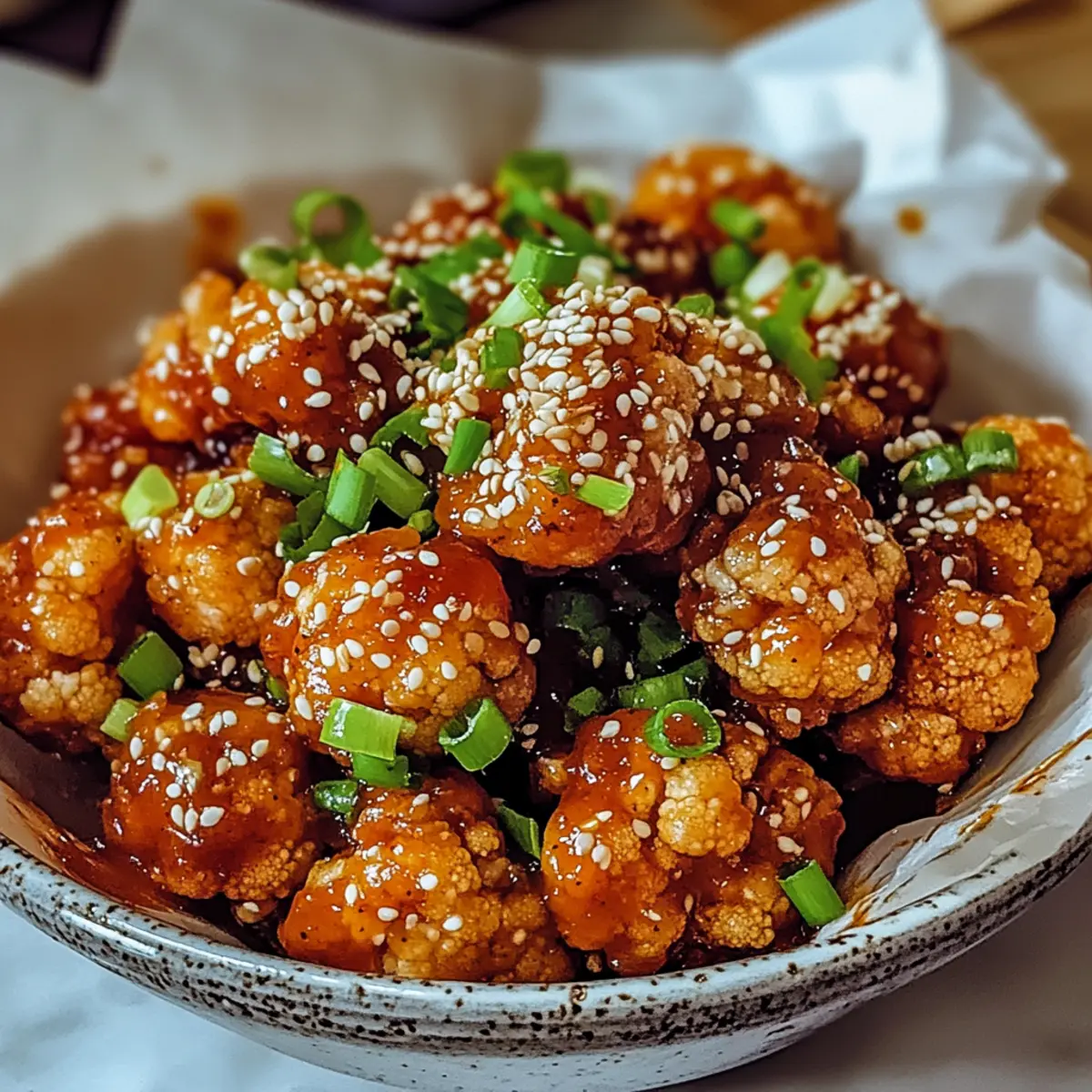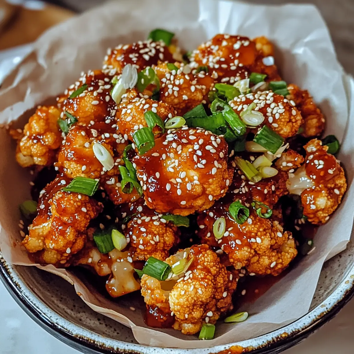 Facebook Twitter Pinterest LinkedInAs I opened the oven door, a wave of savory aroma enveloped me—there’s nothing quite like the moment when a meal transforms into something tantalizingly crisp and golden. Today, I’m excited to share my recipe for Korean Baked Cauliflower with Sweet and Spicy Gochujang Sauce, a dish that perfectly marries wholesome ingredients with explosive flavor. This plant-based delight is not only easy to whip up but also incredibly versatile, making it an ideal choice whether you want a flavorful side, a hearty appetizer, or even a standout main course. The sweet and spicy interplay of gochujang and honey paired with the satisfying crunch of baked cauliflower is a wonderful way to satisfy those cravings for something comforting without sacrificing your health goals. Curious to see how this crispy indulgence comes together? Let’s dive into the delicious details! Why is Korean Baked Cauliflower so appealing? Flavor Explosion: The combination of sweet honey and spicy gochujang creates a taste sensation that will keep you coming back for more. Crispy Delight: Baking the cauliflower results in a satisfyingly crisp texture that rivals your favorite fried snacks but is much healthier! Versatile Dish: Whether served as a side, appetizer, or main dish, this recipe adapts beautifully to your meal needs. Try pairing it with Baked Salmon Lemon for a delightful dinner! Quick & Easy: With simple ingredients and a straightforward preparation method, you’ll have a delicious dish ready in no time. Plant-Based Goodness: This vegan-friendly recipe is not just good for you, it’s packed with vitamins and nutrients from fresh cauliflower. Crowd-Pleaser: Ideal for gatherings, this dish impresses with its vibrant flavors and fun crunch, making it a hit with both family and friends! Korean Baked Cauliflower Ingredients • Discover what goes into this flavorful dish! For the Cauliflower Cauliflower – Fresh heads provide the best structure; avoid frozen to keep it crisp. For the Marinade Gochujang – This spicy paste adds depth and heat; sriracha is a good substitute if you prefer a different type of spice. Soy Sauce – A splash of umami goodness; opt for low-sodium if you’re conscious about salt intake. Honey – Balances the spice with sweetness; you can swap this with maple syrup for a vegan option. Sesame Oil – Infuses a delightful nutty aroma; use olive oil for a milder flavor if desired. Garlic (optional) – Enhance the dish’s profile; garlic powder can work in a pinch if fresh isn’t on hand. For Garnishing Sesame Seeds – Add crunch and appeal to the finished dish; feel free to omit if you don’t have them on hand. Step‑by‑Step Instructions for Korean Baked Cauliflower Step 1: Preheat the Oven Begin by preheating your oven to 400°F (200°C). This ensures a hot baking environment that will help the cauliflower achieve that desired crispy texture. While the oven heats, prepare the baking sheet by lining it with parchment paper for easy cleanup and to prevent sticking. Step 2: Prepare the Cauliflower Next, take a fresh head of cauliflower and cut it into bite-sized florets. Rinse them under cold water to remove any dirt or impurities. Once rinsed, pat them dry with a kitchen towel; this helps to avoid excess moisture and promotes crispy results when baking the Korean Baked Cauliflower. Step 3: Mix the Marinade In a large mixing bowl, combine the gochujang, soy sauce, honey, sesame oil, and optional garlic. Whisk the ingredients together until they form a smooth, well-blended marinade. This spicy and sweet mix will beautifully coat the cauliflower, infusing each piece with an explosion of flavor. Step 4: Coat the Cauliflower Add the cauliflower florets to the mixing bowl with the marinade. Toss the florets gently with your hands or a spatula until they are fully coated in the sauce. Make sure each piece is evenly covered, ensuring every bite of your Korean Baked Cauliflower bursts with flavor. Step 5: Arrange on Baking Sheet Transfer the marinated cauliflower to the prepared baking sheet, spreading it out into a single layer. This is important for achieving that perfect golden-brown crispiness as they bake. Overcrowding the pan will cause the cauliflower to steam rather than bake, resulting in less crunch. Step 6: Bake to Crispy Perfection Place the baking sheet in the oven and bake for 25–30 minutes. About halfway through, gently flip the cauliflower with a spatula to ensure even cooking. You’ll know it’s ready when the florets are crispy and golden brown, inviting you to dive in while filling your kitchen with mouthwatering aromas. Step 7: Garnish and Serve Once your Korean Baked Cauliflower is beautifully baked, remove it from the oven and sprinkle with sesame seeds for added texture and visual appeal. Serve immediately while they’re hot and crispy, either on their own or alongside steamed rice, salads, or wraps for a delightful meal experience. Make Ahead Options These Crispy Korean Baked Cauliflower are perfect for meal prep enthusiasts! You can marinate the cauliflower florets up to 24 hours in advance, allowing the flavors to deeply infuse. Simply cut and rinse the cauliflower, then mix it with the gochujang marinade and store it in an airtight container in the refrigerator. For the best crispy texture, wait to bake until you’re ready to serve—just spread the marinated cauliflower on a baking sheet and bake for 25-30 minutes at 400°F (200°C). This way, you’ll enjoy that delightful crunch just as if they were freshly made, saving you time on busy weeknights without sacrificing flavor! Korean Baked Cauliflower Variations Looking to add your own twist to this delectable dish? Customize your Korean Baked Cauliflower for even more flavor and fun! Dairy-Free: Use maple syrup instead of honey to keep it vegan and equally delicious. Nutty Boost: Toss in chopped almonds or peanuts for an added crunch before baking. The toasted flavors will en