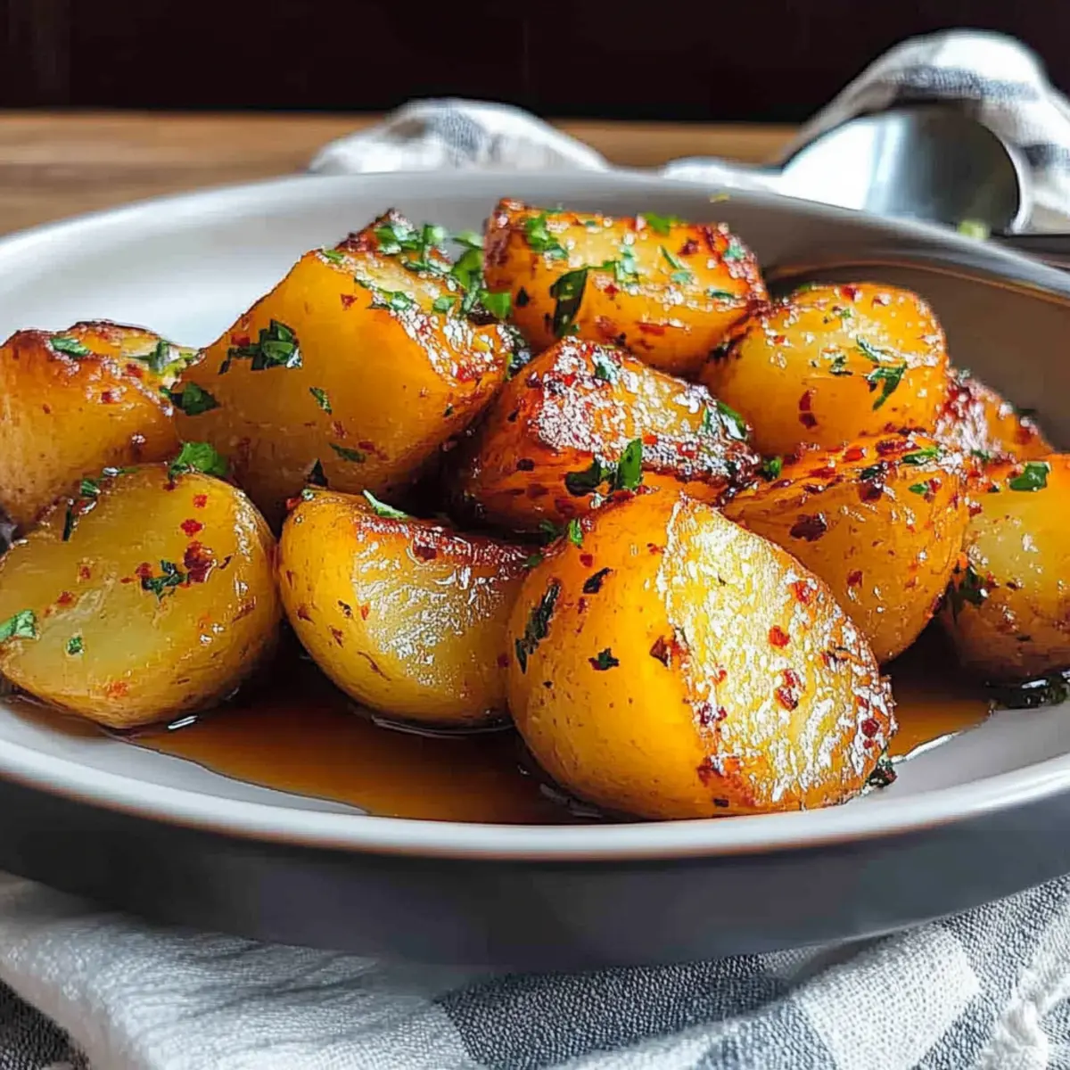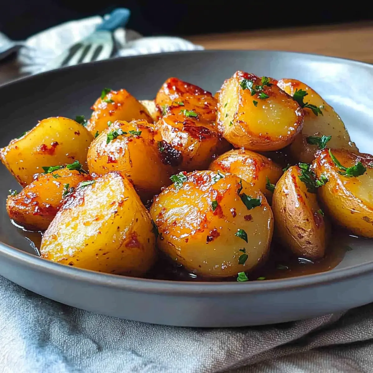Facebook Twitter Pinterest LinkedInJust when I thought I had tasted every version of potatoes, I stumbled upon a dish that completely changed the game: Korean Honey Butter Potatoes. This incredible side features a glorious contrast between crispy exteriors and soft, fluffy interiors, all drenched in a sweet and salty honey butter sauce. It’s a delightful fusion that not only satisfies your cravings but also effortlessly elevates any meal to the next level. Plus, what’s not to love about a vegetarian dish that offers such a quick prep and becomes an instant crowd-pleaser? Whether you’re looking for an exciting alternative to traditional fries or simply a flavorful addition to your dinner table, these Korean Honey Butter Potatoes are here to impress. Will your taste buds be able to resist the allure of that decadent glaze? Let’s dive into this delicious recipe together! Why Are Korean Honey Butter Potatoes Amazing? Delicious Contrast: The crispy exterior pairs perfectly with the creamy, tender interior, making every bite a delightful experience. Sweet and Savory: Coated in a honey butter sauce, this dish offers a unique flavor twist that will leave everyone craving more. Vegetarian-Friendly: Ideal for those following a vegetarian diet, these potatoes are a hearty complement to any meal without compromising on flavor. Time-Saver: Quick to prepare, you’ll have a tantalizing side ready in no time, allowing you to spend more time enjoying delightful dishes like Honey BBQ Chicken or Honey Pepper Chicken. Crowd-Pleasing: Perfect for gatherings, these honey butter potatoes are sure to be a hit at any gathering, easily reinventing your classic side dish! Korean Honey Butter Potatoes Ingredients • Delight in creating this savory dish with simple yet flavorful ingredients! For the Potatoes • Yukon Gold Potatoes – These potatoes offer a perfect balance of creaminess and structure; however, any waxy potato will work well too. For the Sauce • Unsalted Butter – Using unsalted butter allows you to have better control over the seasoning in this sweet and savory fusion. • Honey – The star ingredient, honey brings the essential sweetness that beautifully complements the savory notes of the dish; go for light or clover honey. • Salt – A key player in enhancing the overall flavor; feel free to adjust according to your taste. • Freshly Cracked Pepper – A hint of spiciness elevates the dish; always opt for freshly cracked for the best results. For Garnishing • Fresh Herbs (e.g., Parsley) – Adds a burst of freshness, cutting through the richness of the sauce; while optional, they are highly recommended for depth. Dive into crafting these Korean Honey Butter Potatoes, and let the blend of textures and flavors delight your palate! Step‑by‑Step Instructions for Korean Honey Butter Potatoes Step 1: Prepare Potatoes Start by washing and cubing Yukon Gold potatoes into bite-sized pieces. Place the cubes into a pot of salted water, bringing it to a gentle boil over medium-high heat. Cook for about 10–15 minutes until the potatoes are fork-tender but still hold their shape. Once soft, drain the potatoes thoroughly and allow them to steam dry for a few minutes. Step 2: Make Sauce In a small saucepan, combine unsalted butter and honey over medium heat. Stir the mixture gently as it warms up, allowing the butter to melt and the honey to blend seamlessly within 3–5 minutes. You’ll know it’s ready when the sauce is smooth and slightly bubbly, enveloping a sweet aroma that lingers invitingly. Remove from heat to prevent burning. Step 3: Combine Transfer the warm, drained potatoes into a large mixing bowl. Pour the luscious honey butter sauce over the potatoes, ensuring that every piece is coated evenly. Use a spatula or wooden spoon to gently toss them, allowing the honey butter to cling delicately to the potatoes. This is key to achieving the sweet and savory flavor infusion of Korean Honey Butter Potatoes. Step 4: Crisp Heat a large skillet over medium-high heat and add the coated potatoes in a single layer, leaving space between them for crisping. Cook for about 5–7 minutes, gently tossing occasionally, until the potatoes develop a golden-brown crust and a delicious lacquered sheen. This step is crucial to bring out the contrast in textures—crisp on the outside and soft on the inside. Step 5: Season Sprinkle the hot, crispy potatoes with salt, freshly cracked pepper, and chopped fresh herbs, if using. Cook briefly for another 1–2 minutes, allowing the seasonings to cling to the dish, enhancing the overall flavors. Taste and adjust the seasoning if necessary, ensuring that each bite delivers that perfect sweet and salty harmony synonymous with Korean Honey Butter Potatoes. Step 6: Serve Carefully transfer the Korean Honey Butter Potatoes to a serving dish while they’re still warm. Garnish with extra herbs for a pop of color and freshness, if desired. Serve hot alongside your favorite grilled meats or as a delightful game-day snack. Relish in the joy and comfort of this flavorsome dish that’s sure to please everyone at your table! What to Serve with Korean Honey Butter Potatoes These delightful Korean Honey Butter Potatoes bring a unique flavor and texture that pairs beautifully with a variety of dishes for a well-rounded meal. Grilled Chicken: Juicy grilled chicken complements the sweetness of the potatoes, adding a savory element to your plate. Spicy Kimchi: The spiciness and tang from kimchi provide a bold contrast, enhancing the overall flavor experience. Roasted Vegetables: A medley of roasted vegetables adds color and a healthy crunch, balancing the richness of the honey butter. Steamed Rice: Soft, fluffy rice provides a neutral base, soaking up any delicious sauce and making every bite enjoyable. Miso Soup: A warm bowl of miso soup offers umami flavors and warmth, perfect for the comfort of the potatoes. Crisp Salad: A fresh salad with a tangy vinaigrette cuts 