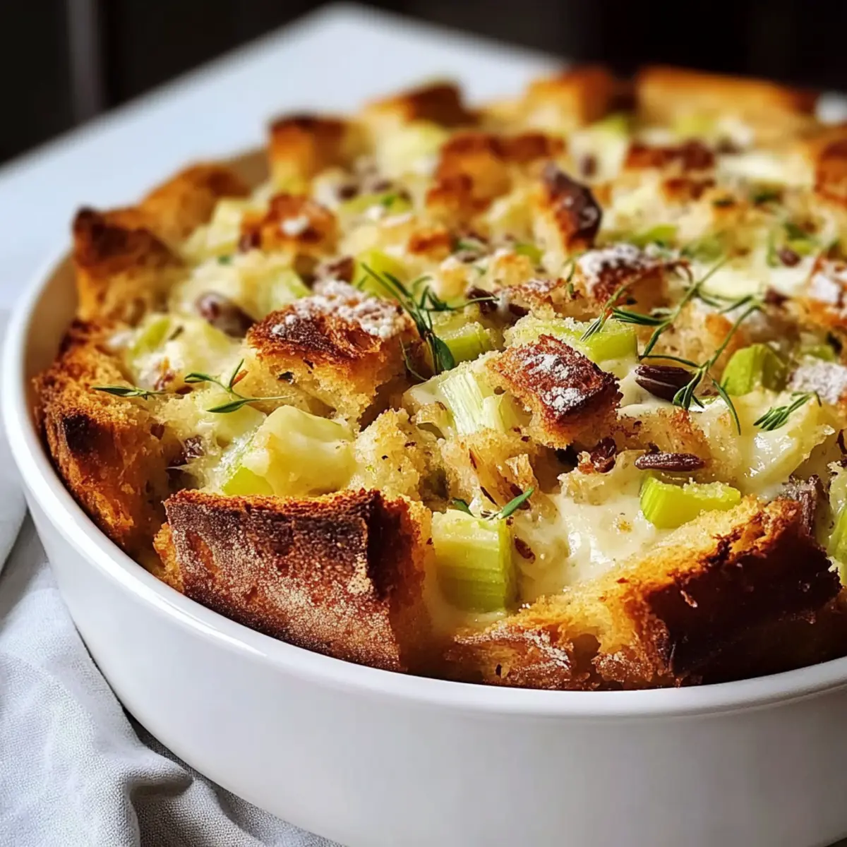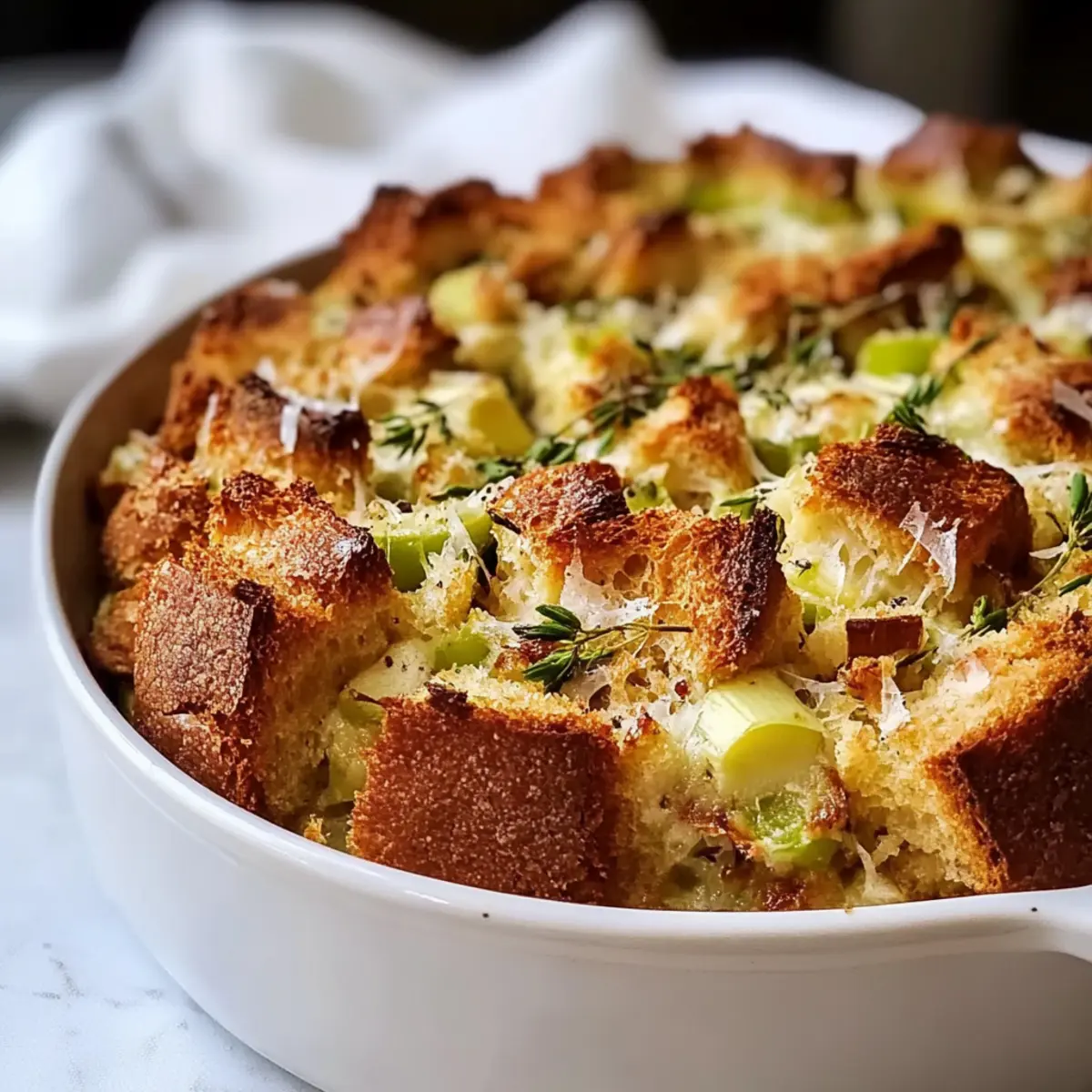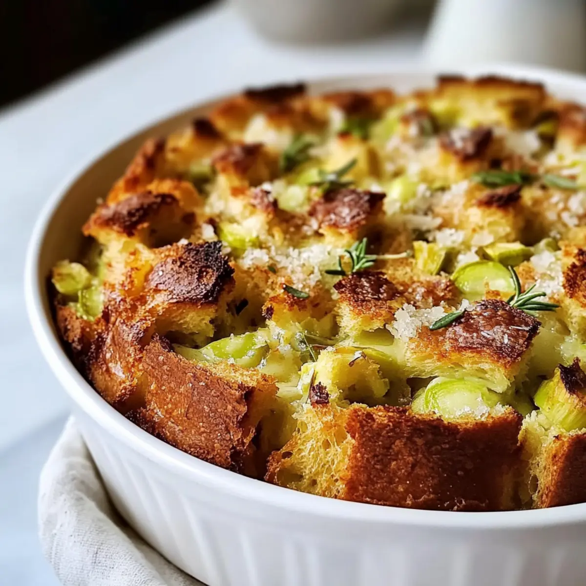 Facebook Twitter Pinterest LinkedInAs I stood in my kitchen the other day, the aroma of sautéing leeks filled the air, instantly evoking memories of cozy brunches with friends and family. Enter the Savory Leek and Gruyère Bread Pudding—a sumptuous comfort food that’s not only a feast for the senses but also a breeze to prepare ahead of time. The sweet, caramelized leeks mingle perfectly with the nutty richness of Gruyère cheese, transforming humble ingredients into a heartwarming dish ideal for gatherings or a simple dinner. This make-ahead marvel not only saves you stress on busy days but also delivers on flavor, making it a surefire crowd-pleaser. Ready to elevate your cooking game with this deliciously satisfying recipe? Why is This Bread Pudding Special? Comforting, Indulgent Flavor: The rich combination of buttery leeks and nutty Gruyère cheese creates a dish that warms the heart. Make-Ahead Delight: Prepare this dish in advance, making your next brunch or dinner stress-free and enjoyable. Versatile Additions: Feel free to customize with herbs or extra vegetables as you experiment to make it your own. Perfect for Gatherings: This bread pudding is always a hit, impressing guests at any occasion, from brunch to cozy family dinners. Ideal Texture: Enjoy a beautifully puffed, golden crust with a creamy, custardy center that delivers delightful bites every time. Pair it with a fresh, lemon-dressed salad for a complete meal, or consider our Cheesy Garlic Bread to complement your gathering! Leek and Gruyère Bread Pudding Ingredients For the Pudding Base Leeks – Tender flavor base; trim and soak to clean, using only the white and light green parts for optimal taste. Gruyère Cheese – Adds nutty and creamy depth; substitute with Emmental, Comté, or sharp cheddar if desired. Bread – Provides structure and texture; use day-old French bread or a crusty baguette for best results, avoiding soft sandwich bread. Eggs – Binds the pudding together for the perfect custardy consistency; fresh eggs are always preferred. Milk – Adds moisture to the custard; mixing milk and half-and-half balances richness. Half-and-Half – Contributes creaminess; avoid using exclusively to maintain a lighter texture. Dijon Mustard – Introduces a subtle kick to your custard, enhancing its flavor profile. For the Seasoning Chives – Offers mild onion flavor; fresh chives elevate the taste. Thyme – A wonderful herb that adds aromatic notes; fresh thyme is recommended for intensity. Nutmeg – A pinch enhances the overall warmth and depth of the dish. Optional Add-Ins Cooked Bacon or Mushrooms – Incorporate for added flavor; both make excellent complements to leeks and cheese. Additional Herbs or Cheeses – Experiment based on personal preference for a unique twist. This delicious Leek and Gruyère Bread Pudding transforms basic ingredients into a comforting showstopper, perfect for your next meal! Step‑by‑Step Instructions for Leek and Gruyère Bread Pudding Step 1: Prepare Leeks Begin by cleaning and slicing the leeks; trim and soak them to remove any grit, using only the white and light green parts for best flavor. In a large skillet, melt butter with a splash of oil over medium heat. Add the leeks along with a pinch of salt and pepper, sautéing until they become tender and creamy, which will take about 20-30 minutes. Step 2: Toast Bread While the leeks are cooking, cut the bread into 1-inch cubes and arrange them evenly on a baking sheet. Preheat your oven to 350°F (175°C) and toast the bread for about 20 minutes, turning halfway through, until it is golden brown and dry to the touch. This step is essential for ensuring your Leek and Gruyère Bread Pudding doesn’t turn soggy. Step 3: Make Custard In a medium mixing bowl, whisk together fresh eggs, milk, half-and-half, and a spoonful of Dijon mustard until the mixture is smooth and well-combined. Season with salt, white pepper, chopped chives, thyme, and a dash of nutmeg. This rich custard will tie all the elements of your bread pudding together beautifully, so ensure everything is thoroughly blended. Step 4: Assemble Pudding Grease a 9×13 inch baking dish to prevent sticking and create a delightful crust. Start layering the bottom with half of the Gruyère cheese, followed by the sautéed leeks mixed with the toasted bread cubes. Pour the custard mixture evenly over the top, pressing down gently to ensure the bread absorbs the liquid. Finish by adding the remaining Gruyère cheese on top for a wonderfully cheesy finish. Step 5: Bake Place the assembled Leek and Gruyère Bread Pudding in the preheated 350°F oven and bake for about 1.5 hours. Keep an eye on it; after about an hour, check if it’s browning too fast—if so, cover with foil to prevent burning. The pudding is ready when it’s puffed, lightly browned, and the center is set but still slightly jiggly. Step 6: Let It Rest Once removed from the oven, allow the bread pudding to rest for at least 10 minutes before slicing and serving. This resting time helps enhance the flavors and makes it easier to cut neat squares. The warm, comforting aroma will fill your kitchen, inviting everyone to the table for your delicious Leek and Gruyère Bread Pudding! Make Ahead Options These Savory Leek and Gruyère Bread Pudding are perfect for meal prep enthusiasts! You can assemble the entire dish up to 24 hours in advance and refrigerate it, allowing the flavors to meld beautifully. Simply prepare the leeks and custard, layer the ingredients in your greased baking dish, and cover tightly with plastic wrap. When you’re ready to bake, remove the wrap, and allow the pudding to come to room temperature for about 30 minutes before popping it into a preheated 350°F oven. This way, you ensure it retains that lovely texture—creamy inside and beautifully golden on top. Enjoy a comforting, homemade meal that saves you time on busy weeknights! Leek and Gruyère Bread Pudding Variations Inviting 
