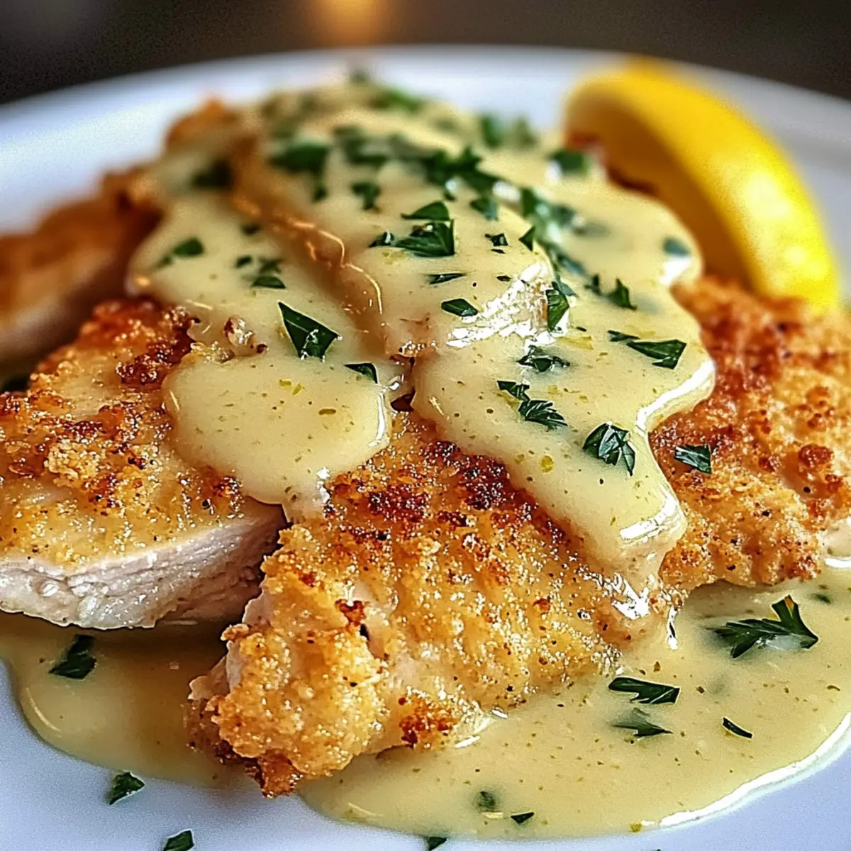 7. Serve the chicken drizzled with the creamy lemon sauce and garnish with parsley.