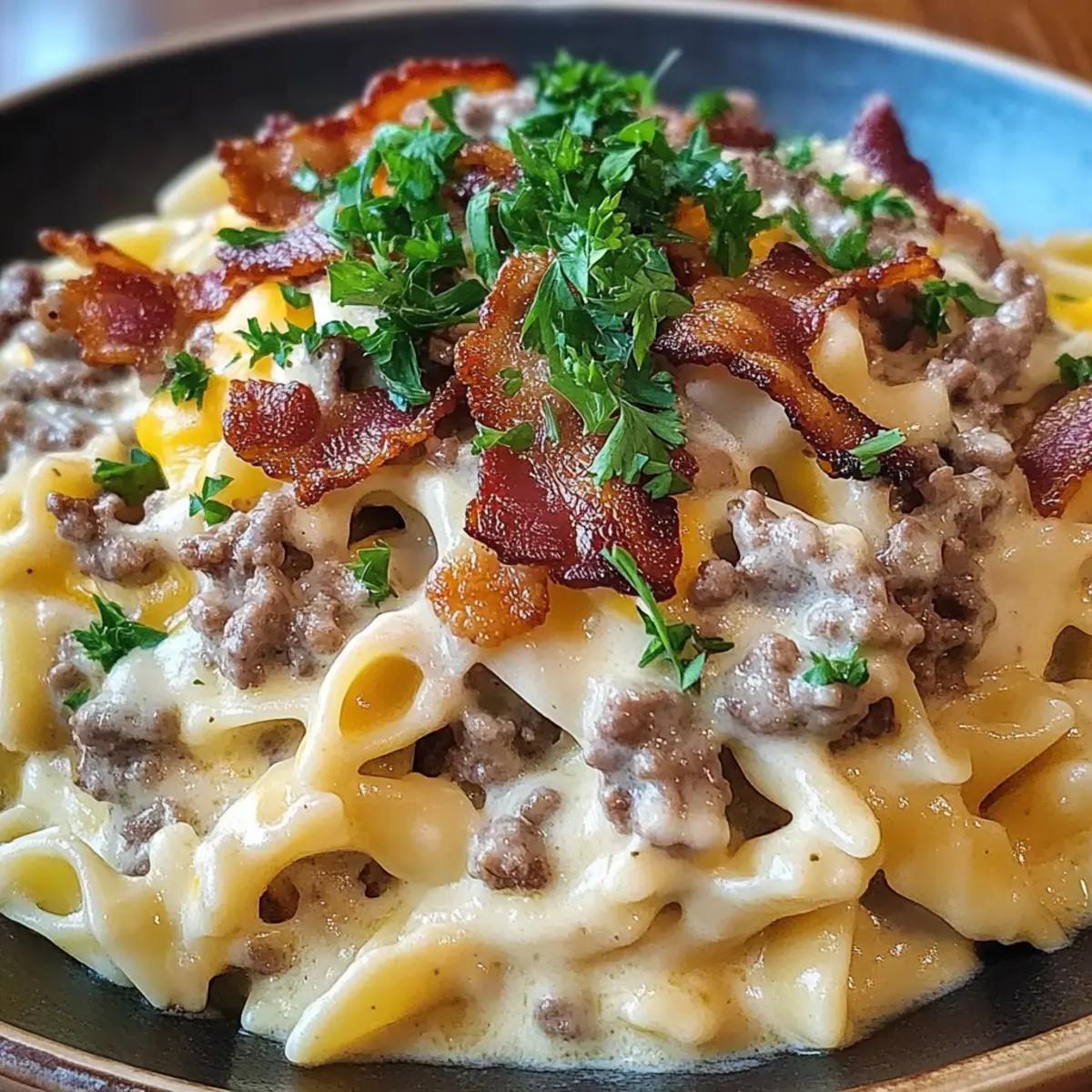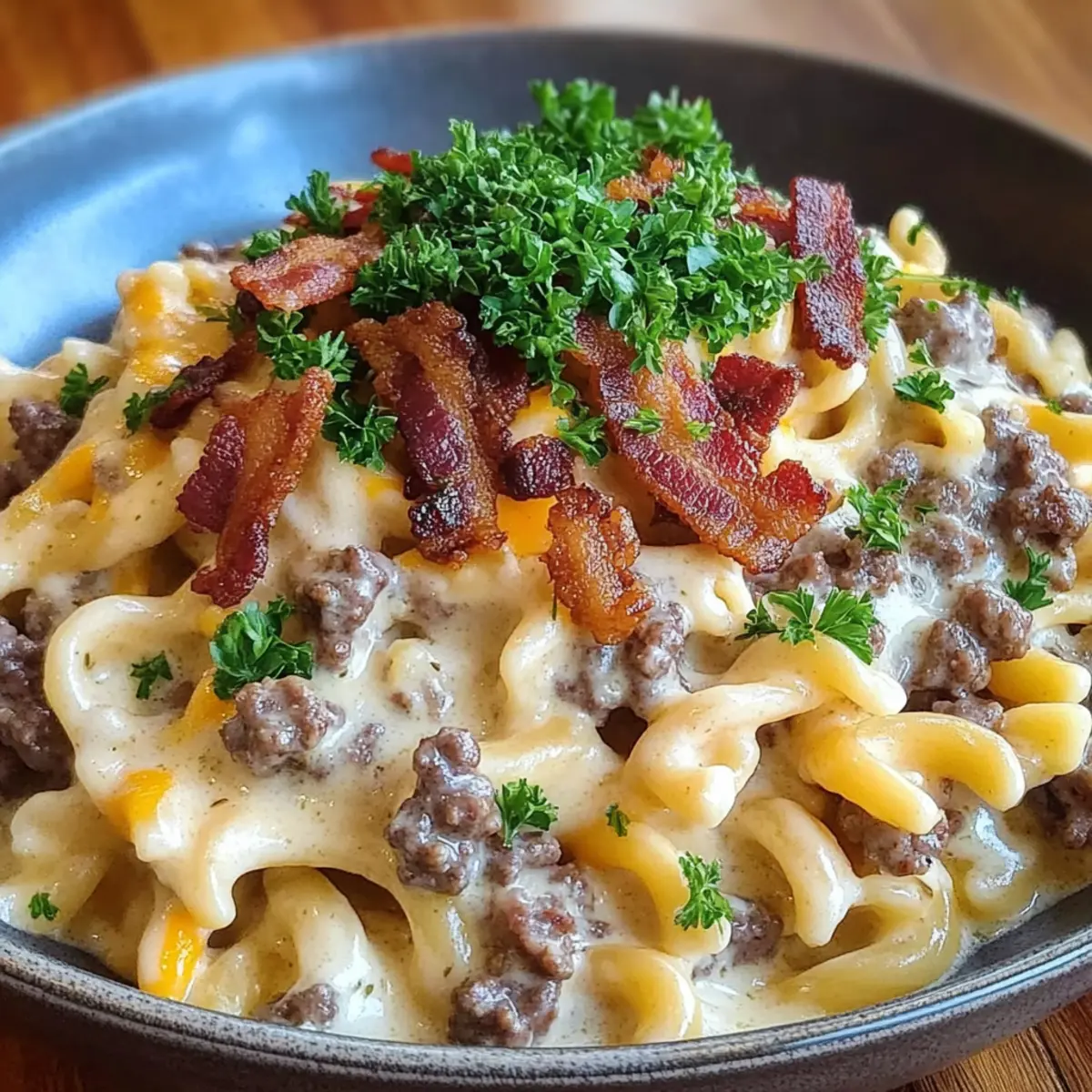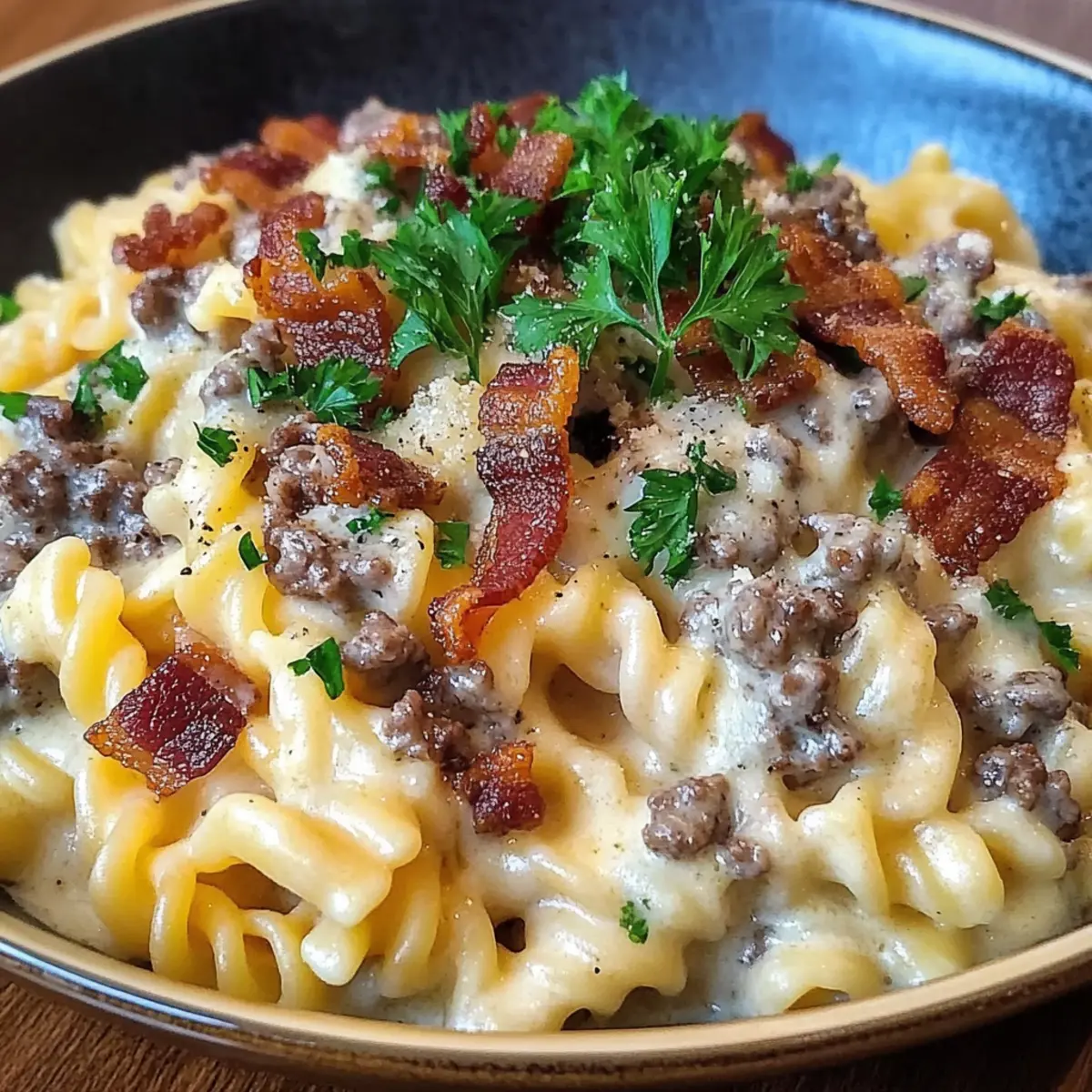 Facebook Twitter Pinterest LinkedInI was wandering through the grocery aisles, contemplating what to make for dinner, when the idea hit me: a dish that combines the irresistible charm of a cheeseburger with the comfort of creamy pasta. Enter my Loaded Bacon Cheeseburger Alfredo Pasta—a weeknight delight that’s perfect for anyone yearning for a heartwarming meal that is both quick to prepare and outright satisfying. This recipe melds al dente pasta with a rich Alfredo sauce, featuring crispy bacon, seasoned beef, and savory sautéed onions for an utterly delicious twist. It’s not just comfort food; it’s a symphony of flavors that will impress anyone at your dinner table. Ready to indulge in a dish that transforms weeknights into special occasions? Let’s dive into this creamy goodness together! Why Is This Pasta Recipe a Must-Try? Comforting, this Loaded Bacon Cheeseburger Alfredo Pasta is the ultimate answer for a cozy dinner. Quick to prepare, it allows you to whip up a delicious meal in under 30 minutes. Decadent flavors merge seamlessly with crispy bacon and savory beef, making every bite a delight. Versatile options mean you can easily customize it with different cheeses or add veggies for an extra health boost. Whether you’re winding down after a long day or entertaining friends, this dish is sure to impress everyone, just like my other crowd-pleasers such as Chicken Alfredo Pasta and Pizza Pasta Bake. Loaded Bacon Cheeseburger Alfredo Pasta Ingredients • Dive into the most delicious version of this dish with the following ingredients! For the Pasta • Pasta – Use a sturdy pasta type like rotini or bow ties for better sauce adhesion. For the Meat & Bacon • Bacon – This adds a crispy texture and irresistible smoky flavor; turkey bacon is a healthier swap. • Ground Beef – The star protein that enriches the dish; choose lean ground beef (90% lean) for a lighter option. For the Sauce • Onion – Adds sweetness and depth; shallots are a decent substitute if needed. • Garlic – Fresh garlic enhances aroma and flavor; avoid powdered garlic for best results. • Heavy Cream – Creates a lush, creamy coating for the pasta; half-and-half can lighten it up. • Beef Broth – Adds savory depth; feel free to use vegetable broth for a vegetarian twist. • Worcestershire Sauce – Introduces rich umami flavors; try tamari for a gluten-free alternative. For the Cheesy Goodness • Cheddar Cheese – Offers a sharp, tangy creaminess; smoked gouda can be an enticing alternative. • Parmesan Cheese – Enhances the overall flavor with saltiness; consider Grana Padano as a substitute. For Seasoning & Garnish • Salt and Pepper – Essential for seasoning and balancing flavors; adjust according to your taste. • Fresh Parsley – Provides a pop of color and freshness as a garnish; basil or chives make great alternatives. • Jalapeños (Optional) – For a kick of heat; you can skip them or substitute with red pepper flakes. With these ingredients, you’ll create an unforgettable Loaded Bacon Cheeseburger Alfredo Pasta that transforms your weeknight dinners into something spectacular! Step‑by‑Step Instructions for Loaded Bacon Cheeseburger Alfredo Pasta Step 1: Boil the Pasta In a large pot, bring salted water to a rolling boil over high heat. Add your favorite pasta, such as rotini or bow ties, and cook for 10-12 minutes until al dente. Once done, drain the pasta in a colander and set it aside, keeping it warm while you prepare the creamy Alfredo sauce. Step 2: Cook the Bacon In a large skillet, place chopped bacon over medium heat. Cook until crispy, about 6-8 minutes, stirring occasionally to ensure even crispness. Once browned, transfer the bacon to a plate lined with paper towels to drain excess grease, leaving the flavorful drippings in the skillet for added richness in your Loaded Bacon Cheeseburger Alfredo Pasta. Step 3: Sauté the Beef Increase the heat slightly and add lean ground beef to the same skillet with the bacon drippings. Season with salt and pepper as it cooks, breaking it apart with a spatula for even browning. Cook for about 5-7 minutes until the beef is nicely browned and no longer pink. Transfer the cooked beef to a plate with the bacon and set aside. Step 4: Sauté the Aromatics In the same skillet, add diced onion and minced garlic. Sauté for about 3-4 minutes until the onion becomes translucent and fragrant, stirring frequently to prevent burning. This step will build flavor in your Loaded Bacon Cheeseburger Alfredo Pasta, making it truly irresistible. Step 5: Create the Sauce Lower the heat and pour in heavy cream, beef broth, and Worcestershire sauce into the skillet. Stir the mixture gently, then allow it to simmer for about 5 minutes until it thickens slightly. Keep an eye on it to prevent boiling, ensuring a smooth and creamy consistency for your Alfredo sauce. Step 6: Add the Cheeses Gradually whisk in the cheddar and Parmesan cheese into the sauce, stirring continuously until melted and the sauce is smooth and creamy. Taste and adjust seasoning with additional salt and pepper as necessary. This cheesy goodness will envelop your pasta in rich flavors, making your Loaded Bacon Cheeseburger Alfredo Pasta a true delight. Step 7: Combine Everything Once the sauce is ready, toss the cooked pasta, browned beef, and crispy bacon into the skillet. Use tongs to gently mix everything together, ensuring the pasta is well-coated in the creamy sauce. Let it cook on low for a couple of minutes to warm through, allowing the flavors to meld beautifully. Step 8: Serve and Garnish After the Loaded Bacon Cheeseburger Alfredo Pasta has thickened, serve it hot on plates. Finish with a sprinkle of freshly chopped parsley for a pop of color and freshness. If desired, top with sliced jalapeños for an extra kick. Enjoy this indulgent dish that’s perfect for cozy weeknight meals! What to Serve with Loaded Bacon Cheeseburger Alfredo Pasta Looking to crea