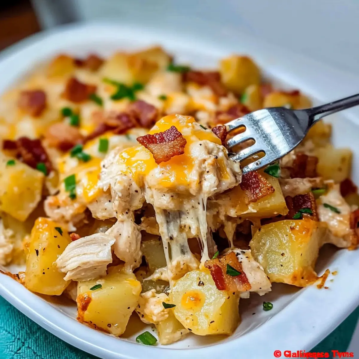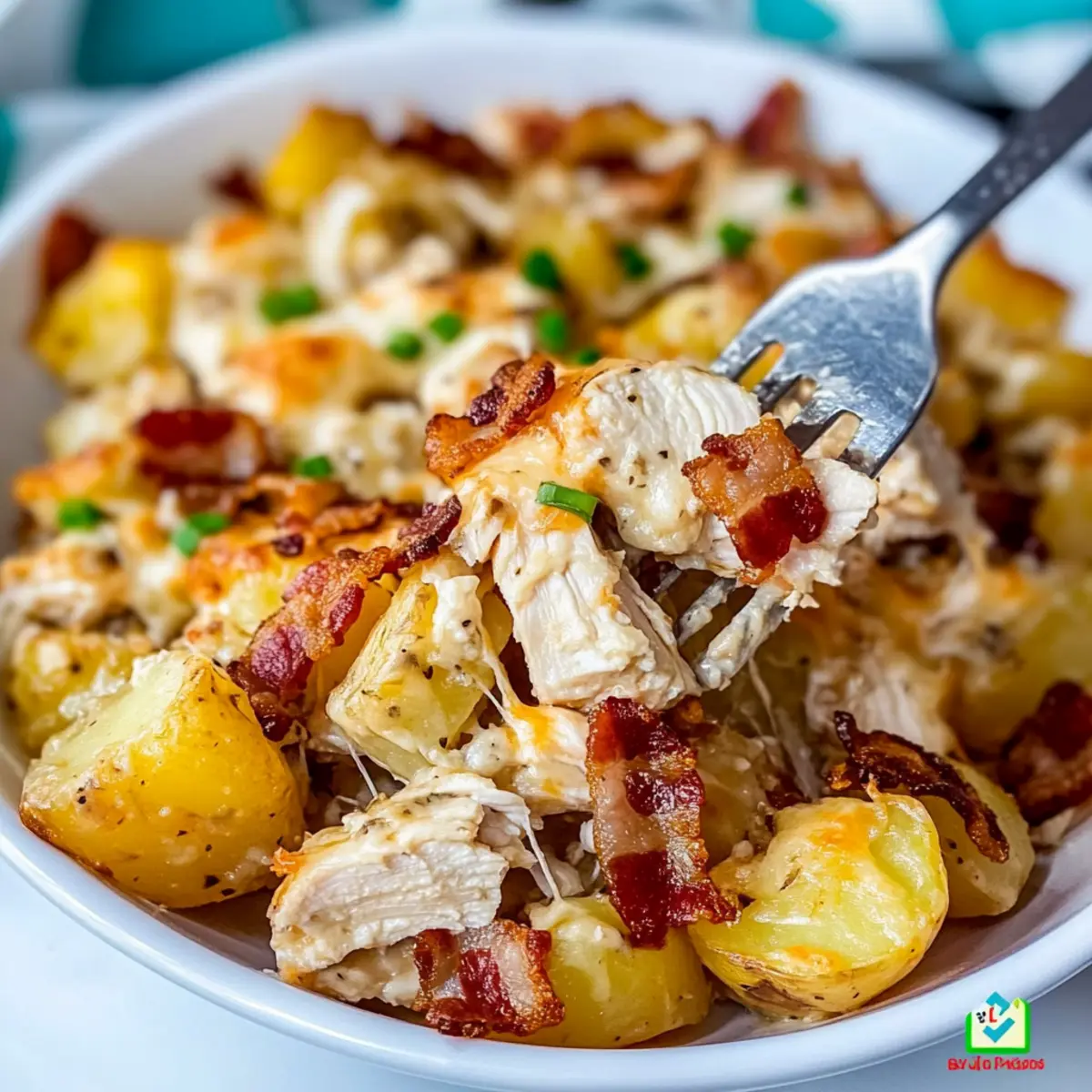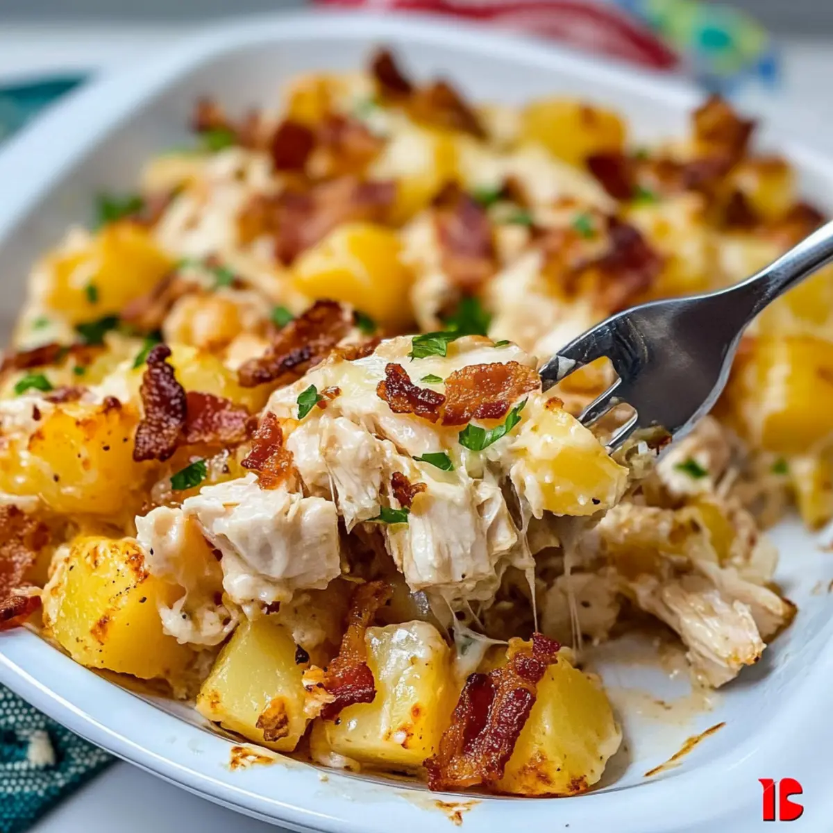 Facebook Twitter Pinterest LinkedInThe aroma wafting through my kitchen reminded me of my childhood—a cozy family dinner where chicken and potatoes reigned supreme. This Loaded Potato Ranch Chicken Casserole takes those comforting flavors and elevates them into a delightful dish that’s perfect for busy weeknights. With just a few simple ingredients, you can whip up a satisfying meal that caters to even the pickiest eaters at your table. Plus, this casserole is incredibly customizable; you can switch up the type of chicken or ranch dressing to suit your family’s tastes. Best of all, it’s an effortless crowd-pleaser that comes together in no time, making it a go-to for any occasion. So, are you ready to dig into a hearty dish that feels like a warm hug? Let’s get cooking! Why is this casserole a must-try? Simplicity at its core: This Loaded Potato Ranch Chicken Casserole comes together effortlessly, making it perfect for busy weeknights. Customization is key: You can easily swap chicken types or ranch dressings based on your family’s preferences, ensuring everyone is satisfied. Crowd-pleaser guaranteed: With its delicious fusion of flavors and textures, this dish is sure to impress even the fussiest eaters at your table. Comforting and familiar: The blend of creamy cheese, savory bacon, and tender chicken offers a nostalgic touch that feels just like home. Quick prep time means more family time: Spend less time in the kitchen and more time enjoying your meal together! Check out our other family favorites, like Hobo Casserole Potatoes or Sweet Potato Casserole, for more easy ideas. Loaded Potato Ranch Chicken Casserole Ingredients For the Casserole Base • Yukon Gold Potatoes – The best choice for creamy texture, perfect for this casserole. • Boneless, Skinless Chicken – Opt for breasts for lean protein or thighs for richer flavor. • Ranch Dressing – Choose your favorite brand for that tangy kick essential to this loaded potato ranch chicken casserole. For the Seasoning • Dried Parsley – Adds a mild herbal note; fresh parsley can enhance the flavor if you have it. • Dried Oregano – Imparts aromatic depth, complementing the creamy elements beautifully. • Paprika – Sweet or smoked variety brings warmth and vibrant color to the dish. For the Toppings • Bacon – Cooked and crumbled, it adds a crunchy, smoky richness that enhances every bite. • Mexican Cheese Blend – Melts beautifully, creating that gooey texture that’s simply irresistible. • Green Onions – Freshly chopped; they add a lovely crunch and pop of color on top. Step‑by‑Step Instructions for LOADED POTATO RANCH CHICKEN CASSEROLE Step 1: Preheat the Oven Begin by preheating your oven to 450°F (232°C). This high temperature ensures that the casserole cooks evenly, allowing the flavors to meld beautifully. While the oven heats, gather your ingredients for an organized cooking experience. Step 2: Prepare the Potatoes Dice the unpeeled Yukon gold potatoes into bite-sized pieces and place them into a large mixing bowl. Toss the diced potatoes with ⅓ cup of ranch dressing, dried parsley, oregano, paprika, salt, and pepper until well coated. Transfer the mixture to a 9 x 13-inch casserole dish and bake uncovered for 30 minutes, stirring every 10 minutes for even cooking. Step 3: Mix the Chicken While the potatoes are baking, prepare the chicken by dicing the boneless, skinless chicken breasts or thighs into small cubes. In a separate bowl, combine the chicken with the remaining ⅓ cup of ranch dressing. Mix well to ensure every piece is evenly coated with seasoning, adding salt and pepper to taste for extra flavor. Step 4: Layer the Chicken After the potatoes have parbaked and are tender, remove the dish from the oven. Evenly layer the seasoned chicken over the potatoes, spreading it out to cover the surface. Cover the casserole dish with aluminum foil and reduce the oven temperature to 400°F (204°C). Bake for an additional 20 minutes or until the chicken is fully cooked, visually checking for an internal temperature of 165°F (74°C). Step 5: Add Toppings Carefully remove the foil from the casserole and sprinkle crumbled bacon and a generous amount of Mexican cheese blend over the top, making sure to cover evenly. Return the casserole to the oven and bake for an additional 10 minutes, or until the cheese is melted, bubbly, and slightly golden, creating a deliciously inviting layer. Step 6: Garnish and Serve Once the cheese has reached that perfect melted consistency, remove the dish from the oven. For a fresh finish, top the Loaded Potato Ranch Chicken Casserole with chopped green onions before serving. This adds color and a hint of crunch, making every bite a delightful experience! What to Serve with Loaded Potato Ranch Chicken Casserole Imagine a cozy dinner spread that complements the savory goodness of your casserole while enhancing the homey atmosphere of your meal. Steamed Broccoli: The bright green florets add a fresh crunch and balance the richness of the casserole. Caesar Salad: Crisp romaine and creamy dressing provide a refreshing contrast to the hearty casserole, making each bite delightful. Garlic Bread: A crusty loaf slathered in garlic butter offers a delicious vehicle to scoop up the creamy casserole leftovers. Corn on the Cob: Sweet and juicy, corn brings a burst of flavor that pairs wonderfully with the savory potato and chicken casserole. Roasted Vegetables: Seasonal veggies, lightly seasoned and roasted, offer texture and vibrant color that beautifully complement the dish. White Wine Spritzer: A chilled glass of spritzer refreshes the palate, enhancing the rich flavors of the loaded potato ranch chicken casserole. Chocolate Desserts: Follow up with gooey brownies or a rich chocolate mousse to satisfy your sweet tooth and finish the meal on a high note. Expert Tips for Loaded Potato Ranch Chicken Casserole Even Layering: Spread the chicken evenly over the potatoes 