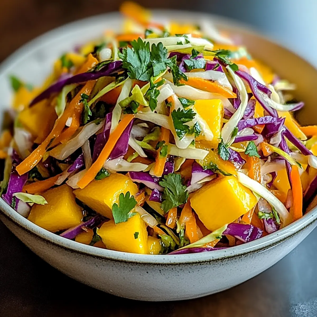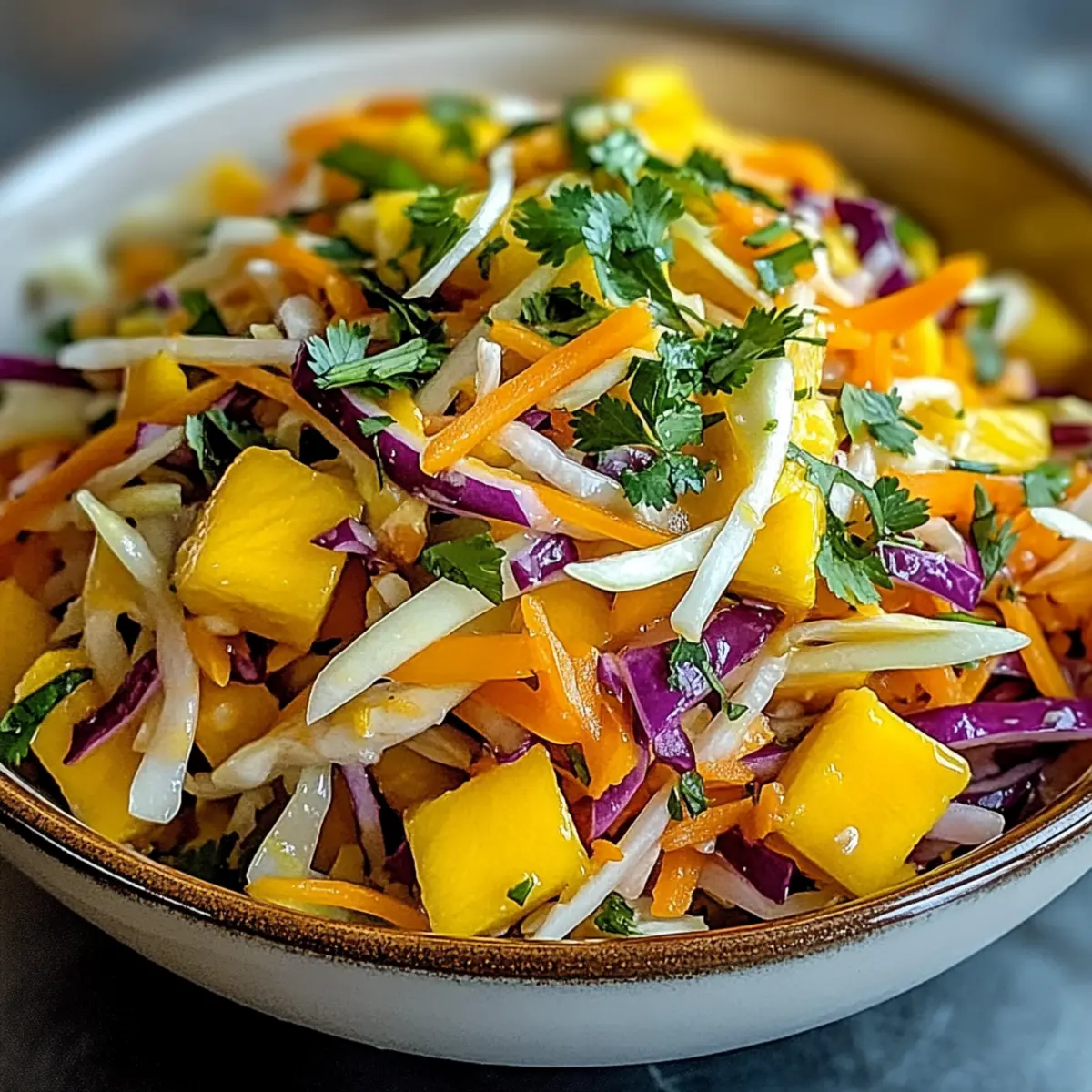 Facebook Twitter Pinterest LinkedInThe first bite of this Mango Slaw hits like a tropical breeze on a hot summer’s day. With bright colors and a tantalizing crunch, this slaw effortlessly transforms any meal into a vibrant feast. As I toss together juicy mango, crisp cabbage, and zesty lime dressing, I’m reminded of its versatility as the perfect side dish for barbecues, picnics, or light dinners—the options are endless! What I love most is how quick it is to whip up in just 15 minutes, so you can spend less time in the kitchen and more time enjoying delicious food with friends and family. Not to mention, it’s a delightful plant-based option if you swap out honey for maple syrup. Are you ready to bring a splash of color and freshness into your next meal? Why is Mango Slaw a Must-Try? Refreshing and vibrant, this Mango Slaw is the perfect way to brighten up any meal with its rich flavors and colorful presentation. Versatile in nature, it can easily adapt to suit your tastes by swapping ingredients like honey for maple syrup for a plant-based option. Quick to prepare, you can whip this up in just 15 minutes—ideal for those busy days! Healthy and nutritious, loaded with vitamins and fiber, it’s a guilt-free side that pairs wonderfully with grilled meats or can simply stand alone. Don’t forget to check out my easy, no-bake Vegan Mango Cheesecake if you’re craving a sweet finish! Mango Slaw Ingredients For the Slaw • Mango – Use ripe, juicy mangoes for the best sweetness and flavor. • Cabbage – Both green and red varieties bring a delightful crunch; feel free to mix them! • Carrot – Shredding just before use ensures optimal freshness and adds vibrant color. • Red Bell Pepper – Adds crunch and sweetness; other colors can work beautifully too. • Red Onion – For zest and bite; soak in cold water to mellow the flavor if needed. • Cilantro – Fresh herbal notes brighten the dish; substitute with parsley if you prefer. For the Dressing • Lime Juice – Freshly squeezed is preferred for an irresistible tangy kick. • Maple Syrup – Swap honey for a plant-based sweetener that complements the mango perfectly. • Sesame Oil – Adds a nutty flavor; substitutes like olive or avocado oil can also be used. • Salt and Pepper – Essential for elevating overall flavor; adjust these to your preference. Dive into the vibrant world of Mango Slaw and prepare to wow your guests with this refreshing side! Step‑by‑Step Instructions for Mango Slaw Step 1: Prepare the Vegetables In a large mixing bowl, begin by dicing 2 ripe mangoes into bite-sized pieces. Next, shred about 3 cups of cabbage, and grate 1 large carrot for sweetness and crunch. Thinly slice half a red bell pepper and a small red onion, adding vibrant colors to your Mango Slaw. Toss everything gently to combine, ensuring an even distribution of the ingredients. Step 2: Chop the Fresh Herbs Finely chop a handful of fresh cilantro, about a quarter cup, to enhance the flavor profile of your Mango Slaw. If you’re not a cilantro fan, feel free to substitute it with fresh parsley. Sprinkle the herbs over the vegetable mixture, allowing their lovely fragrance to mingle with the colorful mix. Give it another gentle toss to incorporate the herbs evenly. Step 3: Prepare the Dressing In a separate small bowl, whisk together the juice of 2 limes, 2 tablespoons of maple syrup (or honey if not vegan), and 2 tablespoons of sesame oil. Add a pinch of salt and black pepper to taste. Mix thoroughly for about 30 seconds until the ingredients are well combined and the dressing has a silky consistency, perfect for drizzling over the slaw. Step 4: Combine the Slaw and Dressing Pour the lime dressing over the prepared mango and vegetable mixture. With care, toss the ingredients gently until everything is well coated in the zesty dressing. This step is essential to ensure the delicious flavors of the Mango Slaw meld beautifully together, creating a refreshing and crunchy side dish. Step 5: Allow to Develop Flavors Let your Mango Slaw sit for 5-10 minutes at room temperature. This resting time allows the flavors to meld, enhancing the overall taste of the dish. As it sits, the vibrant colors will continue to shine, inviting everyone to dig in. If desired, you can refrigerate it for a cooler serving option, but serving it fresh is always delightful. Step 6: Serve and Enjoy Transfer your vibrant Mango Slaw to a serving bowl and enjoy it as a refreshing side dish. This slaw pairs wonderfully with grilled chicken or fish tacos, bringing a tropical flair to your meal. Serve chilled or at room temperature, and delight in the burst of flavors as you enjoy this colorful, crunchy creation. How to Store and Freeze Mango Slaw Fridge: Store any leftover Mango Slaw in an airtight container and refrigerate for up to 2 days. Freshness is key, so consume it within this timeframe for the best taste and crunch. Freezer: Freezing is not recommended for Mango Slaw, as the fresh vegetables may lose their crisp texture and integrity when thawed. It’s best enjoyed fresh! Reheating: If you prefer your slaw slightly warmer, allow it to sit at room temperature for 10-15 minutes before serving. Avoid cooking it, as it will lose its vibrant flavors and enjoyable crunch. Mango Slaw Variations & Substitutions Feel free to play around with this recipe, and customize it to make it truly your own! Plant-Based Swap: Replace honey with maple syrup for a delightful dairy-free alternative that still brings sweetness. Tropical Twist: Add diced apples or pineapple for a burst of sweetness and an exciting texture variation. The tropical vibes elevate this dish to a new level! Crunch Factor: Toss in a handful of chopped nuts like cashews or almonds for added crunch and protein in your Mango Slaw. Veggie Power: Experiment with different veggies like shredded Brussels sprouts or snap peas for a delightful change in flavor and texture. Don’t be shy—load it up! He