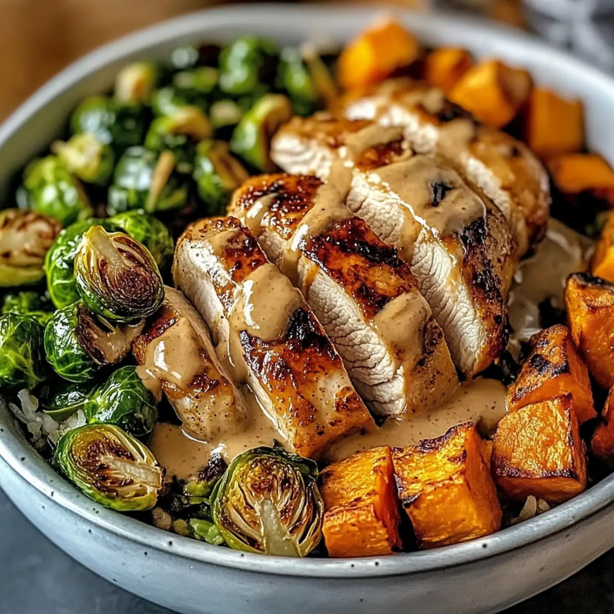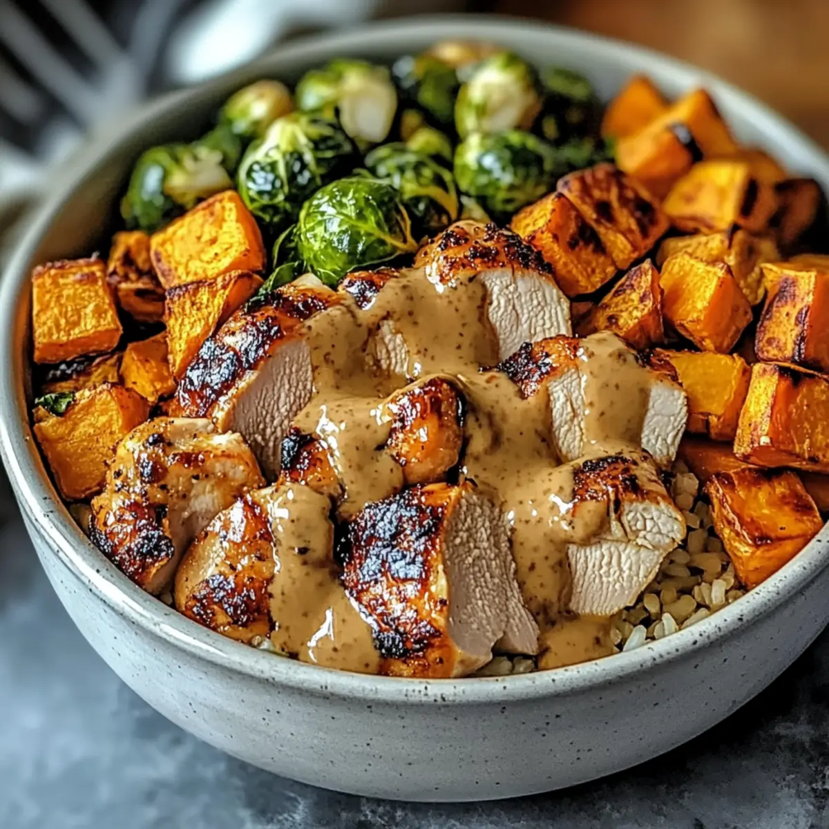 Facebook Twitter Pinterest LinkedInThe kitchen filled with a warm aroma of caramelizing sweet potatoes and the sizzling sound of chicken brings back memories of family dinners together. These Maple Dijon Chicken Sweet Potato Bowls have become a go-to recipe that effortlessly elevates our weeknight meals. With just 45 minutes of prep, you can enjoy a wholesome dish packed with 47 grams of protein, perfect for anyone eager to escape the clutches of fast food. Toss in tender chicken, roasted sweet potatoes, and crunchy Brussels sprouts, and you’ve got a crowd-pleaser that’s as customizable as your imagination. Whether you’re meal prepping for the week or looking for a delicious family dinner, these bowls provide a satisfying and nutritious solution. Curious about how to create this delightful dish? Let’s dive in! Why are Maple Dijon Chicken Bowls perfect? Flavor Explosion: The sweet and tangy glaze blends effortlessly with roasted vegetables, creating a taste sensation you won’t forget. Meal Prep Magic: Perfectly portioned bowls can be prepared in advance, making weeknight dinners a breeze. Protein-Packed: With 47 grams of protein per serving, they’re ideal for those seeking a wholesome, nourishing meal. Customizable Delight: Feel free to switch up veggies or grains according to your preference—try adding Honey BBQ Chicken for an extra twist! Family Favorite: Whether it’s a cozy night in or a gathering with friends, these bowls are sure to impress everyone at the table! Maple Dijon Chicken Sweet Potato Bowls Ingredients • Get ready to cook a flavorful and nutritious meal! For the Chicken Boneless, Skinless Chicken Breasts – Pound to an even thickness for uniform cooking and juiciness. Salt and Black Pepper – Essential seasonings that enhance the overall flavors of the dish. Olive Oil – Necessary for searing the chicken, adding richness and depth. Dijon Mustard – Provides a zesty tang that beautifully complements the sweetness of the maple syrup. For the Glaze Pure Maple Syrup (1/3 cup + 2 tbsp) – Use real maple syrup to add natural sweetness and a rich depth to the glaze. For the Veggies Medium Sweet Potatoes (2, ~1.5 lbs) – Cube uniformly for even roasting, creating a hearty base for your bowl. Brussels Sprouts (1 lb) – Halve or quarter for optimal cooking texture and nutrition. Olive Oil (3 tbsp) – Toss with veggies to help them roast perfectly, bringing out their sweetness. For the Grain Base Brown or Wild Rice (1 cup uncooked) – Cook according to package directions; it serves as a fiber-rich, filling base. Optional Flavor Enhancers Cinnamon (1/4 tsp) – Adds warmth and enhances the sweetness of the glaze. Fresh Rosemary (1 tsp) – Offers aromatic notes to elevate the flavor profile. Chopped Pecans – Adds a delightful crunch and earthy taste; sprinkle on just before serving. Dried Cranberries – Provides a lovely pop of tartness that complements the sweetness beautifully. Fresh Parsley – Use for garnishing to brighten the presentation and add a fresh touch. Feel inspired to create these Maple Dijon Chicken Sweet Potato Bowls filled with vibrant colors and hearty flavors that the whole family will love! Step‑by‑Step Instructions for Maple Dijon Chicken Sweet Potato Bowls Step 1: Preheat Oven and Cook Rice Begin by preheating your oven to 400°F (200°C). While the oven warms up, prepare your brown or wild rice according to the package directions which typically takes 30-40 minutes. This will serve as the hearty base for your Maple Dijon Chicken Sweet Potato Bowls, giving you a nutritious foundation packed with fiber. Step 2: Prepare Vegetables Wash and peel the medium sweet potatoes, then cut them into uniform cubes for even roasting. Halve or quarter the Brussels sprouts to ensure they cook perfectly. Toss the sweet potatoes and Brussels sprouts in a large bowl with olive oil, salt, pepper, and optional spices like cinnamon or fresh rosemary to enhance their flavor profile. Step 3: Roast Vegetables Spread the seasoned sweet potatoes and Brussels sprouts on a lined baking sheet, ensuring they are well spaced out to roast rather than steam. Place them in the oven and roast for 25–30 minutes, stirring halfway through, until they are tender and beautifully golden brown, filling your kitchen with inviting aromas. Step 4: Make the Glaze In a medium bowl, whisk together 1/3 cup plus 2 tablespoons of pure maple syrup and 1/4 cup plus 1 tablespoon of Dijon mustard until fully combined. This sweet and tangy glaze will enhance the chicken’s flavor beautifully. Season your boneless, skinless chicken breasts with salt and pepper to prepare them for cooking. Step 5: Sear Chicken Heat 3 tablespoons of olive oil in a large skillet over medium-high heat. Once the oil is shimmering, add the chicken breasts and sear for 5–6 minutes on each side until golden brown. During the last 2 minutes of cooking, generously brush the chicken with your maple-Dijon glaze, allowing it to caramelize slightly. Step 6: Let Chicken Rest After cooking, transfer the chicken breasts to a cutting board and let them rest for 5 minutes. This crucial step allows the juices to redistribute within the chicken, ensuring that each bite of your Maple Dijon Chicken Sweet Potato Bowls is moist and flavorful. Step 7: Assemble Bowls To serve, scoop a portion of the cooked rice into each bowl. Top with the roasted sweet potatoes and Brussels sprouts, and slice the rested chicken before arranging it on top. Drizzle any remaining glaze over the bowls and consider adding optional toppings like chopped pecans or dried cranberries for extra texture and flavor. Expert Tips for Maple Dijon Chicken Bowls Pound for Perfection: Pound chicken breasts to an even thickness to ensure uniform cooking and prevent dryness during preparation. Quality Matters: Always use pure maple syrup for the most delightful flavor; imitation syrup simply won’t give you the depth you crave in these bowls. Even Roasting:
