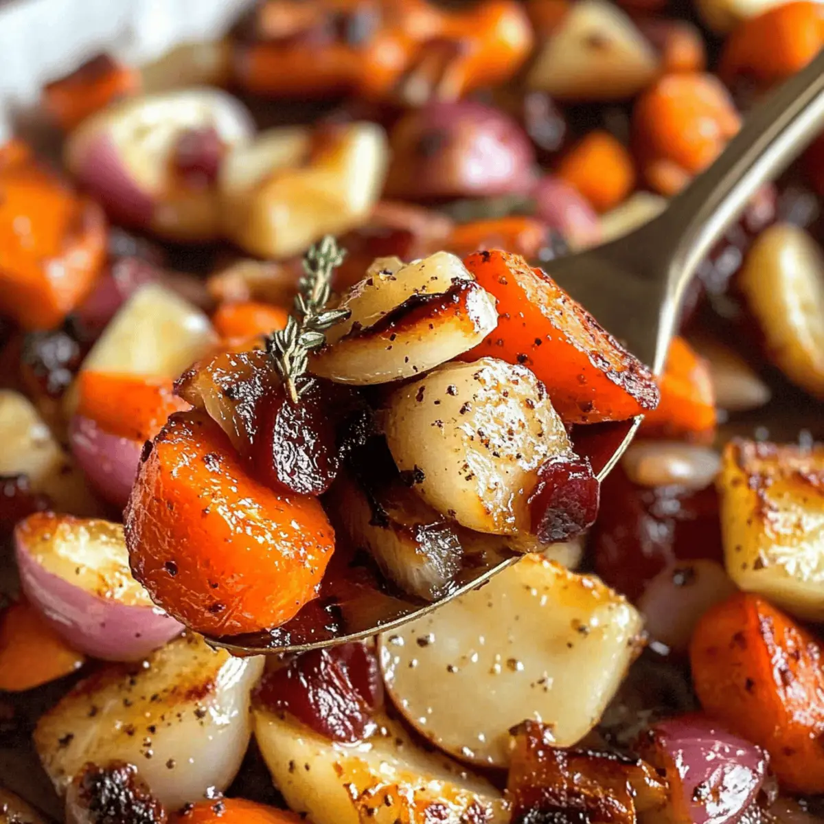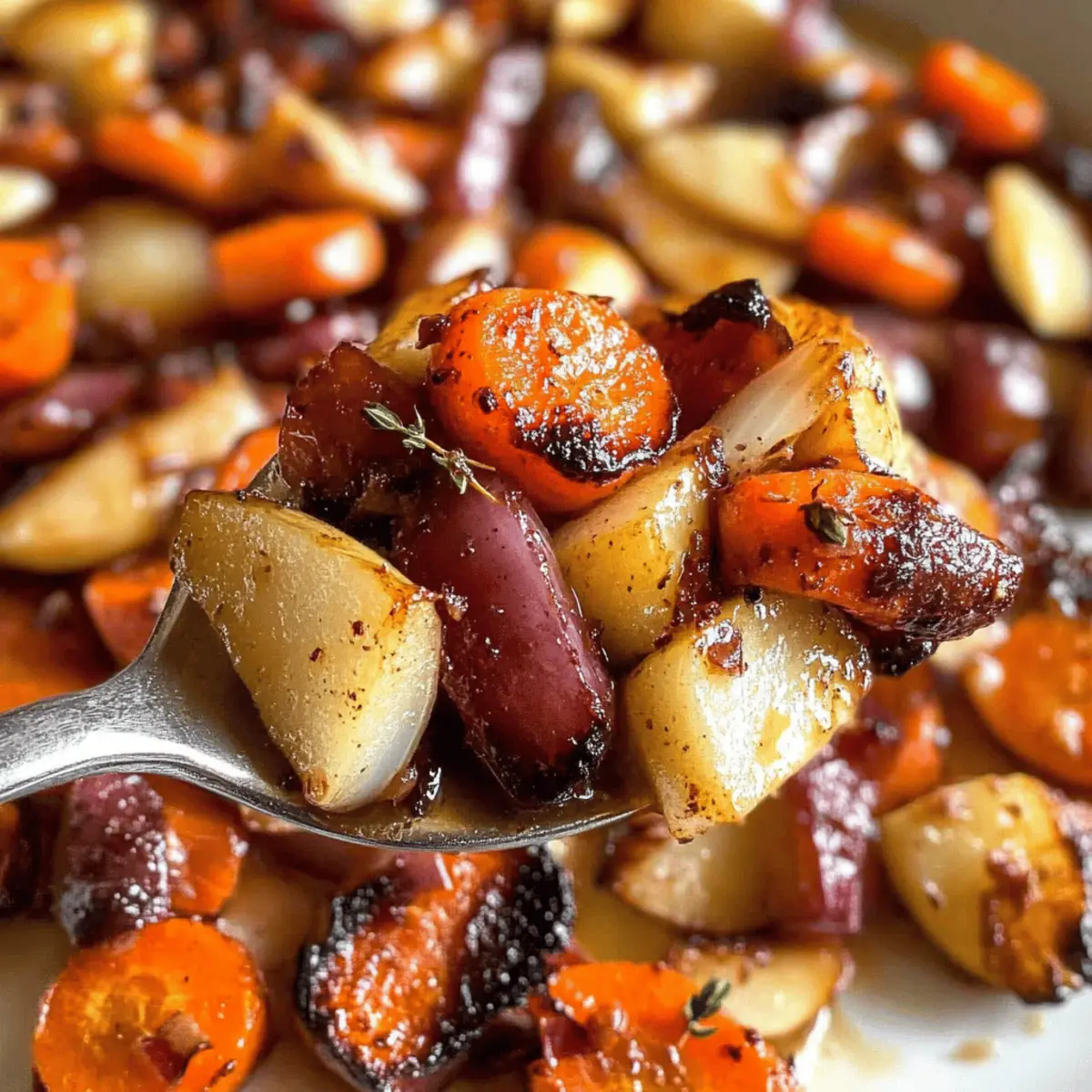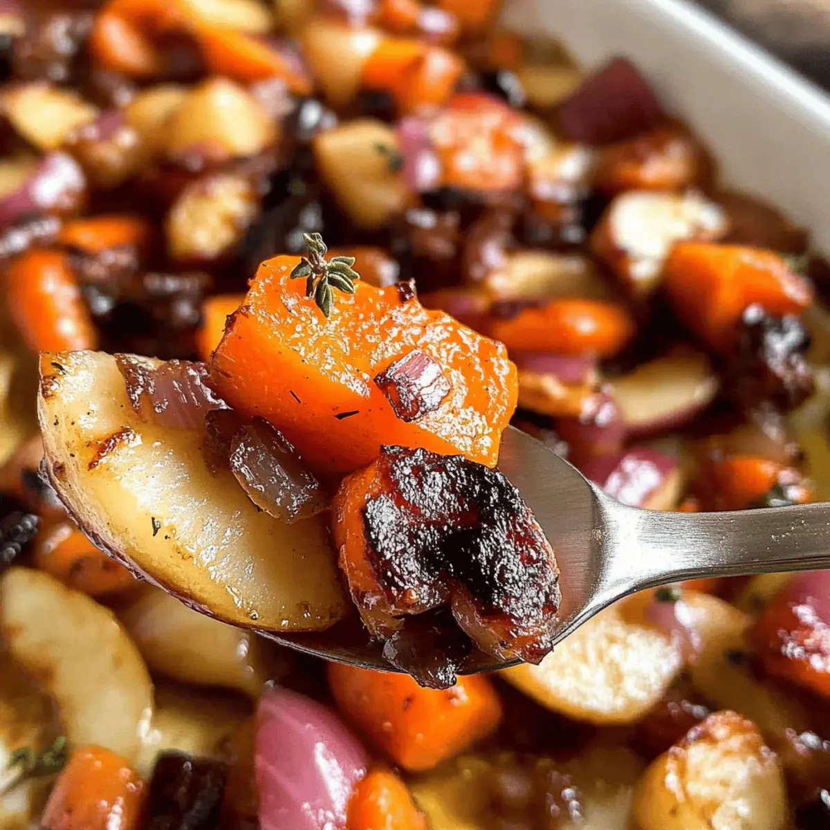 As the leaves turn golden and the air grows crisp, my kitchen transforms into a place of warmth and nostalgia. I whip up something special each autumn to celebrate the bounty of the season, and this time it’s Maple Dijon Roasted Carrots and Apples. This delightful side dish brings together the earthy sweetness of carrots, the tartness of apples, and the rich depth of a maple-dijon glaze, making it an irresistible addition to any meal. Not only is this recipe plant-based and gluten-free, but it also preps in a snap! Imagine filling your home with the inviting aroma of roasted vegetables while serving up a dish that not only looks stunning but also offers a healthy twist. Ready to elevate your fall dining experience? Let’s dive into the recipe! Why Are These Carrots and Apples Irresistible? Flavorful and Comforting: The unique combination of sweet maple syrup with tangy Dijon mustard creates a perfect harmony, making every bite a celebration of fall flavors. Nutritious and Vegan: This dish is not just delicious; it’s also packed with nutrients from wholesome ingredients, making it a healthy choice for any meal. Quick and Easy: With simple prep and just one roasting pan needed, you’ll spend less time in the kitchen and more time with loved ones, just like my Garlic Roasted Chicken that brings everyone together. Versatile: Pair these roasted beauties with anything from a festive Thanksgiving feast to a casual weeknight dinner; they complement so many dishes! Crowd-Pleasing: Ideal for gatherings, this dish is bound to impress family and friends, making you the star of any occasion! Pair it with my flavorful Buffalo Chicken Mac for a complete feast. Maple Dijon Roasted Carrots and Apples Ingredients For the Roasting Mixture • Carrots – Provide structure and natural sweetness; ensure they are sliced thickly for ideal roasting. • Apples – Add sweetness and tart contrast; use sturdy varieties like Honeycrisp or Braeburn that hold their shape when cooked. • Onion – Adds depth of flavor and sweetness when roasted. • Garlic – Enhances the dish with aromatic notes; fresh cloves or garlic powder can be used. • Thyme – Adds herbal fragrance, making it a perfect touch for these seasonal flavors. For the Glaze • Olive Oil – Offers healthy fats for cooking; substitute with aquafaba for an oil-free version. • Maple Syrup – Provides natural sweetness and helps with caramelization, making the dish truly shine. • Stone Ground Dijon Mustard – Adds tang and complexity to the glaze, enhancing the brilliance of your Maple Dijon Roasted Carrots and Apples. • Salt and Black Pepper – Basic seasoning to enhance all other flavors. Step‑by‑Step Instructions for Maple Dijon Roasted Carrots and Apples Step 1: Preheat the Oven Begin by preheating your oven to 425°F (220°C). This high temperature will ensure that your Maple Dijon Roasted Carrots and Apples caramelize beautifully, delivering that sweet and savory flavor you’ll love. While the oven heats, gather your ingredients so they’re ready for the next steps. Step 2: Prepare the Ingredients Next, core the apples and chop them into ½-inch cubes, then chop the carrots diagonally into ¼-inch thick slices to enhance their roasting surface. Dice the onion and finely chop a few cloves of garlic. This step is crucial, as uniform sizing ensures everything cooks evenly, contributing to the dish’s delightful texture. Step 3: Create the Glaze In a large mixing bowl, whisk together the olive oil, maple syrup, stone ground Dijon mustard, salt, black pepper, and fresh thyme. Stir until fully combined; the glaze should be smooth and inviting. This aromatic mixture will coat your vegetables and create that signature flavor profile of the Maple Dijon Roasted Carrots and Apples. Step 4: Toss the Vegetables Add the chopped carrots, apples, diced onions, and garlic to the bowl with the glaze. Toss everything together gently but thoroughly, ensuring all pieces are evenly coated with the flavorful mixture. The vibrant colors of the vegetables will be enhanced by the glistening glaze, making it even more tempting. Step 5: Arrange for Roasting Spread the coated mixture onto two separate sheet pans in a single layer, which allows for better browning. Make sure not to crowd the vegetables, as this will prevent them from roasting properly. Place the pans in the preheated oven and let them roast for 15 minutes without flipping, allowing a nice caramelization to develop. Step 6: Flip and Finish Roasting After 15 minutes, carefully take the pans out of the oven and flip the vegetables to brown them on the other side. Return them to the oven and continue roasting for an additional 10 to 15 minutes, or until the carrots and apples are tender and beautifully caramelized. They should be golden brown with a glossy finish from the glaze. Step 7: Serve and Enjoy Once roasted to perfection, remove the Maple Dijon Roasted Carrots and Apples from the oven and let them cool slightly before serving. The dish is ready to dazzle your dining table, bursting with vibrant flavors and aromas. They make a wonderful addition to any meal, celebrating the essence of fall! Maple Dijon Roasted Carrots and Apples Variations Feel free to put your own spin on these delicious Maple Dijon Roasted Carrots and Apples by exploring the following variations! Sweet Potato Swap: Substitute carrots with sweet potatoes for a richer sweetness that pairs beautifully with the apples. Nutty Crunch: Add chopped walnuts or pecans for delightful crunch and a nutty depth that complements the sweetness perfectly. Spicy Kick: Sprinkle in a pinch of cayenne pepper or paprika for a warm kick that contrasts with the sweet glaze. A hint of heat balances the dish beautifully! Herb Infusion: Try using rosemary instead of thyme for a fragrant twist that brings a whole new level of aroma and flavor to your roasted blend. Balsamic Variation: Swap the Dijon mustard for balsamic vinegar for a tangy 