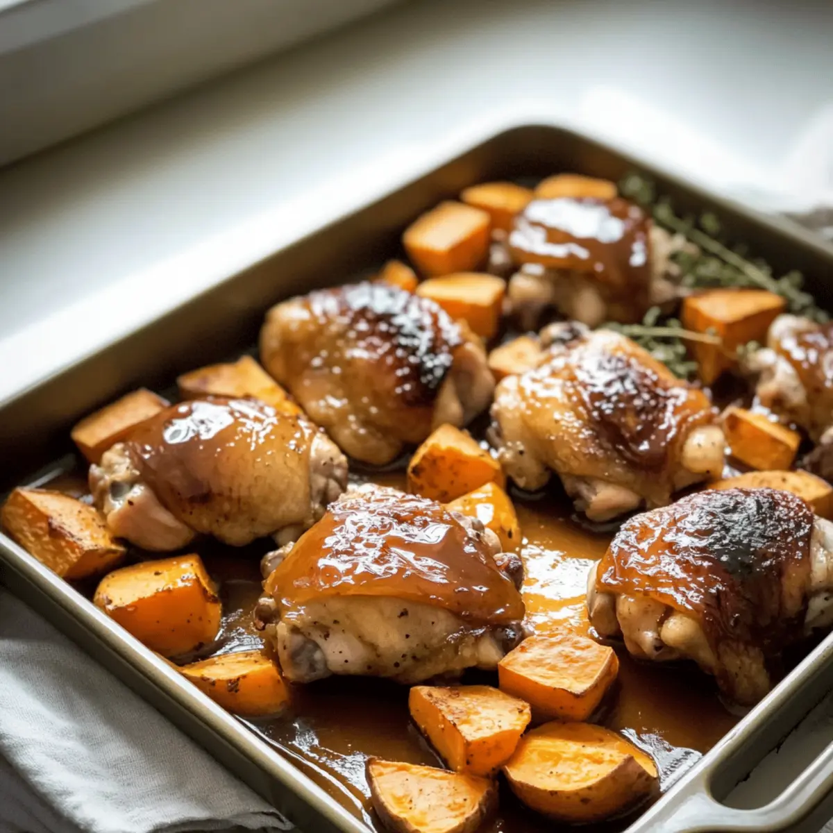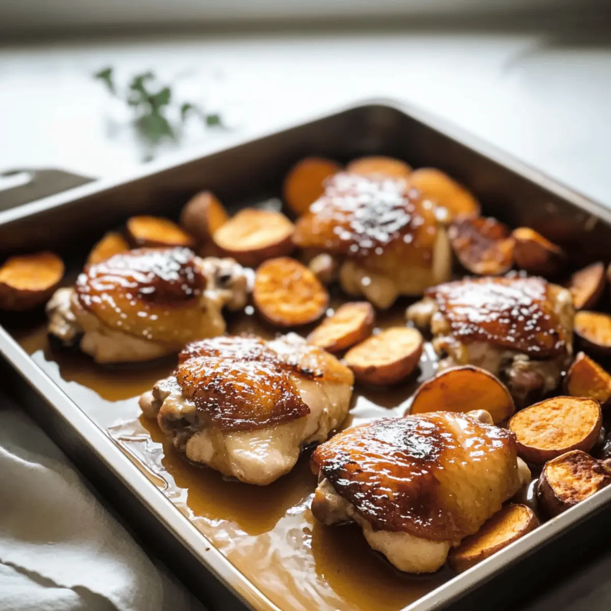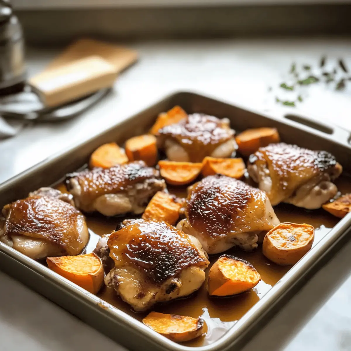 As the warm scents of maple syrup and roasted sweet potatoes waft through my kitchen, I can’t help but feel a cozy sense of nostalgia wash over me. Today, I’m excited to share my Maple-Glazed Chicken with Sweet Potatoes recipe—a delightful pick for those hectic weeknights or laid-back family dinners. This easy-to-make dish isn’t just delicious; it’s family-friendly and perfect for satisfying even the pickiest eaters. The juicy chicken, kissed with a sweet and savory glaze, pairs perfectly with tender, caramelized sweet potatoes that absorb all those mouthwatering flavors. Ready to create your new go-to comfort meal? Let’s dive into this mouthwatering adventure together! Why is this recipe a must-try? Simplicity at its finest: You’ll find that the prep is a breeze, making it ideal for busy evenings. Juicy chicken thighs: They deliver an incredibly tender and flavorful bite that’s hard to resist. Natural sweetness of sweet potatoes: Roasting enhances their natural sugars, allowing them to shine alongside the maple glaze. Perfect for family gatherings: This dish draws everyone to the table, creating a warm and inviting atmosphere. Meal prep-friendly: Enjoy leftovers seamlessly throughout the week, providing nourishing, easy reheats you’ll love. Transform your weeknights with this Maple-Glazed Chicken with Sweet Potatoes, and for even more delightful chicken options, check out my Roasted Chicken Potatoes or Parmesan Chicken Garlic! Maple-Glazed Chicken with Sweet Potatoes Ingredients For the Chicken • Chicken Thighs – Succulent and juicy, offering a rich flavor profile that pairs beautifully with the glaze. For the Sweet Potatoes • Sweet Potatoes – Adds natural sweetness and creamy texture; you can substitute cubed butternut squash for a twist. • Olive Oil – Essential for roasting, helping to achieve that perfect golden exterior. • Salt – Enhances the dish’s flavors, ensuring each bite is savory. • Pepper – Adds a hint of zest that balances the sweetness perfectly. • Smoked Paprika / Rosemary – Optional spices for additional depth; try smoked paprika for a hint of smokiness. For the Maple Glaze • Pure Maple Syrup – Creates a deliciously sticky glaze; avoid pancake syrup to ensure a pure flavor that elevates your Maple-Glazed Chicken with Sweet Potatoes. Step‑by‑Step Instructions for Maple-Glazed Chicken with Sweet Potatoes Step 1: Preheat the Oven Begin by preheating your oven to 400°F (200°C) to create the perfect cooking environment for your Maple-Glazed Chicken with Sweet Potatoes. This high temperature will ensure that the chicken cooks evenly while the sweet potatoes become perfectly roasted and tender. Step 2: Prepare the Sweet Potatoes Peel and cube the sweet potatoes into 1-inch chunks. In a large mixing bowl, toss them with a generous drizzle of olive oil, salt, pepper, and, if desired, some smoked paprika or rosemary for added flavor. This will create a delicious base that enhances the sweetness of the potatoes as they roast. Step 3: Arrange the Sweet Potatoes Spread the seasoned sweet potatoes evenly on a large sheet pan, ensuring they are in a single layer for even cooking. The space between the chunks allows for optimal caramelization, giving you those lovely golden edges that contrast beautifully against the glaze in the finished dish. Step 4: Create the Maple Glaze In a small bowl, whisk together the pure maple syrup and any remaining seasonings you’d like to add for flavor, such as salt or pepper. This sticky glaze will coat both the chicken and sweet potatoes beautifully, creating a mouthwatering contrast of savory and sweet in your Maple-Glazed Chicken with Sweet Potatoes. Step 5: Place Chicken on Sweet Potatoes Carefully place the chicken thighs on top of the arranged sweet potatoes. Brush the chicken generously with the maple glaze you just prepared, ensuring each piece is coated in that enticing sweetness. Reserve a bit of the glaze for basting later to enhance the flavors even more. Step 6: Bake and Baste Transfer the sheet pan to your preheated oven and bake for about 35–40 minutes. Halfway through cooking, flip the chicken thighs and brush them with more of the reserved glaze. You’ll know it’s done when the chicken reaches an internal temperature of 165°F (75°C) and the sweet potatoes are soft and golden. Step 7: Garnish and Serve Once cooked, remove the pan from the oven and let it rest for a few minutes. Before serving, garnish your Maple-Glazed Chicken with Sweet Potatoes with fresh herbs for a pop of color and added freshness. This step brings together all the deliciousness for a warm, inviting presentation. Expert Tips for Maple-Glazed Chicken Parchment Perfection: Line your baking sheet with parchment paper for easy cleanup after making this sticky Maple-Glazed Chicken with Sweet Potatoes. Choosing Chicken: Opt for bone-in thighs for richer flavor. If using breasts, reduce cooking time by 5–7 minutes to prevent dryness. Maple Syrup Matters: Always use pure maple syrup rather than imitation syrup to truly elevate the flavor of your glaze. Roasting Technique: Ensure sweet potatoes are in a single layer on the sheet pan for even cooking and caramelization, avoiding sogginess. Flavor Boost: For an extra flavor kick, experiment by adding chili flakes to the glaze or toss in some thinly sliced apples during baking. What to Serve with Maple-Glazed Chicken with Sweet Potatoes Elevate your dinner table with delightful sides that balance the deliciousness of your dish, creating a memorable dining experience. Crispy Green Beans: Their fresh crunch contrasts beautifully with the tender chicken and sweet potatoes, adding a vibrant touch to your meal. Garlic Bread: With its buttery, garlicky flavor, this comforting favorite complements the savory undertones of the glaze, perfect for scooping up any extra sauce. Creamy Coleslaw: This refreshing side adds a creamy, tangy layer that brightens up the sweetness of t