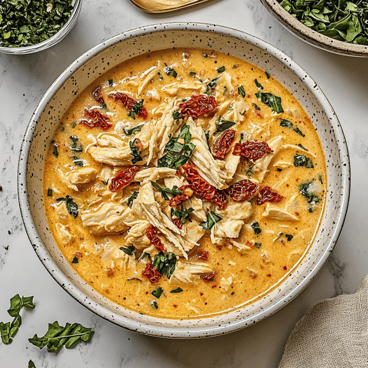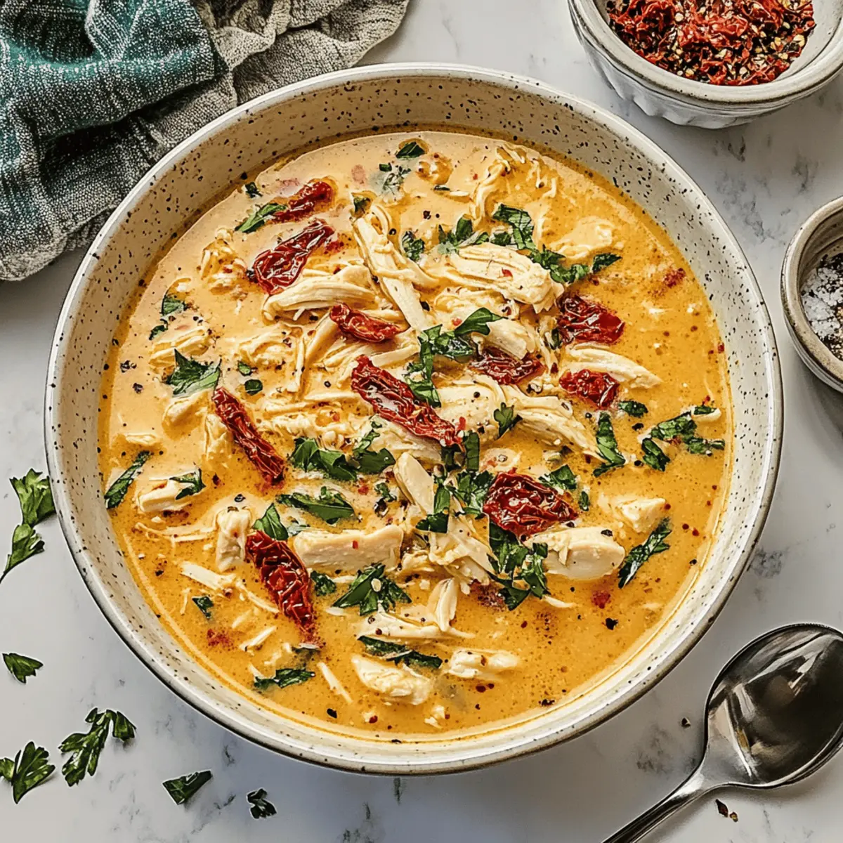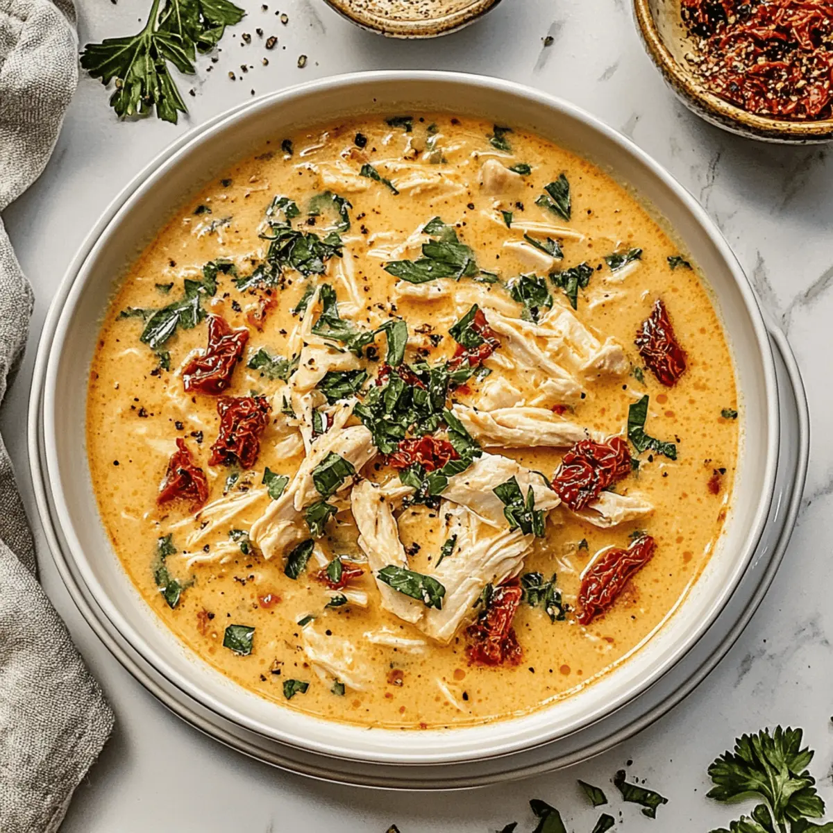 The aroma of creamy Marry Me Chicken Soup wafted through my kitchen, instantly evoking memories of cozy family gatherings. This isn’t just any ordinary soup; it’s a comforting embrace in a bowl, featuring hearty, tender shredded chicken enveloped in a velvety broth infused with Italian-inspired seasonings. The beauty of this dish lies in its versatility—it’s not only a quick fix for a chilly evening but also a crowd-pleaser for your next dinner party. Plus, it accommodates dietary needs seamlessly, with options for gluten-free and dairy-free variations, making it a perfect addition to any meal rotation. Whether you’re seeking solace in a steaming bowl or aiming to impress guests with your culinary skills, this soup ticks all the boxes. Are you ready to fall in love with the simplest yet most delicious comfort food? Let’s dive in! Why is Marry Me Chicken Soup special? Creamy Comfort: This soup wraps you in warmth with its velvety broth and tender chicken, perfect for chilly nights. Flexibility: Easily customize with gluten-free and dairy-free options to cater to everyone’s dietary needs. Quick & Easy: With just a few steps, you can whip up a comforting bowl in no time, making weeknight dinners a breeze. Impressive Flavors: Italian-inspired seasonings and sun-dried tomatoes give it a gourmet twist, impressing family and friends alike. Meal Prep Friendly: Ideal for batch cooking, it stores well for quick meals later—just like Honey BBQ Chicken or Grilled Chicken Broccoli! Crowd-Pleasing: Perfect for gatherings, it feels like a hug in a bowl that will keep everyone coming back for seconds! Marry Me Chicken Soup Ingredients This creamy delight comes together with some simple staples and a few culinary tweaks! For the Soup Base Shredded Cooked Chicken – Provides protein and heartiness; using store-bought rotisserie chicken makes it easy! Chicken Broth – The foundation of your soup; opt for low-sodium for better control over flavor. Half & Half – Adds luxurious creaminess to the broth; for a dairy-free version, swap with Original Nutpods. For Creaminess Boursin Cheese – Imparts rich flavor and a creamy texture; substitute with Kite Hill cream cheese for dairy-free. Parmesan Cheese – Enhances savory notes; can be replaced with nutritional yeast for a dairy-free alternative. Herbs & Seasonings Italian Seasoning – Infuses the soup with authentic Italian flavors that elevate the dish. Crushed Red Pepper – Offers a hint of heat; adjust based on your spice preference. Vegetable Adds Sun-Dried Tomatoes – Introduces tanginess and depth to each spoonful. For Substance Small Pasta (shells, ditalini, or orzo) – Adds heartiness to the dish; choose gluten-free pasta to fit dietary needs. Fresh Touch Fresh Parsley/Basil – Brightens the dish with a fresh garnish; a little goes a long way to enhance flavor. This Marry Me Chicken Soup is sure to become a cherished recipe in your home! Step‑by‑Step Instructions for Marry Me Chicken Soup Step 1: Prepare Chicken Begin by shredding your cooked rotisserie chicken into bite-sized pieces and set it aside. This will enhance the texture of the Marry Me Chicken Soup, ensuring that each spoonful is packed with tender chicken. Have your ingredients ready for a smooth cooking experience and gather a large pot to start the next step. Step 2: Sauté Aromatics In the large pot, pour in your chicken broth and add Italian seasoning along with crushed red pepper for a touch of warmth. Heat over medium until it reaches a gentle simmer, which should take about 5 minutes. Stir occasionally to blend the flavors and watch for bubbling edges. This aromatic base will set the foundation for your creamy soup. Step 3: Incorporate Ingredients Once the broth mixture is simmering, add the shredded chicken, your small pasta of choice, sun-dried tomatoes, and half & half or your preferred dairy-free alternative. Stir everything together, allowing the ingredients to meld beautifully. Let the mixture cook for about 5 more minutes; you’ll notice the pasta soaking up the flavors as it softens. Step 4: Cook Pasta Keep the soup simmering on medium heat until the pasta is al dente, which should take around 8-10 minutes, depending on the type you used. Stir occasionally to prevent sticking. You’ll know it’s ready when the pasta is tender but still has a bit of bite, ensuring a perfect texture within your Marry Me Chicken Soup. Step 5: Finish and Serve Once the pasta reaches the desired doneness, lower the heat and stir in the Boursin cheese until it fully melts, creating a rich, creamy consistency throughout the soup. Remove the pot from heat and garnish with fresh parsley or basil and parmesan cheese. Serve hot, allowing the fabulous aroma of your Marry Me Chicken Soup to fill your kitchen before enjoying! Marry Me Chicken Soup Variations Feel free to sprinkle your own flavor and flair into this creamy soup masterpiece! Keto-Friendly: Omit the pasta and swap it for zucchini noodles or cauliflower rice for a low-carb twist. This way, you get all the comforting flavors without the extra carbs! Vegetable Boost: Add fresh spinach or carrots for a nutritional punch. Not only do they add color, but they also enhance the texture and make your soup even more hearty and satisfying. Dairy-Free: Replace half & half and Boursin cheese with Original Nutpods and Kite Hill cream cheese. This doesn’t compromise the rich creaminess, allowing everyone to indulge. Extra Spice: Kick it up a notch by adding sliced jalapeños or a dash of cayenne pepper. This variation will make your soup sing and delight those who crave a bit of heat! Herb Infusion: Try incorporating fresh herbs like thyme or rosemary for a fragrant twist. Their subtlety complements the Italian seasonings beautifully, adding depth to each bite. Pasta-Free: For a lighter option, leave out the pasta altogether. Load up on the chicken and veggies instead, making it a protein-packed delight that’s equally comf