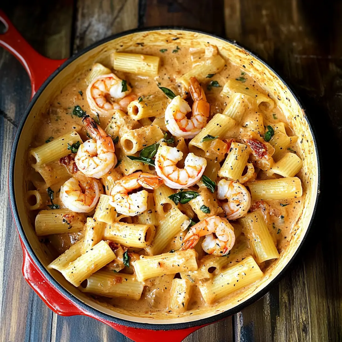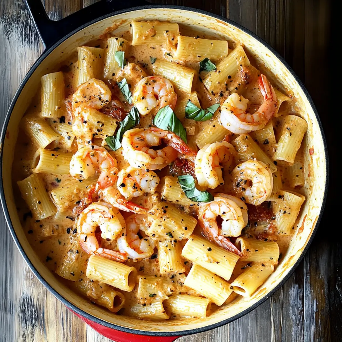 7. Add cooked rigatoni and seared shrimp back into the skillet and toss gently to coat. Serve immediately, garnished with chili flakes if desired.