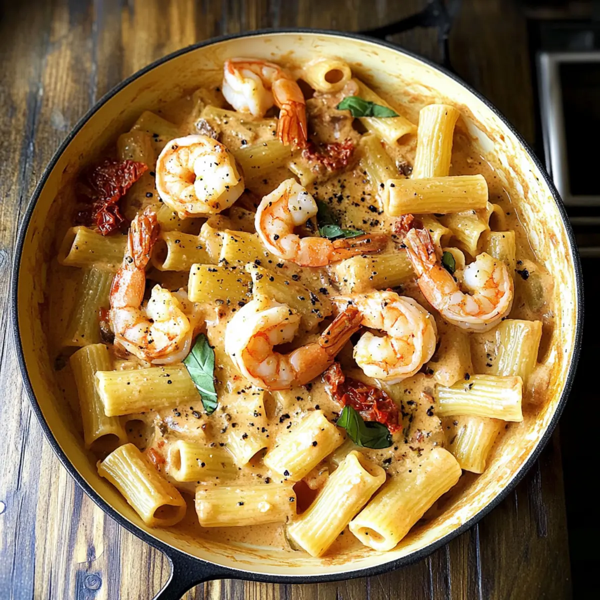 Irresistible flavor: The marriage of succulent shrimp and creamy sun-dried tomato sauce offers a strikingly delicious experience.
