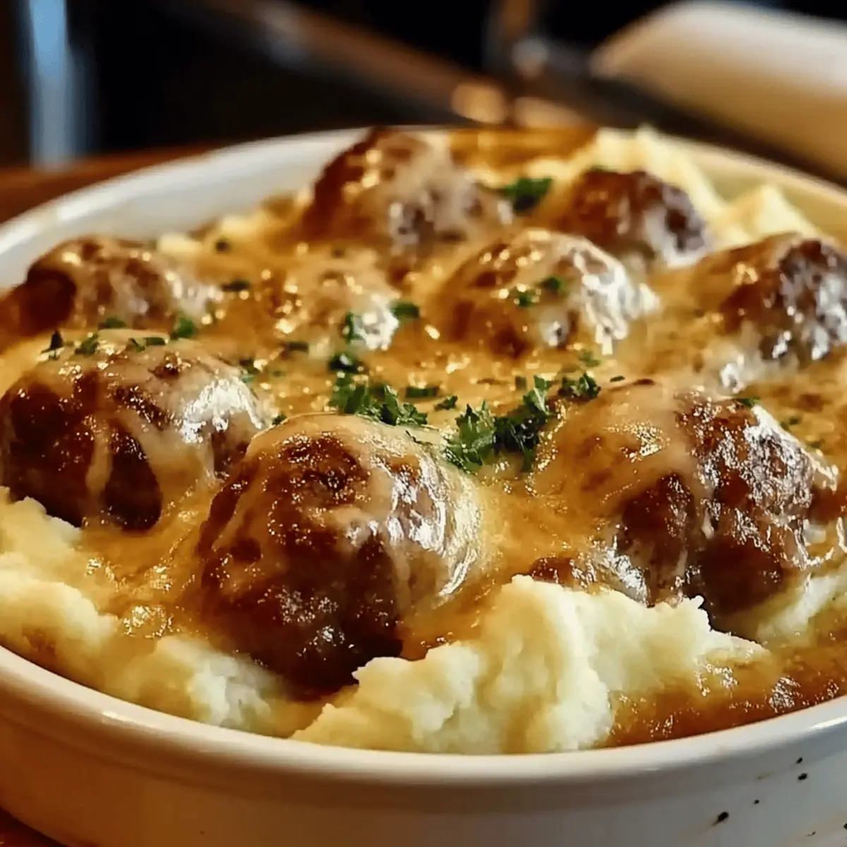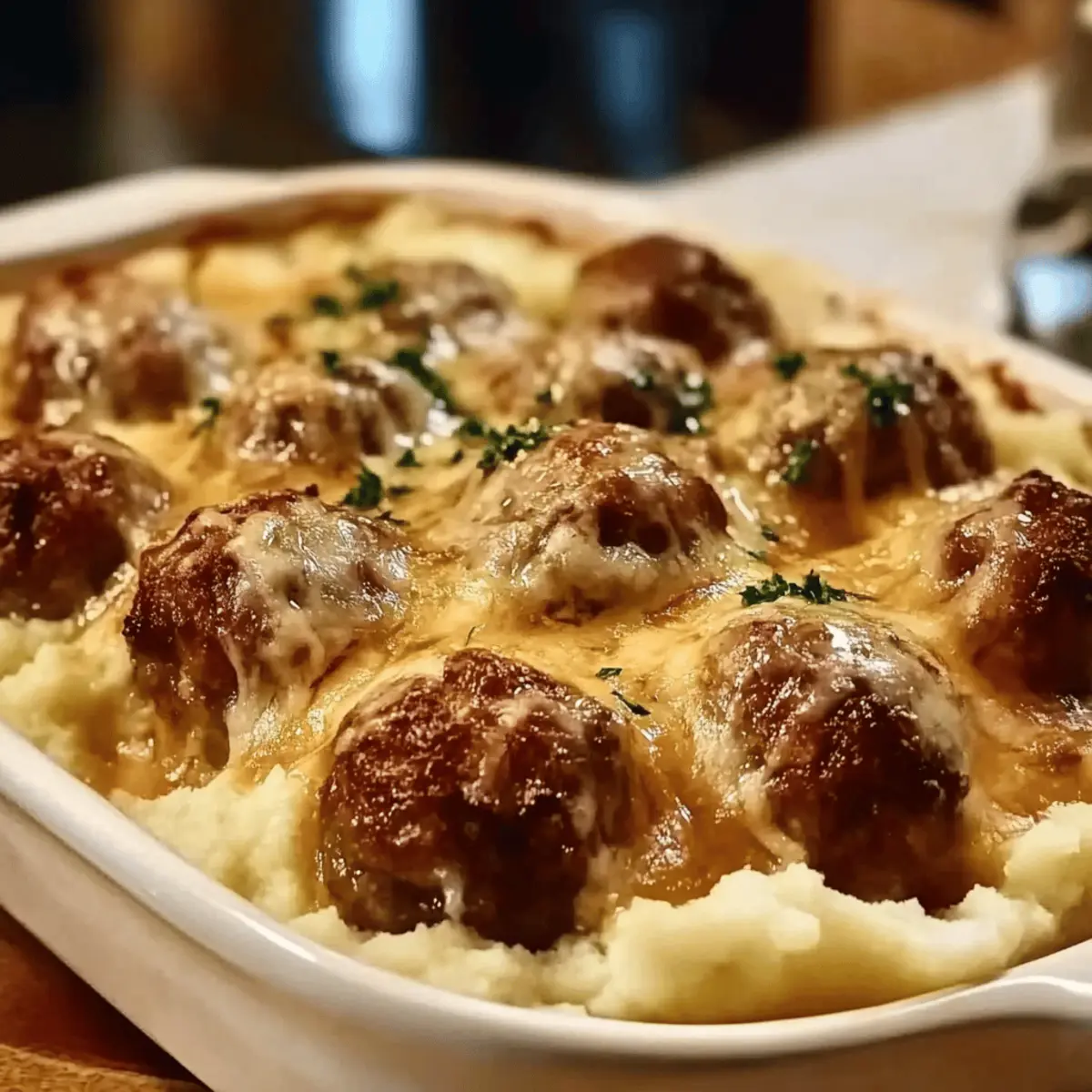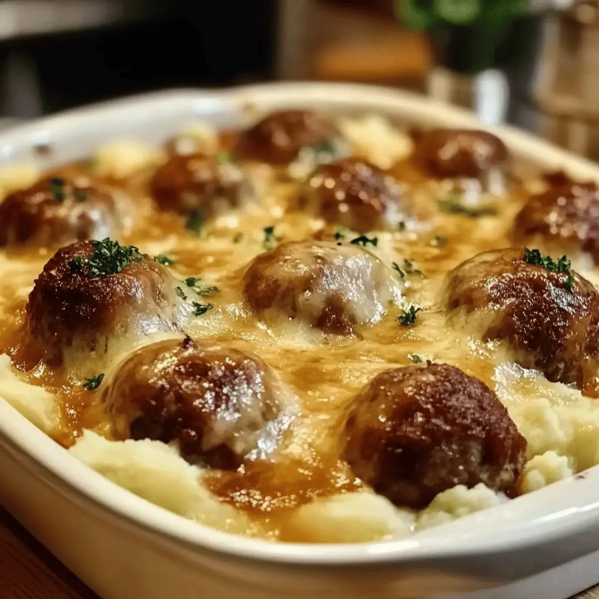 As I pulled the bubbling dish from the oven, the savory aroma enveloped my kitchen, instantly reminding me of dinners spent huddled around the table with my loved ones. This Meatball & Mashed Potato Bake combines flavorful meatballs with silky mashed potatoes, creating a heartwarming comfort food experience that’s perfect for chilly evenings. What I adore about this recipe is its effortless preparation—ideal for those busy weeknights when you crave something homemade without the fuss. Plus, its customizable nature means you can cater it to every family member’s liking, whether they prefer a twist with low-carb cauliflower mash or a cheesy delight topped with their favorite blend of cheeses. Ready to dive into this delightful dish that’s bound to become a household staple? Let’s get started! Why is this bake a family favorite? Comforting Layers: The combination of savory meatballs, creamy mashed potatoes, and rich gravy creates an embrace of flavors that’s hard to resist. Effortless Preparation: Just a few steps and minimal clean-up make this a perfect weeknight meal for busy families. Enjoy a homemade experience without the hassle! Customizable Appeal: Whether you seek a gluten-free option or a low-carb alternative with cauliflower mash, this dish adapts to your preferences, ensuring everyone leaves the table happy. Crowd-Pleasing Magic: It’s a guaranteed hit at gatherings, perfect for serving friends or family. Elevate your comfort food game with this delightful bake reminiscent of classic meals. Perfect Pairing: Consider serving this with a fresh garden salad or a slice of garlic bread for an unforgettable dining experience, similar to my Biscoff Cheesecake Bake that your guests will adore! Meatball & Mashed Potato Bake Ingredients • For the Meatballs Frozen or Homemade Meatballs – Choose lean meats or plant-based substitutes for a healthier twist in your Meatball & Mashed Potato Bake. • For the Mashed Potatoes Mashed Potatoes – Fresh potatoes or even leftovers create a creamy base; toss in garlic or cream cheese for extra flavor, and sweet potatoes work well too! • For the Gravy Brown Gravy – A rich binder for all flavors; homemade is perfect for custom tastes, while store-bought ensures convenience. Consider lighter reductions for a guilt-free option. • For the Topping Shredded Cheese – Mozzarella or cheddar adds a delightful, gooey layer; don’t hesitate to try different cheese types to see what your family loves best! • Seasoning Salt and Pepper – Essential to enhance the overall taste; season to your preference to make this dish your own. Step‑by‑Step Instructions for Meatball & Mashed Potato Bake Step 1: Preheat the Oven Start by preheating your oven to 350°F (175°C). This ensures that your Meatball & Mashed Potato Bake will cook evenly and thoroughly. While the oven heats up, grab a 9×13-inch baking dish and lightly grease it with cooking spray or butter, making it ready for the savory layers to come. Step 2: Arrange the Meatballs Evenly place the frozen or homemade meatballs in the greased baking dish. If using frozen meatballs, there’s no need to thaw them first. Once arranged, pour a cup of warm brown gravy over the meatballs, ensuring they are well-coated. This step adds a rich flavor that helps the meatballs stand out in your bake. Step 3: Spread the Mashed Potatoes Next, take your creamy mashed potatoes and spread them generously over the layer of meatballs and gravy. Use a spatula to smooth the potatoes evenly across the top, creating a delightful blanket. Make sure to cover all the meatballs completely so that they can bake together beautifully, enhancing the flavors as they heat. Step 4: Add the Cheese Topping Sprinkle a cup of shredded cheese—either mozzarella or cheddar—over the mashed potatoes. Feel free to use more or a mix of different cheeses, as this will create a wonderfully bubbly and golden crust. Make sure the cheese is evenly distributed for consistent melting, which adds to the dish’s flavor and texture. Step 5: Bake to Perfection Carefully place the baking dish in the preheated oven and bake for about 25–30 minutes. Keep an eye on it; you know it’s ready when the cheese is melted and golden brown, and the edges start to bubble. This visual cue ensures your Meatball & Mashed Potato Bake is cooked perfectly, inviting everyone to the table. Step 6: Optional Add-Ins For additional flavor and nutrition, consider adding sautéed vegetables like spinach or mushrooms before layering the mashed potatoes. This step not only enhances the dish visually but also brings extra warmth and flavor to the Meatball & Mashed Potato Bake, making it even more comforting and satisfying. Step 7: Let it Rest Once baked, remove your dish from the oven and allow it to sit for about 5–10 minutes before serving. This resting time lets the layers settle and makes for easier serving. As you prepare to scoop out portions, the aromas and sights will have everyone excited to dig into this delightful dish. How to Store and Freeze Meatball & Mashed Potato Bake Fridge: Store leftovers in an airtight container for up to 3-4 days. Make sure to let the dish cool to room temperature before sealing it in. Freezer: For longer storage, freeze the Meatball & Mashed Potato Bake in a freezer-safe container for up to three months. Wrap tightly to prevent freezer burn. Reheating: To reheat, thaw overnight in the fridge and bake at 350°F (175°C) for 20-25 minutes until heated through. You can also cover with foil to retain moisture. Avoiding Moisture: If freezing, consider leaving off the cheese topping until ready to bake, which helps maintain its texture and taste. What to Serve with Meatball & Mashed Potato Bake Elevate your comforting dish with perfect side complements that add brightness and balance to your meal. Fresh Garden Salad: Crisp greens and vibrant vegetables freshen each bite, cutting through the richness of the bake. A tangy vinaigre