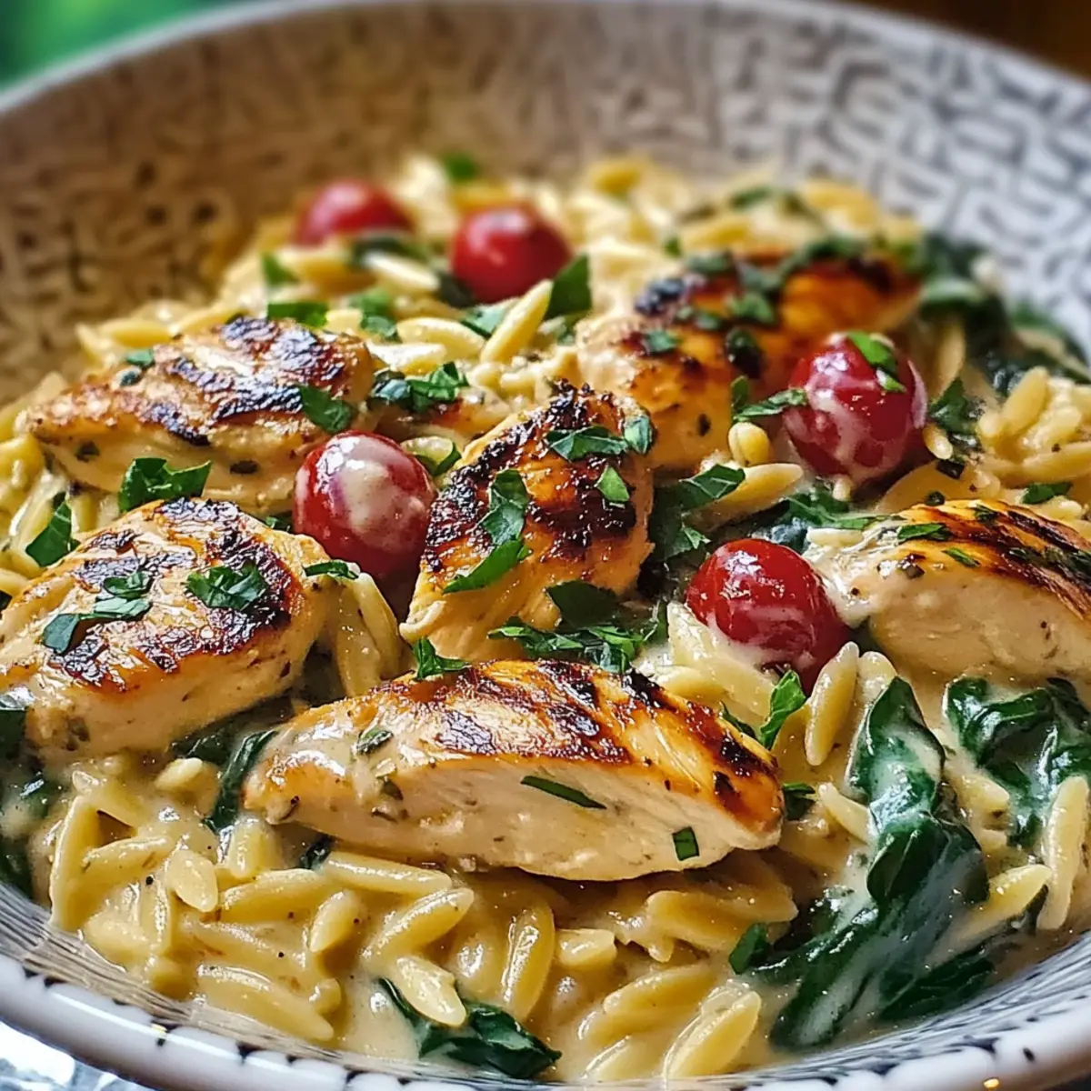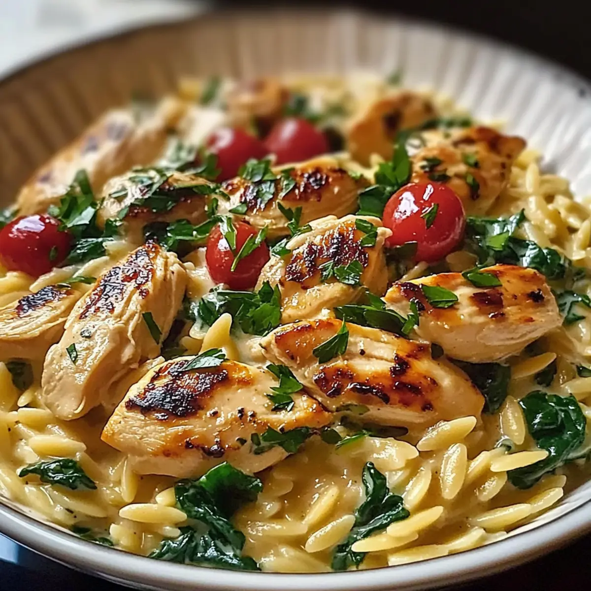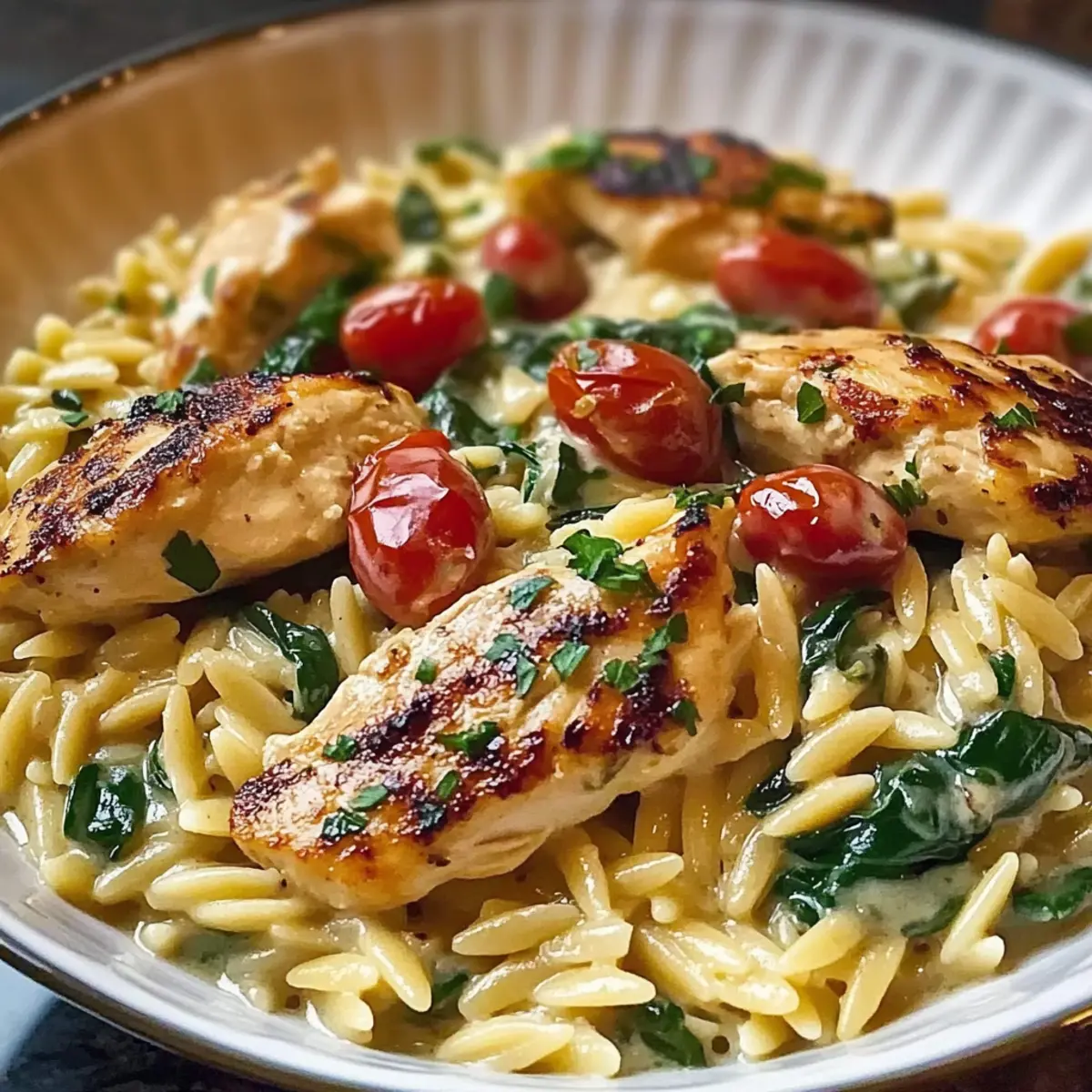 Facebook Twitter Pinterest LinkedInAs I opened my pantry, the vibrant colors of Mediterranean ingredients seemed to beckon me, whispering promises of warmth and comfort. Enter Mediterranean Creamy Chicken Orzo, a one-pot wonder that seamlessly melds tender chicken, creamy sauce, and lively veggies in under 30 minutes. Not only is it a quick meal perfect for chaotic weekdays, but this dish invites creativity too, letting you customize it however you please. Whether you’re adding a handful of fresh spinach or a sprinkle of sun-dried tomatoes, each bite becomes a delightful tribute to Mediterranean flavors. Ready to make a dinner that feels both special and effortless? Let’s dive into this quick culinary adventure! What Makes This Dish So Irresistible? Quick preparation: With just 30 minutes from start to finish, you can enjoy a delicious meal without sacrificing flavor. Perfect for busy weeknights! Creamy texture: Each spoonful of this dish offers a silky smooth sauce that envelops the orzo and chicken, making it truly comforting. Flavor explosion: The medley of Mediterranean ingredients brings vibrant flavors to life, making every bite an exciting culinary experience. Customizable options: Feel free to make it your own by adding spinach, sun-dried tomatoes, or even your favorite cheese, ensuring that no two dinners are ever the same! One-pot simplicity: Spend less time cleaning and more time enjoying with this easy one-pot meal that’s perfect for family gatherings or cozy nights. Enjoy a side of fresh Mediterranean salad or garlic knots for a complete meal that will impress your family and friends! Mediterranean Creamy Chicken Orzo Ingredients For the Chicken • Chicken Breast – A juicy source of protein that adds flavor; substitute with turkey or tofu for a different twist. For the Orzo Base • Orzo Pasta – This tiny pasta provides a delightful texture; feel free to swap with any small pasta if you desire. • Olive Oil – Key for sautéing, adding richness; butter or avocado oil works well as alternatives. • Onion – Adds sweetness and depth to enhance flavor; shallots work for a milder touch. • Garlic – Offers aromatic goodness; replace with garlic powder if fresh is not available. • Cherry Tomatoes – Brighten the dish with their sweetness; regular tomatoes can be used in a pinch. For the Creamy Sauce • Heavy Cream – Creates the rich, creamy sauce we love; coconut cream or Greek yogurt can lighten things up. • Chicken Broth – Provides a savory base; opt for vegetable broth for a vegetarian twist. • Dried Oregano – Infuses Mediterranean flavor; fresh oregano can elevate the taste further. For Nutrients and Flavor • Spinach – Adds color and nutrition; kale or arugula are great alternatives for a different green. • Salt and Pepper – Essential for balancing flavors; adjust per your taste preferences. For the Finish • Fresh Parsley – Garnishing adds a burst of freshness; basil or chives can work beautifully, too. • Grated Parmesan Cheese – Optional for extra flavor; consider nutritional yeast as a non-dairy alternative. With these carefully selected ingredients, your Mediterranean Creamy Chicken Orzo will not only be a quick meal but also a delightful one that brings the warmth of the Mediterranean to your home! Step‑by‑Step Instructions for Mediterranean Creamy Chicken Orzo Step 1: Heat the Oil Begin by heating 2 tablespoons of olive oil in a large skillet over medium heat. Allow the oil to shimmer slightly, indicating it’s hot and ready. This step sets the stage for sautéing and will enhance the flavors of your Mediterranean Creamy Chicken Orzo. Step 2: Sauté the Chicken Season 1 pound of chicken breast, cut into bite-sized pieces, with salt and pepper. Carefully add the chicken to the skillet, cooking until golden brown and cooked through, approximately 5-7 minutes. Once done, remove the chicken from the skillet and set aside, keeping that delicious oil in the pan for the next step. Step 3: Sauté the Aromatics In the same skillet, add 1 diced onion and sauté it for about 2-3 minutes, or until it becomes translucent. Stir in 2 minced garlic cloves and continue cooking for another minute, allowing the garlic to release its aromatic scent. This will enhance the base flavor of your Mediterranean Creamy Chicken Orzo. Step 4: Cook the Orzo Next, stir in 1 cup of orzo pasta and 1 cup of halved cherry tomatoes. Pour in 4 cups of chicken broth, bringing the mixture to a gentle simmer. Cook for 9-11 minutes, stirring occasionally, until the orzo is al dente and has absorbed some of the broth, creating a lovely creamy texture. Step 5: Add the Cream and Greens Reduce the heat to low and add 1 cup of heavy cream, 1 teaspoon of dried oregano, and 2 cups of fresh spinach to the orzo mixture. Cook for an additional 2-3 minutes, stirring gently, until the spinach wilts and the sauce thickens slightly. This is the moment where the Mediterranean Creamy Chicken Orzo truly comes together! Step 6: Combine and Serve Finally, stir back in the cooked chicken and give everything a good mix to combine. Adjust the seasoning with salt and pepper as needed. Serve the Mediterranean Creamy Chicken Orzo hot, garnished with freshly chopped parsley and a sprinkle of grated Parmesan cheese for an extra touch of flavor. How to Store and Freeze Mediterranean Creamy Chicken Orzo Fridge: Store leftovers in an airtight container in the refrigerator for up to 3 days. This helps maintain the flavors and texture of the creamy dish. Freezer: For longer storage, freeze in a freezer-safe container for up to 2 months. When ready to enjoy, thaw overnight in the fridge before reheating. Reheating: To restore the creamy consistency, reheat on the stovetop over low heat, adding a splash of milk or broth until warmed through. Make-Ahead Tip: Prepare the Mediterranean Creamy Chicken Orzo in advance and store it in the fridge for a delicious, hassle-free dinner option later in the