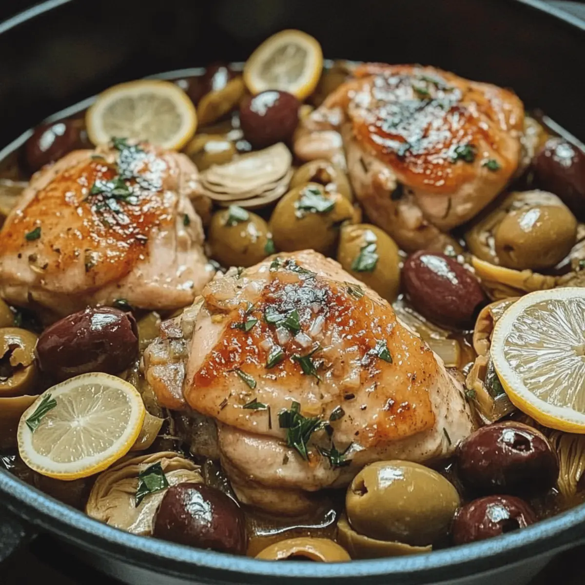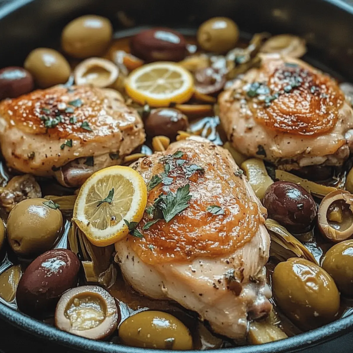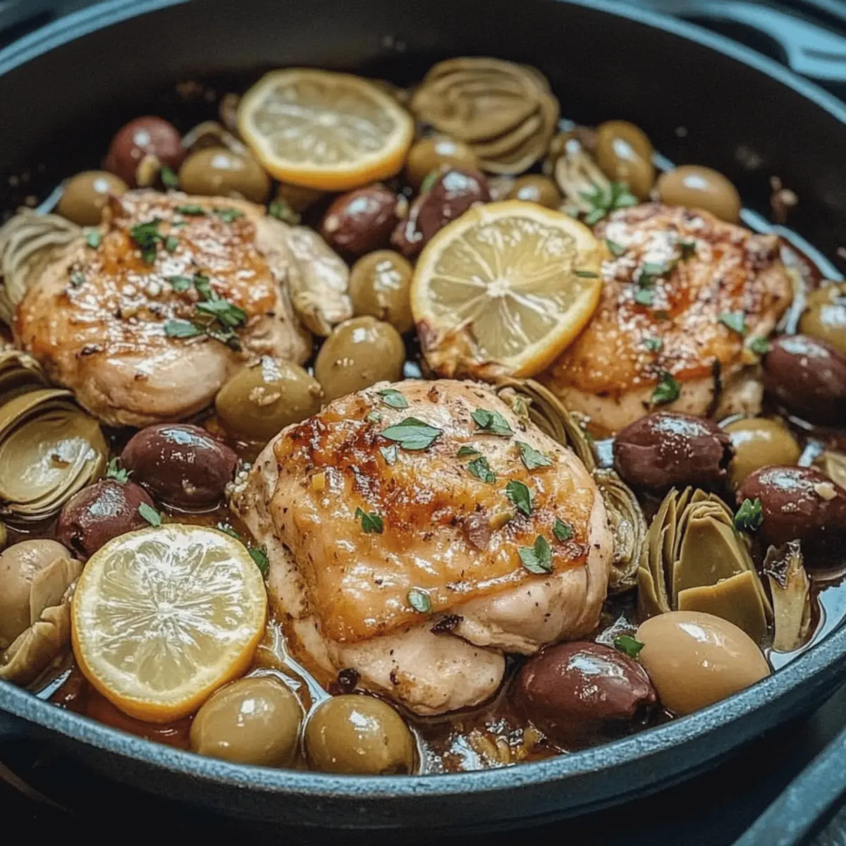 As I savored the vibrant hues of a Mediterranean sunset, the thought of recreating those flavors at home sparked my culinary imagination. This Mediterranean Lemon Chicken with Artichokes & Olives captures that essence with juicy chicken thighs seamlessly mingling with savory olives, tender artichokes, and zesty lemon slices. With just about 45 minutes of your time, you can transform a simple weeknight dinner into a delightful feast that impresses both family and guests alike. The beauty of this dish lies not only in its quick prep but also in the stunning presentation and the explosion of fresh, aromatic flavors. Ready to dive into my secret for bringing the Mediterranean to your kitchen? Let’s explore this quick and easy recipe together! Why is this recipe a must-try? Simplicity is key: This Mediterranean Lemon Chicken with Artichokes & Olives requires minimal prep time and basic kitchen skills, making it perfect for both novice and seasoned cooks. Flavor explosion: The combination of tangy lemon, zesty garlic, and briny olives creates a vibrant, sun-soaked flavor profile that transports your taste buds straight to the Mediterranean. Versatile variations: Whether you prefer bone-in thighs for added richness or boneless cuts for a quicker dish, you can easily customize this recipe. Crowd-pleaser: This dish is impressively delicious and perfect for family dinners or entertaining guests. Pair it with a refreshing Greek salad or roasted Mediterranean vegetables for a complete meal! Quick cooking: Ready in just about 45 minutes, it’s a fantastic option for busy weeknights when you still want to serve something special. Make-ahead options: Prep your ingredients ahead of time to streamline your cooking process when you’re ready to indulge in a delectable feast! Mediterranean Lemon Chicken Ingredients • A delightful journey awaits with these simple yet flavorful components! For the Chicken Chicken Thighs – Juicy and flavorful, they make the dish rich; for faster cooking, use boneless cuts. Olive Oil – Essential for richness; opt for extra-virgin for a bolder taste. For the Aromatics Garlic – Adds aromatic depth; feel free to adjust based on your love for garlic. Onion – Brings sweetness; yellow onions are perfect for this dish for their balanced flavor. For the Mediterranean Touch Artichoke Hearts – Adds unique texture and flavor; canned or jarred works wonderfully. Mixed Olives – Provides briny goodness; mix varieties like Kalamata and Castelvetrano for the best taste. Lemon – Brightens the dish; slice thinly for maximum infusion effect. For the Sauce Dry White Wine or Broth – Deglazes the pan for rich flavor; substitute with more broth and a splash of lemon juice if desired. Chicken Broth – Forms the base of the sauce, enhancing overall flavor. Dried Oregano – Infuses the dish with a classic Mediterranean aroma. Crushed Red Pepper Flakes – Optional for a hint of heat to awaken your palate. Salt & Black Pepper – Always season to taste, but a light hand is best due to the olives. For the Finish Fresh Parsley – A beautiful garnish that adds a pop of freshness and color! By gathering these items, you’re on your way to experiencing a perfect Mediterranean Lemon Chicken with Artichokes & Olives that will delight both family and friends! Step‑by‑Step Instructions for Mediterranean Lemon Chicken with Artichokes & Olives Step 1: Prepare the Chicken Begin by patting the chicken thighs dry with paper towels to ensure they sear nicely. Season both sides with a sprinkle of salt, black pepper, and half of the dried oregano. Let the seasoned chicken rest at room temperature while you heat the skillet, allowing the flavors to meld before cooking. Step 2: Sear the Chicken In a large skillet or Dutch oven, heat 2 tablespoons of olive oil over medium-high heat. Once the oil shimmers, carefully place the chicken thighs skin-side down in the hot pan. Sear for about 5–7 minutes until the skin turns golden brown and crispy. Flip the chicken and brown the other side for an additional 3–4 minutes before removing it from the skillet and setting it aside. Step 3: Sauté Aromatics In the same skillet, reduce the heat to medium and add the sliced onion. Sauté for about 2–3 minutes until the onions become translucent and fragrant. Next, stir in the minced garlic, cooking for another 30–45 seconds until it’s aromatic but not browned. This step infuses the dish with a delicious base flavor. Step 4: Build the Sauce Pour in the dry white wine (or broth), using a wooden spoon to scrape up the tasty browned bits from the bottom of the skillet. This deglazing adds depth to your sauce. Then, add the chicken broth, remaining oregano, crushed red pepper flakes, artichoke hearts, and mixed olives. Stir everything together until combined, letting the flavors meld beautifully. Step 5: Simmer the Chicken Carefully nestle the seared chicken thighs back into the pan, arranging them skin-side up. Layer lemon slices over the chicken and bring the mixture to a gentle simmer. Cover the skillet and allow it to cook for about 20 minutes, or until the chicken reaches an internal temperature of 165°F (74°C). Remove the lid for the last 5 minutes to let the sauce reduce and concentrate. Step 6: Garnish and Serve Once done, remove the skillet from heat and let it rest for a moment. Garnish the Mediterranean Lemon Chicken with freshly chopped parsley for a burst of color. Serve warm with generous spoonfuls of the rich sauce over the chicken, pairing it with a side of crusty bread or your favorite grain for a complete meal. What to Serve with Mediterranean Lemon Chicken with Artichokes & Olives Transform your delightful chicken dish into a complete meal with these tantalizing accompaniments. Creamy Mashed Potatoes: The rich, buttery flavor of mashed potatoes complements the tangy sauce, providing a comforting contrast. Smooth and velvety, they act like a cozy blanket, soaking up all the delicious 