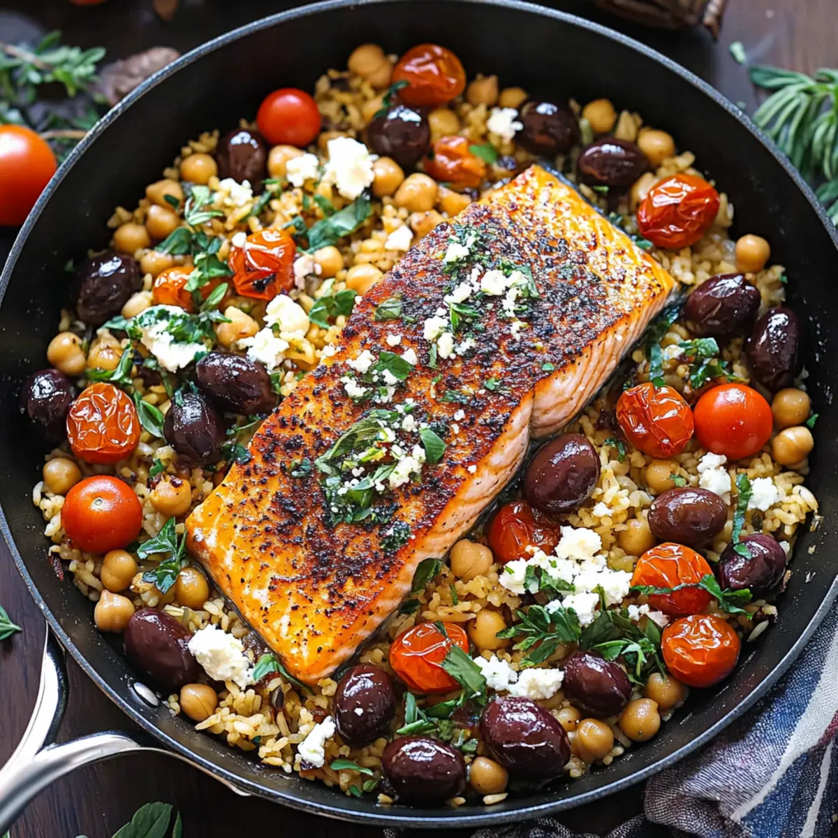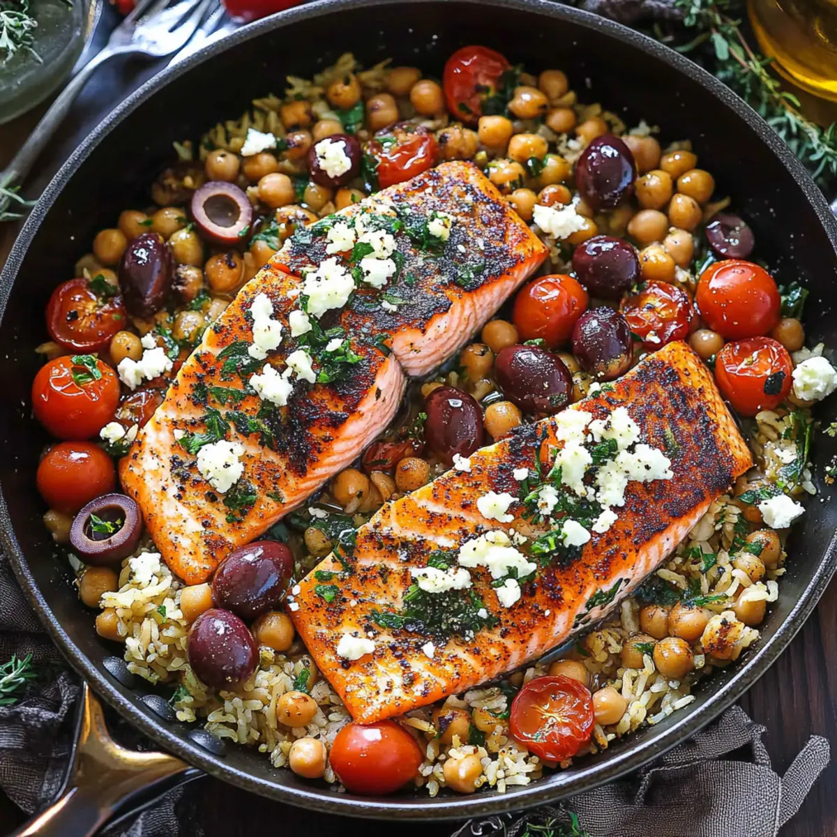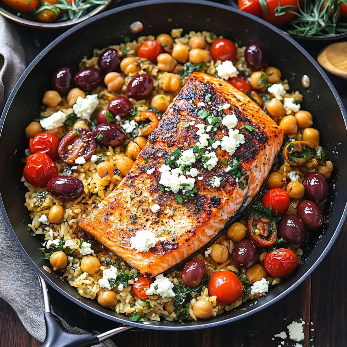 Facebook Twitter Pinterest LinkedInHave you ever stared at the clock, scrambling to put together a satisfying dinner only to feel overwhelmed? Let me assure you, dinner can be a breeze! This Mediterranean Salmon One-Pan Meal is your new secret weapon for quick, delicious weeknight cooking that won’t compromise on flavor. Combining fresh, wholesome ingredients and taking just 30 minutes from start to finish, this gluten-free dish is not only rich in omega-3s but also a true crowd-pleaser. Picture tender, flaky salmon paired with zesty chickpeas and vibrant cherry tomatoes, all cooked in one pan for easy cleanup. Whether you’re hosting friends or making a cozy dinner for yourself, this recipe is sure to impress. Are you ready to dive into flavors that transport you straight to the Mediterranean shores? Why is Mediterranean Salmon a Must-Try? Quick and Easy: In just 30 minutes, you can create a stunning dish that’s perfect for busy weeknights or entertaining your guests. Flavor Explosion: The combination of smoked paprika, zesty lemon, and creamy feta brings a taste of the Mediterranean right into your kitchen. One-Pan Wonder: Simplify your cooking with minimal cleanup, allowing you to focus on enjoying the delicious results. Nutritious and Wholesome: Packed with omega-3s from salmon and protein-rich chickpeas, this dish is both healthy and hearty, making it a perfect choice for anyone mindful of their diet. Versatile Options: Have fun swapping in your favorite seasonal veggies or even different proteins like halibut for variety. If you enjoy this, consider checking out my Baked Salmon Lemon Herb Recipe for another twist! Mediterranean Salmon Ingredients • Discover the essential components for this flavorful dish. For the Salmon Salmon (2 lb) – The star of the dish, bringing rich omega-3 fatty acids for heart health. Smoked Paprika (1 tsp) – Infuses a warm, smoky flavor that elevates the salmon to new heights. Dried Oregano (½ tsp) – Offers that classic herbaceous touch, typical of Mediterranean cuisine. Dried Parsley (½ tsp) – Adds a fresh flavor note without overpowering the other ingredients; feel free to use fresh parsley instead. Red Chili Flakes (¼ tsp) – Introduces a gentle heat; adjust this based on your spice preference. Salt (¼ tsp) – Essential for bringing all the flavors together; use kosher or sea salt for best results. For the Rice Mixture Olive Oil (3 tbsp total) – This rich oil not only cooks the salmon but also enriches the feta mixture. Jasmine Rice (1.5 cups, cooked) – Serves as a comforting base, perfectly soaking up all the delicious flavors. Chickpeas (15 oz, canned) – A great source of protein and fiber, making the dish hearty; white beans work as a fine substitute. Cherry Tomatoes (6 oz) – Bursting with juiciness and acidity, use a variety of colors for extra charm. Kalamata Olives (⅓ cup) & Green Olives (¼ cup) – Bring briny depth that enhances the overall flavor; feel free to swap as you like. Fresh Lemon Juice (3 tbsp) – Brightens everything up with its zingy acidity; lime juice can be a lovely alternative. For the Feta Mixture Feta Cheese (6 oz) – Creamy and tangy, it complements the salmon wonderfully; consider a dairy-free cheese to cater to vegan diets. Fresh Oregano (2 tbsp, optional) – A vibrant garnish to elevate the dish; can be replaced with fresh basil or dill if you prefer. Embrace the Mediterranean flavors with these thoughtfully selected ingredients, and prepare to indulge in a quick, delicious meal that’s bound to become a favorite! Step‑by‑Step Instructions for Mediterranean Salmon Step 1: Prepare Salmon Begin by heating a large cast iron skillet over medium heat. While the skillet warms, season the salmon fillets generously with smoked paprika, dried oregano, dried parsley, red chili flakes, salt, and 1 tablespoon of olive oil. Ensure the skillet is hot before adding the salmon to achieve a beautiful sear. Step 2: Cook Salmon Add 2 tablespoons of olive oil to the skillet and gently place the salmon skin-side up. Cook undisturbed for 4 minutes, allowing the skin to crisp up. After this time, carefully flip the fillets and reduce the heat to medium. Cook for an additional 5 minutes until the salmon is opaque and flakes easily with a fork. Remove it from the pan and set aside. Step 3: Make Mediterranean Rice In the same skillet that held the salmon, combine the cooked jasmine rice, drained chickpeas, halved cherry tomatoes, and sliced olives. Stir everything together to mix and heat through, allowing the flavors to meld. Squeeze in the fresh lemon juice and season to taste. Cook over medium heat for about 5 minutes, stirring occasionally until heated. Step 4: Prepare Feta Mixture In a small bowl, mix the feta cheese with 1 tablespoon of olive oil, lemon juice, and dried oregano until well combined. This creamy mixture will add a rich, tangy flavor to your Mediterranean salmon dish. Set aside while you assemble the final meal. Step 5: Assemble Dish Incorporate half of the prepared feta mixture into the warmed rice mixture, stirring gently. Next, add the cooked salmon back into the skillet for a quick reheat, about 2 minutes. Top with the remaining feta mixture and garnish with fresh oregano before serving to elevate the flavors of your Mediterranean salmon one-pan meal. Make Ahead Options This Mediterranean Salmon One-Pan Meal is perfect for meal prep! You can prepare the jasmine rice, chickpeas, and feta mixture up to 24 hours in advance. Simply cook the rice and combine it with the drained chickpeas, halved cherry tomatoes, and olives (store in the refrigerator); this saves time on busy weeknights. For the feta, mix it with olive oil, lemon juice, and oregano, then refrigerate until you’re ready to assemble. When it’s time to serve, simply reheat the rice mixture in a skillet, add the cooked salmon, and top it with the feta to enjoy a meal that’s just as delicious as if it were freshly made! Expe