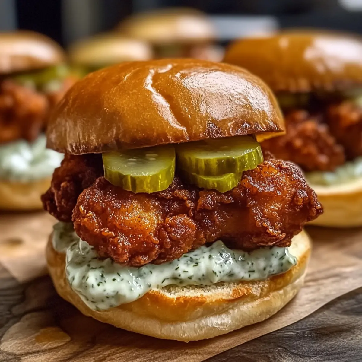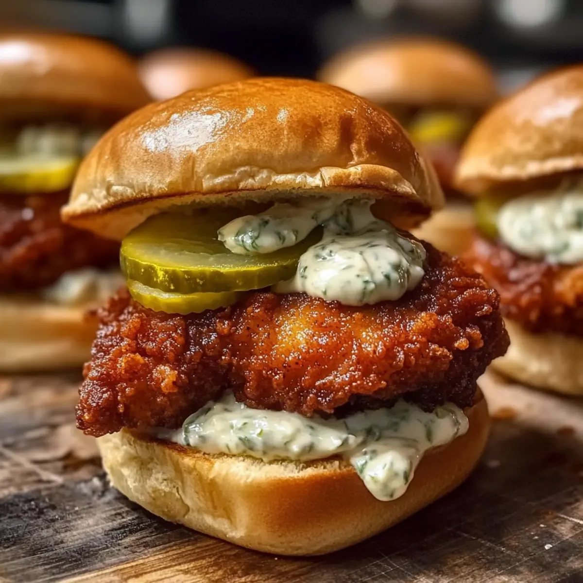 Facebook Twitter Pinterest LinkedInOn a bustling evening, as the aroma of spices filled the kitchen, I realized that some days call for a deliciously satisfying bite. That’s how my crave for Nashville Hot Chicken Sliders with Dill Pickle Aioli was sparked! If you’ve been dreaming of a dish that’s not only quick to whip up but also a guaranteed crowd-pleaser, you’re in for a treat. These sliders are entirely adaptable too – whether you prefer the classic chicken or want a vegetarian twist using tofu, there’s a flavor for everyone. In just 15 minutes, you can have crispy, spicy goodness nestled between soft slider buns, topped with a creamy dill pickle aioli that cuts through the heat. Are you ready to take your taste buds on a flavor adventure? Let’s dive into this scrumptious recipe! Why Are Nashville Hot Chicken Sliders Special? Irresistible Flavor: The perfect balance of spicy and creamy will leave everyone craving more. Quick Prep Time: With just 15 minutes of cooking, you can serve up delicious sliders faster than you can say “game day”! Customizable Options: Enjoy the ability to go gluten-free or switch to tofu for a vegetarian option, ensuring everyone can indulge. Family-Friendly Fun: These sliders are a hit with kids and adults alike, making family dinners or gatherings extra special. Satisfying Crunch: Each bite delivers a satisfying crunch from the crispy chicken, paired beautifully with the tangy dill pickle aioli that takes them over the top. Whether you’re pairing these sliders with Hawaiian Chicken Sheet or a fresh veggie platter, they’re bound to elevate your meal! Nashville Hot Chicken Sliders Ingredients For the Chicken • Chicken Thighs – Provides the main protein; tender and juicy when marinated, or swap for tofu to make it vegetarian. • Buttermilk – Ensures the chicken is flavorful and tender; substitute with plant-based milk mixed with vinegar for a dairy-free option. • All-Purpose Flour – Coating for the chicken that crisps up when fried; use gluten-free flour for a gluten-free version. • Cayenne Pepper – Delivers the signature spicy kick of Nashville hot chicken; adjust the quantity for your preferred heat level. • Paprika – Adds color and a delightful smoky flavor. • Garlic Powder & Onion Powder – Enhances the overall flavor profile, creating depth. • Salt and Pepper – Essential for seasoning; adjust to taste for the best impact. For the Sliders • Slider Buns – The base for the sliders; choose soft, fresh ones for optimal texture. • Dill Pickle Slices – Adds crunch and tanginess that balances the heat of the chicken. For the Dill Pickle Aioli • Mayonnaise – Acts as the creamy base for the aioli; substitute with vegan mayo for a plant-based option. • Dill Pickle Juice – Adds an extra layer of flavor to the aioli, truly tying in the pickle theme. These Nashville Hot Chicken Sliders with Dill Pickle Aioli are bursting with flavor and perfect for sparking joy at your next gathering! Step‑by‑Step Instructions for Nashville Hot Chicken Sliders with Dill Pickle Aioli Step 1: Marinate the Chicken Begin by placing your chicken thighs in a bowl and covering them with buttermilk. This not only tenderizes the meat but infuses it with flavor. Cover the bowl tightly with plastic wrap and refrigerate for at least 2 hours, or ideally overnight, to ensure that each bite of your Nashville Hot Chicken Sliders is incredibly juicy and delicious. Step 2: Prepare the Spice Mixture While the chicken marinates, use a mixing bowl to whisk together all-purpose flour, cayenne pepper, paprika, garlic powder, onion powder, salt, and pepper. This flavorful spice mixture will create the crispy, spicy coating for your chicken. Set this aside as you move onto the next step of cooking for your Nashville Hot Chicken Sliders. Step 3: Coat the Chicken After marinating, remove the chicken from the buttermilk, allowing excess liquid to drip off. Next, dredge each piece thoroughly in the spice mixture, ensuring it’s evenly coated on all sides. This step is crucial for achieving that crispy texture and bold flavor that defines Nashville Hot Chicken, making your sliders irresistible. Step 4: Fry the Chicken Heat oil in a frying pan over medium-high heat until it reaches 350°F. Carefully add the coated chicken thighs to the pan, frying for about 5 to 7 minutes on each side, or until they are golden brown and have an internal temperature of 165°F. Use tongs to flip the chicken gently, ensuring they cook evenly and become crispy. Step 5: Make the Dill Pickle Aioli While the chicken fries, prepare the dill pickle aioli by combining mayonnaise and dill pickle juice in a bowl. Stir the mixture until smooth and creamy. This aioli adds a refreshing contrast to the spice of your Nashville Hot Chicken Sliders, enhancing the flavor profile of the dish beautifully. Step 6: Assemble the Sliders With the chicken fried to perfection, it’s time to construct your sliders. Take a soft slider bun and place a piece of crispy fried chicken on the bottom half. Top it generously with dill pickle slices and a dollop of the dill pickle aioli. Finally, crown your creation with the top half of the bun, ensuring each slider is ready to be enjoyed! Nashville Hot Chicken Sliders Variations Feel free to get creative and tweak this recipe to suit your taste buds and dietary preferences! Gluten-Free: Substitute all-purpose flour with a certified gluten-free flour blend to make these sliders accessible for everyone. Vegetarian: Replace chicken with firm tofu, pressed to remove moisture, marinated, and fried just like the chicken for a delightful meatless option. Add Creaminess: Include slices of avocado or a gooey piece of cheese such as pepper jack on the slider for added richness that enhances the bite. Flavor Infusions: Experiment with spices like smoked paprika or dried herbs—adding your signature twist will make each slider uniquely yours. Sauce Variations: T