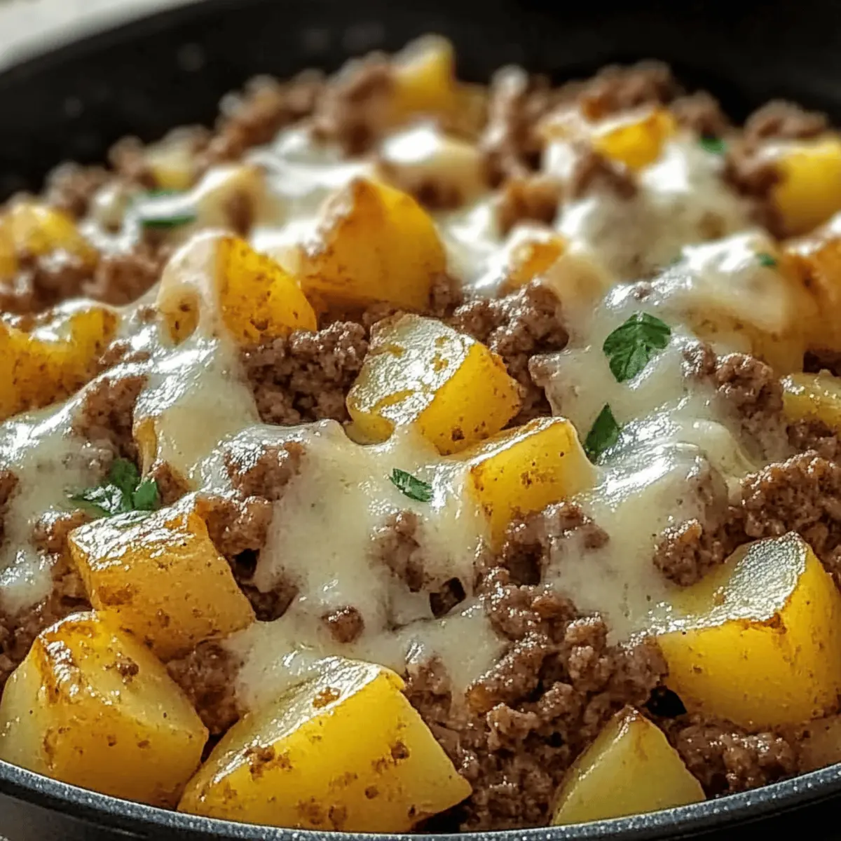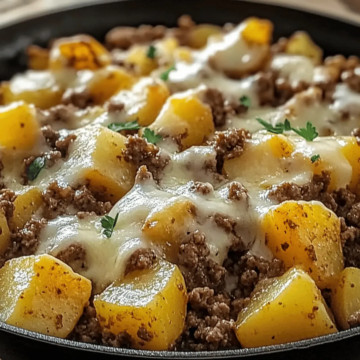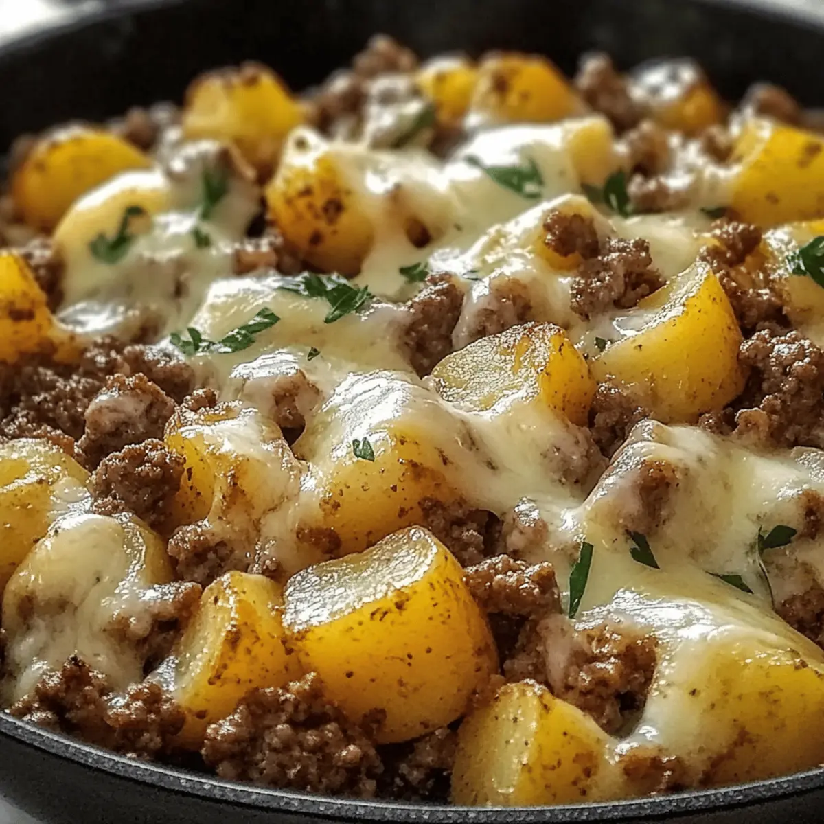 As I stood in my kitchen, a chaotic jumble of ingredients and time slipping away, a spark of inspiration hit me. This is when my One-Pan Cheesy Meat & Potato Skillet became my go-to solution for busy weeknights. Picture tender baby potatoes, savory ground beef, and rich, melted cheese coming together in a single skillet – no fuss, no extra pots to wash. The beauty of this recipe lies in its versatility; you can easily swap out meats or cheeses based on what you have on hand. Not only is it a comforting and hearty meal, but it also provides a quick prep solution that is sure to delight your family or guests. So, why not transform your evening meals and explore the possibilities this dish offers? What flavor twist will you try in your own skillet creation? Why is this skillet recipe so special? Simplicity at its best: The One-Pan Cheesy Meat & Potato Skillet comes together effortlessly, making it ideal for busy days. Endless variations: Customize it with ground turkey, chicken, or even a plant-based option, plus cheese swaps to match your cravings. Rich flavors meld in every bite, thanks to the savory beef and creamy cheese enveloping crispy potatoes. Time-saving and easy cleanup means more quality time with loved ones, as this dish requires just one pan! Crowd-pleaser: It’s guaranteed to keep everyone happy, making it perfect for family dinners or gatherings. Try pairing it with a fresh green salad or roasted vegetables for a complete meal! One-Pan Cheesy Meat & Potato Skillet Ingredients For the Meat Ground Beef – Savory base providing protein and rich flavor. Swap for ground turkey, chicken, or sausage for varied taste. For the Potatoes Potatoes – Use baby or russet potatoes for crisp texture. Other options include sweet potatoes for a slightly sweeter flavor and different cooking time. For the Cheese Cheese – Shredded cheddar for melty finish. Substitutes: mozzarella, Monterey Jack, or pepper jack for added heat. For the Aromatics Onion – Chopped onion adds flavor and sweetness. Can use shallots or leeks as alternatives for different flavor profiles. Garlic – Fresh garlic provides aromatic punch. Garlic powder can be used in a pinch, but fresh is preferred for flavor. For Seasoning Salt and Pepper – Essential seasonings to enhance all flavors. Adjust based on taste. Paprika – Adds smoky, slightly spicy flavor. Smoked paprika can be used for a more intense smokiness. Dried Oregano or Italian Seasoning – Provides herby kick. Substitutes include thyme or basil for different herb notes. Step‑by‑Step Instructions for One-Pan Cheesy Meat & Potato Skillet Step 1: Heat the Skillet Begin by placing a large skillet over medium heat and allow it to warm up for about 2 minutes. This ensures the cooking surface is hot enough to brown your meat properly. Swirl in a drizzle of oil to help in browning and to prevent sticking, creating a shimmering effect when the oil is ready. Step 2: Brown the Ground Beef Add the ground beef to the hot skillet and cook it for about 7–10 minutes or until it’s fully browned. Use a wooden spoon to break it into small pieces while stirring to prevent clumping. Look for a nice golden color to form on the meat, which will add deeper flavor to your One-Pan Cheesy Meat & Potato Skillet. Once browned, drain any excess fat. Step 3: Sauté the Aromatics Next, stir in the chopped onion and minced garlic and let them cook for about 3–5 minutes. You want the onion to become translucent and fragrant, indicating they are softened and ready to enhance your dish’s flavor. Make sure to stir occasionally to avoid burning the garlic. Step 4: Incorporate the Potatoes and Seasonings Add your diced potatoes into the skillet along with salt, pepper, paprika, and dried oregano. Stir the mixture well for about 1–2 minutes, ensuring the potatoes are evenly coated with the seasonings. This step builds a flavorful base for your One-Pan Cheesy Meat & Potato Skillet, allowing the ingredients to blend excellently. Step 5: Cook the Potatoes Cover the skillet with a lid and reduce the heat slightly to medium-low. Cook for about 15–20 minutes, stirring occasionally, until the potatoes are fork-tender and begin to crisp at the edges. The aroma wafting from the skillet will build your anticipation for this delicious comfort food. Step 6: Add the Cheese Once the potatoes are tender, sprinkle a generous layer of shredded cheese over the top of the skillet. Cover it again and let it cook for an additional 3–5 minutes, or until the cheese is fully melted and bubbly. This melty topping is what makes your One-Pan Cheesy Meat & Potato Skillet irresistibly comforting. Step 7: Serve and Garnish Remove the skillet from heat, and allow it to sit for a minute before serving hot. If desired, enhance the dish with a sprinkle of fresh herbs for added color and flavor. Serve your One-Pan Cheesy Meat & Potato Skillet directly from the pan, savoring the delightful textures and tastes! What to Serve with One-Pan Cheesy Meat & Potato Skillet Elevate your dinner experience by pairing this comforting skillet dish with delightful sides that enhance its heartiness and flavor. Creamy Coleslaw: Adds a crunchy, tangy contrast to the savory skillet, making each bite more refreshing. Garlic Bread: Its buttery, garlic flavor complements the richness of the dish and is perfect for soaking up any melted cheese. Roasted Green Beans: These provide a tender yet crispy element, balancing the dish’s overall texture with fresh, vibrant greens. Hearty and comforting, the One-Pan Cheesy Meat & Potato Skillet can also embrace: Classic Caesar Salad: Crisp romaine paired with creamy dressing enhances the meal with a zesty kick. Fruit Salad: A refreshing sweet-tart addition that lightens up every bite and cleanses the palate. Sparkling Lemonade: This bubbly drink adds a refreshing zest that counters the richness of the cheese and beef. Enjoy experimenting with these pairings that create a well-rounded, comfo