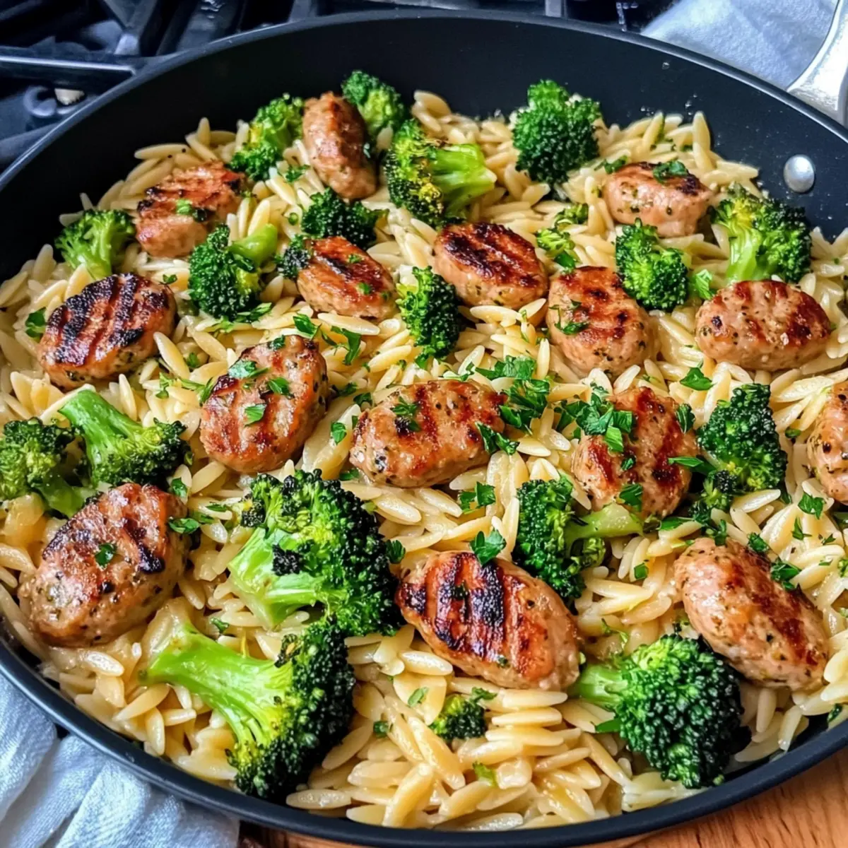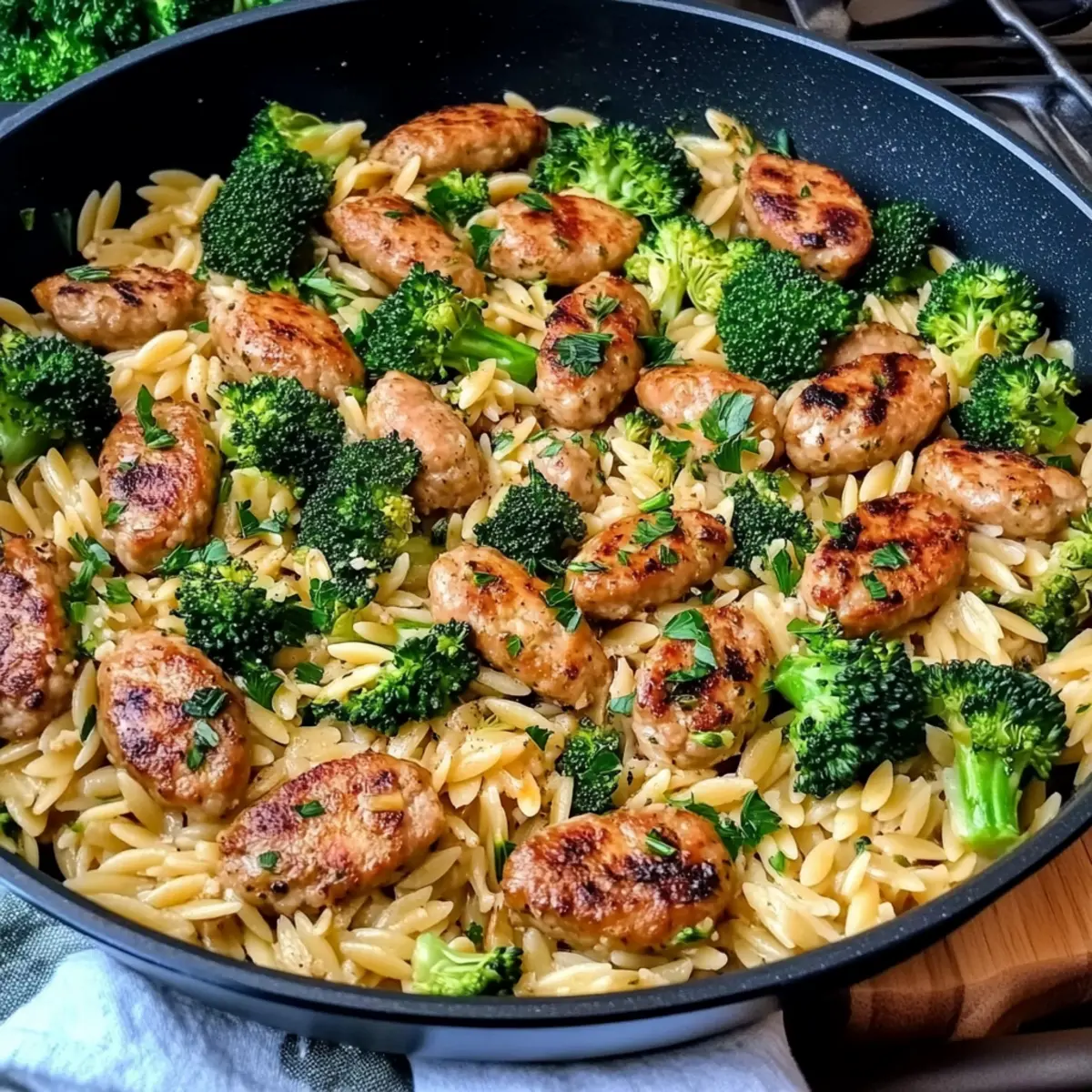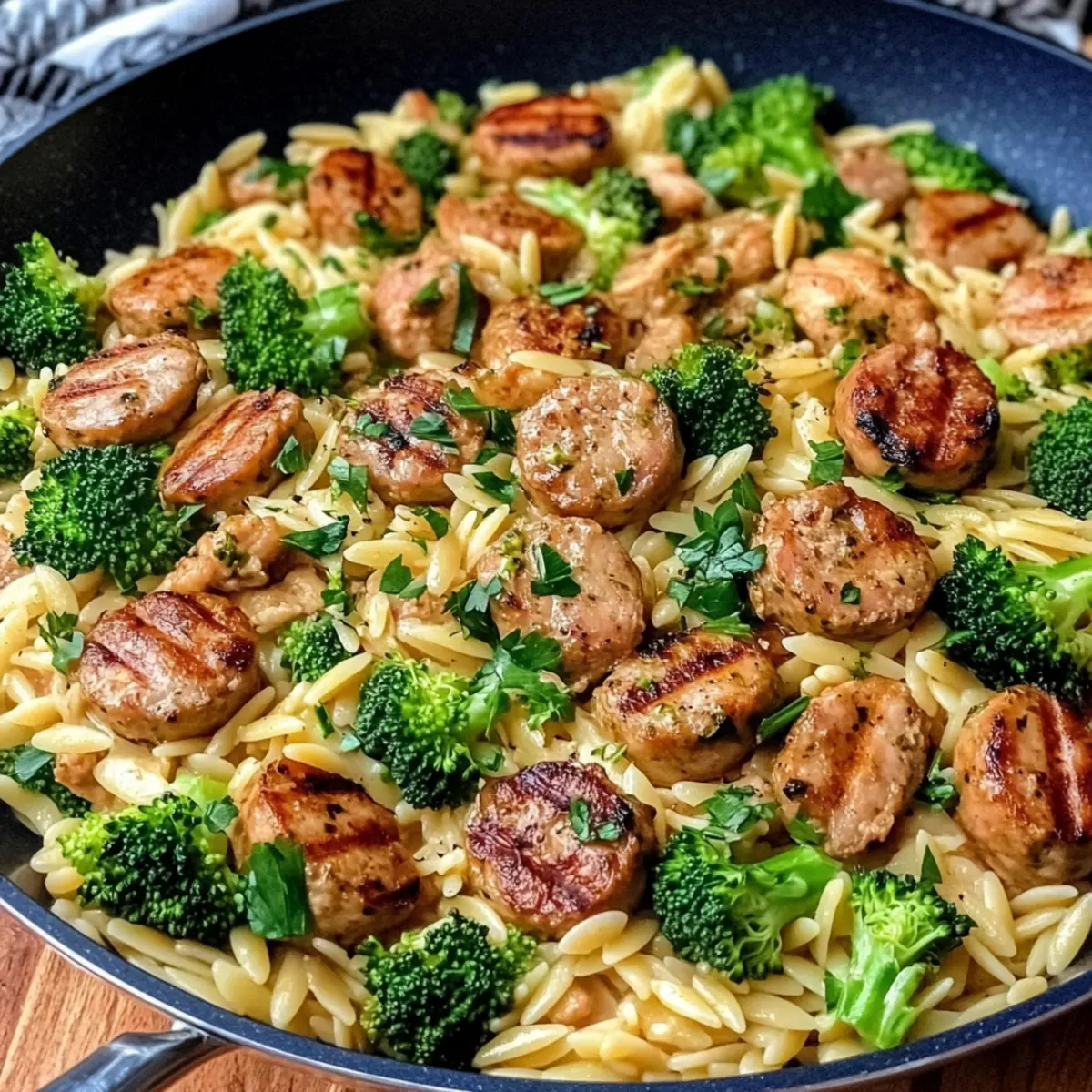 Facebook Twitter Pinterest LinkedInAs I glanced at the clock, I felt that familiar pinch of urgency—dinner time was fast approaching! That’s when I turned to my go-to solution: One-Pan Chicken Sausage Broccoli Orzo. This dish has become a staple in my home, where the comforting embrace of tender orzo meets the warmth of golden-browned chicken sausage and fresh broccoli. What I love about this recipe is how quickly it comes together without sacrificing flavor or nutrition—ideal for those busy weeknights when you crave something homemade yet simple. Plus, it’s a family-friendly feast that transforms your dining table into a cozy gathering spot, making mealtime special. Are you ready to whip up something that’ll impress your loved ones and leave you with just one pan to clean? Let’s dive into this deliciously easy meal! Why is One-Pan Cooking a Game Changer? Simplicity: This One-Pan Chicken Sausage Broccoli Orzo is a breeze to prepare, allowing you to focus more on enjoying dinner and less on cleanup. Comforting Flavor: The blend of savory sausage, creamy orzo, and crisp broccoli creates a dish bursting with comforting flavors that’ll warm your heart. Family-Friendly: Perfectly balanced and delicious, it’s a meal that even picky eaters will love—everyone gathers around the table for this crowd-pleaser! Nutrient-Rich: With veggies and protein, it’s not just tasty; it’s also packed with nutrition, offering a wholesome dinner option for busy weekdays. Versatile: Feel free to swap ingredients based on what you have on hand! Whether it’s using different veggies, pasta shapes, or proteins, the possibilities are endless. Quick and Efficient: In just about 30 minutes, you can have a satisfying dinner ready, making it a fantastic solution for those nights when time is tight. Pair it with a side like Grilled Chicken Broccoli for an even heartier meal! One-Pan Chicken Sausage Broccoli Orzo Ingredients • Get ready to gather these delightful ingredients for a wholesome family dinner! For the Main Dish Chicken Sausage – Hearty protein packed with flavor; substitute with turkey sausage or omit for a vegetarian option. Orzo Pasta – Acts as the comforting base, soaking up all the flavors; always use uncooked orzo for the best texture. Broccoli Florets – Brings a pop of color and essential nutrients; frozen broccoli can be used straight from the freezer. Yellow Onion – Adds a lovely sweetness; finely diced for even cooking. Garlic – Aromatic powerhouse for flavor enhancement; fresh cloves are best for ultimate taste. Chicken Broth – Deepens the flavor profile; switch to vegetable broth for a vegetarian alternative. For Cooking and Seasoning Olive Oil – Perfect for sautéing your sausage and aromatics; avocado oil works well as a substitute. Italian Seasoning – Infuses the dish with herby goodness; feel free to combine your favorite dried herbs if you don’t have Italian seasoning. Red Pepper Flakes – Add a hint of heat if desired; simply omit for a milder experience. Salt and Black Pepper – Essential for bringing all the flavors together; adjust to suit your taste. For Finishing Touches Parmesan Cheese – Adds creamy richness and umami flavor; nutritional yeast is a great dairy-free alternative. Lemon Juice – Brightens the dish with a zing of acidity; fresh juice is key for maximum vibrancy. Fresh Parsley – For an uplifting garnish; other herbs like cilantro or basil can be delightful substitutes. Remember, if you’re in love with quick and delicious meals, this One-Pan Chicken Sausage Broccoli Orzo is here to delight! Step‑by‑Step Instructions for One-Pan Chicken Sausage Broccoli Orzo Step 1: Sauté the Sausage Heat a large skillet over medium-high heat and add a drizzle of olive oil. Once the oil is shimmering, add sliced chicken sausage to the pan. Cook for about 5-7 minutes, turning occasionally, until the sausage is golden-brown and cooked through. Remove the sausage from the skillet and set it aside for later. Step 2: Cook the Aromatics In the same skillet, add the finely diced yellow onion, cooking for 3-4 minutes until it becomes translucent and fragrant. Next, stir in minced garlic, Italian seasoning, and a pinch of red pepper flakes. Sauté the mixture for another 30 seconds, allowing the flavors to meld and the garlic to become aromatic. Step 3: Toast the Orzo Add uncooked orzo to the skillet, tossing it with the onion and garlic mixture. Continue to cook for 1-2 minutes, stirring frequently until the orzo is lightly toasted and slightly golden. This step enhances the flavor of the orzo and adds a delightful nutty undertone to the One-Pan Chicken Sausage Broccoli Orzo. Step 4: Simmer with Broth Pour in chicken broth while carefully scraping the bottom of the skillet to release any delicious browned bits. Bring the mixture to a simmer, cover the skillet, and cook for 8 minutes, stirring occasionally to prevent the orzo from sticking. You’ll know it’s ready when the orzo is just tender and most of the liquid has been absorbed. Step 5: Add Broccoli and Sausage Stir in the broccoli florets and return the cooked chicken sausage to the skillet. Cover again and cook for an additional 4-5 minutes, allowing the broccoli to steam until it is tender-crisp and vibrant green. This step adds a nutritious element to the comforting One-Pan Chicken Sausage Broccoli Orzo. Step 6: Final Touches Remove the skillet from the heat and add Parmesan cheese, stirring until it melts and creates a creamy texture throughout the dish. Squeeze fresh lemon juice over the top, then season with salt and black pepper to taste. Finish by sprinkling fresh parsley for a burst of color and freshness before serving. One-Pan Chicken Sausage Broccoli Orzo Variations Invite your culinary creativity and explore new flavors with these delightful twists! Turkey Sausage: Swap chicken sausage for turkey for a lighter take; it retains the same delicious flavor. Vegetarian Delight: Omit