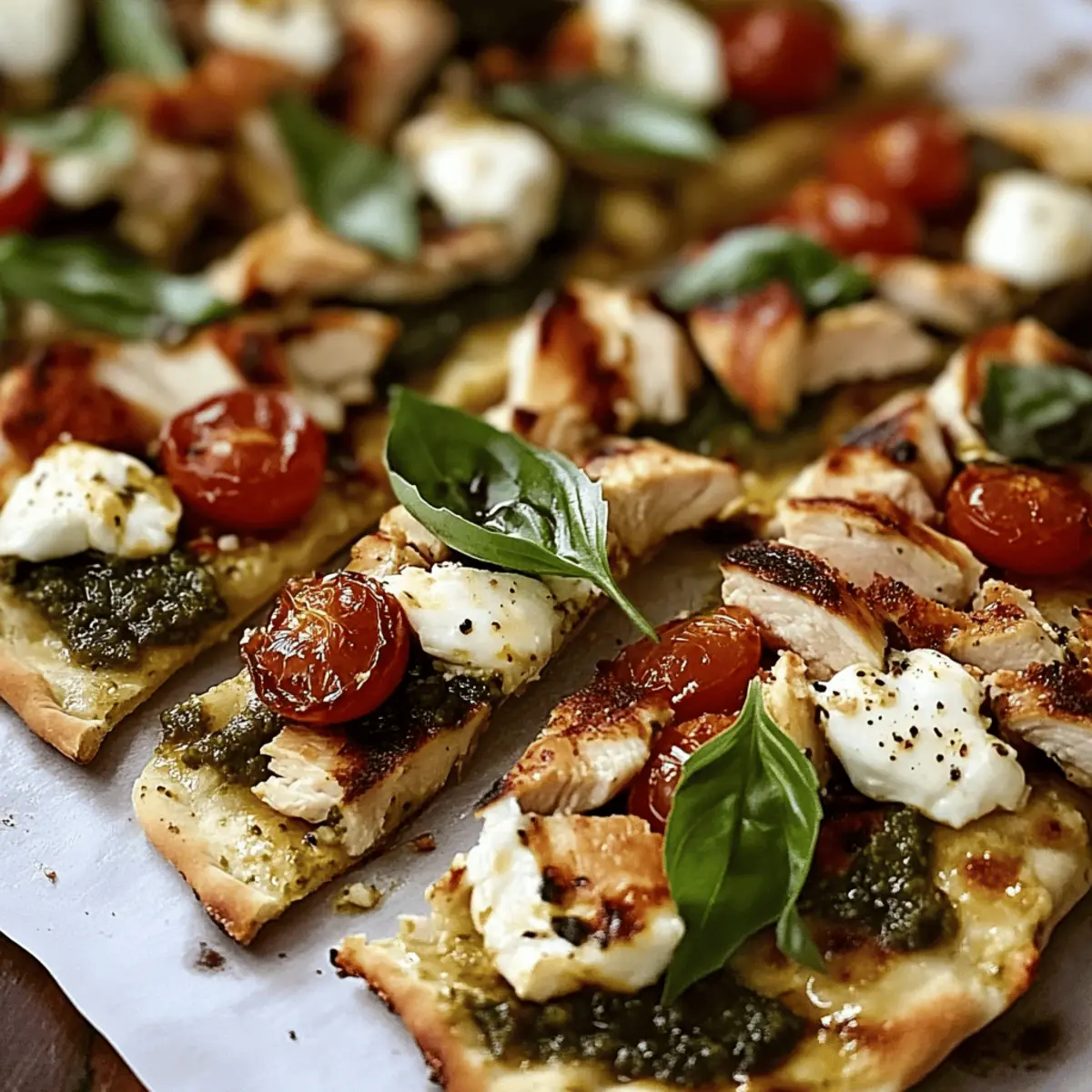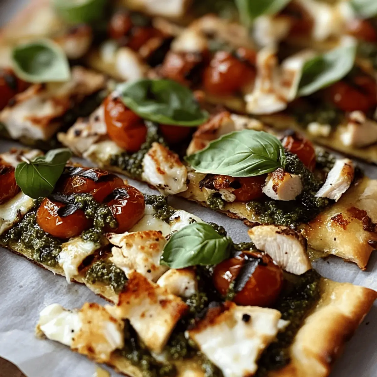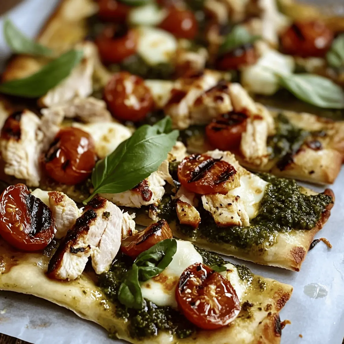 The kitchen filled with the tantalizing aroma of sizzling chicken mixed with aromatic basil—no wonder my friends often stop by when I make my Pesto Chicken Flatbread! This dish is a celebration of convenience, taking just 35 minutes to prepare and cook, making it perfect for busy weeknights or fun gatherings with friends. The crispy flatbread serves as a delicious canvas for juicy grilled chicken, savory pesto, and melting mozzarella, creating a delightful harmony of flavors and textures. Plus, it’s incredibly versatile; swap the chicken for grilled veggies or tofu for a scrumptious vegetarian option. Are you ready to experience your new favorite quick dinner that is as simple to make as it is enjoyable to eat? Let’s dive into this tasty creation! Why is Pesto Chicken Flatbread a Must-Try? Flavor Explosion: The combination of rich pesto, juicy chicken, and gooey mozzarella creates an irresistible taste sensation that delights the senses. Convenience: This recipe takes just 35 minutes from prep to plate, making it perfect for busy weeknights or impromptu gatherings. Customizable: Whether you prefer classic chicken or want to swap it out for grilled vegetables or tofu, this flatbread can easily cater to your cravings. Texture Galore: With a crispy base, melty cheese, and fresh toppings, each bite is a delicious journey of contrasting textures. Crowd-Pleaser: Ideal for serving friends and family, this dish is sure to impress—pair it with a side salad for a complete meal, just like our Hawaiian Chicken Sheet or Grilled Chicken Broccoli. Pesto Chicken Flatbread Ingredients • Discover the essential ingredients to create this delightful dish! For the Flatbread Base Flatbread – Choose store-bought for convenience or make your own for a personal touch. For the Toppings Boneless Skinless Chicken Breasts – Adds protein; substitute with grilled vegetables or tofu for a vegetarian option. Fresh Basil Pesto – Provides rich flavor; use homemade or store-bought based on your schedule. Shredded Mozzarella Cheese – Brings creaminess and richness; try cheddar or a dairy-free alternative if desired. Cherry Tomatoes – Add a burst of freshness and color; regular tomatoes are a great substitute if cherry is unavailable. Grated Parmesan Cheese – Enhances savory depth and gives a crispy top when baked; nutritional yeast makes a nice dairy-free alternative. For Cooking Olive Oil – Used to cook chicken and enhance flavors; any cooking oil can work as a substitute. Salt and Pepper – Essential for seasoning; adjust to taste. For Garnishing (Optional) Fresh Basil Leaves – A lovely garnish that adds color and additional flavor; feel free to skip if you’re short on time. Step‑by‑Step Instructions for Pesto Chicken Flatbread Step 1: Preheat Your Oven Begin by preheating your oven to 400°F (200°C). This temperature will ensure that the flatbread gets crispy and the cheese melts beautifully. As the oven heats, gather your ingredients to streamline your cooking process. You’ll have everything ready to transform your kitchen into a flavorful haven! Step 2: Prepare the Chicken Pat the boneless skinless chicken breasts dry and season them generously with salt and pepper to taste. If you’d like extra flavor, sprinkle in some garlic powder or Italian seasoning. This simple seasoning will brighten the Pesto Chicken Flatbread. Set the chicken aside while you heat your skillet. Step 3: Cook the Chicken Heat a couple of tablespoons of olive oil in a skillet over medium-high heat. Once the oil is shimmering, carefully add the seasoned chicken breasts. Sear the chicken for about 6-7 minutes on each side, cooking until it’s golden brown and the internal temperature reaches 165°F (75°C). This step ensures your chicken is tender and juicy. Step 4: Slice the Chicken Once fully cooked, remove the chicken from the skillet and let it rest on a cutting board for 5 minutes. Resting allows the juices to redistribute within the meat, making each bite more succulent. After resting, slice the chicken into thin strips, ready for layering on the flatbread. Step 5: Assemble the Flatbreads Place your flatbreads on a baking sheet lined with parchment paper. Spread a generous layer of fresh basil pesto evenly over each flatbread, ensuring every inch is covered for that burst of flavor. The pesto will act as a delicious base for the toppings, creating an irresistible Pesto Chicken Flatbread. Step 6: Add Chicken and Cheese Distribute the sliced chicken evenly over the pesto-covered flatbreads. Next, sprinkle shredded mozzarella cheese generously on top of the chicken, ensuring it melts beautifully in the oven. For added freshness, scatter halved cherry tomatoes on the flatbreads. This colorful combination will tantalize your taste buds! Step 7: Bake the Flatbreads Bake the prepared flatbreads in the preheated oven for 10-12 minutes. Keep an eye on them; they’re ready when the cheese is bubbly and golden brown and the edges of the flatbread are crisp. If you prefer a beautifully crispy top, you can broil the flatbreads for an additional 1-2 minutes—just don’t walk away! Step 8: Finishing Touches Once your Pesto Chicken Flatbreads are done baking, remove them from the oven and let them cool for a minute. As a final touch, garnish with fresh basil leaves for a burst of color and flavor. This step brings it all together, making your dish look as delightful as it tastes. Pesto Chicken Flatbread Variations & Substitutions Feel free to put your own twist on this delicious recipe and ignite your creativity in the kitchen! Vegetarian: Swap the chicken for grilled vegetables or tofu to create a delightful vegetarian flatbread that’s just as satisfying. Different Pesto: Experiment with unique pesto flavors like sun-dried tomato or arugula pesto to add a new depth of flavor that will surprise your taste buds. Spicy Kick: Add sliced jalapeños or red pepper flakes before baking to spice things up and give your flatb