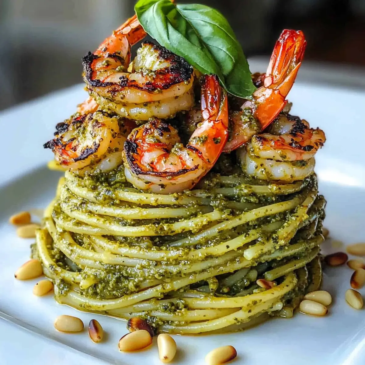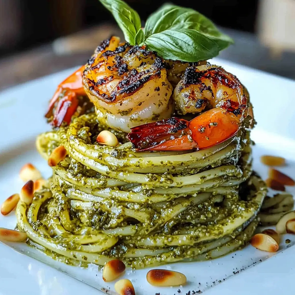 Facebook Twitter Pinterest LinkedInAs I was arranging a cozy dinner last week, I realized how a simple stack could elevate a meal from ordinary to extraordinary. Enter the Pesto Pasta and Grilled Shrimp Stack—an Italian-inspired delight that proves gourmet can be effortless! Picture tender pasta enveloped in vibrant basil pesto, topped with smoky, juicy shrimp; it’s a dish that effortlessly combines elegance with flavor. Perfect for quick weeknight dinners or special occasions, this recipe is not just visually stunning but also customizable for any palate, whether you prefer seafood, grilled veggies, or a comforting vegetarian option. Plus, the prep time is a breeze, making it a crowd-pleaser for those who love to cook—though you’ll certainly get the “wow” factor you crave! So, are you ready to stack some flavors and impress your guests? Let’s dive in! Why choose Pesto Pasta and Grilled Shrimp? Fresh, bold flavors: The combination of basil pesto and smoky shrimp creates an explosion of taste that will leave your taste buds dancing. Elegant presentation: Layering the pasta and shrimp into a stack not only impresses but elevates your dining experience to new heights. Quick to prepare: This dish can be whipped up in under 30 minutes, perfect for busy weeknights or last-minute gatherings with friends. Customizable: Whether you opt for grilled veggies, like in a savory Cajun Sausage Pasta, or swap out shrimp for chicken, this recipe can adapt to any dietary preference. Crowd-pleaser: With its vibrant colors and gourmet appeal, expect compliments from everyone at your table. Perfect for any occasion: From casual family dinners to more upscale gatherings, this dish shines brightly and meets almost every culinary need! Pesto Pasta and Grilled Shrimp Ingredients For the Pesto • Fresh Basil Leaves – The star of our pesto, giving that aromatic herb flavor you crave. • Pine Nuts – Adds a delightful crunch; feel free to substitute with walnuts or almonds if needed. • Garlic Cloves – Infuses the pesto with a delicious aromatic kick you won’t want to miss. • Parmesan Cheese – Essential for depth and richness; for a vegan option, consider nutritional yeast. • Olive Oil – A high-quality extra virgin olive oil will help create a smooth emulsion for the pesto. • Lemon Juice and Zest – Brightens the pesto flavors, making them pop beautifully! • Salt and Pepper – These simple seasonings are crucial for bringing out all the flavors. For the Pasta and Shrimp • Shrimp – Opt for medium to large (16-20 count per pound) for that smoky and juicy texture. • Pasta (linguine, fettuccine, or spaghetti) – Choose long shapes that stack easily; they’re perfect for the presentation! • Optional: Red Pepper Flakes – Spice things up if desired, giving the shrimp an extra kick! For Garnishing • Fresh Herbs – Adds a pop of color and freshness, making your dish even more delightful. • Toasted Pine Nuts – For that added crunch on top, enhancing both texture and flavor! Step‑by‑Step Instructions for Pesto Pasta and Grilled Shrimp Stack Step 1: Prepare the Pesto In a food processor, combine fresh basil leaves, pine nuts, garlic cloves, and Parmesan cheese. Pulse until coarsely chopped, then drizzle in high-quality olive oil while the machine runs, blending until smooth. Adjust the consistency with more olive oil if necessary, and finish with a squeeze of lemon juice, salt, and pepper to taste. This vibrant pesto will be the flavorful base for your Pesto Pasta and Grilled Shrimp Stack. Step 2: Cook the Pasta Bring a large pot of salted water to a boil over high heat. Add your choice of linguine, fettuccine, or spaghetti and cook according to package instructions until al dente, typically about 8-10 minutes. Reserve a cup of pasta water, then drain the pasta in a colander. Immediately toss the hot pasta with the prepared pesto, ensuring it’s evenly coated and vibrant green—this step is crucial for the ultimate flavor infusion! Step 3: Marinate the Shrimp While the pasta cooks, marinate the medium to large shrimp. In a bowl, combine olive oil, minced garlic, lemon zest, salt, and pepper. Toss the shrimp in this mixture and let them marinate for about 15 minutes. This step not only infuses the shrimp with flavor but also prepares them for grilling, crucial for your elegant Pesto Pasta and Grilled Shrimp Stack. Step 4: Grill the Shrimp Preheat your grill or grill pan over medium-high heat. Once hot, add the marinated shrimp in a single layer, cooking them for 2-3 minutes per side. They are done when they turn opaque and develop beautiful grill marks. Keep an eye on them to prevent overcooking; the goal is juicy, smoky shrimp that will elevate your stack! Step 5: Assemble the Stack To create the beautiful Pesto Pasta and Grilled Shrimp Stack, you can use a stacking ring or build it freeform. Start with a layer of pesto pasta, followed by a layer of grilled shrimp. Repeat the process to build height, finishing with shrimp on top. This will not only enhance the presentation but also create a delightful mix of flavors and textures in each bite. Step 6: Garnish and Serve To add the finishing touches, drizzle extra pesto over the top of the shrimp and sprinkle with toasted pine nuts for crunch. Garnish your stack with fresh herbs to elevate both the flavor and appearance. Serve immediately and enjoy the delicious, homemade essence of your Pesto Pasta and Grilled Shrimp Stack! How to Store and Freeze Pesto Pasta and Grilled Shrimp Stack Fridge: Store leftover Pesto Pasta and Grilled Shrimp Stack in an airtight container for up to 3 days. Keep the pasta and shrimp separate to maintain texture. Freezer: For long-term storage, freeze the pesto separately from the pasta and shrimp in airtight containers for up to 3 months. Reheating: When ready to enjoy again, thaw in the fridge overnight and reheat gently on the stovetop or in the microwave. Avoid overheating to maintain th