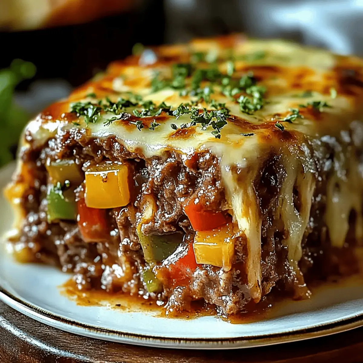 As I stood over the skillet, the aroma of sautéed bell peppers and onions enveloped me, instantly transporting me to a bustling corner of Philadelphia. But instead of a classic sandwich, I was about to create something innovative and comforting: Philly Cheesesteak Meatloaf. This heartwarming dish embodies all the savory goodness of a beloved cheesesteak—think tender beef, gooey provolone, and vibrant veggies—all packed into a juicy meatloaf. It’s not only a fantastic way to impress at the dinner table, but it’s also gluten-free adaptable, ensuring everyone can dive into this cheesy delight. Whether you’re nestled in your kitchen after a long day or prepping for a family feast, this recipe is your secret weapon for quick, flavorful meals. Ready to elevate your weeknight cooking with a taste of Philly? Let’s dive in! Why is this meatloaf so special? Comforting and hearty, this Philly Cheesesteak Meatloaf brings the beloved flavors of a cheesesteak to your dinner table. Easy to make, it requires minimal prep, making weeknight cooking a breeze! Flavor-packed with juicy beef, melty cheese, and sautéed veggies, this dish is bound to become a family favorite. Versatile enough to accommodate gluten-free diets, swap ingredients easily, like using turkey or the optional toppings of your choice. Plus, it’s an impressive meals that will make you the star of any gathering—ideal for serving alongside roasted vegetables or a crisp salad! Philly Cheesesteak Meatloaf Ingredients For the Meatloaf • Ground Beef – Provides the main protein and structure; for a lighter option, use ground turkey. • Breadcrumbs – Adds texture and binds the meatloaf together; substitute with gluten-free breadcrumbs for a gluten-free version. • Egg – Acts as a binder to hold the meatloaf together, ensuring it stays moist. • Milk – Moistens the mixture and adds richness for a tender bite. • Worcestershire Sauce – Enhances the savory flavor profile, evoking the essence of a Philly cheesesteak. • Garlic Powder – Adds depth and flavor to elevate every mouthful. • Salt – Essential for seasoning, balancing the flavors beautifully. • Black Pepper – Provides mild heat and seasoning, complementing the beef perfectly. For the Vegetables • Green Bell Pepper – Adds sweetness and texture; feel free to substitute with other bell peppers for a twist. • Onion – Contributes sweetness and flavor; you can use yellow or red onions for different nuances. • Olive Oil – For sautéing the vegetables, ensuring they’re soft and flavorful before mixing. For the Cheese • Provolone Cheese – Offers a creamy, gooey texture; for a different taste, substitute with mozzarella or Swiss cheese. For Garnish • Fresh Parsley (optional) – Adds a pop of color and freshness for a lovely finishing touch. Step‑by‑Step Instructions for Philly Cheesesteak Meatloaf Step 1: Preheat the Oven Begin by preheating your oven to 375°F (190°C). This ensures a properly cooked Philly Cheesesteak Meatloaf with a crispy top layer. While the oven heats, prepare the vegetables to maximize efficiency during your cooking process. Step 2: Sauté the Vegetables In a skillet, heat a drizzle of olive oil over medium heat. Once hot, add diced green bell peppers and onions, sautéing them for about 5 minutes. Stir frequently until they turn soft and fragrant, then set them aside to cool slightly before incorporating them into the meatloaf mixture. Step 3: Prepare the Meat Mixture In a large mixing bowl, combine the ground beef, breadcrumbs, egg, milk, Worcestershire sauce, garlic powder, salt, and black pepper. Use clean hands to gently mix until all ingredients are well incorporated, being careful not to overmix, which can lead to a tough meatloaf. Step 4: Layer the Meatloaf Base Press half of the meat mixture into the bottom of a greased loaf pan, creating an even layer. This will serve as the base for your flavorful Philly Cheesesteak Meatloaf, providing a sturdy foundation for the exciting fillings to come. Step 5: Add Cheese and Sautéed Vegetables Layer four slices of provolone cheese over the meat mixture in the loaf pan, ensuring even coverage. Next, add the sautéed bell peppers and onions on top of the cheese, allowing their robust flavors to meld into the meatloaf for a delicious surprise in every bite. Step 6: Seal the Meatloaf Carefully cover the cheese and vegetables with the remaining meat mixture, pressing down firmly to seal the edges and encapsulate the fillings. This step is essential to ensure the delicious cheesesteak flavors remain intact as it bakes. Step 7: Bake to Perfection Place the loaf pan in the preheated oven and bake for 45-50 minutes. The meatloaf is done when it reaches an internal temperature of 160°F (71°C), and the top is nicely browned. In the final 5 minutes, add remaining provolone cheese on top and return to the oven until melted. Step 8: Rest and Garnish Once baked, remove the Philly Cheesesteak Meatloaf from the oven and let it rest for 5-10 minutes. This resting time allows the juices to redistribute, making slicing easier. Optionally, garnish with fresh parsley for a pop of color before serving. Storage Tips for Philly Cheesesteak Meatloaf Fridge: Store leftovers in an airtight container for up to 4 days. Be sure to let the meatloaf cool completely before sealing it to maintain its delicious texture. Freezer: To enjoy later, slice the meatloaf and freeze individual portions in airtight containers or freezer bags for up to 2 months. Label them with the date for easy reference! Reheating: When ready to indulge again, reheat a slice in the microwave for 1-2 minutes or in the oven at 350°F (175°C) until warmed through, ensuring the flavors of the Philly Cheesesteak Meatloaf return to life. Thawing: For frozen slices, thaw them in the refrigerator overnight before reheating for best results. Enjoy the hearty comfort of this dish even after the initial meal! Philly Cheesesteak 