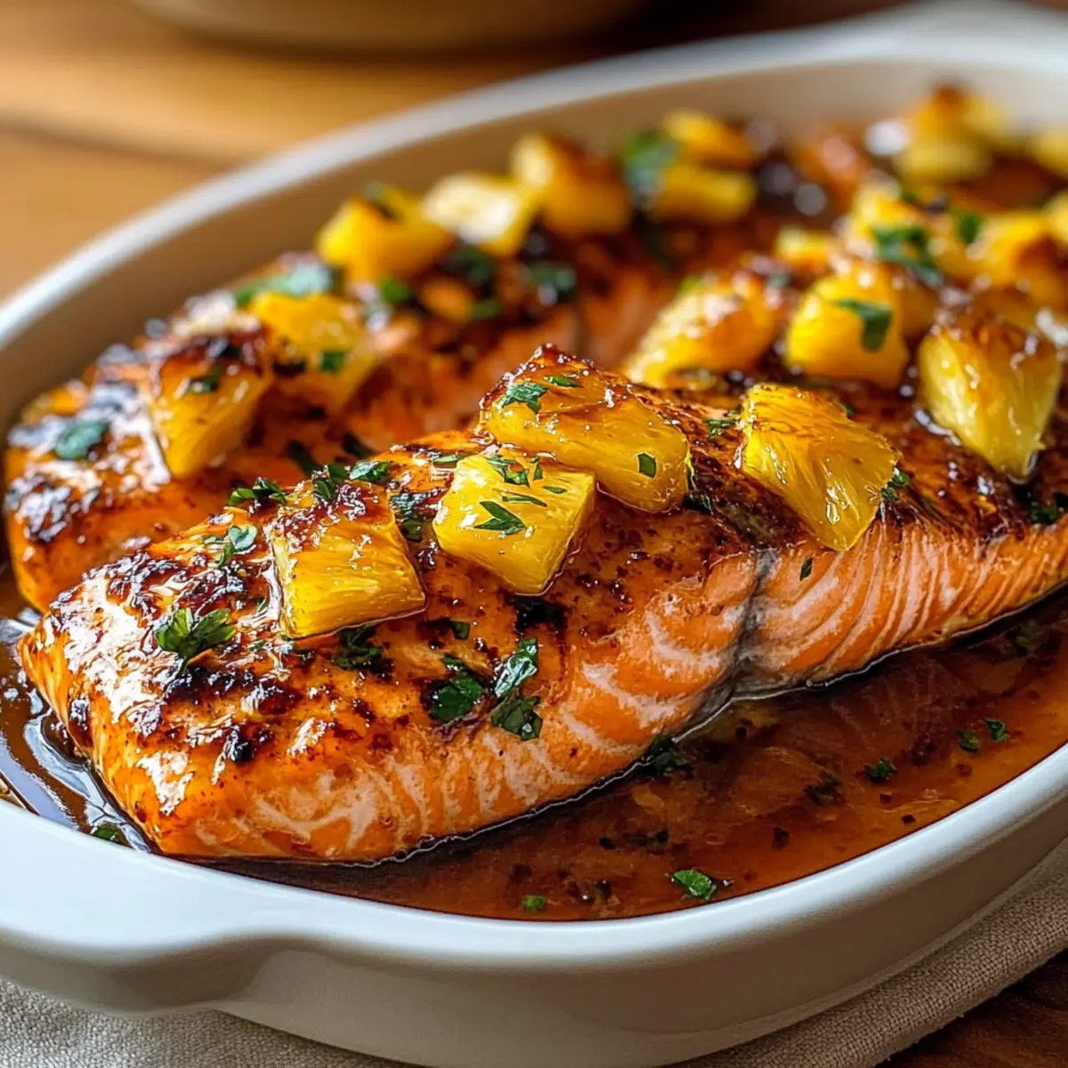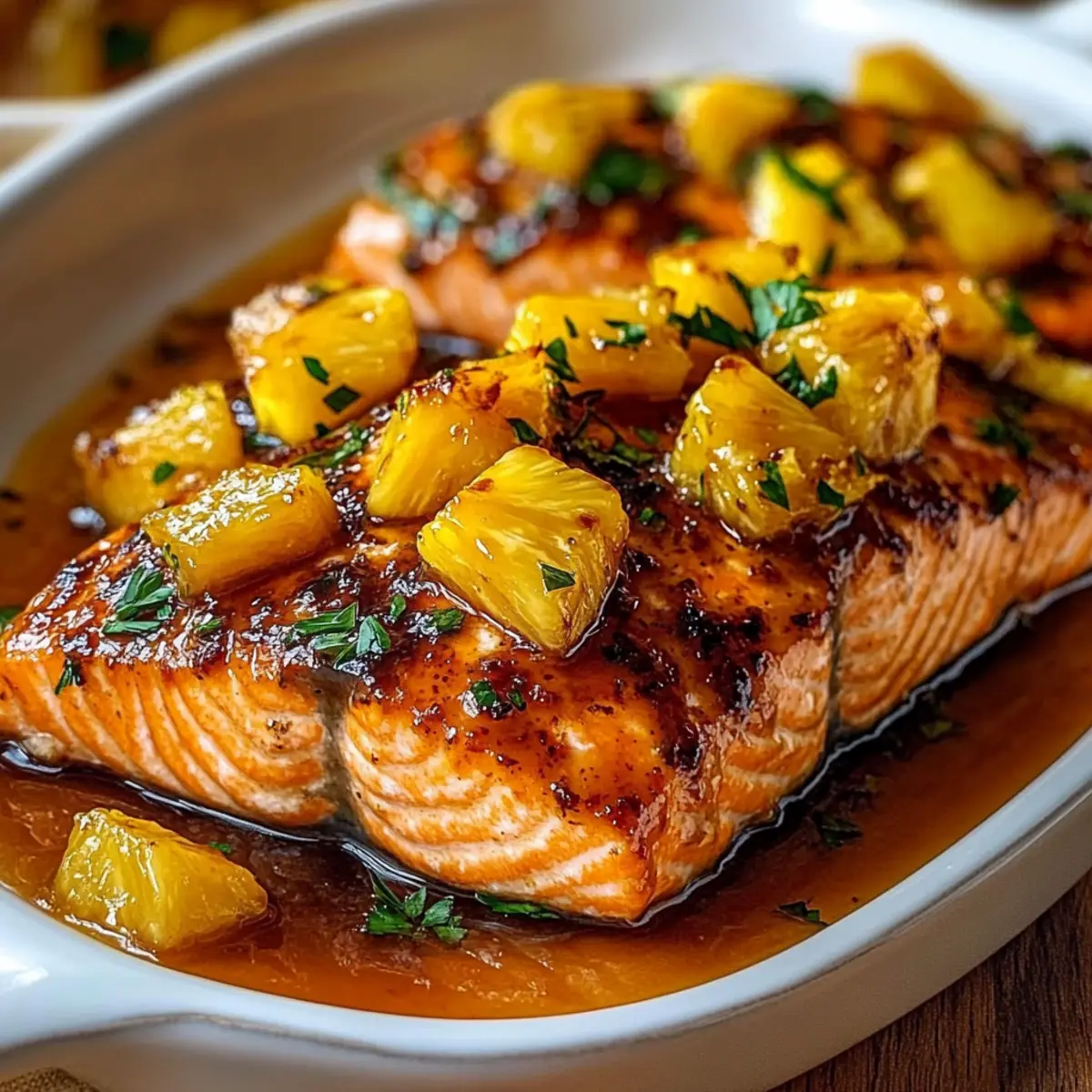 Facebook Twitter Pinterest LinkedIn“Have you ever experienced the delightful combination of sweet and savory that instantly transports you to a tropical paradise? That’s exactly what my Pineapple Glazed Salmon offers—an easy-to-make dish bursting with vibrant flavors. This recipe beckons home-chefs looking to elevate their weeknight dinners while being a crowd-pleaser for special occasions. With a mere handful of ingredients, you’ll whip up a juicy salmon fillet topped with a luscious glaze that caramelizes beautifully in the oven. What’s more, it’s gluten-free and packs a punch of bold Asian-inspired flavors, making it a versatile addition to your culinary repertoire. Curious about how to achieve this mouthwatering masterpiece? Let’s dive in!” Why is Pineapple Glazed Salmon a Must-Try? Flavor Explosion: The sweet pineapple glaze perfectly complements the savory depth of the salmon, offering a mouthwatering combination. Easy Preparation: This recipe is a breeze, requiring minimal ingredients and simple steps—perfect for busy weeknights or elegant gatherings. Gluten-Free Delight: Ideal for gluten-sensitive diners, this dish doesn’t sacrifice flavor while adhering to dietary needs. Versatile Pairings: Serve it with jasmine rice or a Pineapple Cucumber Salad for a balanced meal that impresses. Impressive Presentation: The gorgeous caramelized finish will have your guests thinking you’re a professional chef! This Pineapple Glazed Salmon is sure to become a beloved staple. Pineapple Glazed Salmon Ingredients For the Salmon • Salmon Fillets – Choose high-quality, wild-caught fillets for the best taste and texture. • Olive Oil – Helps achieve a perfect sear and prevents sticking during cooking. • Salt and Black Pepper – Essential seasonings to enhance the fresh flavor of the salmon. For the Glaze • Pineapple – Adds sweetness and moisture; you can use fresh pineapple or well-drained canned pineapple. • Light Brown Sugar – Provides sweetness and aids in caramelization for a beautifully glazed finish. • Soy Sauce – Packs a savory punch; make sure to select a gluten-free version if needed. • Rice Vinegar – Balances the sweetness of the glaze with a bright acidity; apple cider vinegar can be a good substitute. • Minced Garlic – Infuses the glaze with fragrant warmth, elevating the overall flavor. • Fresh Grated Ginger (optional) – Adds an aromatic depth to the glaze for a more complex flavor profile. For Garnish • Fresh Parsley – Adds a pop of color and freshness, enhancing the presentation of your dish. Enjoy preparing your Pineapple Glazed Salmon, and get ready to savor the deliciously sweet and savory flavors! Step‑by‑Step Instructions for Pineapple Glazed Salmon Step 1: Preheat and Prepare Start by preheating your oven to 400°F (200°C). While it warms, grease a baking dish with cooking spray or a drizzle of olive oil to prevent sticking. Preparing the dish in advance ensures that your Pineapple Glazed Salmon cooks evenly and comes out perfectly tender. Step 2: Whisk the Glaze In a small mixing bowl, whisk together light brown sugar, soy sauce, rice vinegar, minced garlic, and optional grated ginger until smooth. This creates a luscious glaze that will infuse your salmon with irresistible sweetness and savory flavor. Set aside about one-third of the glaze for later use—this will add an extra layer of flavor when serving. Step 3: Prepare the Salmon Pat the salmon fillets dry with paper towels to enhance texture and seasoning adhesion. Generously rub the skins with olive oil, then season with salt and freshly ground black pepper on both sides. This step is crucial for elevating the natural flavor of the salmon while ensuring a beautifully crisp finish. Step 4: Arrange and Glaze Once your salmon is prepped, place the fillets in the greased baking dish, skin-side down. Spoon two-thirds of the prepared glaze evenly over the salmon, allowing it to soak in and flavor the fillets as they bake. This step sets the stage for a deliciously glazed experience packed with tropical goodness. Step 5: Add Pineapple Now, chop the pineapple into small chunks and scatter them around the salmon in the baking dish. The pineapple will caramelize beautifully during baking, enhancing the glaze and creating a delightful contrast in texture. This adds both sweetness and a vibrant tropical flair to your Pineapple Glazed Salmon. Step 6: Bake to Perfection Transfer the baking dish to your preheated oven and bake for approximately 12-15 minutes. Keep a close eye on your salmon; it’s done when it flakes easily with a fork and reaches an internal temperature of 145°F (63°C). This is the perfect moment when the glaze thickens, and the salmon remains moist. Step 7: Optional Broil for Finish If you desire a caramelized touch to the glaze, switch your oven to broil and cook for an additional 1-2 minutes. Watch it closely to prevent burning, ensuring the glaze gets a beautiful golden brown finish that adds both flavor and visual appeal to your Pineapple Glazed Salmon. Step 8: Rest and Garnish Once your salmon is ready, remove it from the oven and let it rest for about 5 minutes. This allows the juices to redistribute for maximum tenderness. Finally, garnish with freshly chopped parsley and drizzle any reserved glaze over the top for an extra flavor boost, making your dish look as amazing as it tastes. Make Ahead Options These Pineapple Glazed Salmon fillets are fantastic for meal prep! You can prepare the glaze and marinate the salmon fillets up to 24 hours in advance, which allows the flavors to meld beautifully. Simply whisk together the glaze ingredients and coat the salmon, then cover and refrigerate it. When you’re ready to serve, follow the baking steps, ensuring the salmon is cooked to perfection in around 12-15 minutes. To maintain quality, avoid storing the salmon in the marinade for too long, as it can become overly salty. This simple prep lets you e