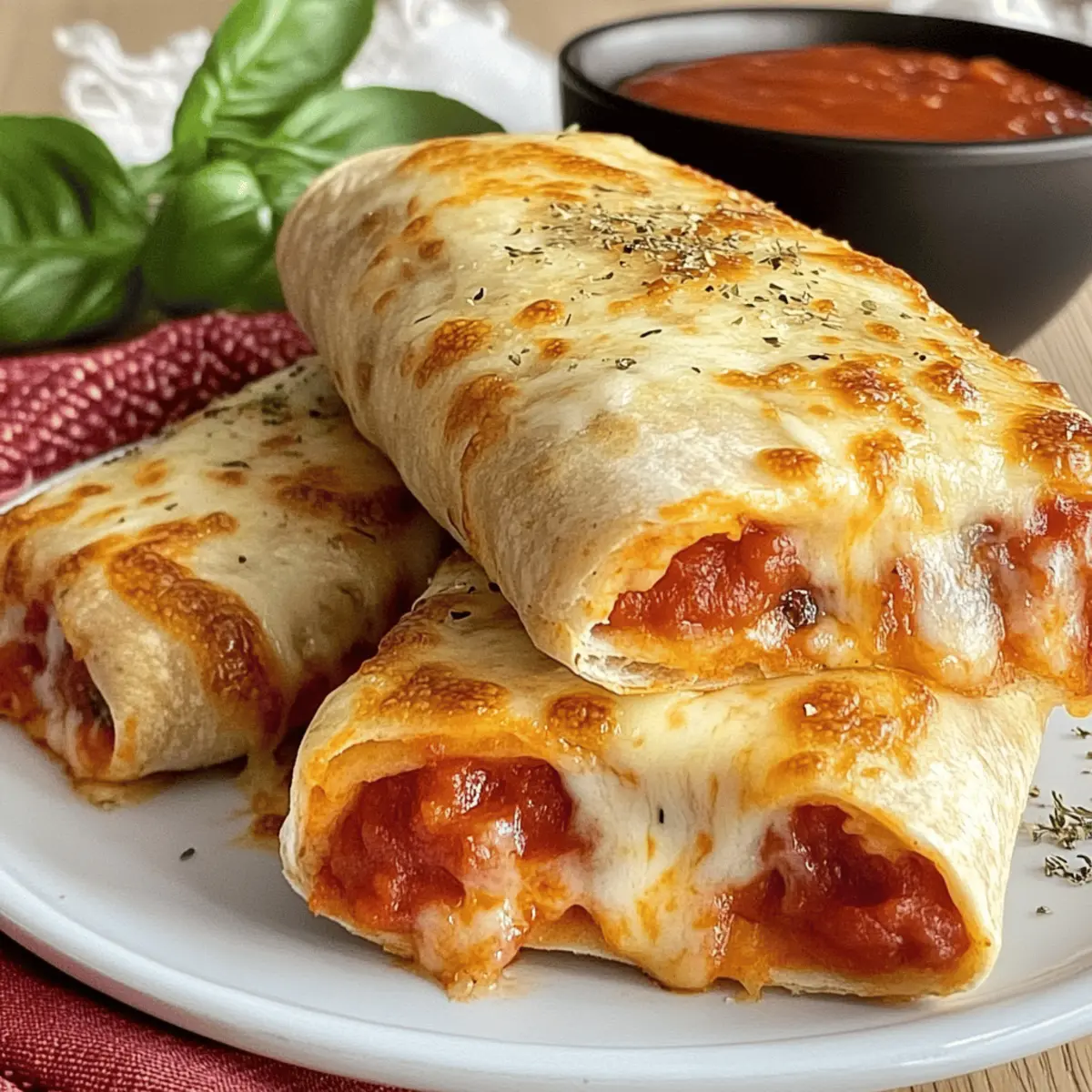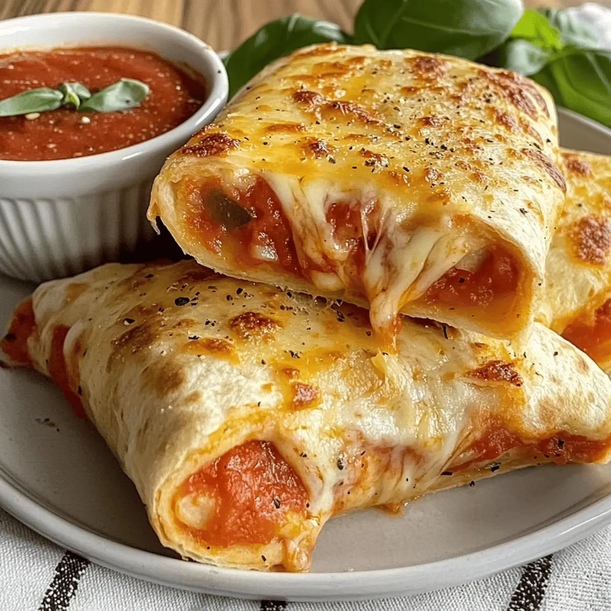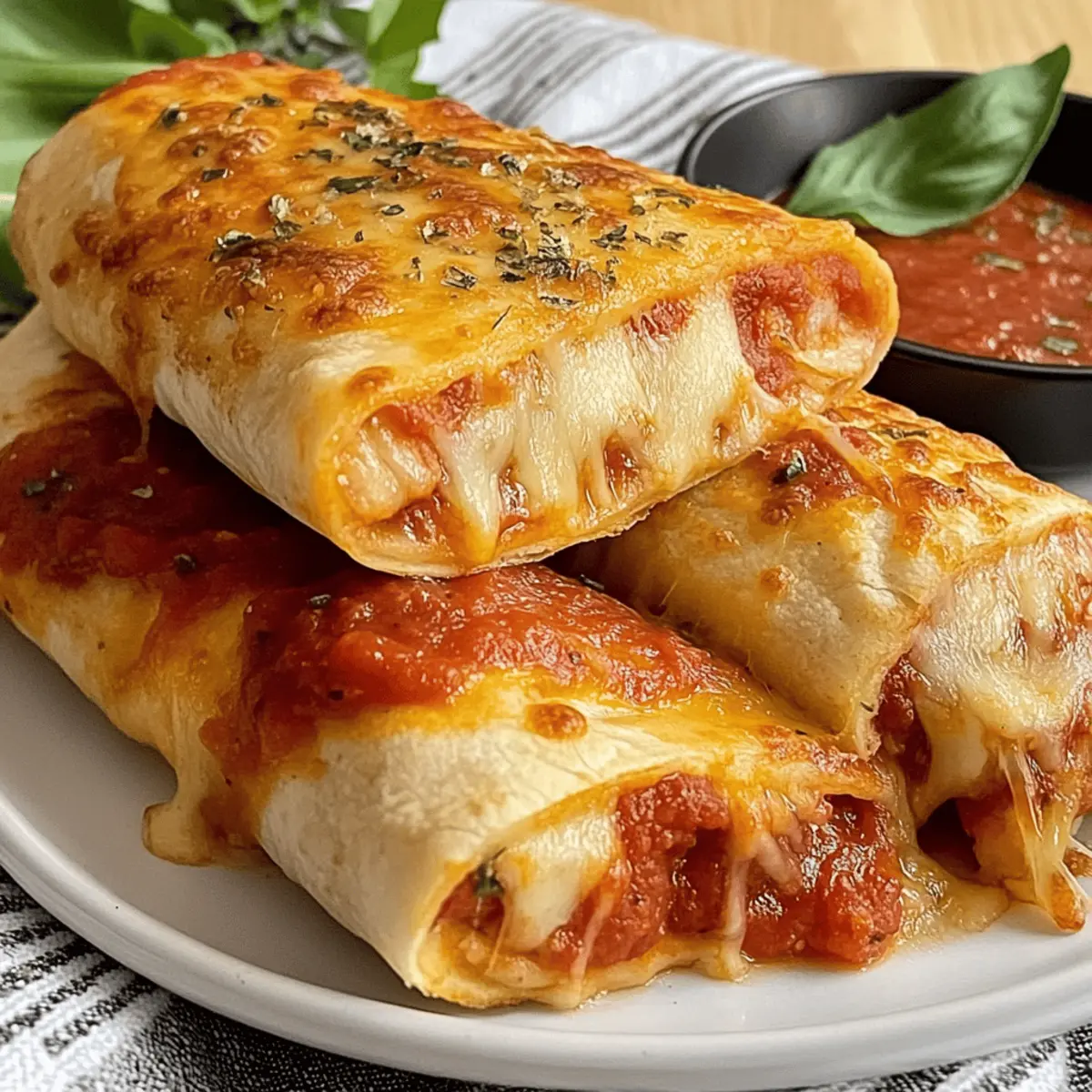Picture this: it’s a bustling weeknight, and the clock is ticking down to dinner time. As I rummage through the fridge, my eyes land on flour tortillas and a half-open jar of pizza sauce—an idea sparks instantly! Enter the delicious world of Pizza Burritos, where the comforting elements of pizza collide with the convenience of a burrito. This recipe is a total lifesaver, delivering an easy dinner idea that’s not just quick to whip up but also lets everyone embrace their creativity with customizable fillings. Whether you’re feeding a crowd or just your family, these Pizza Burritos offer a fun, kid-friendly meal that’s sure to please all ages. Are you ready to roll into some tasty adventures? Why Are Pizza Burritos a Family Favorite? Quick preparation: These Pizza Burritos can be assembled in just minutes, making them an excellent option for busy weeknights. Endless customization: Everyone can join in on the fun by choosing their favorite ingredients, from pepperoni to veggies. Kid-friendly appeal: The tasty combination of pizza and burrito makes it a hit with children, turning dinner into an exciting event. Crispy and gooey goodness: Get ready to indulge in a delightful bite that’s both crispy on the outside and ooey-gooey inside! Make-ahead magic: Prep these burritos in advance and store them in the fridge for easy baking later—perfect for any night! For more delicious meal ideas, check out my Pizza Pasta Bake or my tasty New York Pizza. Pizza Burritos Ingredients • Discover the magic of assembling easy, delicious Pizza Burritos! For the Burrito Wrap Flour Tortillas – Soft taco-size tortillas create the perfect wrap. Substitute with gluten-free tortillas if needed. For the Filling Pizza Sauce – A classic base adding mouthwatering flavor. You can use store-bought or homemade for a personal touch. Shredded Mozzarella Cheese – Provides that gooey texture everyone loves! Substitute with cheddar or a dairy-free alternative if preferred. Pepperoni Slices – A beloved topping that adds savory goodness. Feel free to swap with any protein or veggies, like sausage or mushrooms. For Coating Butter (Melted) – This enriches the flavor and ensures the burritos turn golden brown. Use olive oil for a lighter option. Garlic Powder – Boosts the savory depth; fresh minced garlic can amp up the flavor even more. Italian Seasoning – Complements the pizza vibes beautifully. You can skip it or merge oregano and basil if you don’t have it on hand. Salt – The essential flavor enhancer that brings all the ingredients alive. Sea salt or kosher salt works wonders. For Topping Shredded Parmesan – Optional but gives a delicious, crispy, salty finish to the burritos. It can be omitted or replaced with vegan cheese if desired. Step‑by‑Step Instructions for Pizza Burritos Step 1: Preheat the Oven Begin by preheating your oven to 375°F (190°C). If you’re using an air fryer, set it to the same temperature. This step is crucial for ensuring that your Pizza Burritos cook evenly and achieve that perfect golden-brown color. While the oven warms up, gather the rest of your ingredients to streamline the assembly process. Step 2: Prepare the Tortillas Lay out your flour tortillas on a clean surface or cutting board. Spread a generous layer of pizza sauce over each tortilla, leaving about an inch clear around the edges. Next, sprinkle a hearty layer of shredded mozzarella cheese across the sauce, followed by your preferred toppings such as pepperoni or veggies. Make sure to distribute the ingredients evenly to ensure each Pizza Burrito is filled with cheesy goodness. Step 3: Roll the Burritos Carefully fold the sides of the tortilla inwards over the filling, then begin to roll the tortilla from the bottom up, tucking in the ingredients as you go. Roll tightly to avoid any spills, and place the burrito seam-side down on a baking sheet lined with parchment paper. Repeat this process for each tortilla, and watch your Pizza Burritos come together quickly and deliciously! Step 4: Prepare the Coating In a small bowl, melt butter in the microwave or on the stove. Once melted, add garlic powder, Italian seasoning, and a pinch of salt, whisking until combined. This mixture enhances the flavor and promotes a crispy exterior. Brush the buttery mixture generously over the top of each Pizza Burrito, ensuring they’re well-coated for maximum flavor. Step 5: Add Parmesan Topping If desired, sprinkle shredded Parmesan cheese over the top of each burrito for an extra crispy finish. This step is optional but highly recommended for that luxurious touch! The Parmesan will melt and create a delightful crust during baking, elevating your Pizza Burritos to a new level of yumminess. Step 6: Bake the Burritos Place the baking sheet in the oven and bake for 12-15 minutes, or until the burritos are golden and crispy. If using an air fryer, arrange the burritos in a single layer and cook for about 7 minutes, checking periodically for doneness. You’ll know they’re ready when they emit a delicious aroma and the tops are beautifully browned. Step 7: Cool and Serve Once out of the oven, let the Pizza Burritos cool for about 5 minutes—this helps the cheese set a bit. Serve them alongside pizza sauce or ranch dressing for dipping. This quick and easy meal is perfect for family dinners, so get ready to dive into these warm, gooey delights! Pizza Burritos Variations & Substitutions Feel free to let your culinary creativity shine and customize these Pizza Burritos to your heart’s content! Dairy-Free: Use a dairy-free cheese alternative and replace butter with olive oil for a lighter choice. Many great brands offer plant-based options without sacrificing creaminess! Spicy Kick: Add crushed red pepper flakes or diced jalapeños into the filling for an exciting heat boost. It’s a fantastic way to turn up the flavor and surprise your taste buds! Veggie Delight: Swap the pepperoni for an array of vegetables like bell 