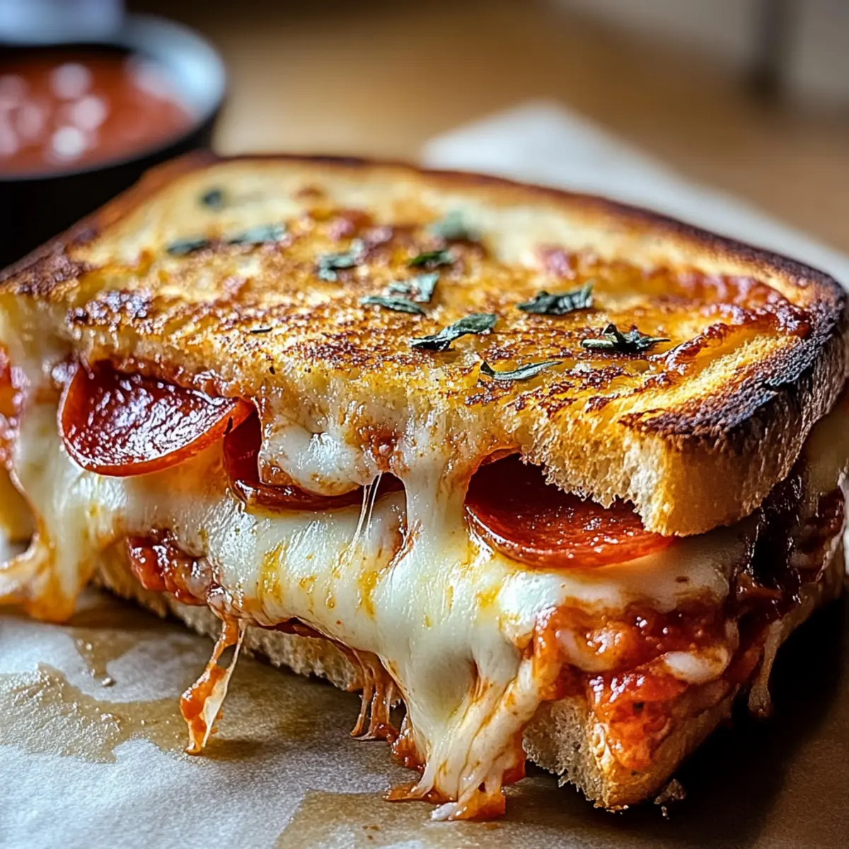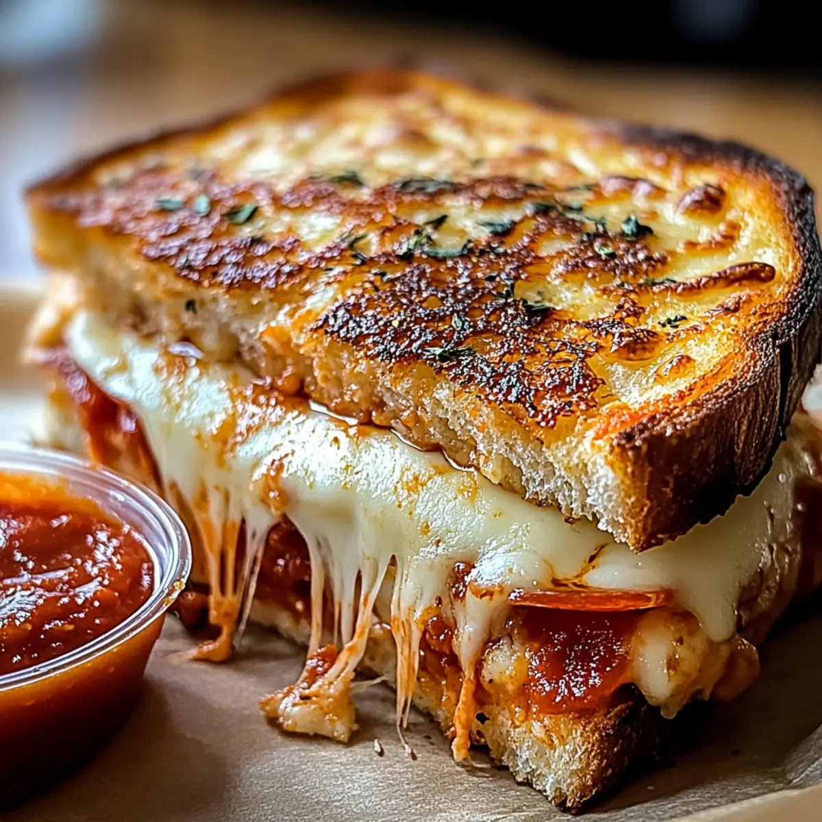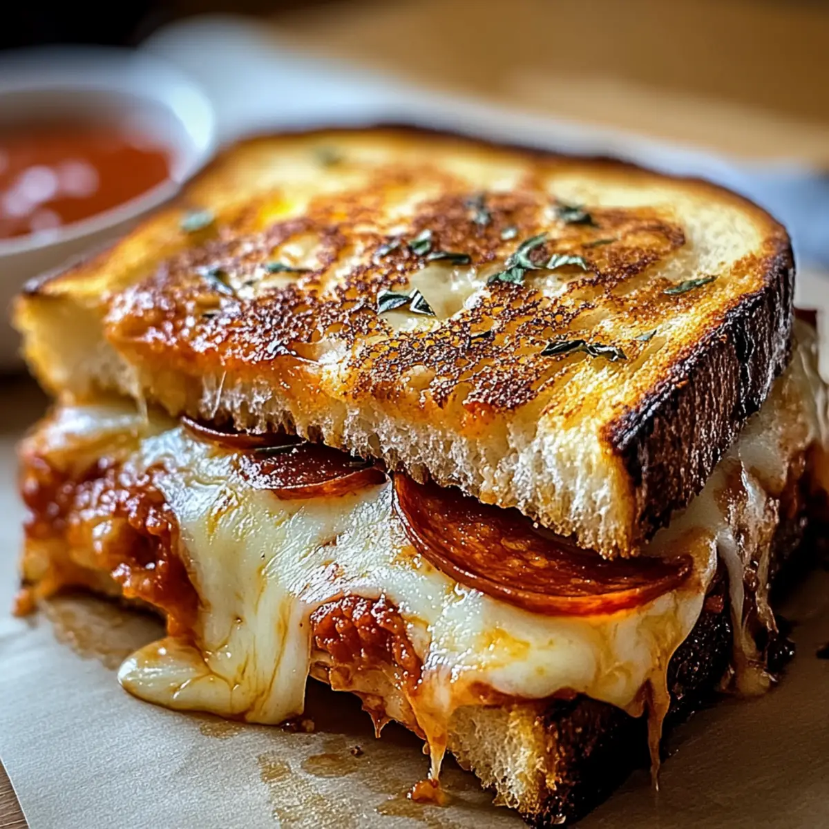 Facebook Twitter Pinterest LinkedInAs I stood in my kitchen, the irresistible scent of buttery bread and melted cheese started to waft through the air, igniting a craving for my favorite comfort food: Pizza Grilled Cheese. This dish brings together the nostalgia of childhood meals with a gourmet twist, allowing you to customize every layer of flavor to suit your taste buds. Ready in just 10 minutes, it’s a quick meal that should satisfy even the pickiest eaters in the family. Whether enjoyed for lunch, dinner, or an indulgent midnight snack, this fusion of flavors guarantees smiles all around. What creative toppings will you choose for your next cheesy masterpiece? Why is This Recipe a Must-Try? Quick Preparation: You can whip up this Pizza Grilled Cheese in just 10 minutes, making it a lifesaver for busy weeknights! Customizable Options: Feel free to pile on your favorite toppings, such as different cheeses or veggies, to make it uniquely yours. Consider using fresh basil from your garden or experimenting with ingredients like mushrooms or olives, as you might in a delightful Pizza Pasta Bake. Ultimate Comfort Food: Each bite combines a crispy, buttery crust with melty cheese and savory marinara, providing the perfect comfort food fix for any craving. Family-Friendly Appeal: Everyone in the family will adore this dish, whether they love classic flavors or are looking for something new! Effortless Cleanup: With just one skillet to wash, you can enjoy the delicious result without the hassle of a messy kitchen. Dive into this simple yet extraordinary recipe, and don’t forget to enjoy it with a side of Chicken Mac Cheese for a complete meal! Pizza Grilled Cheese Ingredients For the Sandwich • 4 slices of bread – The base for your delicious Pizza Grilled Cheese; feel free to substitute with sourdough, white, or whole wheat for different flavors. • 2 tbsp butter – Adds a rich, buttery flavor and helps achieve that golden, crispy crust; olive oil is a great health-conscious substitute. • ½ cup marinara or pizza sauce – Infuses the sandwich with that classic pizza flavor; opt for homemade or a high-quality store-bought version for the best taste. • 1 cup shredded mozzarella cheese – This melty cheese is a must-have for the ooey-gooey texture; try part-skim mozzarella for a lighter option. • ¼ cup grated Parmesan cheese – Adds a delightful complexity to the flavor; it’s optional, but highly recommended for that extra kick. • 12 slices of turkey pepperoni – Brings in classic pepperoni flavor and protein; for a vegetarian twist, consider using other proteins or veggies. • ½ tsp garlic powder – Elevates flavor; fresh minced garlic can be a delightful substitute if you prefer a punchier taste. • ½ tsp Italian seasoning – Adds delicious herby notes that complement the pizza vibe perfectly. • 2 tbsp chopped fresh basil (optional) – Freshens up your grilled cheese with vibrant color and flavor; omit if you don’t have it on hand. Indulge in this amazing Pizza Grilled Cheese, and don’t hesitate to get creative with your toppings for a truly customizable experience! Step‑by‑Step Instructions for Pizza Grilled Cheese Step 1: Prepare Bread Begin by buttering one side of each slice of bread, ensuring an even layer to promote a golden crust. Sprinkle garlic powder and Italian seasoning generously on the buttered sides for added flavor. This step is crucial for elevating your Pizza Grilled Cheese, as the spices will meld beautifully when cooked. Step 2: Assemble Sandwich On two slices of bread, place them buttered side down and generously spread marinara sauce on the inner side, making sure to cover the surface. Next, layer with a good amount of shredded mozzarella and sprinkle grated Parmesan cheese for that extra depth of flavor. Top with turkey pepperoni and any other toppings you desire, then cover with the remaining slices, ensuring the buttered side faces up. Step 3: Cook Heat a skillet over medium-low heat and carefully place your assembled Pizza Grilled Cheese sandwiches in the pan. Cook for about 3-4 minutes on each side, pressing down gently with a spatula until the bread is golden brown and crispy. Watch for the cheese to start oozing out, indicating it’s melting perfectly. Step 4: Serve Once cooked, let the sandwiches cool for a minute before slicing them in half for a beautiful presentation. Garnish with freshly chopped basil, if using, for a pop of color and flavor. Serve your Pizza Grilled Cheese with additional marinara on the side for dipping, making each bite an utterly satisfying experience. Make Ahead Options These Pizza Grilled Cheese sandwiches are perfect for meal prep, allowing you to enjoy comfort food on busy weeknights! You can assemble the sandwiches up to 24 hours in advance by preparing them through Step 2 and then covering them tightly with plastic wrap in the fridge to prevent drying out. When ready to cook, simply follow Step 3, ensuring medium-low heat for the best results. If you have leftovers, store them in an airtight container in the fridge for up to 3 days or freeze individually wrapped sandwiches for up to a month. Just reheat in a skillet or oven, and they’ll be just as delicious! Expert Tips for Pizza Grilled Cheese Perfect Heat: Maintain medium-low heat while cooking to ensure the bread gets crispy without burning before the cheese melts. Sauce Control: Use a thin layer of marinara sauce to prevent sogginess; keeping cheese closest to the bread helps maintain structure. Veggie Prep: Pre-cook any vegetables you want to add to your Pizza Grilled Cheese. This removes excess moisture, preventing a soggy sandwich. What to Serve with Pizza Grilled Cheese Looking to elevate your Pizza Grilled Cheese into a full meal that delights the senses? Crispy Green Salad: The freshness of a light salad balances the richness of the sandwich, adding a crunch that complements the gooey cheese. Garlic Breadsticks: These add a comfo