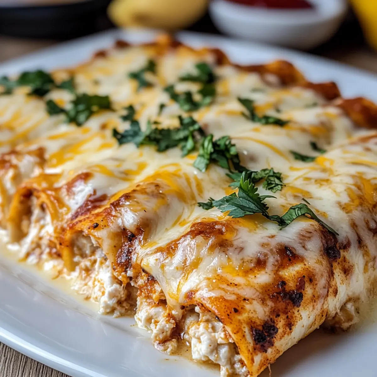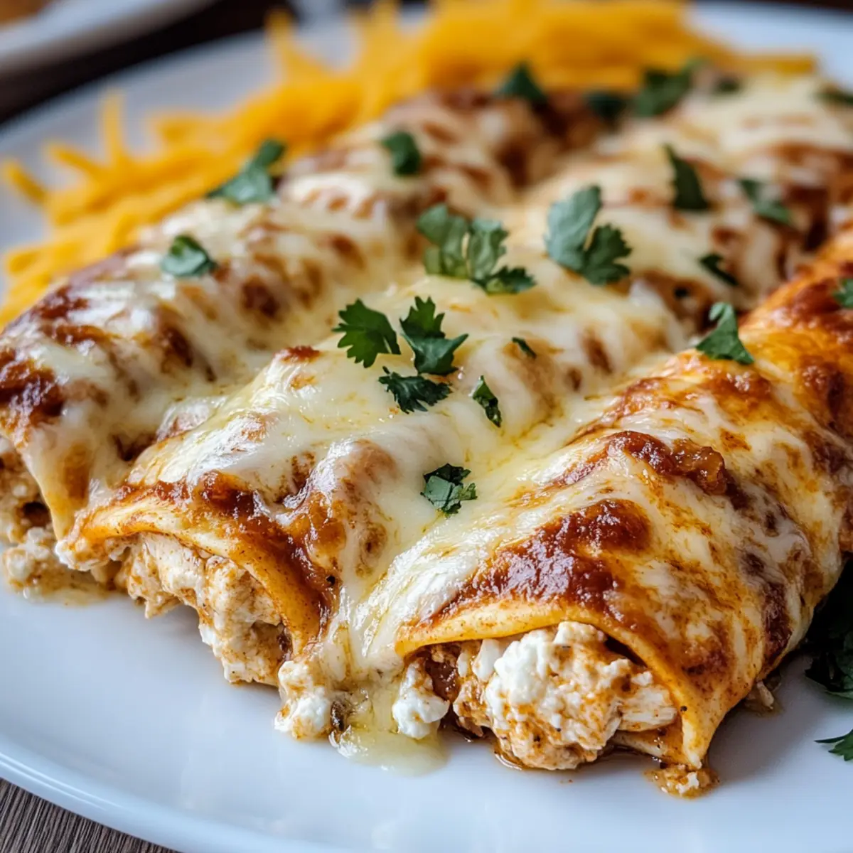 Facebook Twitter Pinterest LinkedInThe aroma of enchiladas wafting through the kitchen instantly transports me to my happy place, where flavorful dishes wrap around hearty ingredients. Today, I’m excited to introduce my Protein Cottage Cheese Chicken Enchiladas, a low-carb gem that beautifully marries creamy cottage cheese with tender shredded chicken, all enveloped in a zesty enchilada sauce. What sets this dish apart is not only its delightful taste but also the fact that it’s an absolute breeze to prepare—a true lifesaver for those busy weeknights or as a make-ahead meal prep option. As you dive into this delicious recipe, you’ll appreciate how it caters to both flavor and nutrition, making it perfect for anyone looking to embrace a wholesome culinary lifestyle. Curious about the secret to making these enchiladas a family favorite? Let’s get cooking! Why Choose Protein Cottage Cheese Enchiladas? Flavorful: Bursting with rich, zesty flavors, these enchiladas offer a satisfying taste that will wow your taste buds. Nutritious: With each bite, enjoy a high-protein, low-carb meal that aligns perfectly with your health goals. Quick Prep: This recipe is a breeze to make, ideal for busy evenings or meal prep sessions. Versatile: Feel free to customize the filling with veggies or spices to cater to your family’s preference—try adding green chilies for an extra kick! Crowd-Pleaser: These enchiladas are sure to impress family and friends, making any gathering a hit. Plus, they pair wonderfully with fresh avocado slices or your favorite salsa. Give them a try today, and discover why they’ll become a staple in your weekly menu! Protein Cottage Cheese Chicken Enchiladas Ingredients For the Filling • Shredded Chicken – Adds protein and texture; you can use rotisserie chicken for a quick option. • Cottage Cheese – Provides creaminess while increasing protein content; opt for full-fat for a richer filling. • Garlic Powder – Enhances overall flavor; fresh garlic can be a more vibrant substitute. • Onion Powder – Adds sweetness and depth; fresh onions can be used, but remember to adjust cooking time. • Salt – Balances the flavors; sea salt or kosher salt can be great alternatives. • Pepper – Offers seasoning; use black, white, or crushed red pepper depending on your preferred spice level. For Assembly • Low-Carb Tortillas – These hold the filling well; if avoiding grains, zucchini slices can serve as a fresh alternative. • Enchilada Sauce – Acts as moisture and infuses flavor; feel free to use homemade or store-bought for convenience. • Shredded Cheese – Provides a gooey finish; consider swapping it for mozzarella or pepper jack for a flavor twist. Step‑by‑Step Instructions for Protein Cottage Cheese Chicken Enchiladas Step 1: Mix the Filling In a large mixing bowl, combine the shredded chicken, cottage cheese, garlic powder, onion powder, salt, and pepper. Stir until all ingredients are well integrated, creating a flavorful and creamy filling. Ensure the cottage cheese is evenly mixed throughout for a consistent texture. This should take about 2-3 minutes of vigorous mixing before proceeding to the next step. Step 2: Prepare Baking Dish Preheat your oven to 375°F (190°C). While the oven warms up, take a 9×13 inch baking dish and spread a thin layer of enchilada sauce at the bottom. This will help prevent the enchiladas from sticking and add moisture during baking. Aim for a smooth, even coating that covers the base of the dish. Step 3: Assemble Enchiladas Place a low-carb tortilla on a flat surface, then spoon a generous amount of the chicken and cottage cheese filling down the center. Roll the tortilla tightly, ensuring the filling is securely enclosed, and lay it seam-side down in the prepared baking dish. Repeat this process until all filling is used, arranging the rolled enchiladas neatly in a single layer. Step 4: Add Sauce and Cheese Once all enchiladas are in the baking dish, pour the remaining enchilada sauce evenly over the top, ensuring each enchilada is generously coated. Next, sprinkle a generous amount of shredded cheese over the sauce, creating a deliciously gooey topping. Take a moment to adjust the cheese as desired for extra stretchiness or flavor variations. Step 5: Bake Place the baking dish in the preheated oven and bake the Protein Cottage Cheese Chicken Enchiladas for 25-30 minutes. Keep an eye on them; they are ready when the cheese is melted, bubbly, and lightly golden. The enchiladas should be heated thoroughly, and the aroma should fill your kitchen, signaling they’re almost ready to enjoy! Protein Cottage Cheese Chicken Enchiladas Variations Feel free to explore these variations to make the recipe uniquely yours—each twist brings a delightful twist to the plate! Vegetarian Swap: Replace shredded chicken with black beans or lentils for a satisfying vegetarian option. This keeps the protein high while embracing plant-based goodness. Extra Spice: Add chopped jalapeños or a splash of your favorite hot sauce into the filling. Zing up your enchiladas with an added kick that spice lovers will adore! Zucchini Layers: For a grain-free alternative, swap low-carb tortillas for thinly sliced zucchini. Just bake them until tender for a fresh taste that’s a bit lighter. Fresh Herbs: Mix in some chopped cilantro or parsley to your filling. The bright flavors from the herbs add a refreshing finish that complements the richness of the cottage cheese. Cheesy Delight: Consider varying the cheese topping—think smoked gouda or sharp cheddar for a different flavor profile. It’s a simple change that can elevate your enchiladas to new heights! Savory Addition: Diced bell peppers or spinach can be folded into the filling for extra nutrition. These veggies not only enhance the dish’s color but also provide a nutritious crunch. Saucy Variation: Try using a spicier enchilada sauce or even a mole sauce for a unique twist. The rich fl