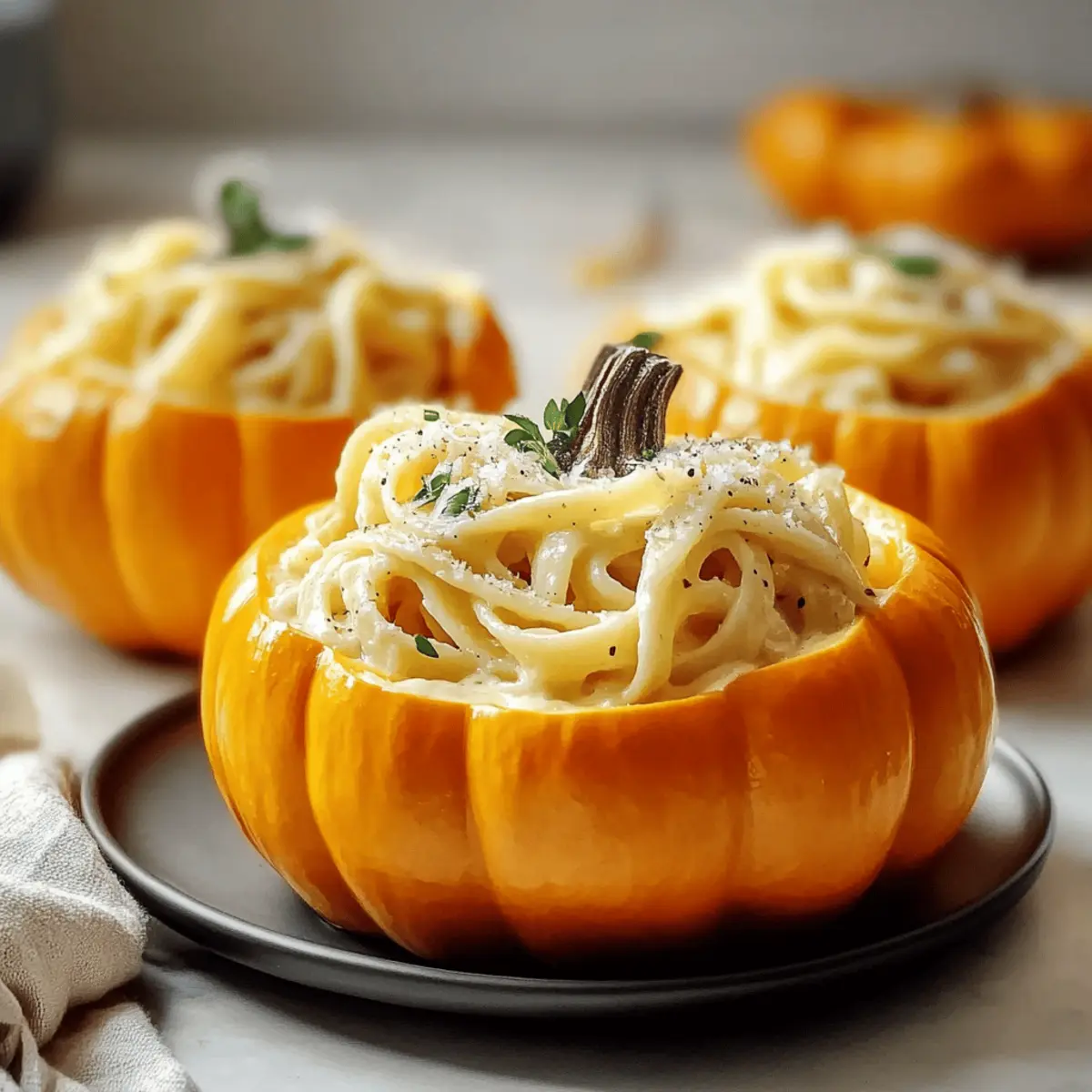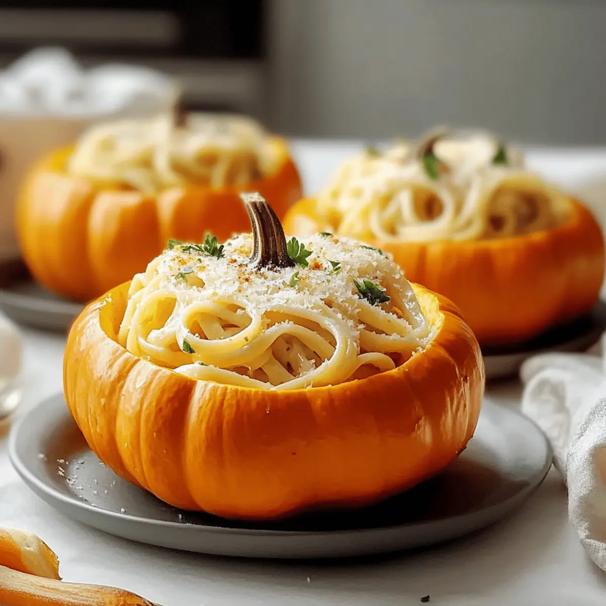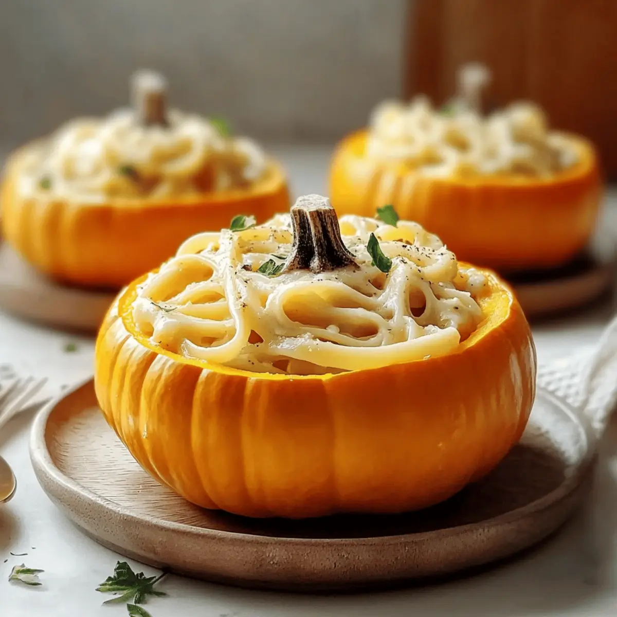 As the crisp autumn air creeps in and leaves start to flutter to the ground, there’s something magical about warming up with a comforting dish that embraces the season. Enter Pumpkin Alfredo Pasta Cauldrons—a delightful blend of creamy, garlicky Alfredo sauce enveloping tender fettuccine, all tucked away in charming roasted mini pumpkins. Not only does this recipe serve as a whimsical centerpiece for your fall gatherings, but it also presents an easy option for those looking to swap out fast food for something homemade and nourishing. Plus, it offers the bonus of being vegetarian-friendly and can easily adapt to gluten-free or vegan diets without sacrificing flavor. Curious to learn how to whip up these delicious little cauldrons? Let’s dive into the recipe that will fill your kitchen with cozy, fall-inspired vibes! Why Make Pumpkin Alfredo Pasta Cauldrons? Comforting, perfect for chilly nights, these Pumpkin Alfredo Pasta Cauldrons encapsulate cozy flavors for a delightful meal. Unique presentation transforms a classic dish into an eye-catching centerpiece ideal for gatherings or a simple dinner. Versatile options abound, allowing for gluten-free and vegan variations, ensuring everyone at the table can enjoy. Quick and easy: prep the pumpkins ahead, allowing you to savor the evening without stress. Plus, the combination of creamy Alfredo and sweet roasted pumpkin is simply irresistible! If you’re looking for other fall-inspired meals, check out my Cajun Sausage Pasta or One Pot Pasta for varied flavors that won’t disappoint! Pumpkin Alfredo Pasta Cauldrons Ingredients • Dive into the delightful world of Pumpkin Alfredo Pasta Cauldrons with these essential ingredients! For the Cauldrons Mini Pumpkins – Jack Be Little or sweet dumpling pumpkins work best for serving delicious pasta. Olive Oil – Use to coat and roast the pumpkins, enhancing their natural sweetness. Salt and Pepper – Essential seasonings that elevate the flavors of each ingredient. For the Pasta Alfredo Fettuccine or Spaghetti (12 ounces) – The perfect base for this dish; opt for gluten-free pasta if needed. Butter (2 tablespoons) – Adds a rich, creamy base to the Alfredo sauce. Garlic (3 cloves, minced) – Infuses the sauce with fragrant, savory notes. Heavy Cream (1 ½ cups) – Creates that luscious Alfredo texture; can be substituted with plant-based cream for vegan options. Parmesan Cheese (1 cup, freshly grated) – Provides a creamy, umami flavor; vegetarian Parmesan can suit non-dairy diets. Optional: Nutmeg (pinch) – A warm spice that adds depth to the sauce’s flavor. For the Toppings Chopped Parsley – Fresh garnish that adds color and a burst of herbal flavor. Pumpkin Seeds (Pepitas) – Crunchy texture that adds a delightful contrast to the creamy pasta. Extra Grated Parmesan – A final flourish that enhances the richness of your dish. With these ingredients in hand, you’re well on your way to crafting your own stunning Pumpkin Alfredo Pasta Cauldrons that will impress friends and family alike! Step‑by‑Step Instructions for Pumpkin Alfredo Pasta Cauldrons Step 1: Preheat the Oven Begin by preheating your oven to 375°F (190°C). This temperature is perfect for roasting the mini pumpkins to a tender perfection. While the oven heats up, line a baking sheet with parchment paper, which will make for easy cleanup later. Step 2: Prepare the Mini Pumpkins With a sharp knife, carefully cut off the tops of the mini pumpkins, creating a “lid.” Use a spoon to scoop out the seeds and any stringy flesh inside. Set the prepared pumpkins aside, ensuring they can stand upright. Their bright orange hue will set the stage for your Pumpkin Alfredo Pasta Cauldrons. Step 3: Season the Pumpkins Brush the insides of the pumpkins generously with olive oil, enhancing their natural sweetness as they roast. Then, sprinkle with a pinch of salt and pepper to elevate their flavor. As you coat the pumpkins, imagine the delightful contrast of creamy fettuccine against the tender roasted shells. Step 4: Roast the Pumpkins Place the pumpkins cut-side up on your baking sheet and roast them in the preheated oven for 25–30 minutes. Keep an eye on them; they’re done when they’re tender yet firm enough to hold their shape—just the right texture for holding the delectable Pumpkin Alfredo pasta. Step 5: Cook the Pasta While the pumpkins are roasting, bring a large pot of salted water to a boil. Cook your fettuccine or spaghetti according to package instructions until al dente. Once cooked, drain the pasta and set it aside. The pasta will soon be enveloped in a creamy, dreamy Alfredo sauce. Step 6: Sauté the Garlic In a saucepan over medium heat, melt the butter until it begins to foam, then add the minced garlic. Sauté for about 1 to 2 minutes until fragrant but not browned, as this will maintain that lovely, fresh garlic flavor. This aromatic step is crucial for infusing the Alfredo sauce with richness. Step 7: Make the Alfredo Sauce Pour in the heavy cream and stir well, allowing it to warm through. Gradually add the freshly grated Parmesan cheese, stirring continuously until it’s fully melted and the sauce thickens slightly. Season with salt, pepper, and a pinch of nutmeg, if desired; the sauce should glisten and coat the back of a spoon beautifully. Step 8: Combine Pasta and Sauce Add the drained pasta to the Alfredo sauce, gently tossing until every strand is luxuriously coated. This is where the magic happens, as the Pumpkin Alfredo Pasta Cauldrons start to take on their creamy personality. Taste the mixture and adjust the seasoning if necessary. Step 9: Fill the Pumpkins Carefully remove the roasted pumpkins from the oven and begin filling them with the Alfredo-coated pasta. Twirl the pasta into nests as you fill each pumpkin, creating an inviting display. Get creative with the presentation, ensuring each cauldron bursts with deliciousness. Step 10: Add the Finishing Touches To enhance your Pump