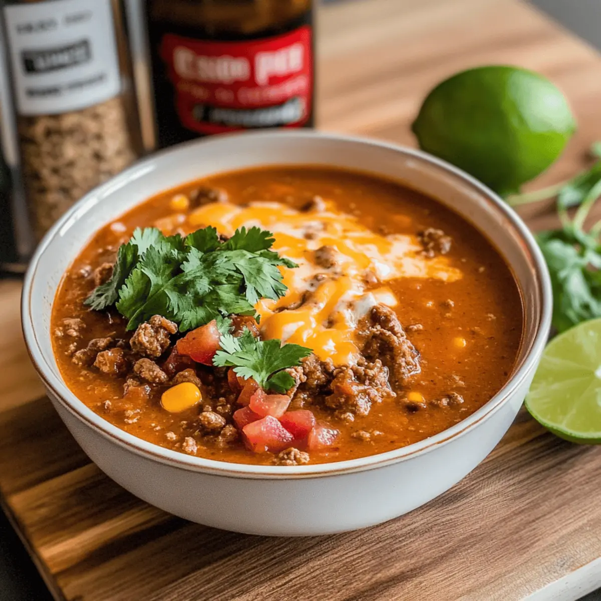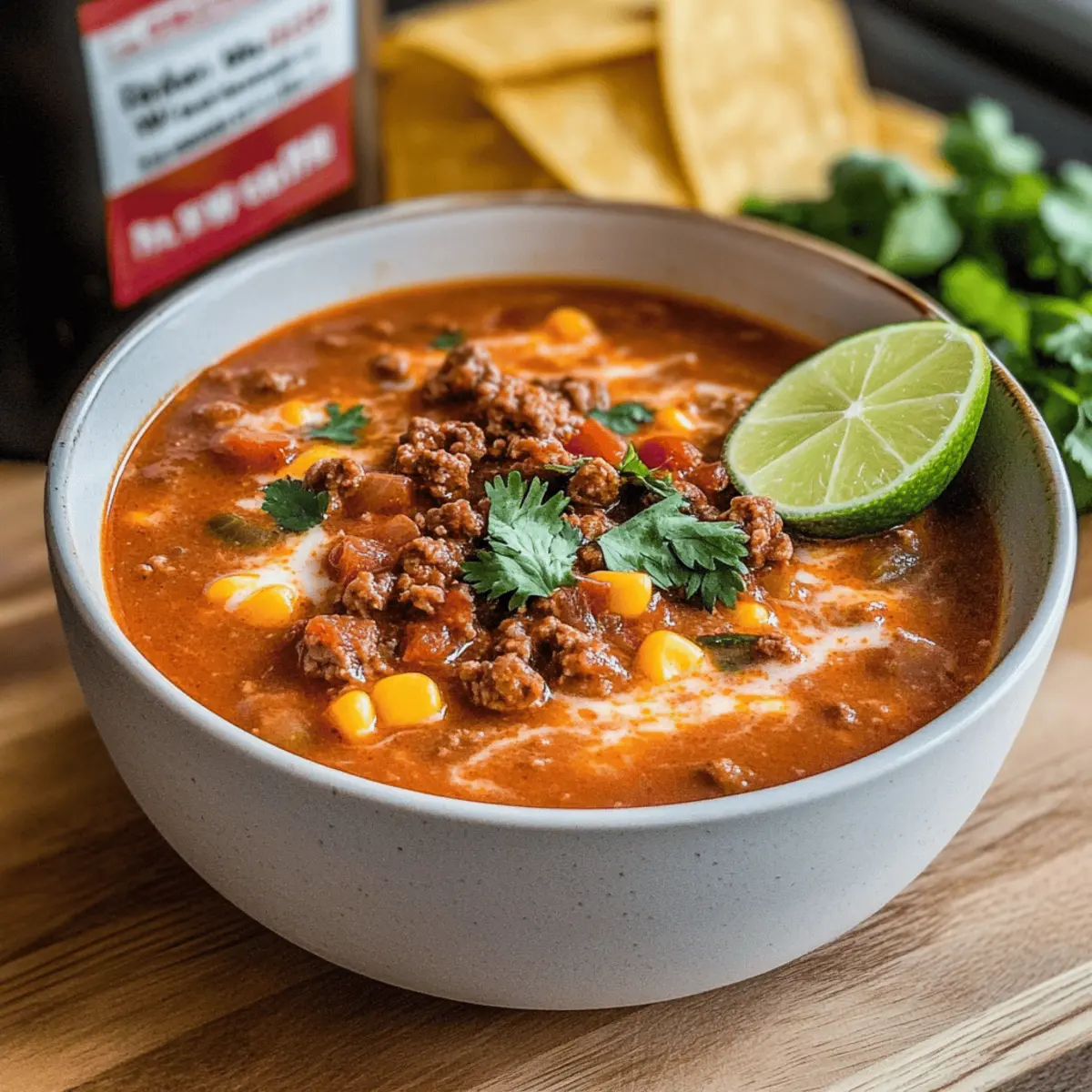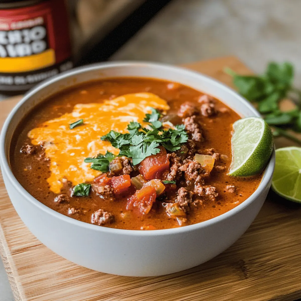 Late one night, I found myself staring blankly at the cupboard, wondering what to whip up for dinner. Fast food felt uninspiring, and I craved something warm and comforting. That’s when the idea for my Tasty Queso Keto Taco Soup struck me—a dish that transforms rich beef, creamy cheese, and bold taco flavors into a cozy meal. Perfect for busy weeknights or quiet evenings, this recipe ticks all the boxes: it’s low-carb, gluten-free, and ready in just about 40 minutes! With minimal prep time, you can enjoy a hearty bowl of comfort without sacrificing your dietary goals. How does a velvety, cheesy soup that’s bursting with taco goodness sound tonight? Let’s dive in! Why is this soup a weeknight favorite? Quick to Prepare: With just 40 minutes from start to finish, this soup fits seamlessly into your busy routine. Rich and Creamy: The blend of cream cheese and heavy cream creates a luxurious texture that feels indulgent yet is totally guilt-free! Flavor Explosion: Bursting with bold taco spices, every spoonful delivers a hearty taste that will please even the pickiest of eaters. Versatile Options: Easily adapt this recipe by swapping in ground turkey or adding extra veggies like zucchini for a personalized touch. For more comforting meals, check out my Cowboy Soup Hearty and Parmesan Italian Soup recipes! Crowd-Pleaser: Ideal for families or gatherings, everyone will love this low-carb delight! Queso Keto Taco Soup Ingredients • Discover the perfect blend for a cozy bowl! For the Soup Base Ground Beef – A hearty protein that adds a rich flavor; swap for ground turkey or chicken for a lighter dish. Diced Onion – Brings sweetness and depth; shallots make a great alternative if desired. Cream Cheese – Creates a creamy base that’s essential in this Queso Keto Taco Soup; Neufchâtel cheese offers a lighter option. Diced Tomatoes with Green Chilies – Provides a burst of flavor and a mild heat; regular diced tomatoes can be used for less spice. Beef Broth – Enhances the savory taste; use vegetable broth for a different flavor twist. Heavy Cream – Gives the soup its rich and velvety texture; opt for half-and-half or plant-based cream for a lighter alternative. Garlic Powder – Elevates the flavor profile with depth; fresh minced garlic can intensify the taste. Taco Seasoning – Infuses the soup with those classic taco flavors; feel free to use homemade seasoning for a personal touch. Salt & Pepper – Essential for bringing all the flavors together; adjust to taste. Optional Garnishes Shredded Cheese – Adds an extra layer of creaminess; cheddar or Mexican blend works wonders. Sour Cream – Provides a tangy contrast to the rich soup; Greek yogurt is a great alternative for a lighter option. Jalapeños – For those who like a little heat; fresh or pickled add an amazing kick. Guacamole – Perfect for a creamy topping that complements the flavors; can use store-bought or homemade. Cilantro – Fresh cilantro brightens up the dish; parsley can be substituted if you prefer a milder herb. Step‑by‑Step Instructions for Queso Keto Taco Soup Step 1: Brown the Meat Begin by heating a large pot over medium heat. Add the ground beef and diced onion, cooking for about 8-10 minutes. Stir frequently to break the meat into smaller pieces, ensuring it browns evenly. The beef should turn a rich brown color while the onion becomes translucent, releasing its sweet aroma. Step 2: Incorporate Cream Cheese Once the beef is browned, drain any excess grease from the pot. Add the softened cream cheese to the meat mixture, stirring continuously until it melts and fully integrates into the soup base. The mix should become creamy, giving the Queso Keto Taco Soup its luxurious texture. Step 3: Add the Tomatoes and Broth Next, mix in the diced tomatoes with green chilies, beef broth, heavy cream, garlic powder, and taco seasoning. Stir well to combine all the ingredients thoroughly, allowing the flavors to meld together. The soup should take on a vibrant color and a rich smell, hinting at the deliciousness to come. Step 4: Let It Simmer Reduce the heat to low, cover the pot, and let the soup simmer for about 30 minutes. Stir occasionally to prevent sticking and ensure even cooking. The Queso Keto Taco Soup will thicken slightly and the ingredients will marry beautifully, creating a comforting dish. Step 5: Season to Taste After 30 minutes, taste the soup and adjust the seasoning with salt and pepper as needed. This final step enhances the bold flavors of your Queso Keto Taco Soup, ensuring it’s perfectly tailored to your palate. Step 6: Serve and Garnish Ladle the warm, creamy soup into bowls, and feel free to garnish with your choice of shredded cheese, sour cream, jalapeños, guacamole, or fresh cilantro. These optional toppings add delicious depth and personalization, making each bowl of Queso Keto Taco Soup even more delightful. How to Store and Freeze Queso Keto Taco Soup Fridge: Store any leftover Queso Keto Taco Soup in an airtight container for up to 4 days to maintain freshness and flavor. Freezer: For long-term storage, freeze the soup in portioned airtight containers for up to 3 months. Ensure it’s cooled completely before freezing to avoid ice crystals. Thawing: When ready to enjoy, thaw the soup overnight in the fridge and reheat gently on the stovetop or in the microwave. Stir occasionally for even heating. Reheating: Add a splash of beef broth or heavy cream during reheating to restore creaminess as the soup may thicken upon cooling. Expert Tips for Queso Keto Taco Soup Choose Quality Meat: Opt for lean ground beef or turkey to keep the soup low-carb and healthy; avoid fatty cuts that can make the soup greasy. Fresh vs. Canned Tomatoes: When using fresh tomatoes, remember to increase your spice levels to enhance flavor, replicating the richness provided by canned diced tomatoes with green chilies. Perfect Consistency: To achieve the desired thickness in your Queso Keto Taco 