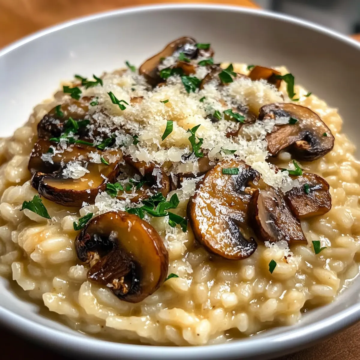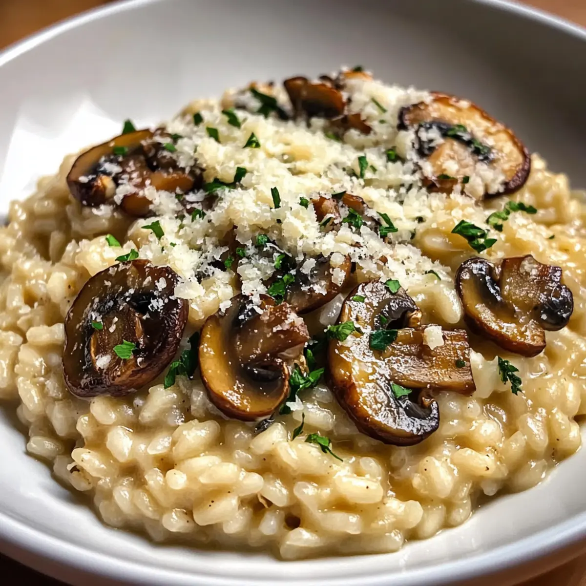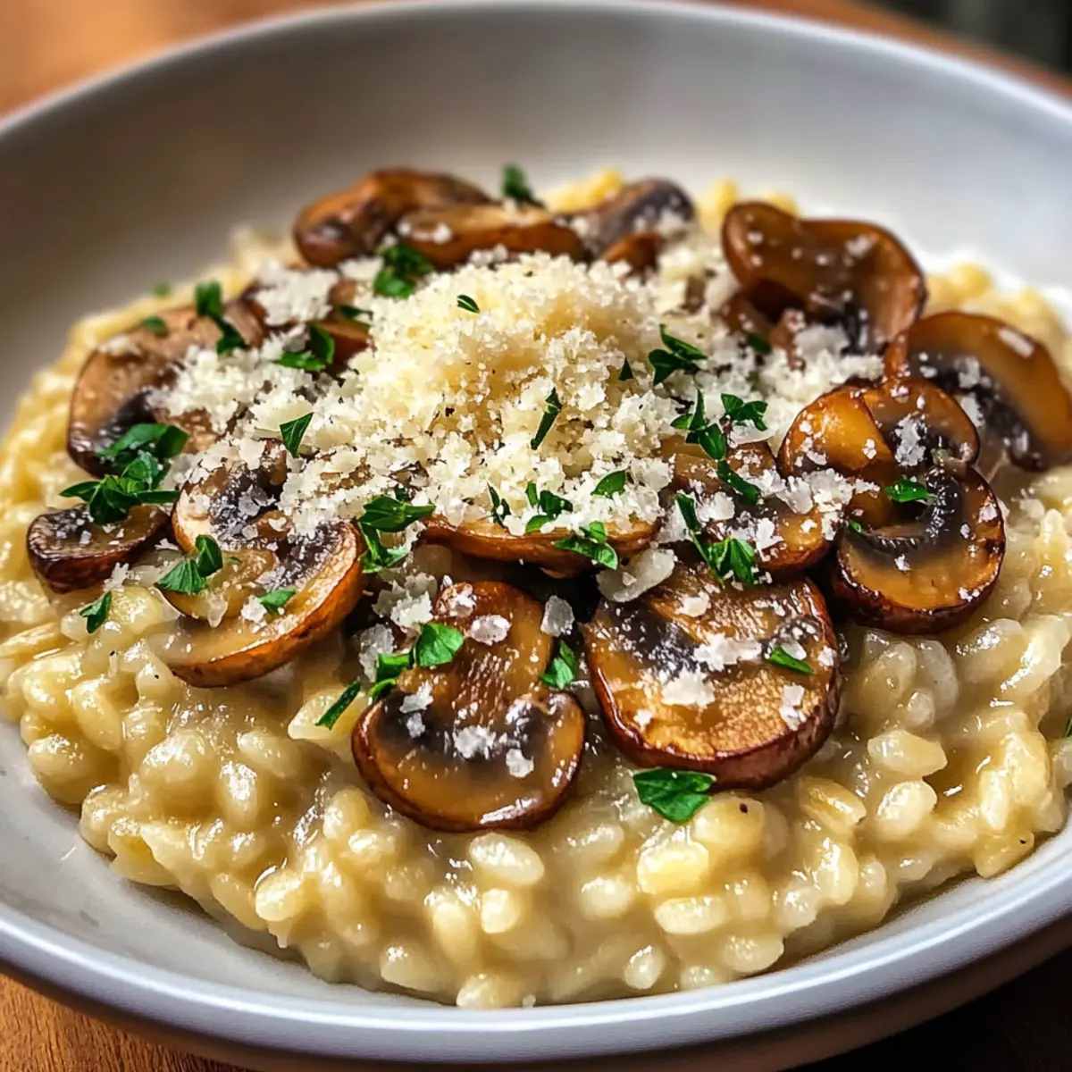 Facebook Twitter Pinterest LinkedInStepping into my kitchen, I’m greeted by the earthy aroma of sautéed mushrooms mingling with the rich, comforting scent of simmering Arborio rice. Today, I’m excited to share my go-to recipe for Creamy Risotto with Sautéed Mushrooms and Parmesan. This dish is not only a warm embrace on a chilly evening but also a culinary canvas that perfectly showcases seasonal vegetables. The beauty of this risotto lies in its adaptability—whether you’re cooking for a weeknight dinner or an elegant gathering, it’s sure to impress. Plus, it’s a one-pot wonder, making cleanup a breeze! With just a few simple ingredients, you can create a plateful of creamy perfection that feels indulgent yet manageable. Ready to elevate your kitchen skills and dive into this Italian classic? Let’s get started! Why is Risotto Mushrooms so Special? Comforting, Cozy Meal: There’s something incredibly soothing about a warm bowl of risotto. Savory Flavor: The combination of sautéed mushrooms and creamy Arborio rice creates a depth of flavor that’s hard to resist. Endless Variations: Feel free to add seasonal vegetables or herbs for a personalized twist! One-Pot Wonder: Cooking it all in one pot saves time and fuss, making it perfect for busy evenings. Crowd-Pleasing Appeal: Whether it’s a family dinner or hosting friends, this dish never fails to impress, ensuring every plate is wiped clean. Dive deeper into the versatility of risotto with my simple variations. Risotto Mushrooms Ingredients Dive into the goodness of risotto mushrooms with these essential ingredients! For the Risotto Olive Oil – Essential fat for sautéing mushrooms; you can substitute with canola or vegetable oil for a neutral taste. Butter – Adds richness and enhances flavor; use extra olive oil for a dairy-free version. Mushrooms (any variety) – Provides savory depth and umami; shitake or cremini mushrooms work especially well. Onion – Base flavor for the risotto; make sure to chop it finely for even cooking. Garlic – Infuses aromatic flavor; adding minced or roasted garlic can give a milder taste. Arborio Rice – The key to that creamy texture unique to risotto; do not substitute with regular rice as it won’t yield the same results. Dry White Wine – Enhances flavor and adds acidity; if avoiding alcohol, use additional broth. Vegetable Broth – Provides moisture and flavor; chicken broth can be used for a non-vegetarian twist. Parmesan Cheese – Adds creaminess and umami; nutritional yeast is a great option for a vegan dish. Salt and Pepper – Essential for seasoning to taste, ensuring the flavors are balanced. Embrace the warm, inviting essence of risotto mushrooms as you gather these wonderful ingredients! Step‑by‑Step Instructions for Creamy Risotto with Sautéed Mushrooms Step 1: Sauté the Mushrooms In a large skillet, heat 2 tablespoons of olive oil and 1 tablespoon of butter over medium heat. Once shimmering, add your sliced mushrooms, stirring occasionally for about 6–8 minutes until they turn golden brown and their moisture evaporates. Keep an eye on them; they should become tender and fragrant. Once done, transfer the mushrooms to a plate and set aside. Step 2: Cook the Aromatics In the same skillet, add the chopped onion, cooking for about 3 minutes until it becomes translucent and softens. Stir in the minced garlic and sauté for an additional minute, allowing the mixture to become aromatic. This fragrant base is essential for your risotto mushrooms, imparting rich flavors that will enhance the dish. Step 3: Toast the Rice Stir in 1 cup of Arborio rice, ensuring each grain is coated in the flavorful oil, and cook for about 2 minutes. You’ll notice the edges of the rice grains becoming slightly translucent, which is a good sign. This step helps to toast the rice, preparing it for that creamy texture we’re aiming for in our risotto. Step 4: Add the Wine Pour in ½ cup of dry white wine, stirring continuously until the liquid is mostly absorbed, about 2-3 minutes. The wine will add depth to the risotto, enhancing its flavor profile. Keep stirring, allowing the rice to soak up the wine before moving on to the next step for the best risotto mushrooms experience. Step 5: Gradually Add Broth Now, gradually add warm vegetable broth, one ladle at a time, stirring frequently. After each addition, wait until the broth is nearly absorbed before adding more, which should take about 18-20 minutes total. Continue this process until the risotto is creamy and the rice is al dente, achieving that perfect consistency that makes risotto so comforting. Step 6: Finish with Mushrooms and Cheese Once the risotto reaches that creamy texture, fold in the sautéed mushrooms, the remaining tablespoon of butter, and ½ cup of grated Parmesan cheese. Stir well to incorporate everything and season with salt and pepper to taste. Allow this to cook for another 2 minutes, creating a harmonious blend of flavors and a decadent finish to your risotto mushrooms. Step 7: Serve and Enjoy Remove the skillet from heat and serve the risotto immediately. It can be garnished with additional Parmesan cheese and freshly chopped parsley if desired. Each bowl should overflow with creamy, savory goodness that highlights the delightful sautéed mushrooms. Your Creamy Risotto with Sautéed Mushrooms is now ready to bring warmth and joy to your dinner table! Make Ahead Options Creamy Risotto with Sautéed Mushrooms is a fantastic choice for busy weeknights, allowing you to prep components in advance for easier meal planning. You can sauté the mushrooms and refrigerate them for up to 3 days—just store them in an airtight container to preserve their texture and flavor. Additionally, you can pre-chop the onion and garlic, storing them together to save time on cooking day. When you’re ready to enjoy your risotto, simply follow the cooking instructions, adding your prepped ingredients into the warm broth, and sti