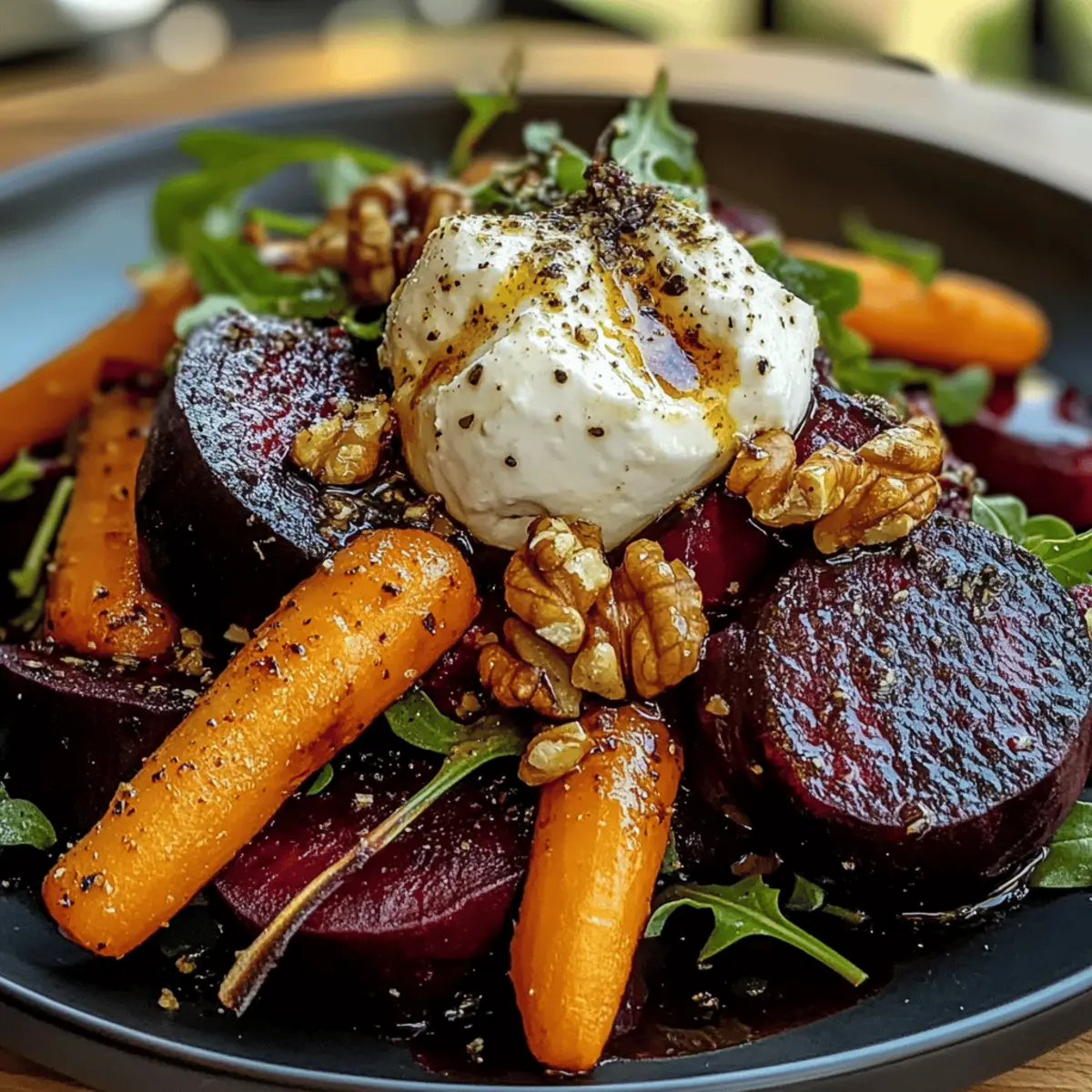 Once the roasted vegetables are perfectly tender, remove them from the oven and let them cool for a few moments. Layer the warm beets and carrots on top of the greens, creating a vibrant display. Gently place a ball of burrata in the center for a creamy finish, enhancing the flavors of the Roasted Beets and Carrots Salad with Burrata.