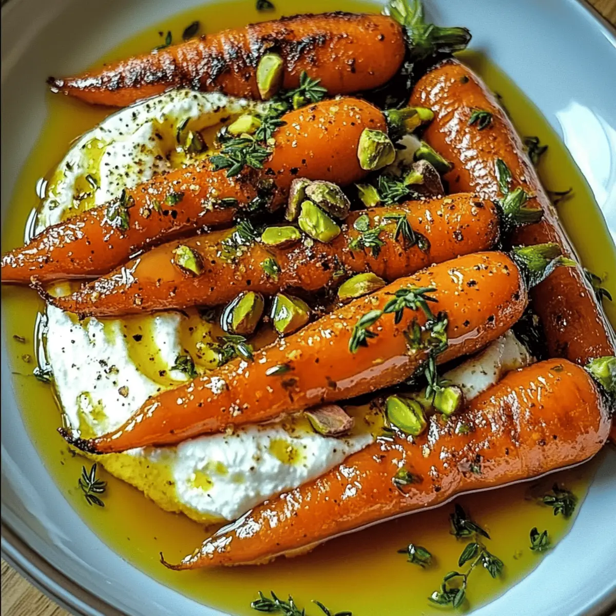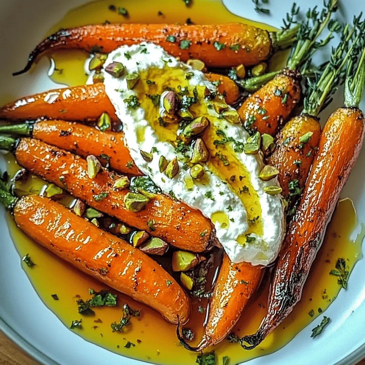 Finish your elegant dish by scattering chopped pistachios and fresh thyme leaves across the top. For added color and freshness, consider adding parsley if desired. Serve your stunning Roasted Carrots with Whipped Ricotta and Hot Honey warm, and watch as your guests are wowed by the vibrant flavors and beautiful presentation.
