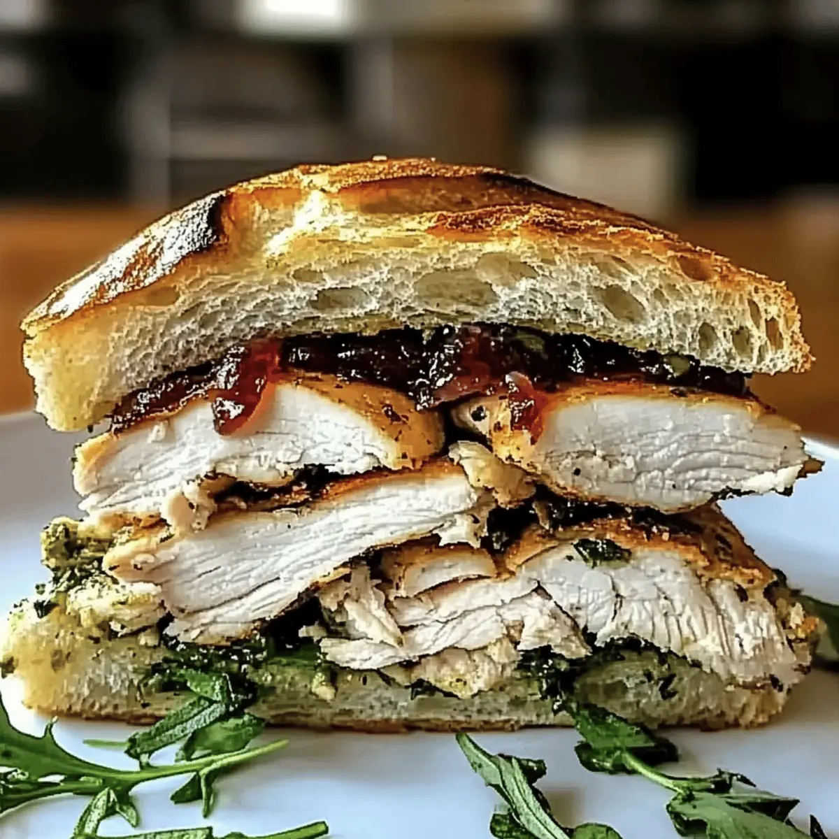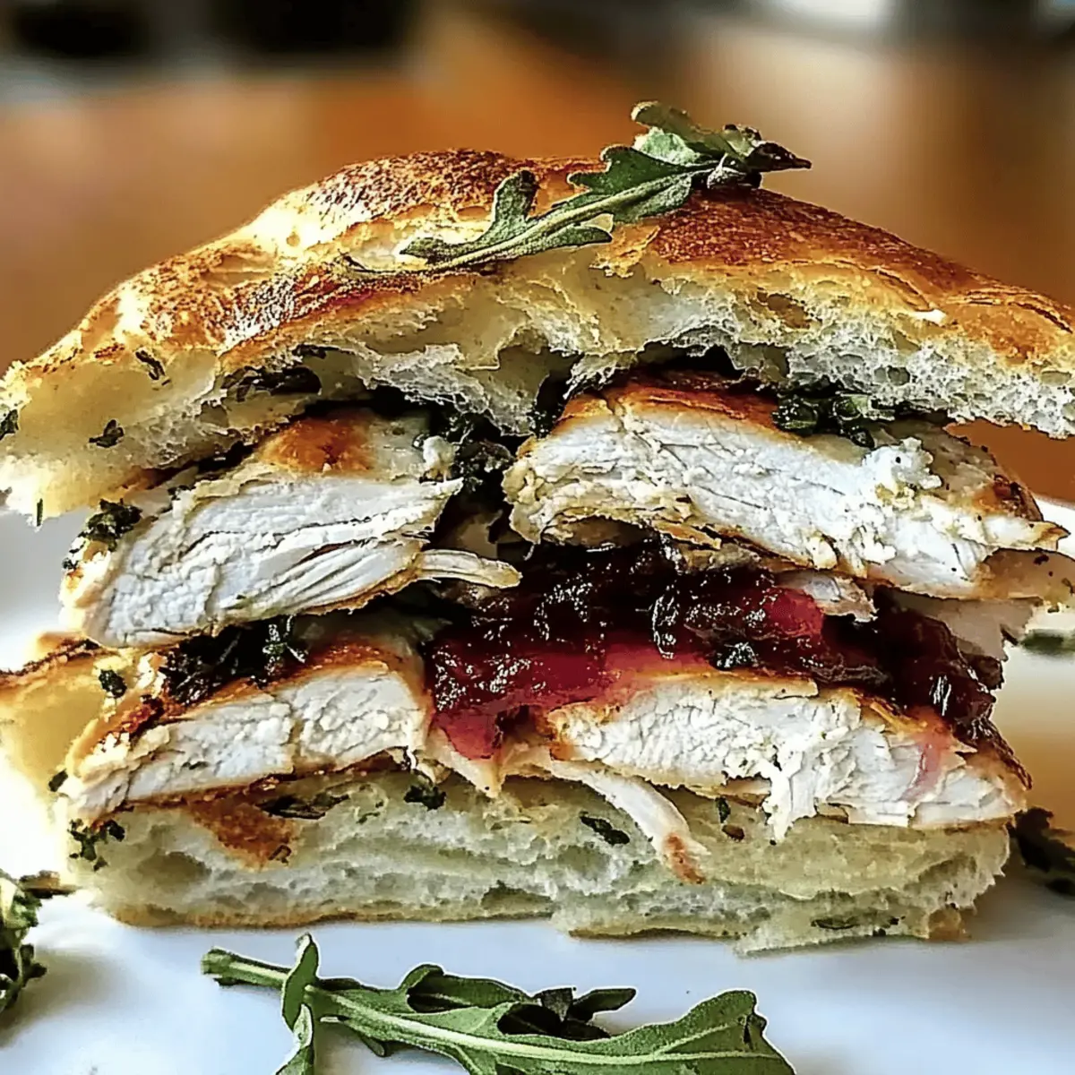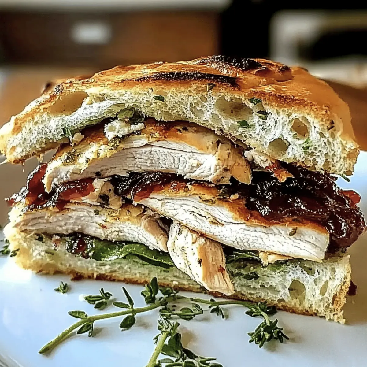 As I stood over the stovetop, the rich aroma of roasted chicken filled the air, instantly transporting me to a quaint Italian café where flavors dance with each bite. This Roasted Chicken Focaccia Sandwich with Goat Cheese, Red Onion Jam, and Herb Aioli is my homage to those delightful moments. Not only is it a feast for the senses, but it also makes for a stress-free meal prep solution, allowing you to savor homemade goodness without hours in the kitchen. Packed with mouthwatering textures and the perfect balance of savory and sweet, this sandwich transforms simple ingredients into something extraordinary—ideal for casual lunches or elegant gatherings alike. Curious to find out how to elevate your sandwich game in no time? Let’s dive into this deliciously satisfying creation! Why is this sandwich a must-try? Flavor Fusion: The combination of juicy roasted chicken, tangy goat cheese, and sweet red onion jam creates a taste sensation that’s truly gourmet. Easy Meal Prep: This recipe is perfect for meal prepping—make the chicken and spreads in advance for quick assembly during busy weeks. Customizable: With variations like creamy brie or grilled vegetables, you can easily cater to dietary preferences or crowd favorites. Impressive Presentation: Beautifully layered in fluffy focaccia, it’s not just delicious but also a feast for the eyes—perfect for gatherings! Crowd-Pleasing: Whether it’s a family lunch or a picnic with friends, this Roasted Chicken Focaccia Sandwich with Goat Cheese, Red Onion Jam, and Herb Aioli will surely impress. Roasted Chicken Focaccia Sandwich Ingredients • Get ready to gather your ingredients for this delightful sandwich creation! For the Focaccia Focaccia Bread – Use store-bought for a quick fix or make your own for that fresh-baked aroma. Swap with gluten-free bread if you need it! For the Main Filling Roasted Chicken – This star ingredient provides heartiness and can easily be replaced with grilled veggies for a scrumptious vegetarian option. Goat Cheese – Adds a creamy, tangy note; try feta or brie for a delicious twist if you prefer. For the Sweet Layer Red Onion Jam – A sweet complement that enhances the sandwich flavor—store-bought is fine, but homemade is a real treat! For the Sauce Herb Aioli – Whip up this fresh sauce using mayo, herbs, garlic, and lemon juice for a zesty kick that transforms your sandwich from simple to sensational. Now that you have all your ingredients ready, let’s dive into creating this Roasted Chicken Focaccia Sandwich with Goat Cheese, Red Onion Jam, and Herb Aioli! Step‑by‑Step Instructions for Roasted Chicken Focaccia Sandwich with Goat Cheese, Red Onion Jam, and Herb Aioli Step 1: Roast the Chicken Preheat your oven to 375°F (190°C). Season the chicken breasts with salt, pepper, and your favorite herbs. Place them on a lined baking sheet and roast for 25–30 minutes, or until they reach an internal temperature of 165°F (74°C) and are beautifully golden. Let the chicken cool slightly before slicing it into juicy pieces for your sandwich. Step 2: Prepare the Red Onion Jam In a medium saucepan, combine sliced red onions, a few tablespoons of sugar, and a splash of vinegar. Cook over medium-low heat for 20–25 minutes, stirring occasionally, until the onions caramelize and develop a rich, deep color. Once thickened and sweetened, let the jam cool before layering it onto your sandwich. Step 3: Make the Herb Aioli In a bowl, mix together mayonnaise, finely minced fresh herbs (like parsley and basil), a clove of minced garlic, and a squeeze of lemon juice. Stir well until all ingredients are well incorporated. Let the herb aioli sit for at least 30 minutes to allow the flavors to meld, which will enhance its taste in your Roasted Chicken Focaccia Sandwich. Step 4: Assemble the Sandwich Slice your focaccia bread horizontally, creating a thick sandwich base. Begin layering with the sliced roasted chicken atop the bottom half, followed by generous dollops of creamy goat cheese. Top with the sweet red onion jam and a spread of herb aioli, ensuring each bite is packed with flavor. Step 5: Serve and Enjoy Cut the assembled sandwich in half for easy handling and a delightful presentation. Serve immediately alongside a fresh side salad or crispy potato chips for a satisfying meal. This Roasted Chicken Focaccia Sandwich with Goat Cheese, Red Onion Jam, and Herb Aioli is sure to impress at any lunch gathering! Make Ahead Options These Roasted Chicken Focaccia Sandwiches with Goat Cheese, Red Onion Jam, and Herb Aioli are fantastic for meal prep! You can roast the chicken and make both the red onion jam and herb aioli up to 3 days in advance; simply store them in airtight containers in the refrigerator to maintain freshness. When you’re ready to enjoy your sandwich, slice the focaccia and layer the prepped ingredients together. To prevent the focaccia from getting soggy, assemble the sandwich shortly before serving, and if desired, reheat the chicken but allow it to cool slightly before layering. This way, you’ll enjoy every bit of deliciousness with minimal effort on busy days! Roasted Chicken Focaccia Sandwich Variations Feel free to get creative and customize your sandwich to suit your taste buds! Cheese Swap: Replace goat cheese with creamy brie or a sharp cheddar for a different flavor profile. Each cheese brings its unique personality to the sandwich, creating a delightful taste journey. Vegetarian Option: Use grilled zucchini, eggplant, and bell peppers instead of chicken for a satisfying vegetarian delight. This twist maintains the sandwich’s heartiness while adding vibrant colors and flavors. Spicy Kick: Add sliced jalapeños or a drizzle of sriracha for a fiery touch. This fiery variation will definitely wake up your taste buds and keep you coming back for more! Herb Infusion: Experiment by mixing fresh herbs into your herb aioli, like dill or cilantro, for an aromatic flavor boost. The fr