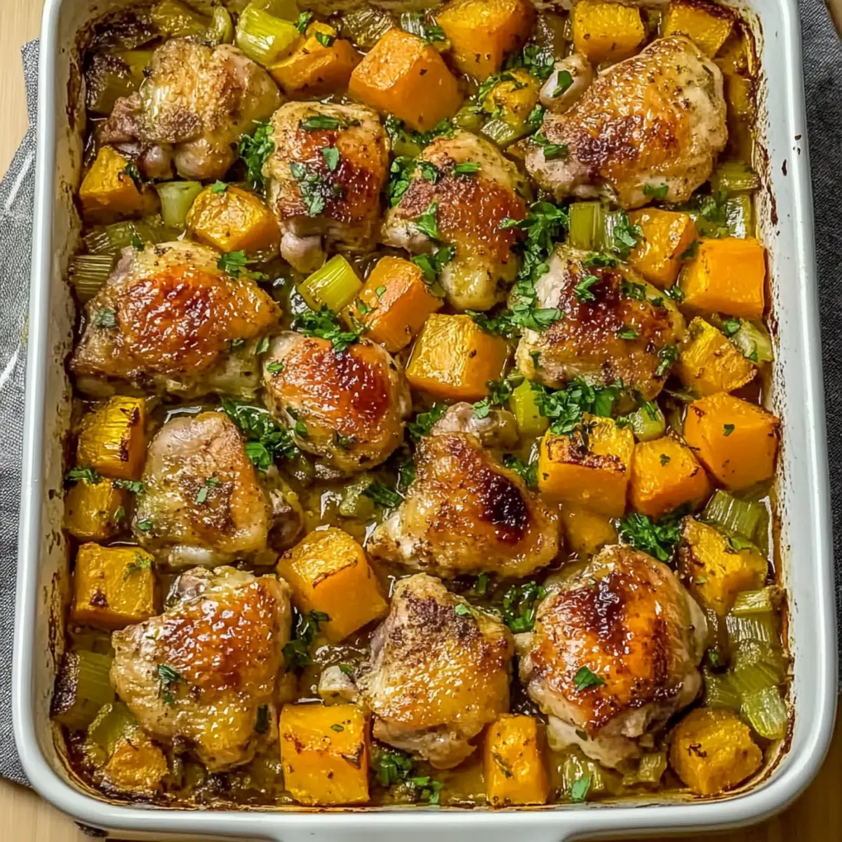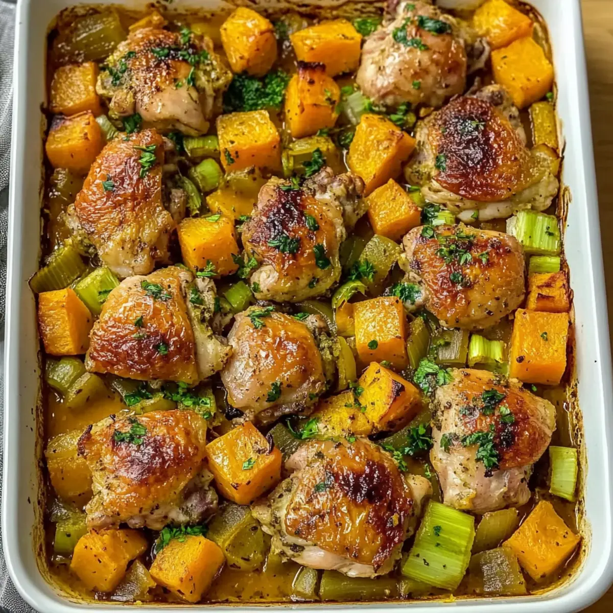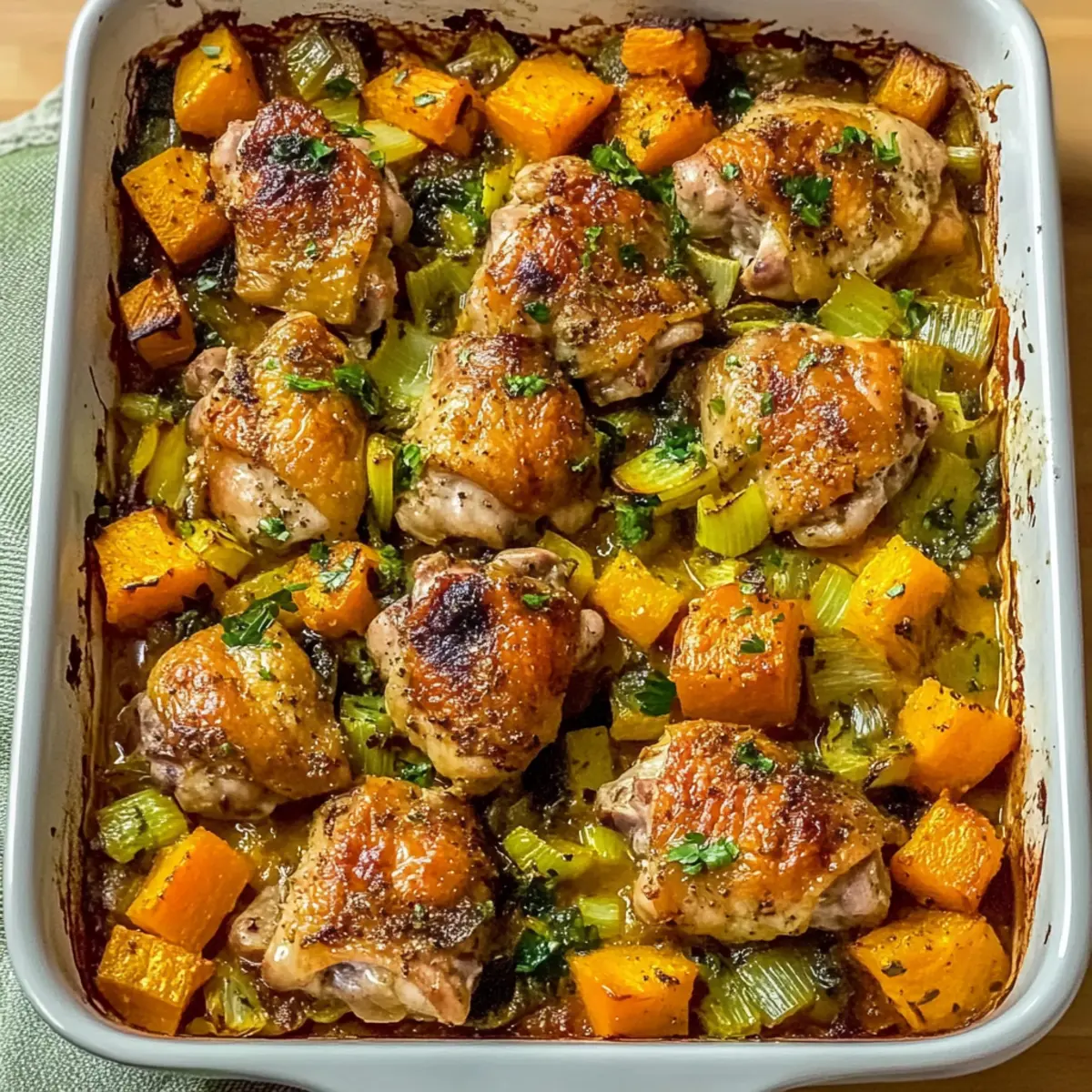 As the leaves turn golden and the days begin to cool, there’s nothing quite like the cozy aroma of a home-cooked meal wafting through the kitchen. That’s why I can’t wait to share my Roasted Chicken Leek and Butternut Squash Bake with you—a delightful one-pan wonder perfect for autumn evenings. Juicy chicken thighs mingle with sweet butternut squash and tender leeks, creating a dish that not only pleases the palate but also simplifies weeknight cooking. With minimal clean-up and the ability to adapt for your family’s tastes, this comforting recipe is bound to become your go-to for those bustling nights. So, how do you like to spice up your autumn meals? Let’s dive into this delicious sanctuary! Why is this recipe perfect for autumn? Comforting Simplicity: This Roasted Chicken Leek and Butternut Squash Bake combines minimal prep work with mouthwatering results, ideal for busy weeknights. Flavorful Harmony: The balance of juicy chicken, sweet squash, and tender leeks creates a dish that’s bursting with autumn flavors. One-Pan Wonder: Enjoy an easy cleanup while still achieving a crowd-pleasing meal that will leave your family craving seconds. Versatile Ingredients: Feel free to experiment with different seasonal vegetables or herbs, ensuring each meal feels fresh and new. Nourishing Goodness: Packed with wholesome ingredients, this recipe delivers not just a meal but comfort and satisfaction that warms the heart. Roasted Chicken Leek and Butternut Squash Bake Ingredients Note: Gather these simple ingredients for a delightful one-pan meal. For the Bake Low-calorie oil spray – Use for greasing the pan to reduce fat content. Boneless skinless chicken thighs – Essential for a juicy bake; can substitute with bone-in thighs but increase cooking time. Dried parsley flakes – Adds a burst of herbal flavor to the dish. Dried thyme – Enhances the earthy flavor profile that complements the chicken. Salt and ground black pepper – Season generously for overall taste enhancement. Salted butter (or olive oil) – Adds richness; substitute olive oil for a lighter option. Yellow onion – Provides sweetness and forms the base flavor for the dish. Butternut squash – Sweet and rich in texture; dice into 1-inch cubes for even cooking. Paprika – Contributes depth and color; consider smoked paprika for a twist. Leeks – Delivers a mild, onion-like flavor; ensure they’re cleaned and trimmed properly. Chopped garlic – Offers aromatic depth; fresh garlic yields the best results. Chicken broth (Better Than Bouillon recommended) – Essential for adding moisture and flavor while deglazing. Freshly grated parmesan cheese – Provides a creamy topping; add in the last moments of cooking to prevent burning. Fresh parsley leaves – A garnish that brings freshness and color to your dish. Step‑by‑Step Instructions for Roasted Chicken Leek and Butternut Squash Bake Step 1: Preheat Your Oven Begin by preheating your oven to 180°C fan (200°C/400°F/Gas Mark 6). This ensures that your Roasted Chicken Leek and Butternut Squash Bake cooks evenly, creating that golden and delicious finish we all crave. As the oven heats, gather your ingredients and prepare to create a comforting one-pan wonder. Step 2: Prepare the Chicken Cut the boneless skinless chicken thighs into thirds and season them generously with salt, ground black pepper, dried parsley flakes, and dried thyme. This layering of flavors will enhance the taste of the chicken in your bake. Set the seasoned chicken aside to allow the spices to infuse while you prepare the vegetables. Step 3: Sear the Chicken In a hot frying pan, add a touch of low-calorie oil spray and place the seasoned chicken pieces. Sear them for about 5-7 minutes, or until they turn golden brown on all sides. This caramelization enhances the flavor of the chicken. Once done, transfer the chicken to a plate and set it aside for later. Step 4: Sauté the Vegetables In the same pan, melt salted butter (or olive oil) over medium heat. Add chopped yellow onion, diced butternut squash, and paprika. Sauté for about 5-6 minutes, until the onion becomes translucent and the squash starts to soften. This step creates a flavorful base for your Roasted Chicken Leek and Butternut Squash Bake. Step 5: Deglaze the Pan Pour in chicken broth (preferably Better Than Bouillon) to deglaze the pan, scraping any browned bits off the bottom. Add the cleaned and trimmed leeks and chopped garlic, continuing to cook for an additional 2-3 minutes until the leeks soften. The broth adds moisture and depth to the mixture, making it perfect for your bake. Step 6: Combine in a Baking Dish Transfer the sautéed vegetable mixture to a large ovenproof dish. Arrange the golden-browned chicken pieces on top, ensuring everything is well spaced. Pour the remaining chicken broth over the contents, making sure the chicken is nestled into the flavored veggies. This combination ensures a luscious and moist Roasted Chicken Leek and Butternut Squash Bake. Step 7: Cover and Bake Cover the baking dish tightly with foil and place it in the preheated oven. Bake for 15 minutes to allow the flavors to meld. After 15 minutes, carefully remove the foil and bake for an additional 15 minutes. This uncovered phase will create a beautifully golden crust on the chicken, enhancing its appeal. Step 8: Finish with Cheese and Garnish A few minutes before the final baking time is up, sprinkle freshly grated parmesan cheese over the top of the dish. Return it to the oven for 15-20 minutes, or until the cheese is melted and the chicken has reached an internal temperature of 165°F. Garnish with fresh parsley leaves before serving, adding a vibrant touch to your cozy Roasted Chicken Leek and Butternut Squash Bake. How to Store and Freeze Roasted Chicken Leek and Butternut Squash Bake Fridge: Store leftovers in an airtight container for up to 4 days. The flavors will deepen, making it even more delicious the next day! Freezer: Po